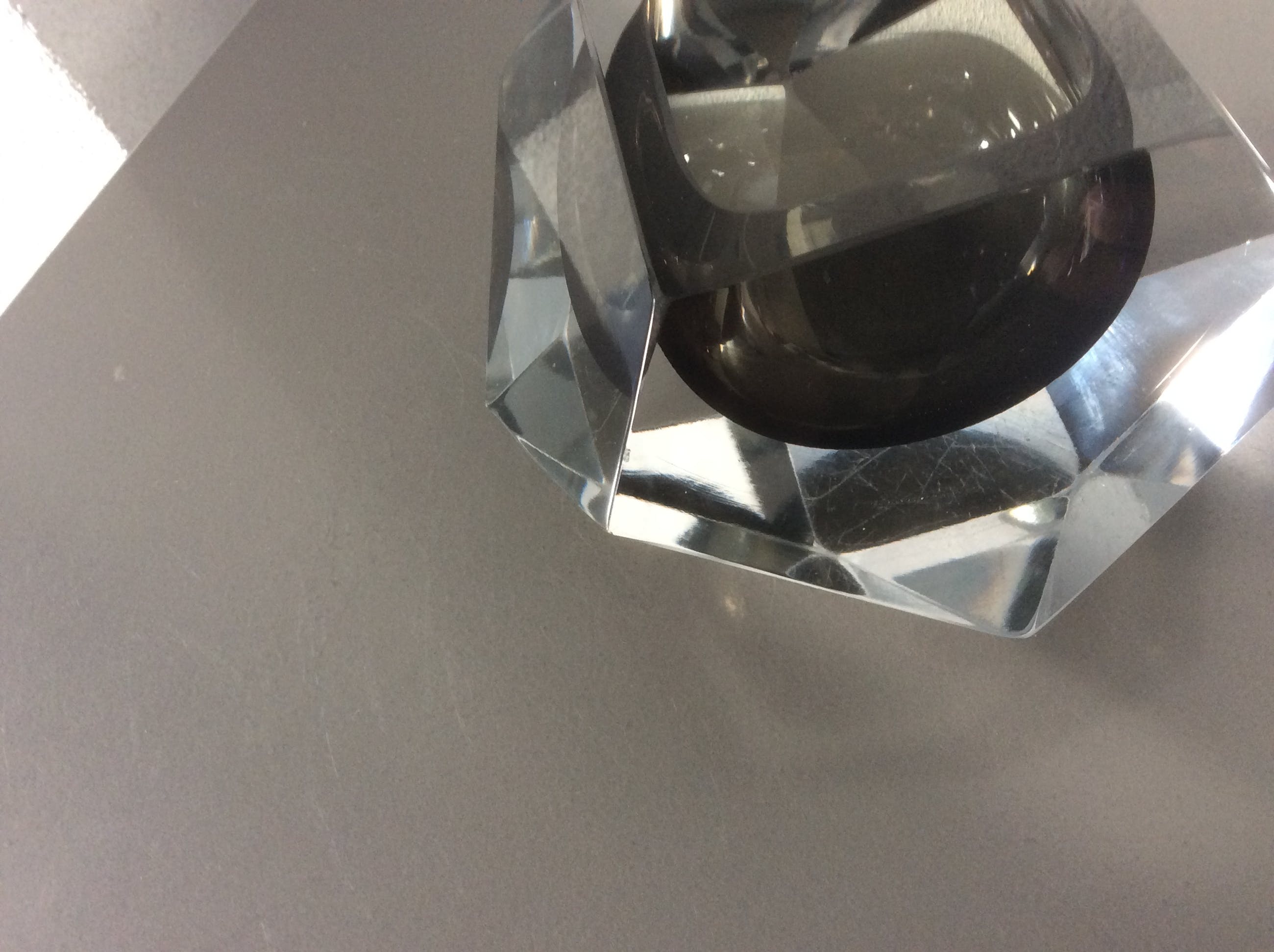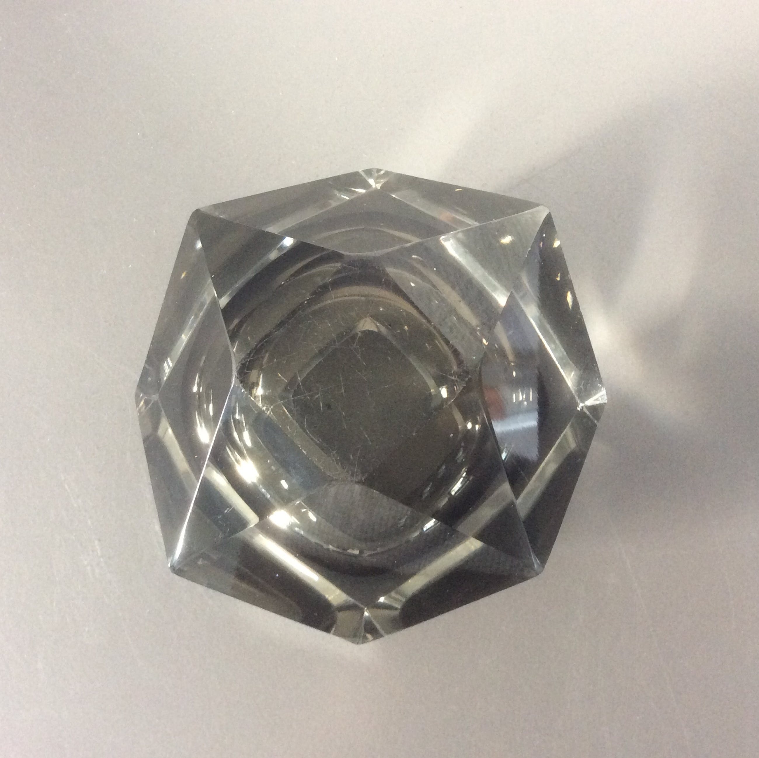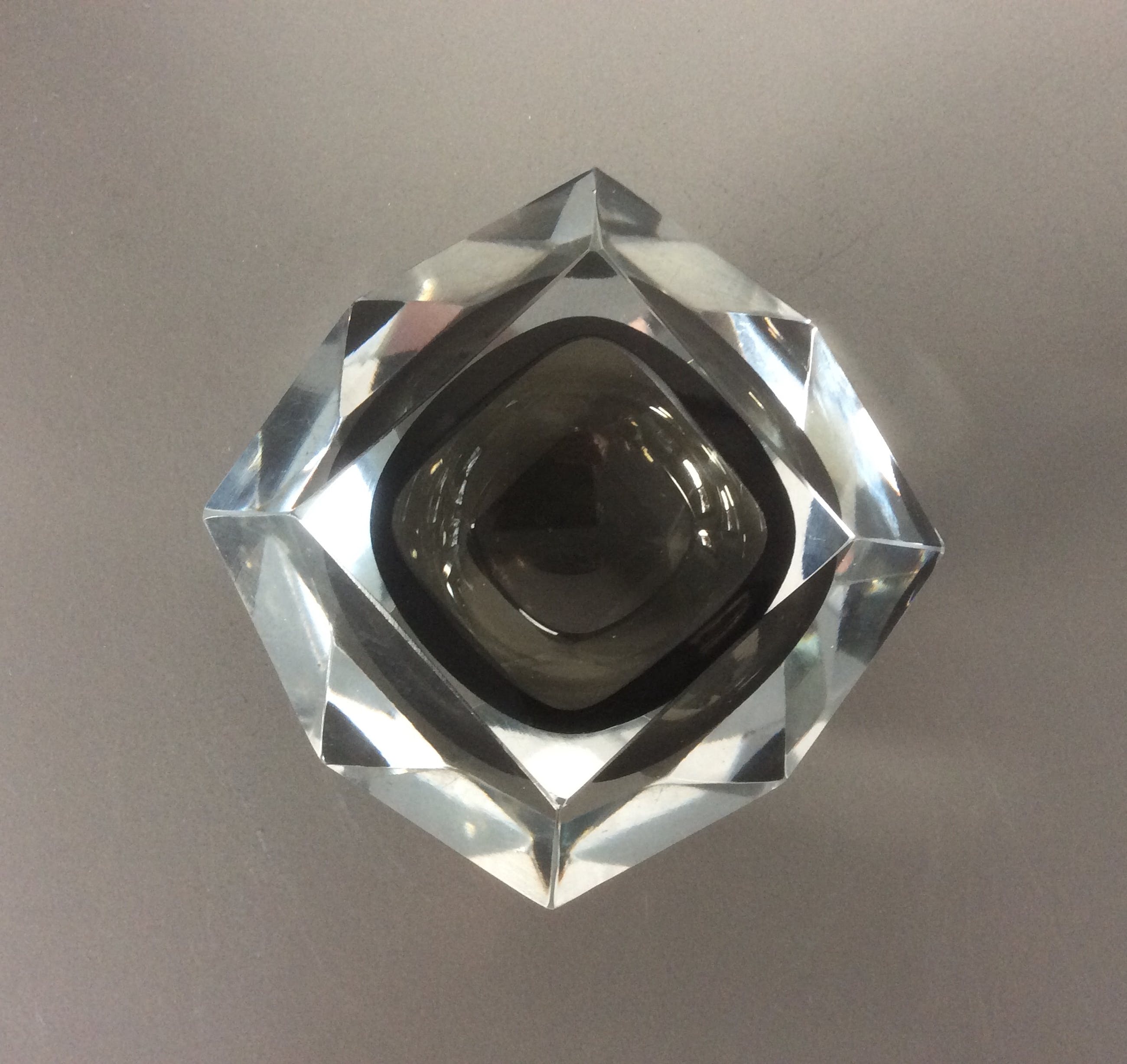 Een prachtig Summerso Murano glasobject van de Italiaanse kunstenaar Flavio Poli. Een bolle binnenkant van grijs rookglas en een heldere buitenkant met 12 facetten. Verklaring conditie: zie foto’s.