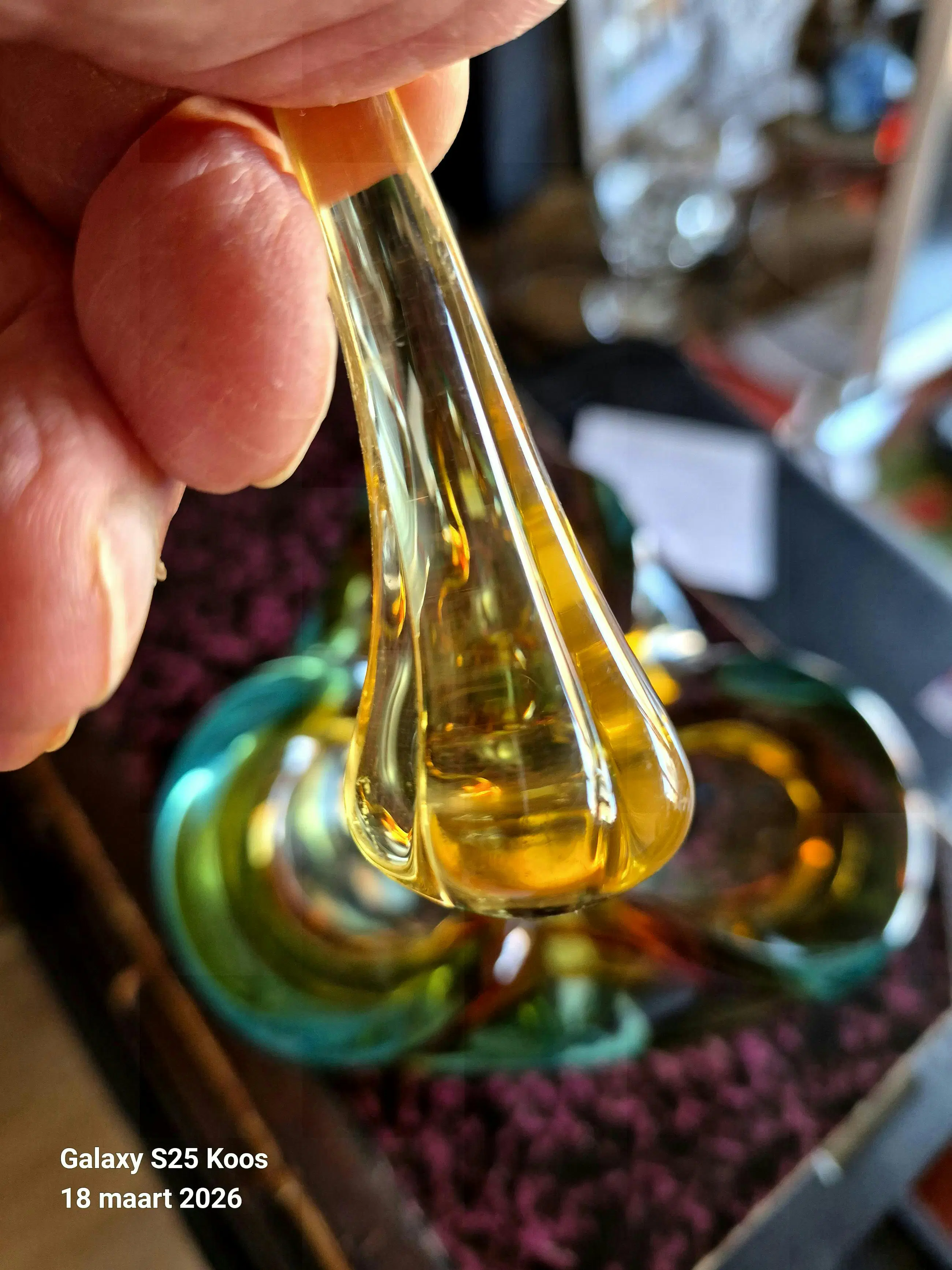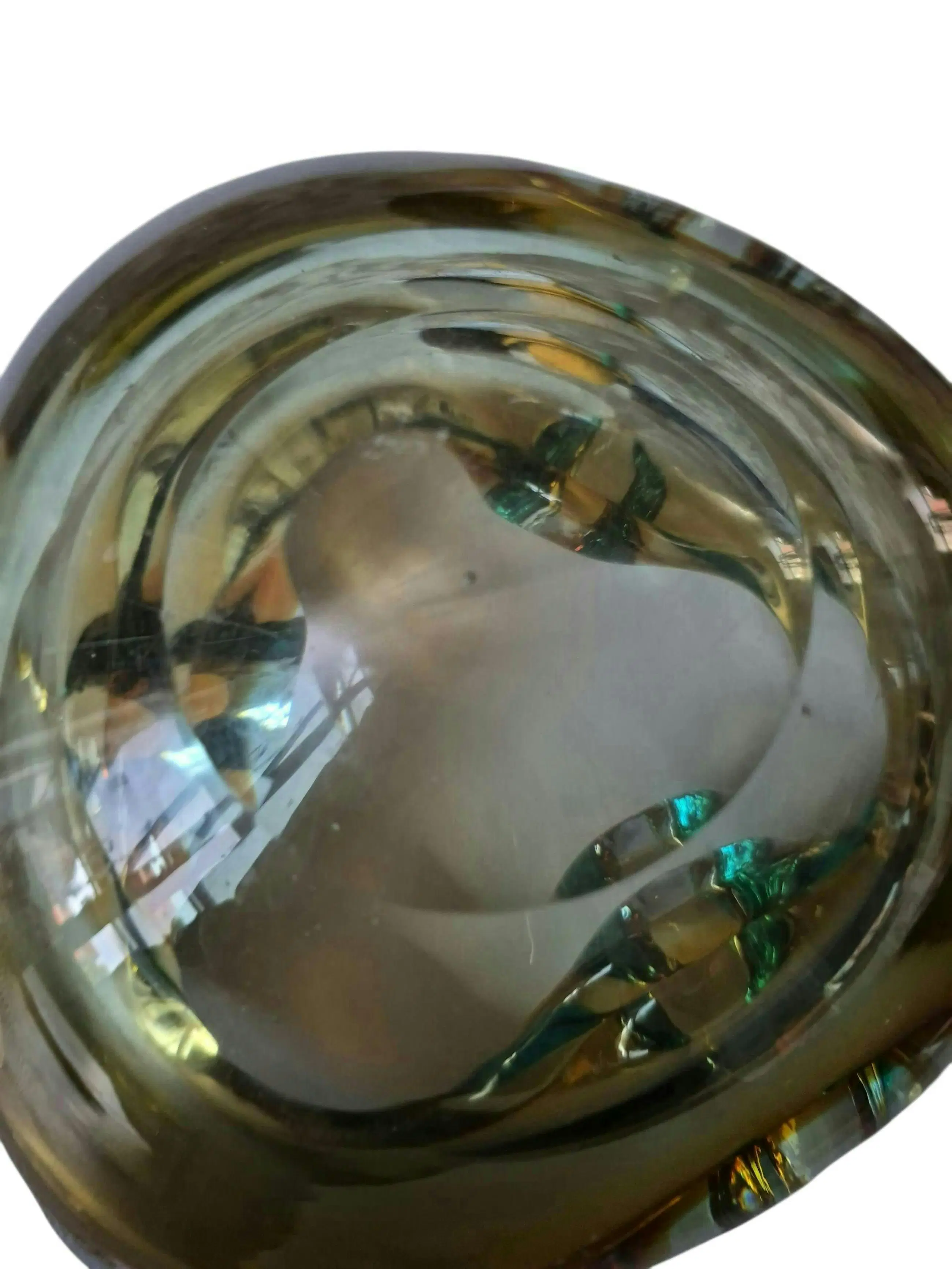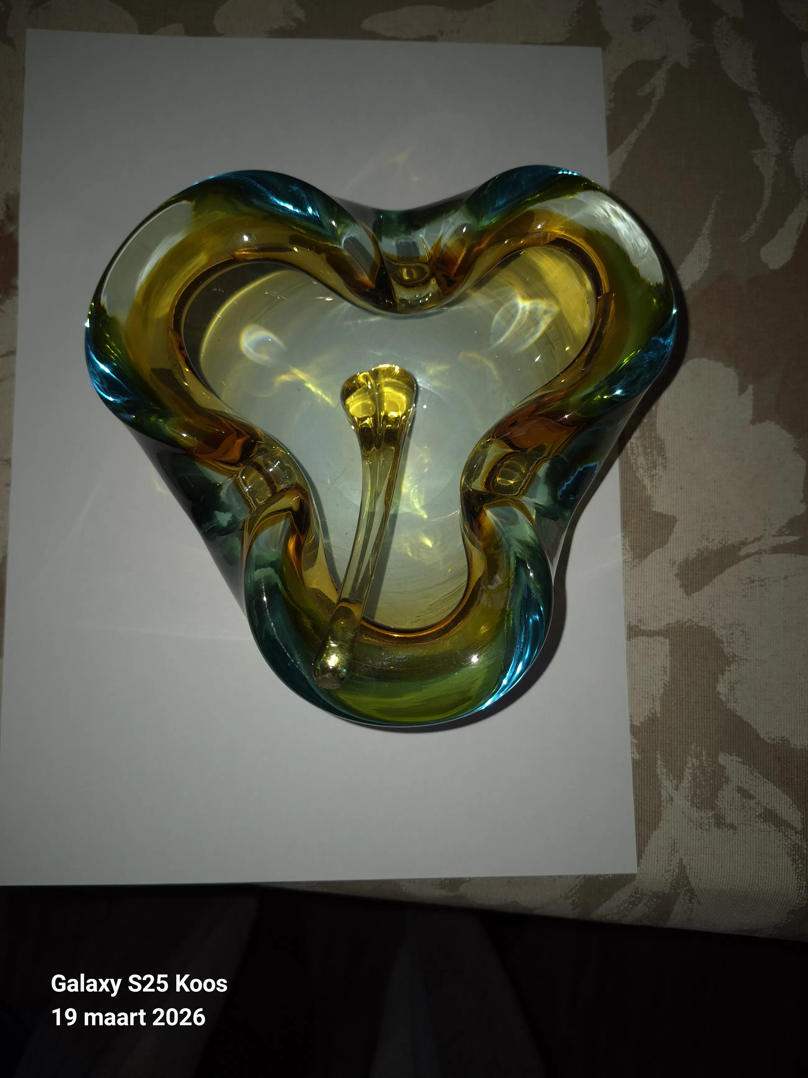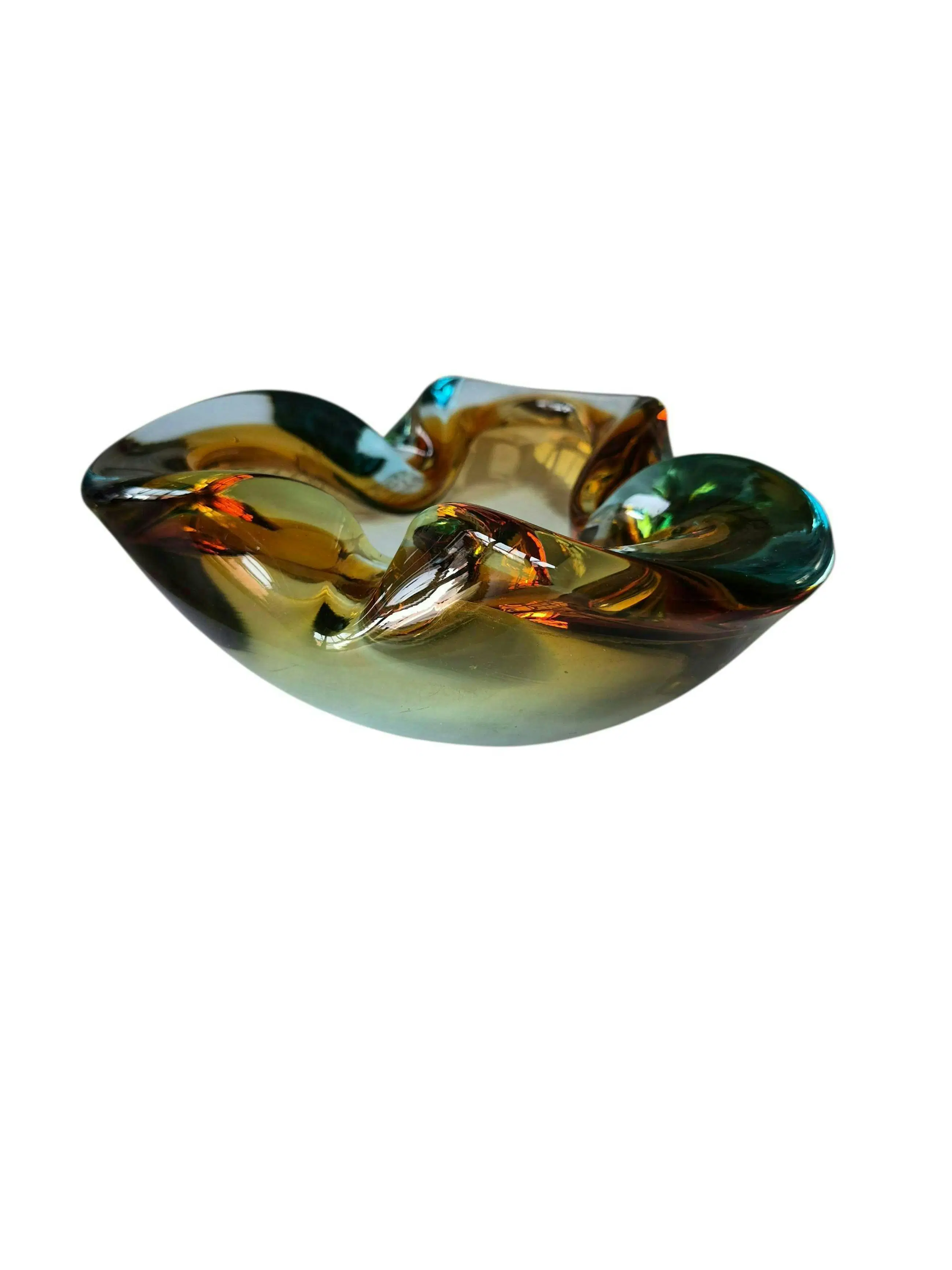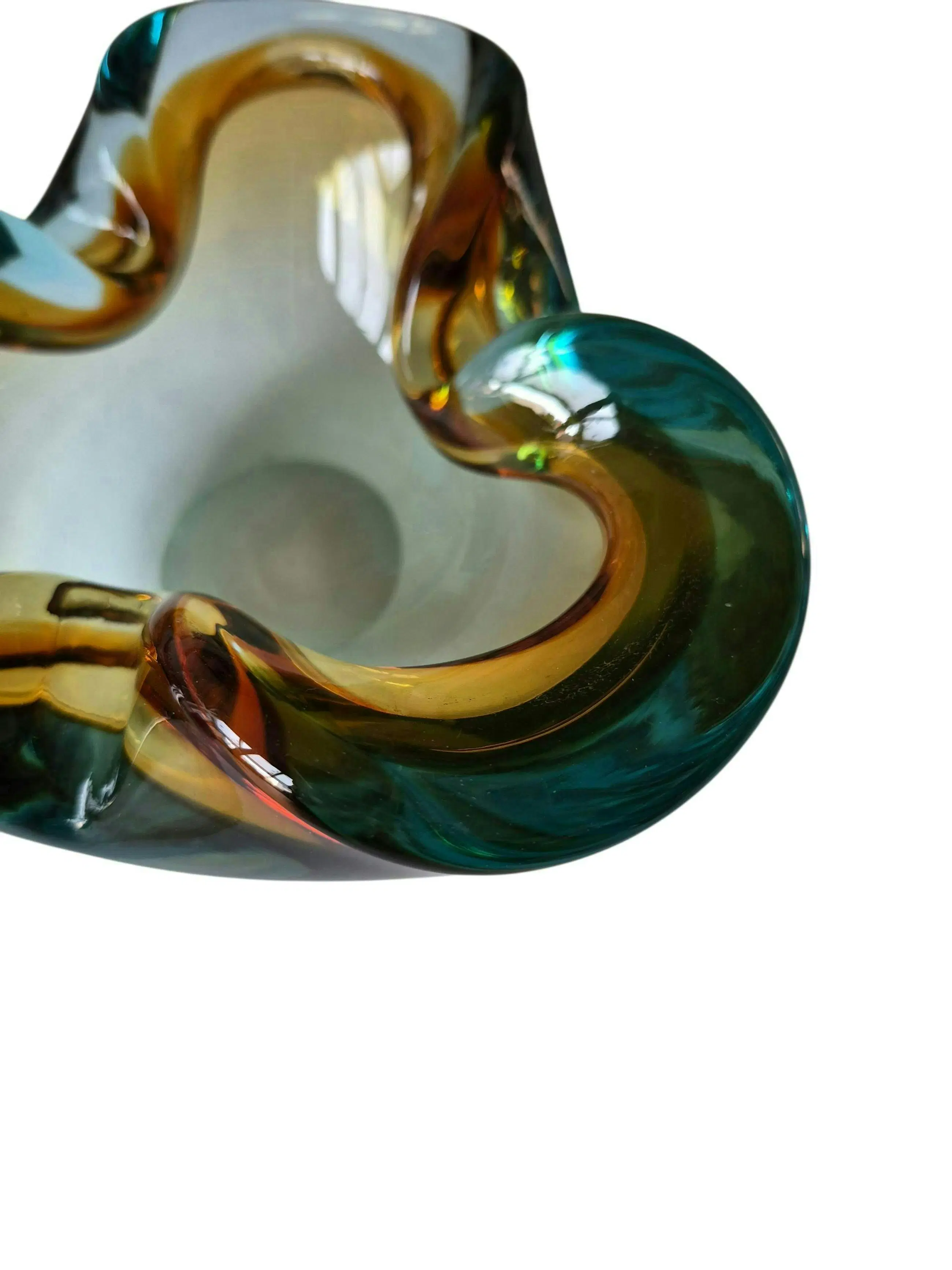 flavio Poli Seguso Italiaanse Ashtray Striking art glazen kom in de klavervorm met een opvallende mix van turquoise en amberkleurige tinten. Dit handgeblazen middelpunt heeft een unieke, organische vorm met sierlijke rondingen, waardoor een elegante en moderne esthetiek ontstaat. De levendige kleuren en het ingewikkelde ontwerp maken het een opvallend decoratief stuk, perfect om een vleugje verfijning aan elke kamer toe te voegen. Toon deze veelzijdige kom op een salontafel, eettafel of boekenplank om uw huisdecoratie te verbeteren. Bij deze kom wordt een murano stijl druppel vorm geleverd.