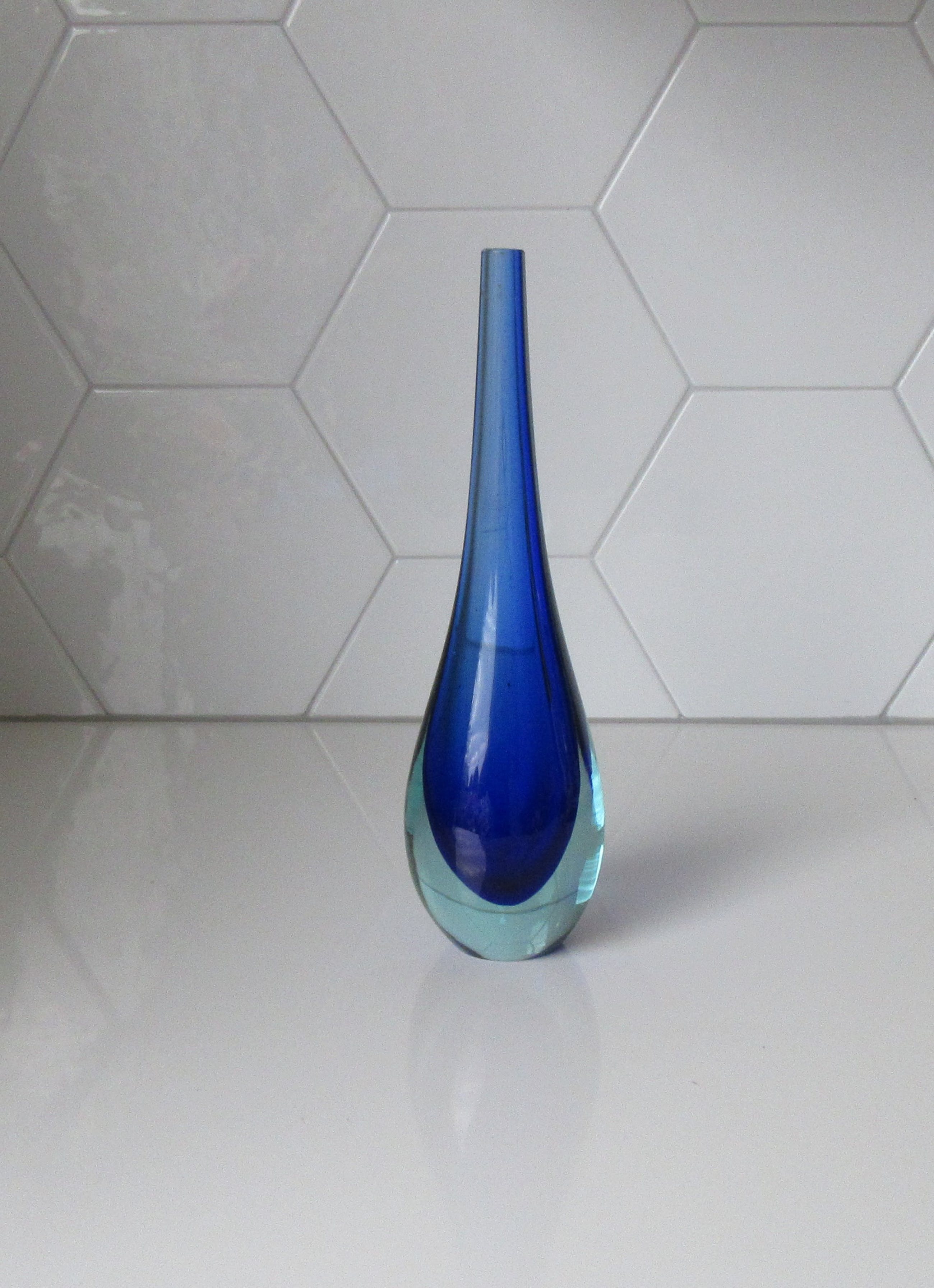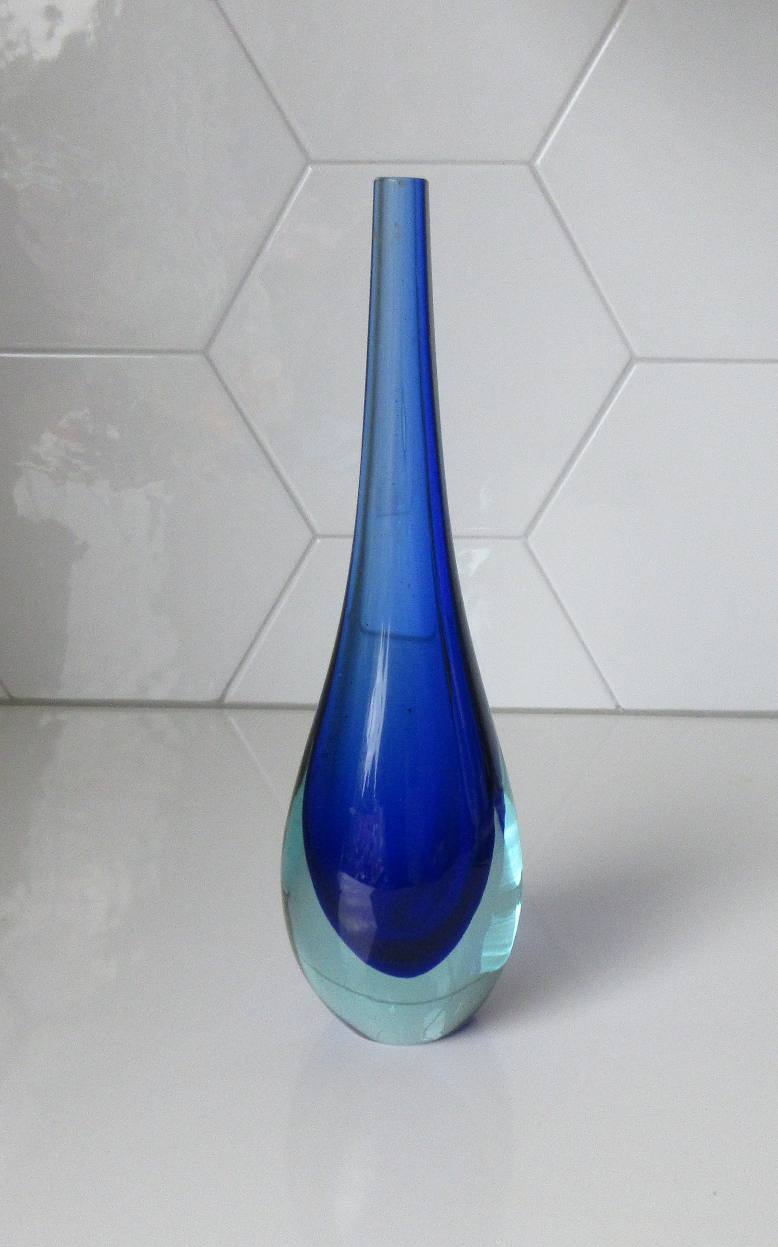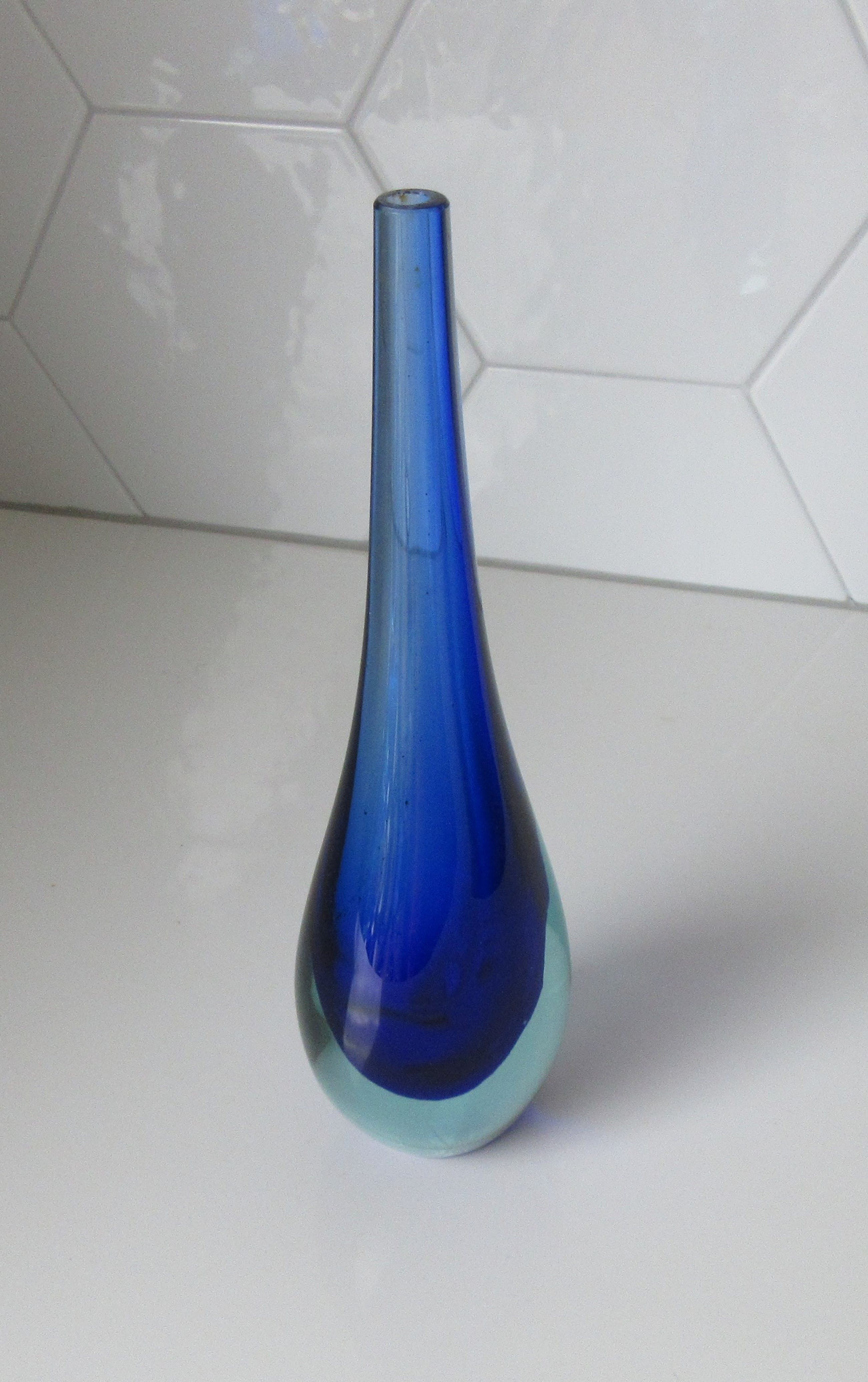 Mooie Sommerso cobalt blauwe en lichtblauwe druppelvaas ontwerp Flavio Poli voor Seguso vetri d'Arte uit Murano. In goede conditie, lichte waas en twee minimale flinters en krasjes op de voet. Niet gemerkt.