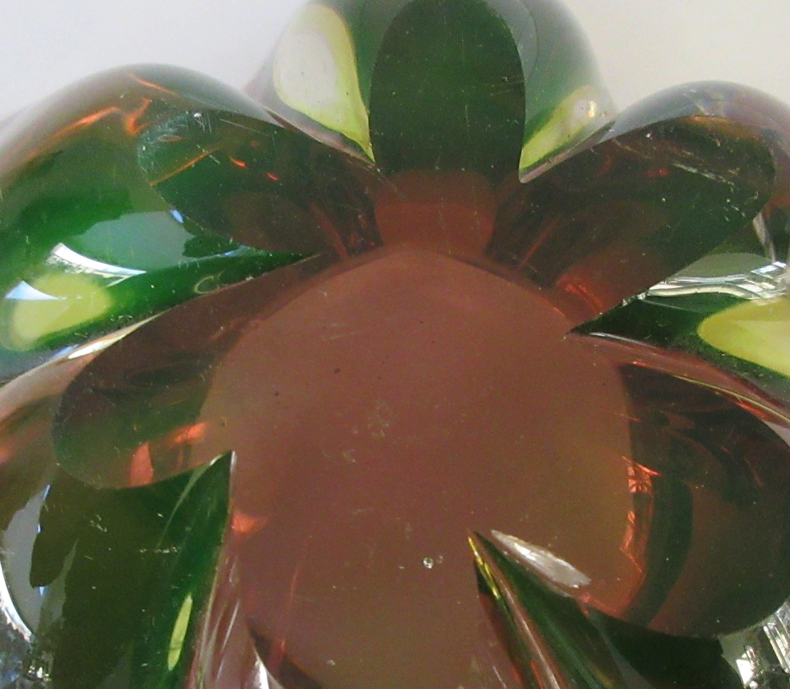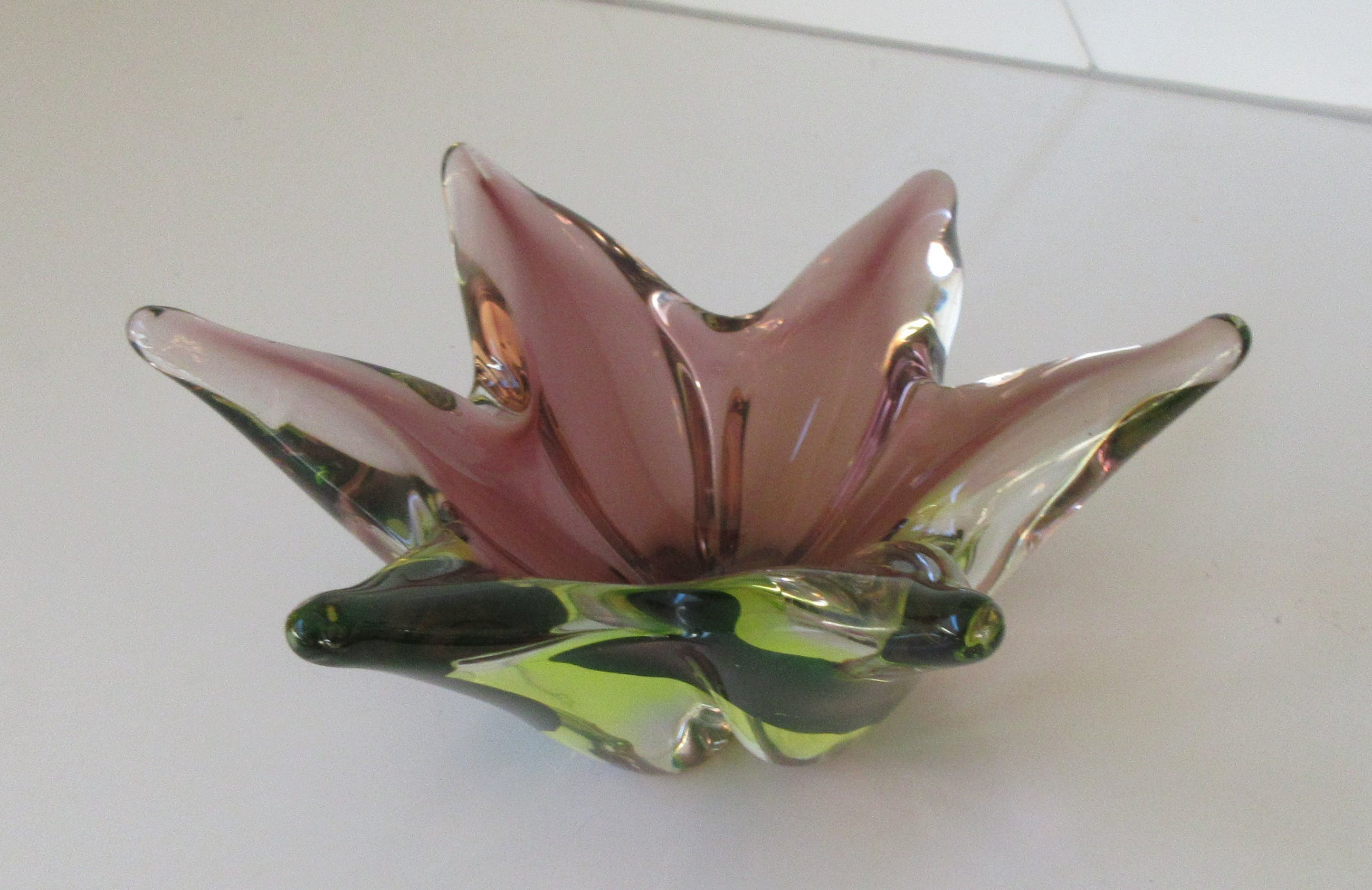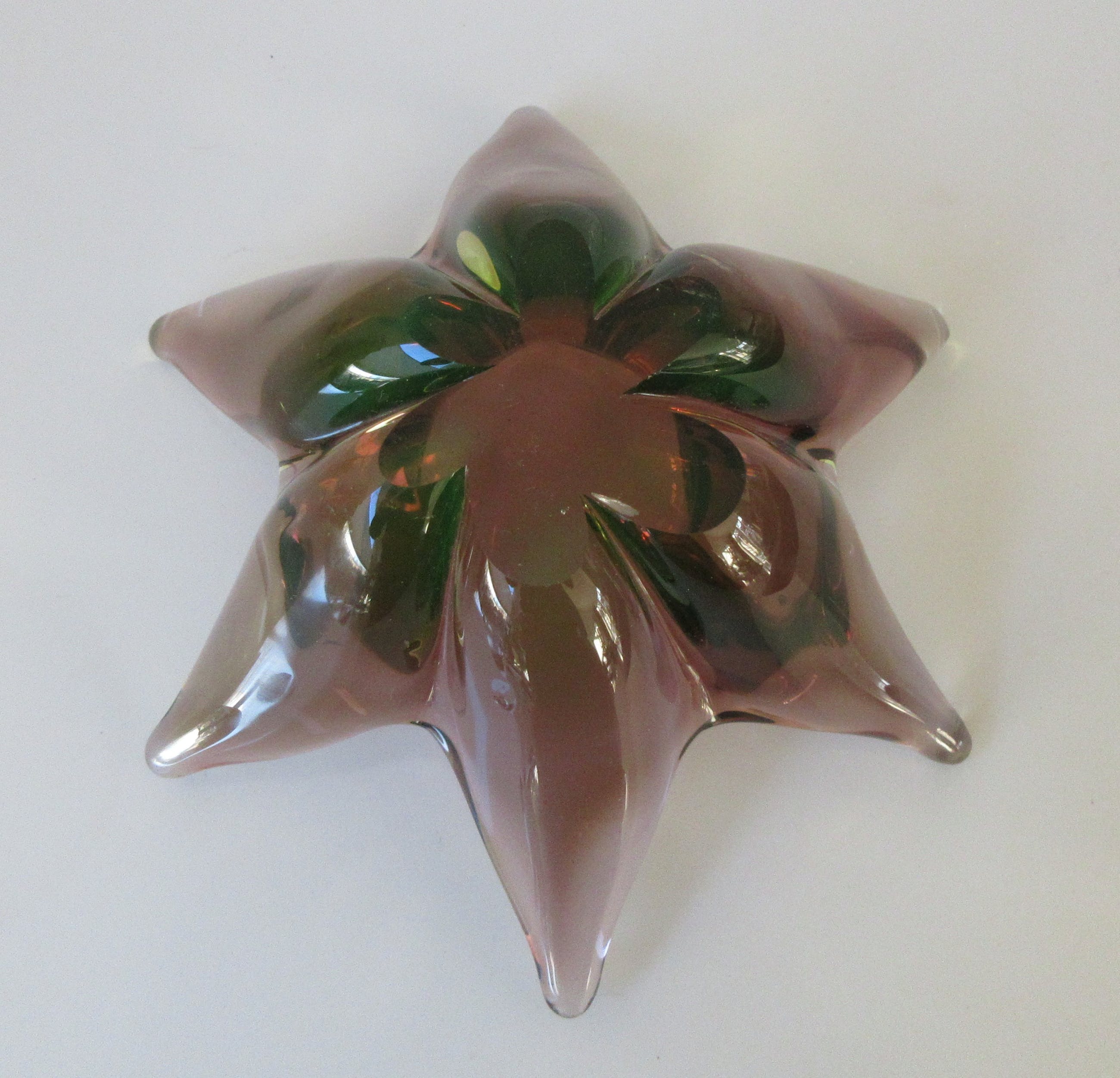 Sommerso zeester vormig schaaltje in dieppaars en Anna groen. Prachtig stuk glas. van Flavio Poli voor Seguso uit Murano. Niet gesigneerd.