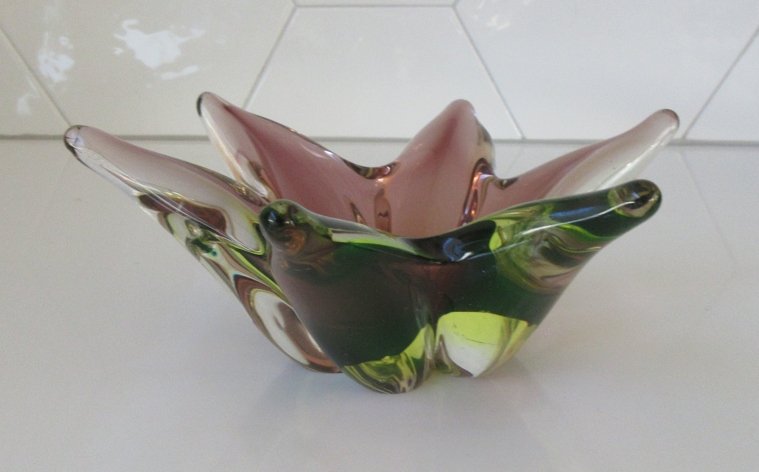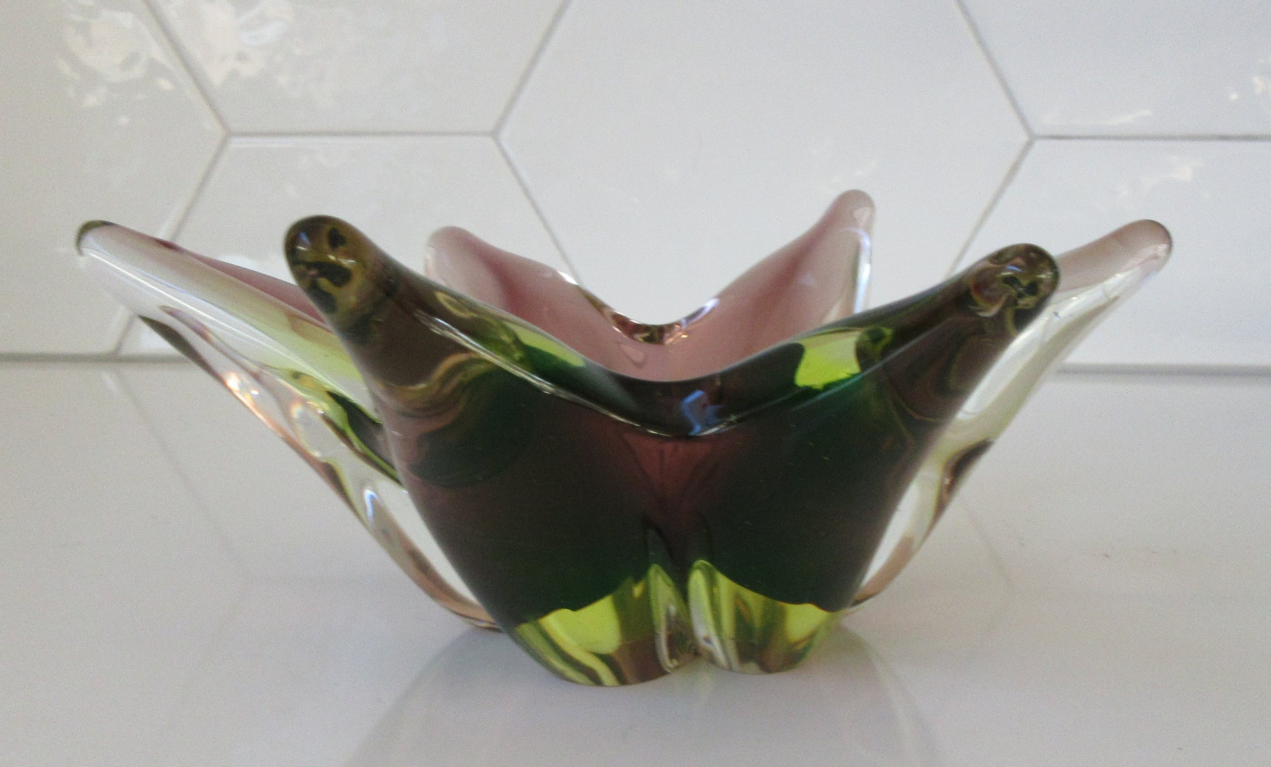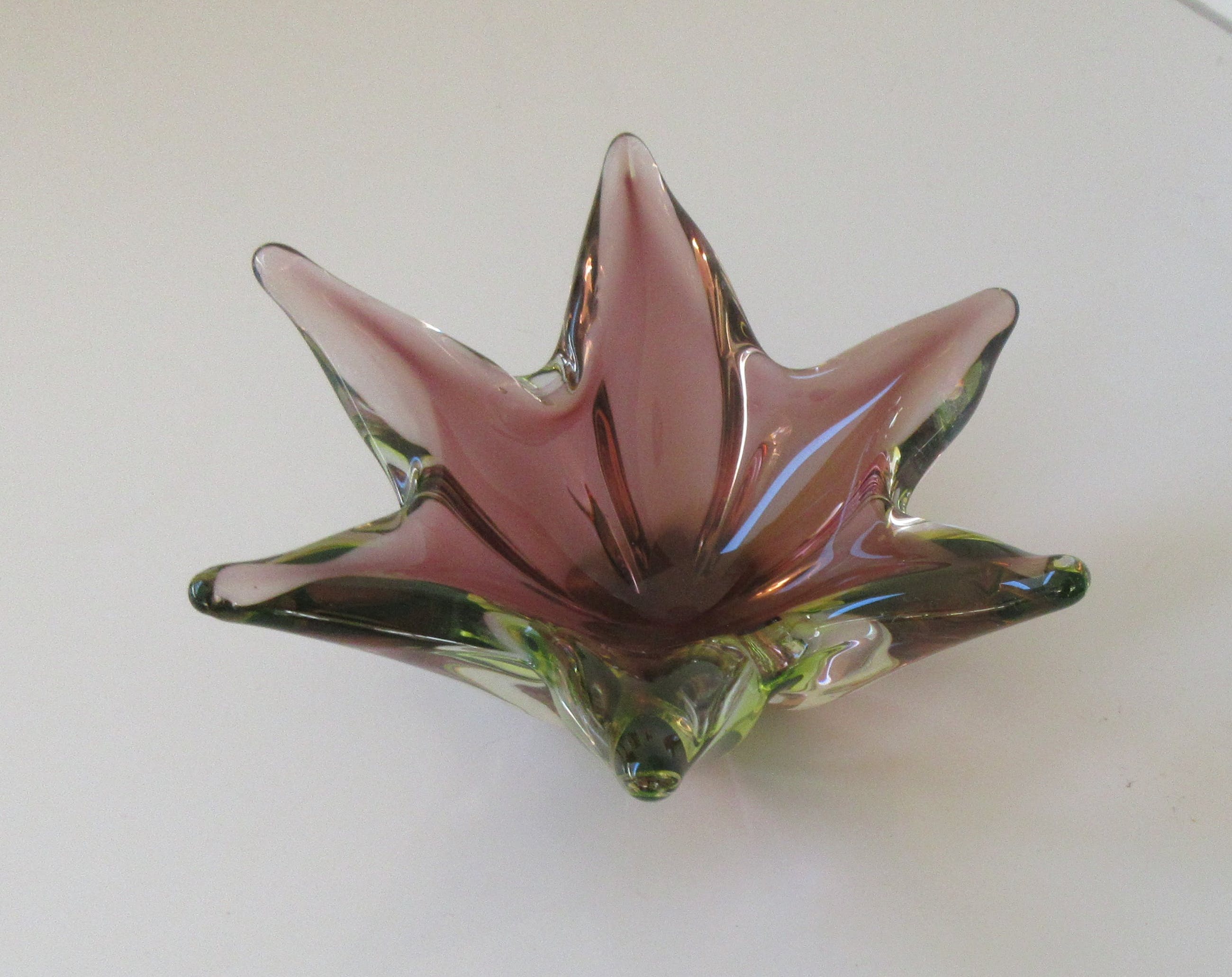 Sommerso zeester vormig schaaltje in dieppaars en Anna groen. Prachtig stuk glas. van Flavio Poli voor Seguso uit Murano. Niet gesigneerd.