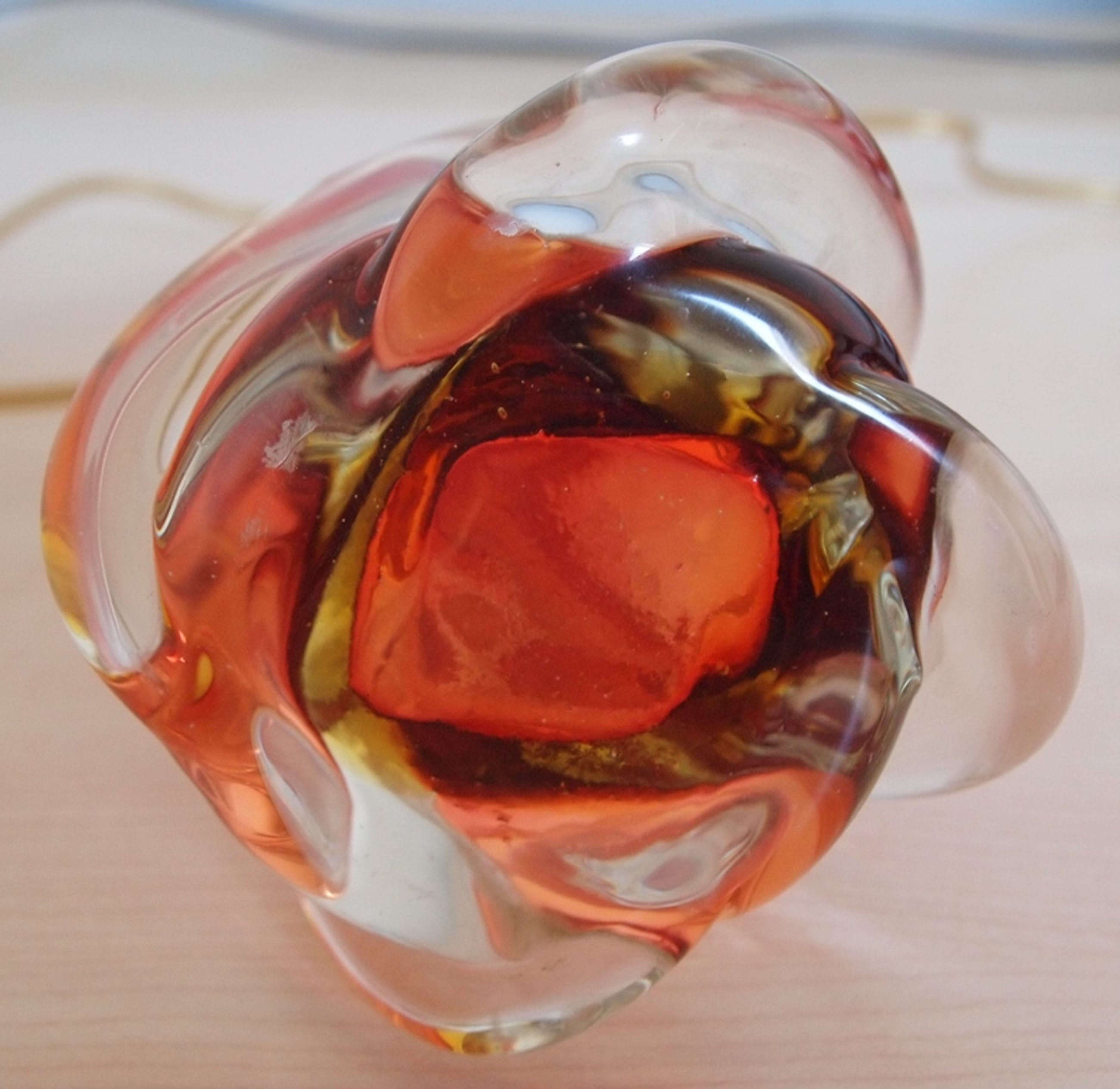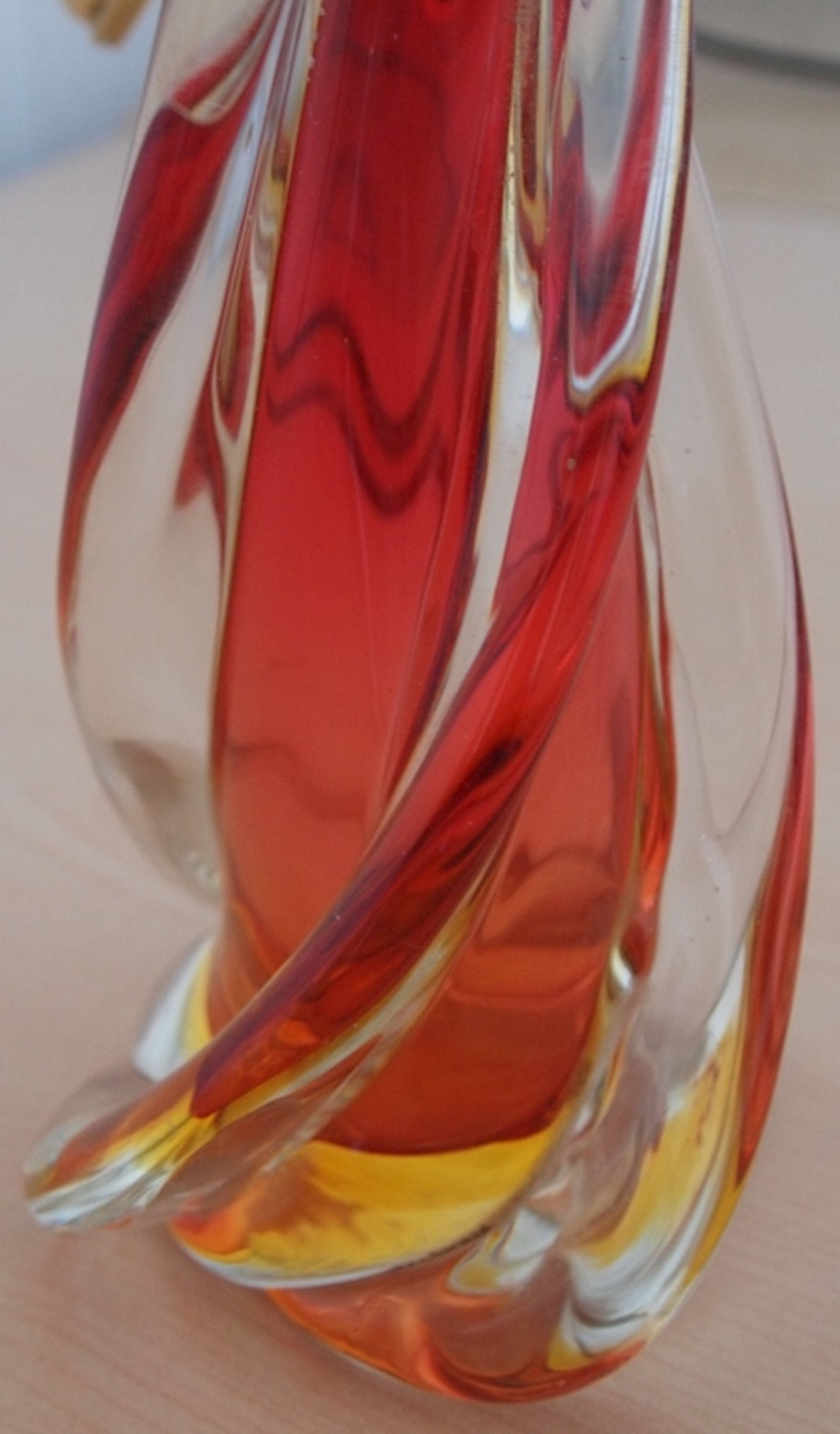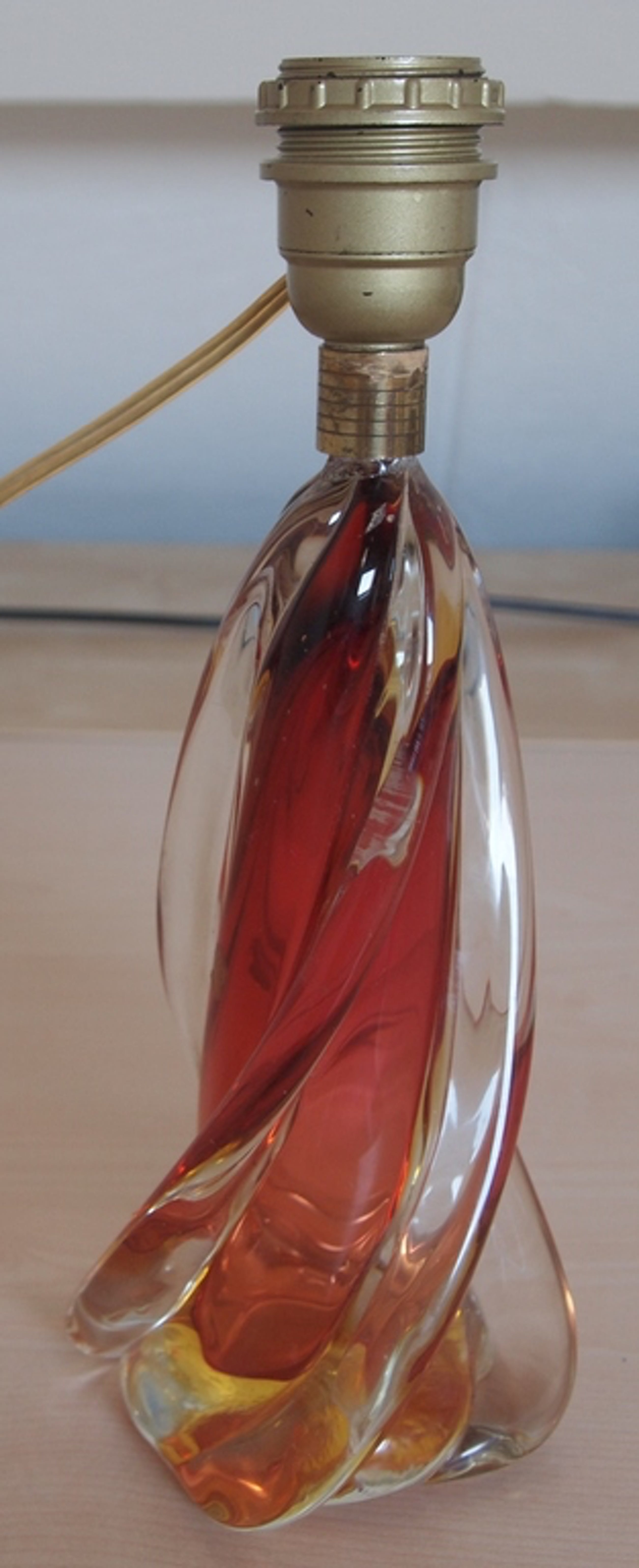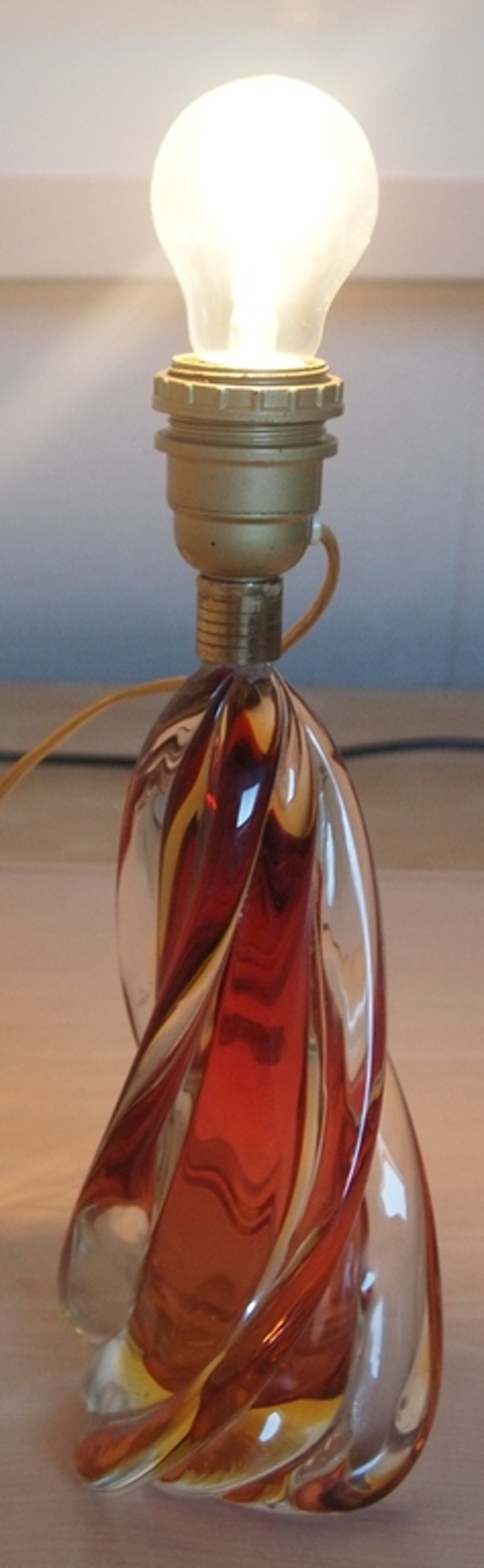 Flavio Poli voor Seguso, Murano - gedraaide (swirl) glazen sommerso lampvoet. Vanaf de bovenzijde lopen de kleuren op van rood, via oranje naar geel. In prima onbeschadigde en werkende conditie (nog voorzien van de originele elektra en fiiting). Niet gemerkt.