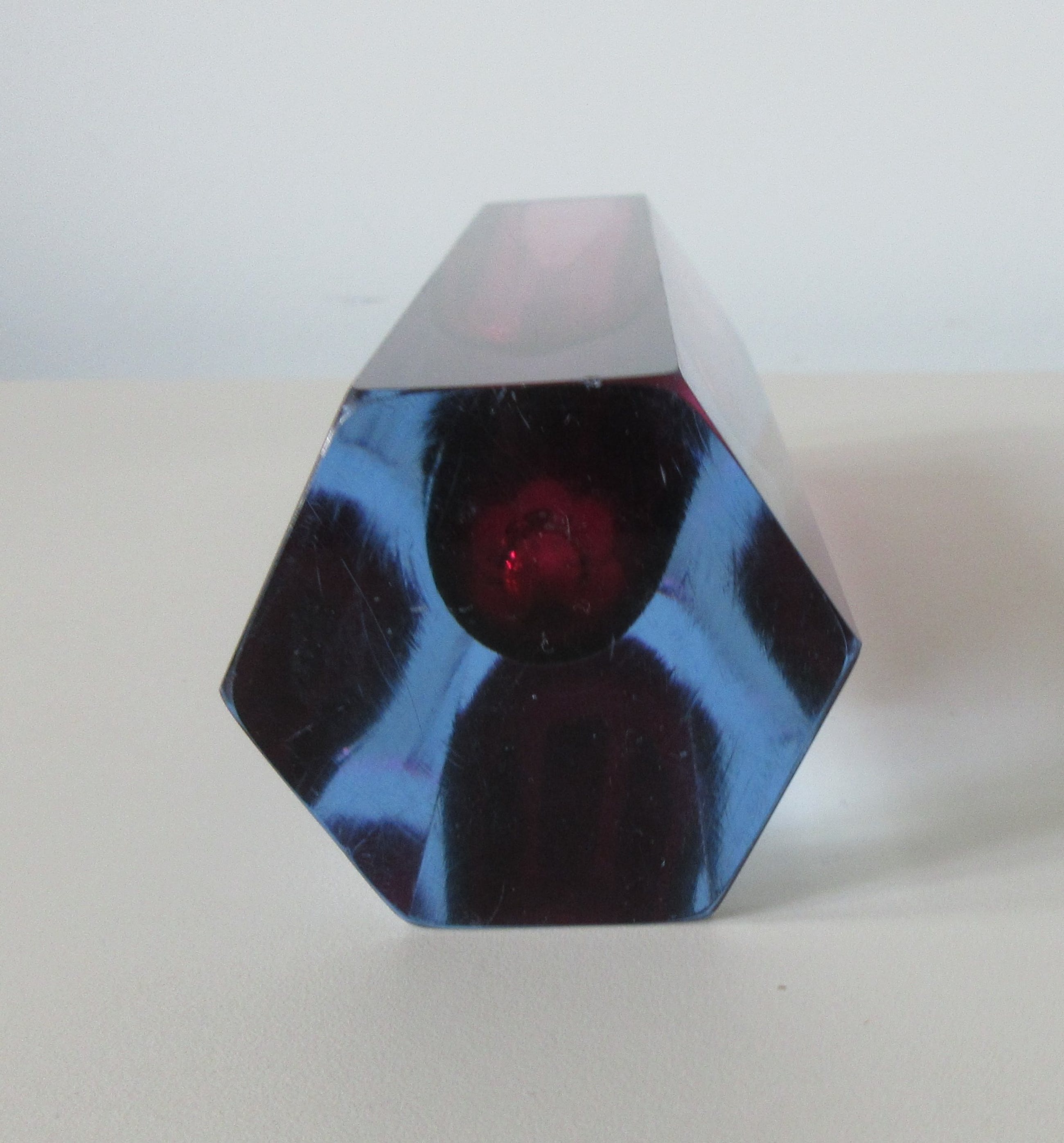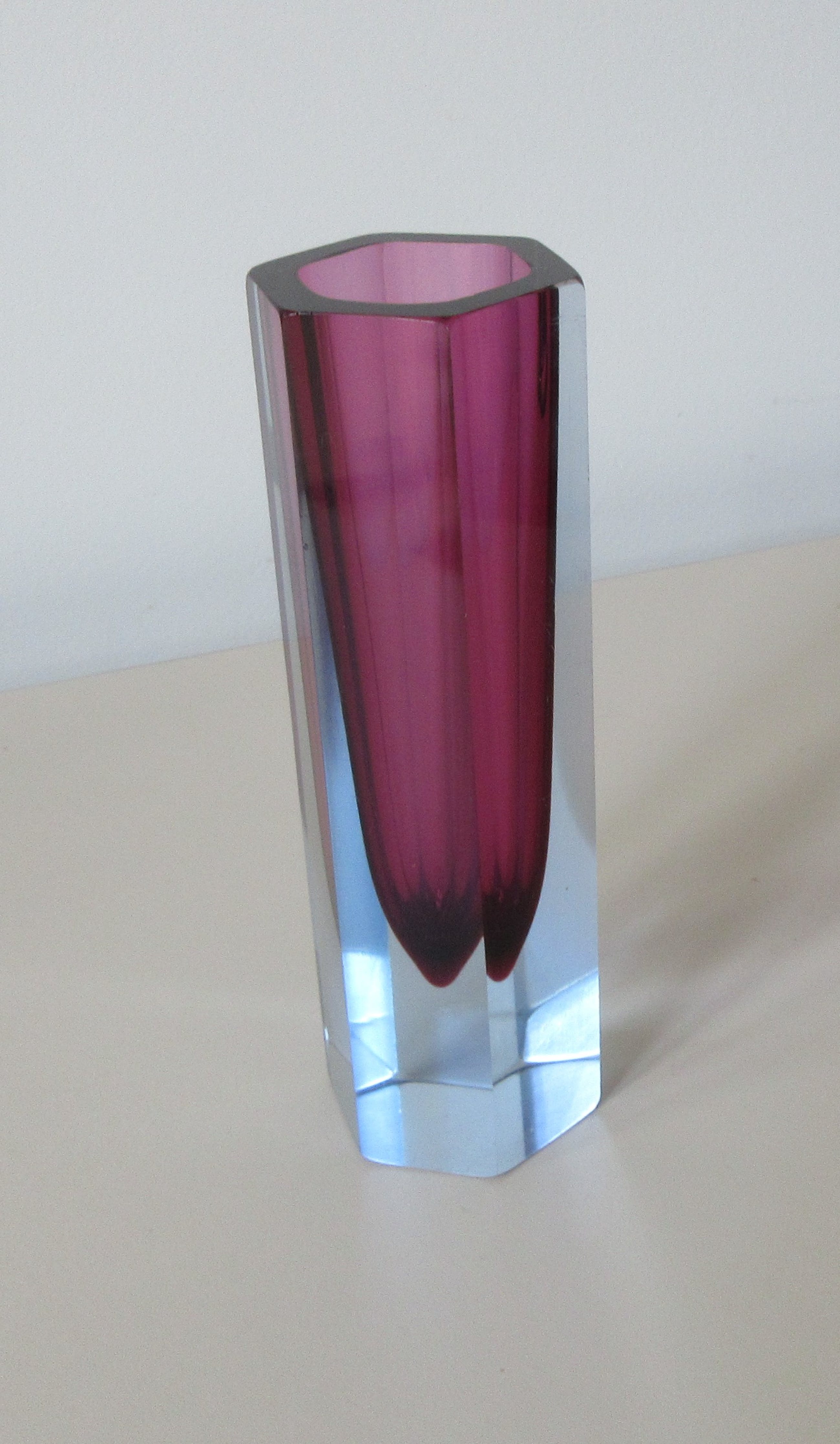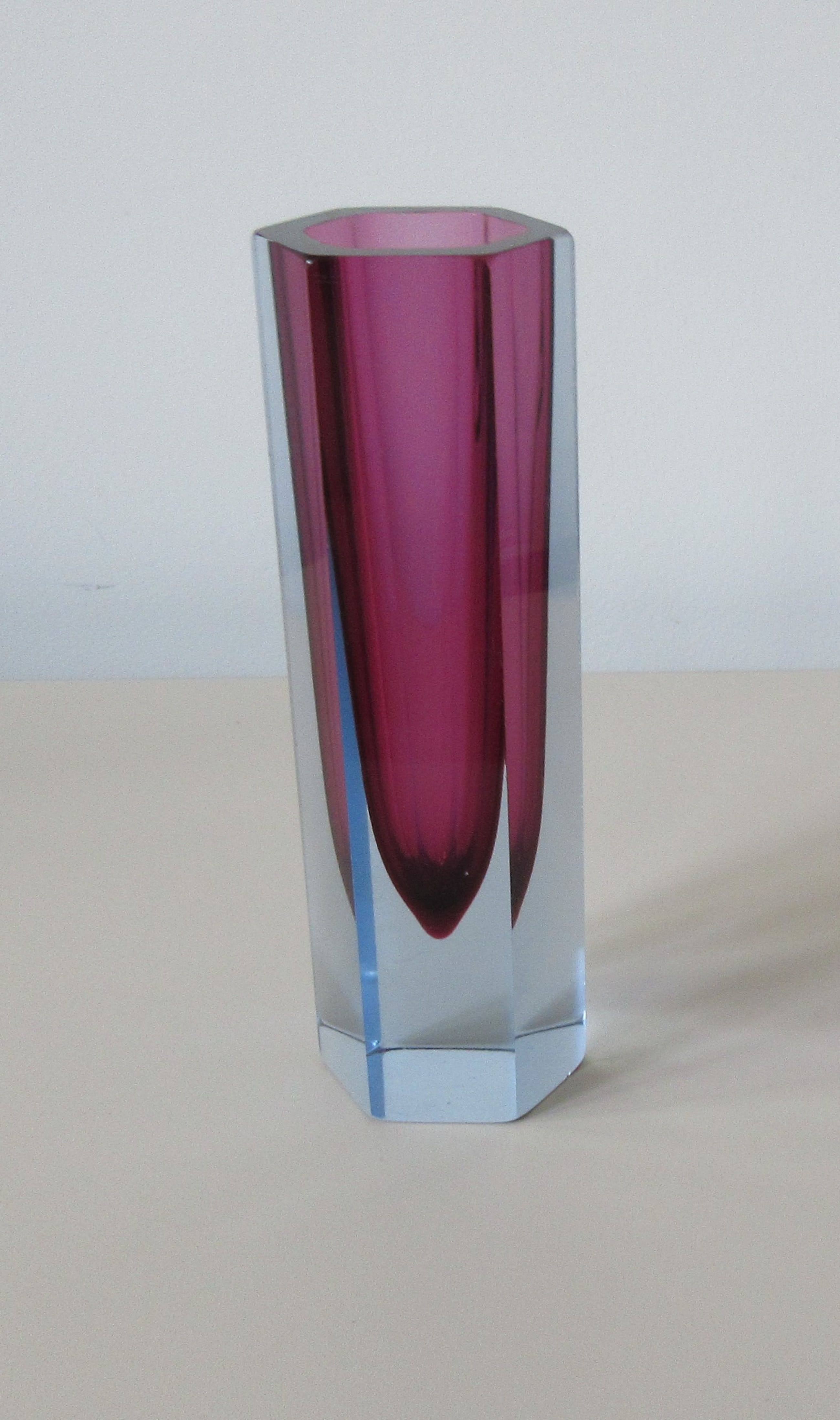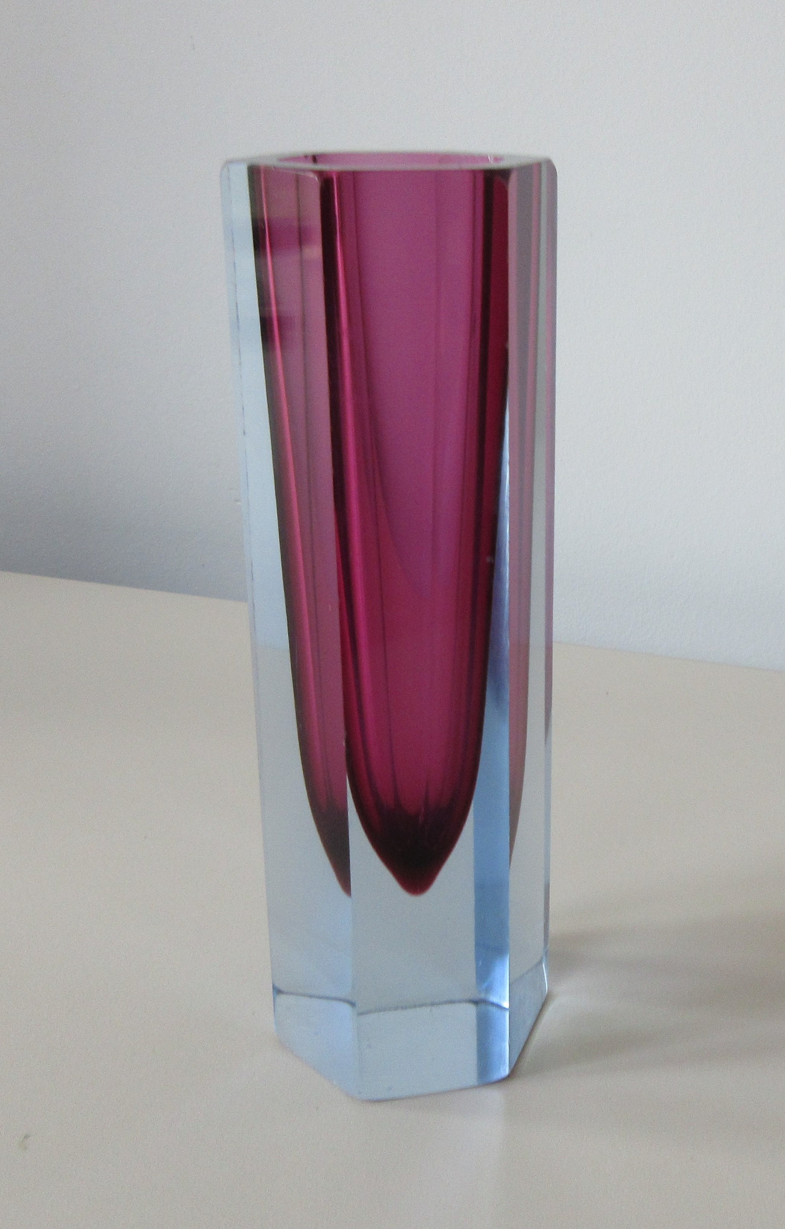 Zeshoekige Sommerso glazen vaasje - ontwerp Flavio Poli in de jaren'60 voor Vetri Seguso uit Murano. Deze is in de kleurstelling; paars en lichtblauw. In prima conditie, niet gesigneerd.