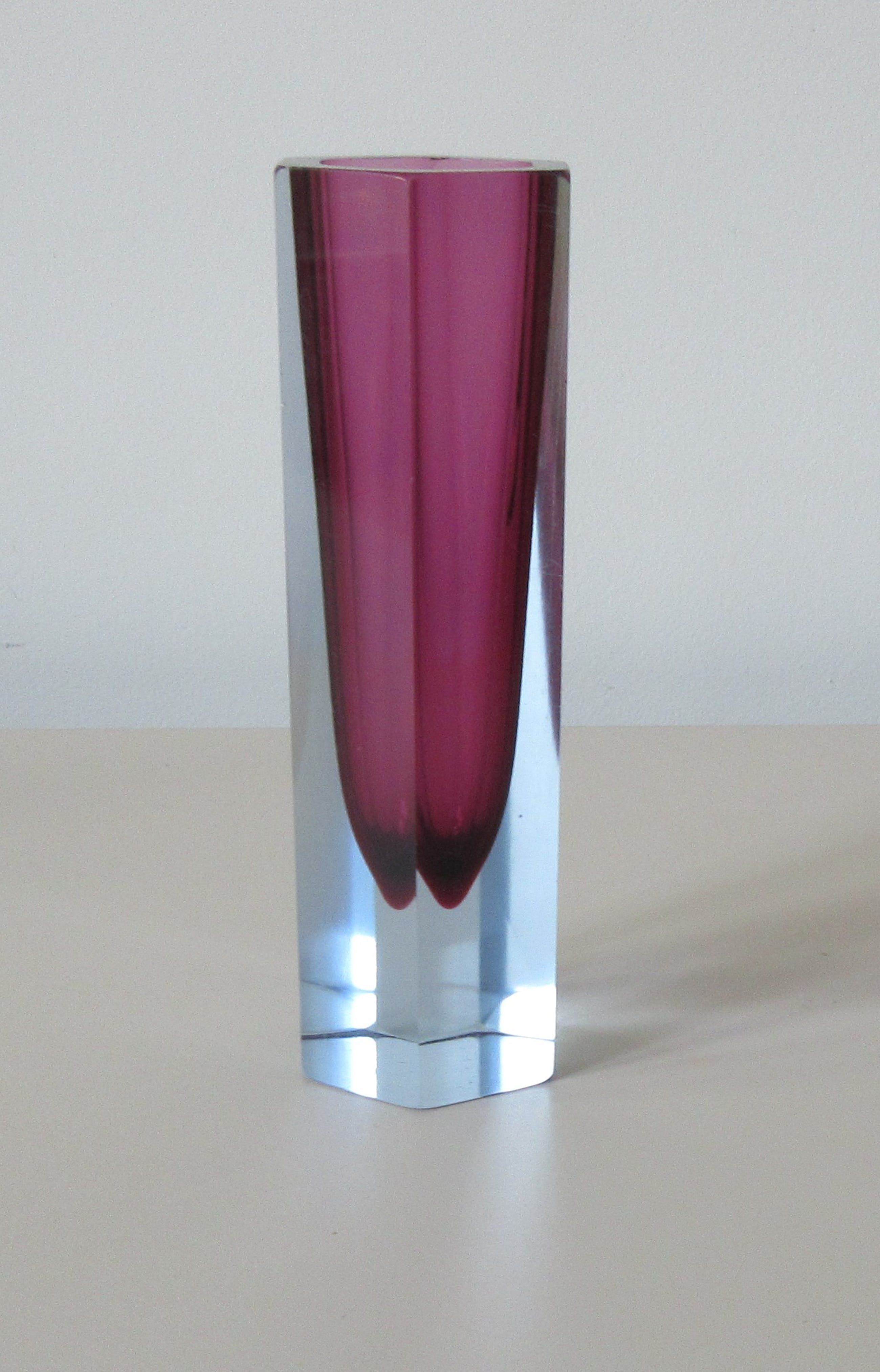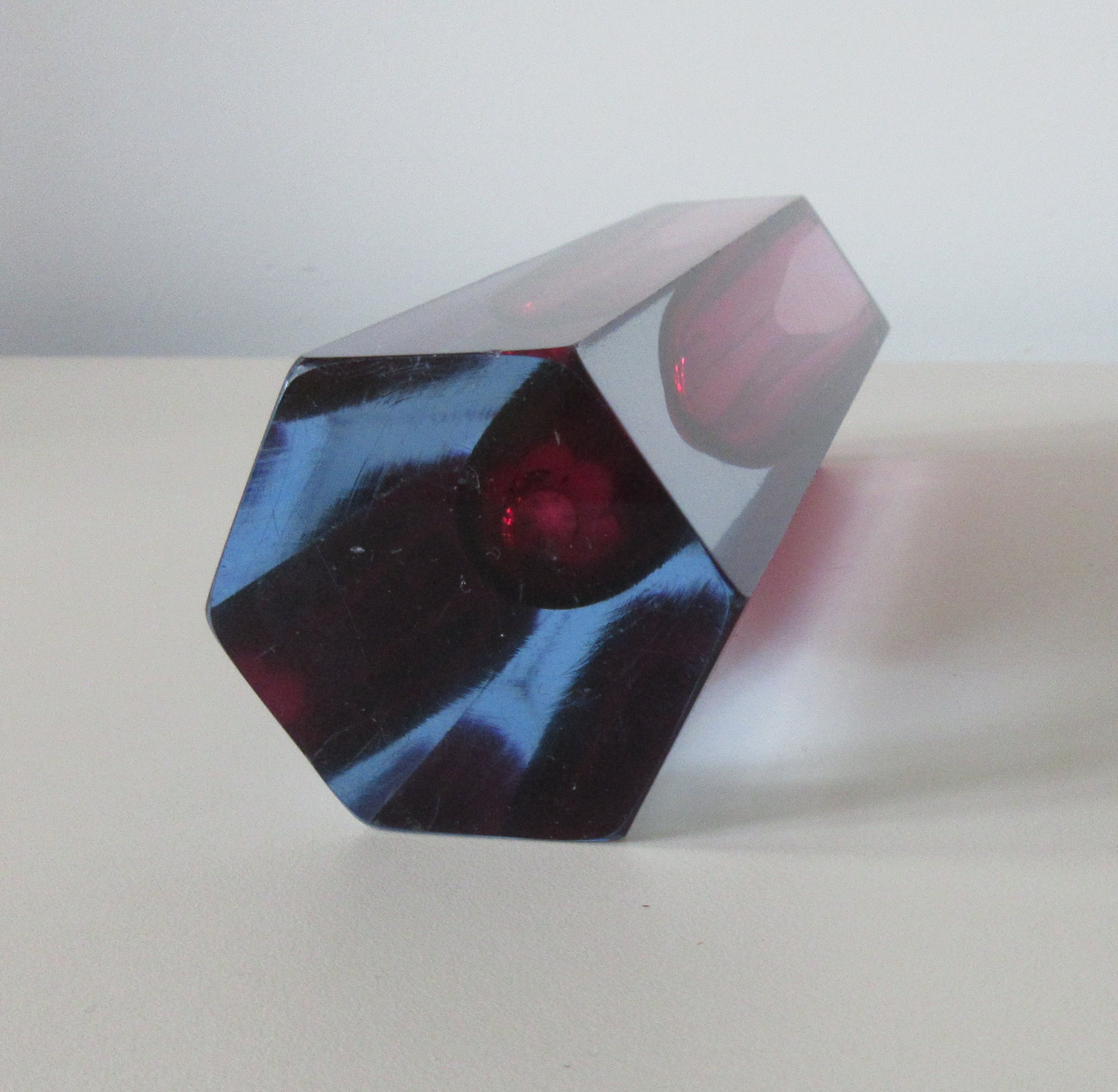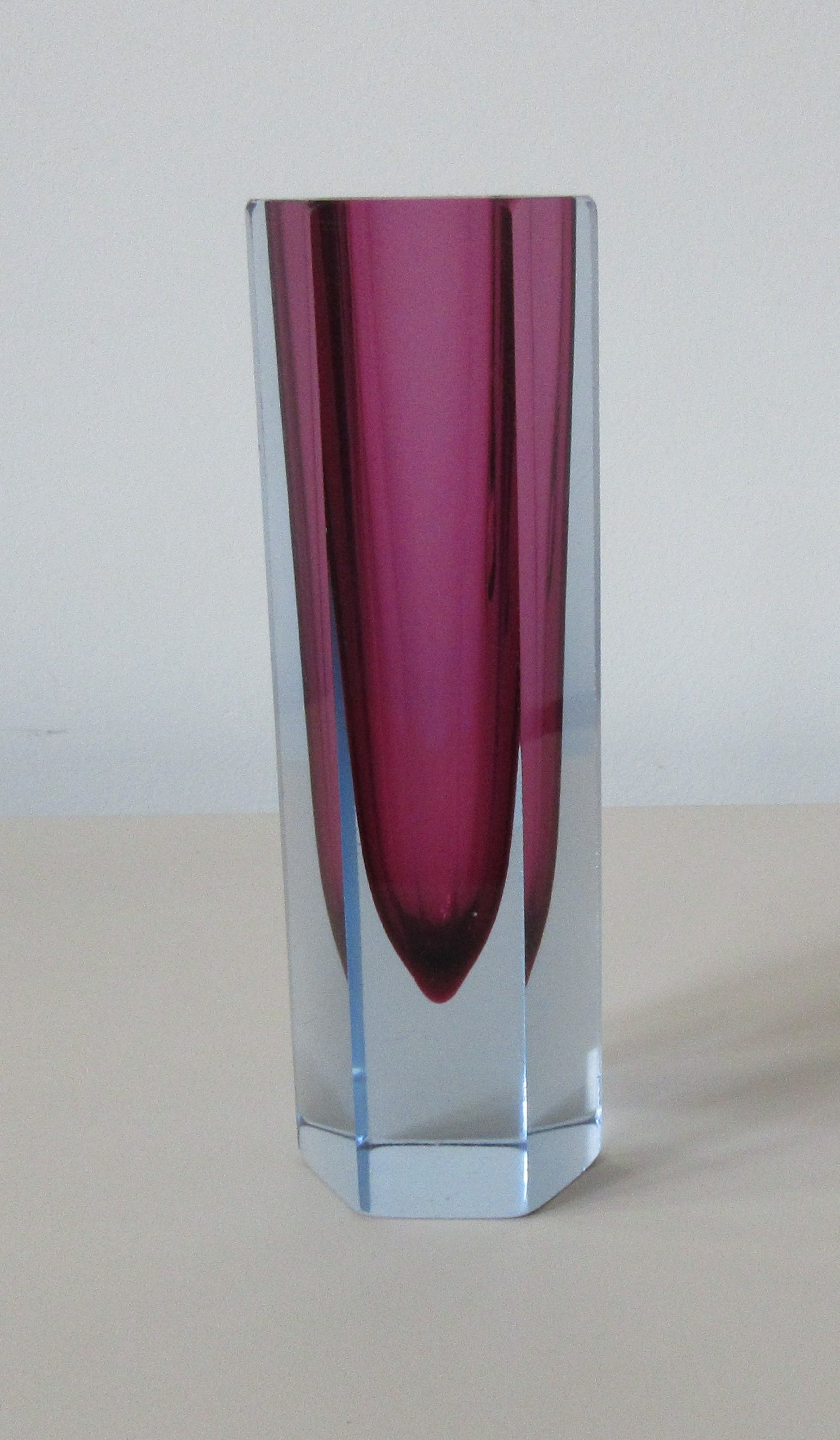 Zeshoekige Sommerso glazen vaasje - ontwerp Flavio Poli in de jaren'60 voor Vetri Seguso uit Murano. Deze is in de kleurstelling; paars en lichtblauw. In prima conditie, niet gesigneerd.