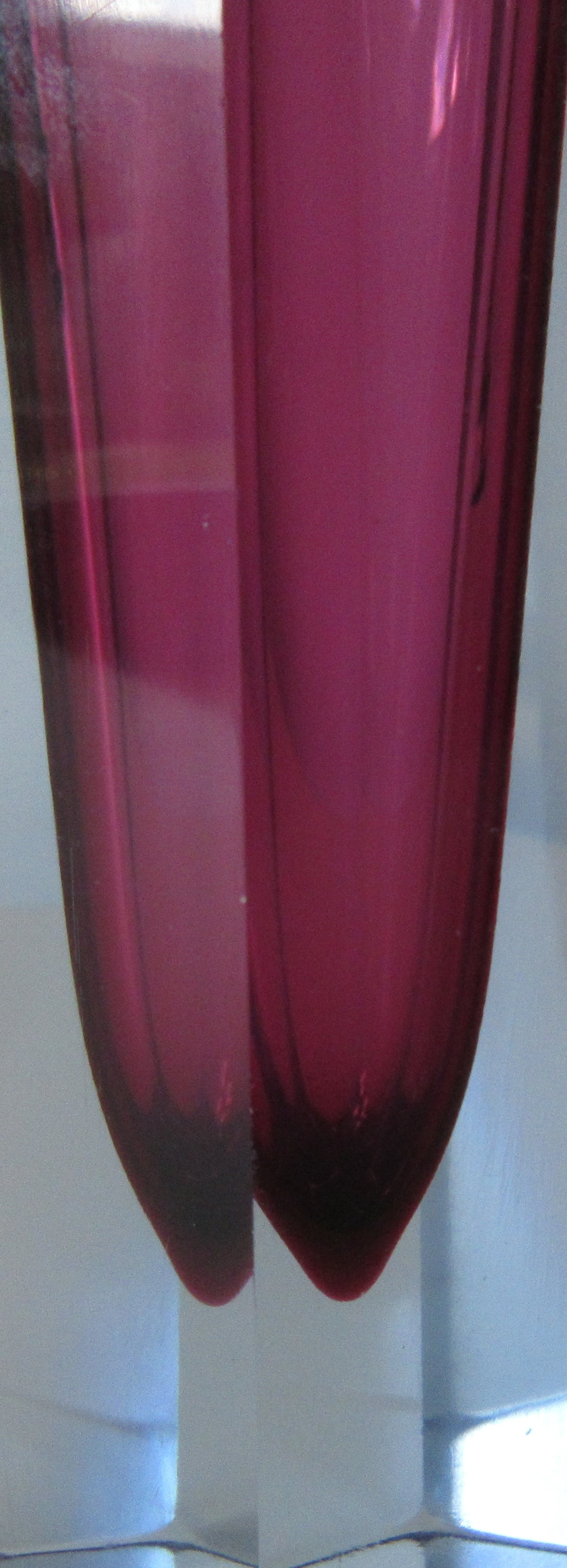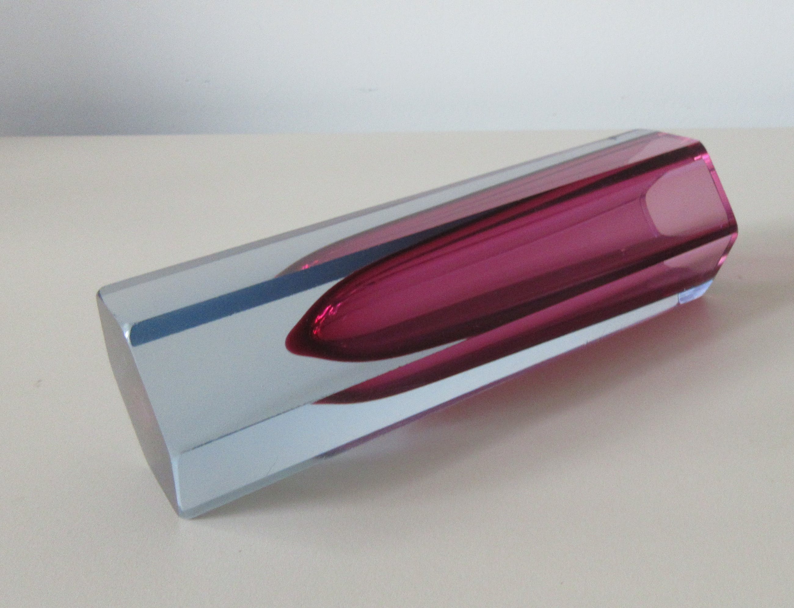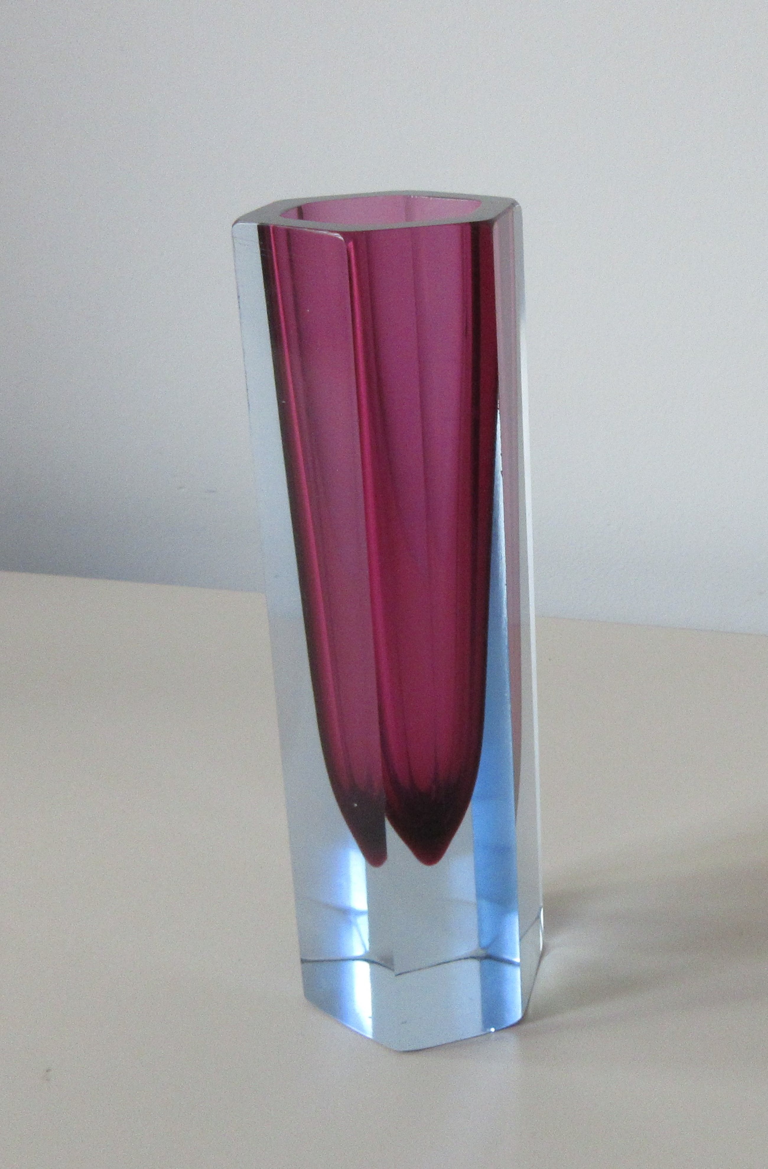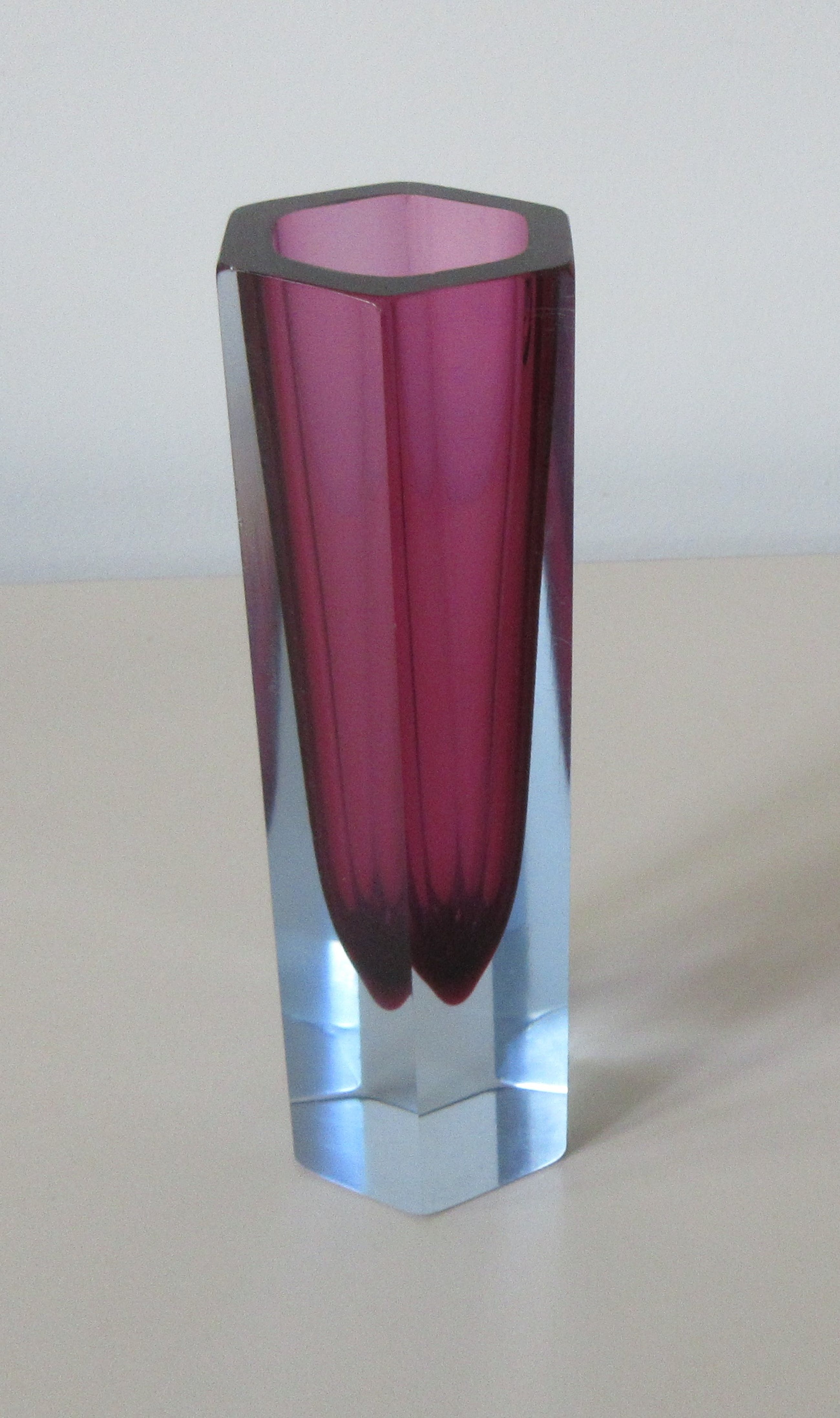 Zeshoekige Sommerso glazen vaasje - ontwerp Flavio Poli in de jaren'60 voor Vetri Seguso uit Murano. Deze is in de kleurstelling; paars en lichtblauw. In prima conditie, niet gesigneerd.