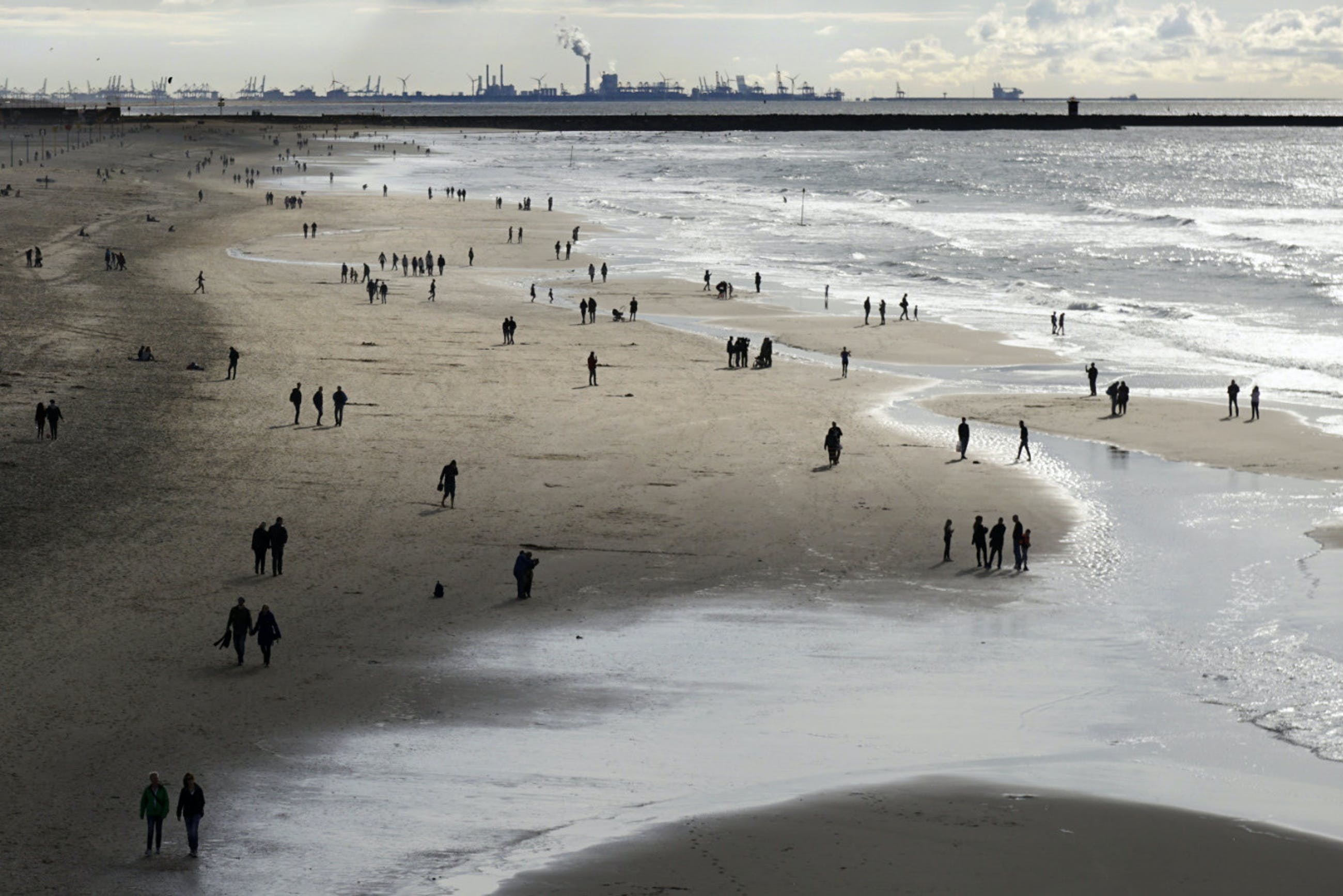 Sfeervol beeld van wandelende mensen op een bewolkte dag met aan de horizon de Maasvlakte. Licht door de wolken verlicht het strand.