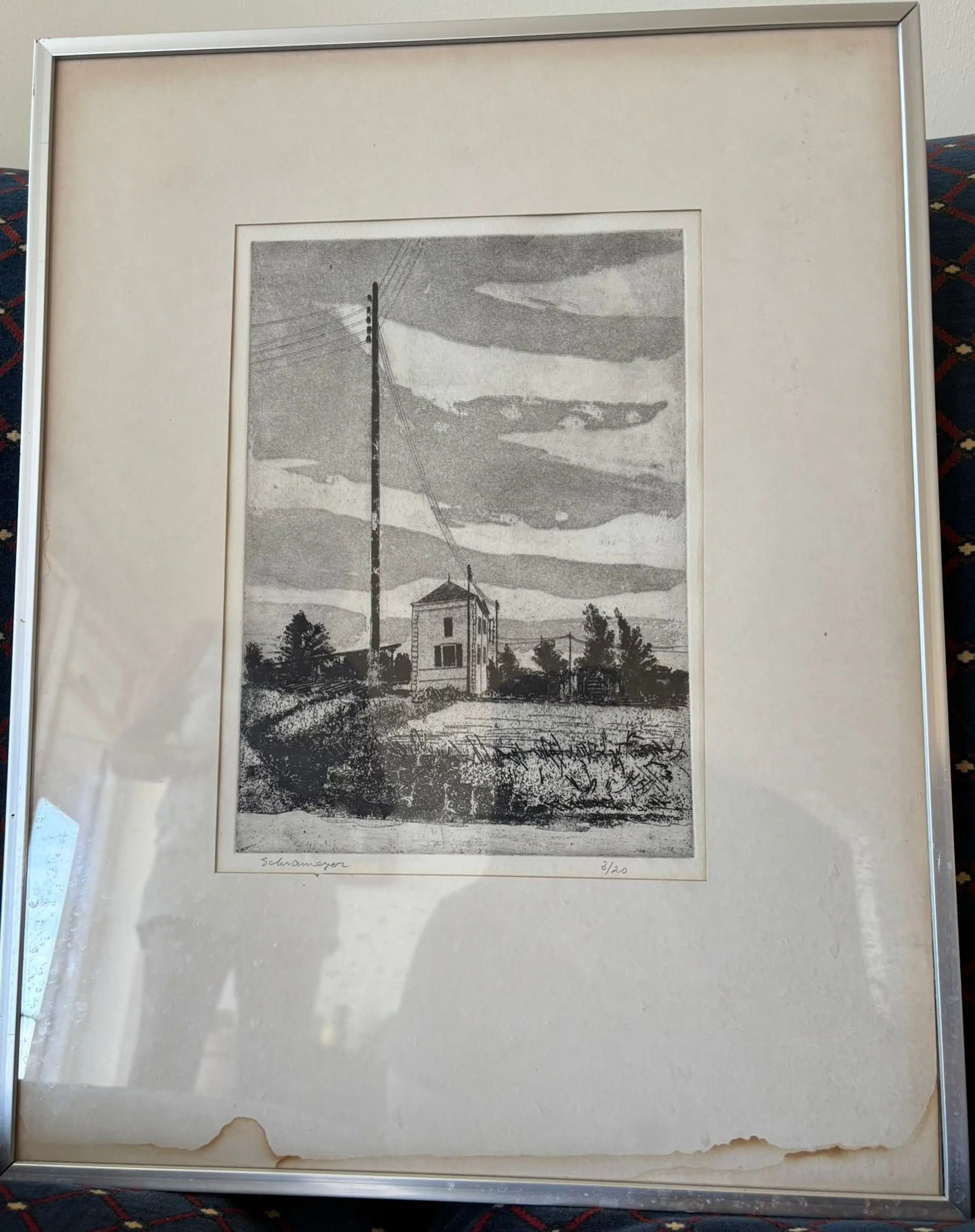 Deze ets toont een landelijk huis aan de Loire, geplaatst in een open landschap met akkers, bomen en een markante elektriciteitspaal op de voorgrond. Schrameijer combineert een realistische landschapsweergave met een krachtig grafisch contrast tussen lucht, bebouwing en grond. De gelaagde wolkenpartij en het lijnenspel in de voorgrond geven het werk diepte en een rustige, enigszins melancholische sfeer. Het werk past goed binnen de traditie van de Nederlandse figuratieve grafiek uit de tweede helft van de twintigste eeuw.