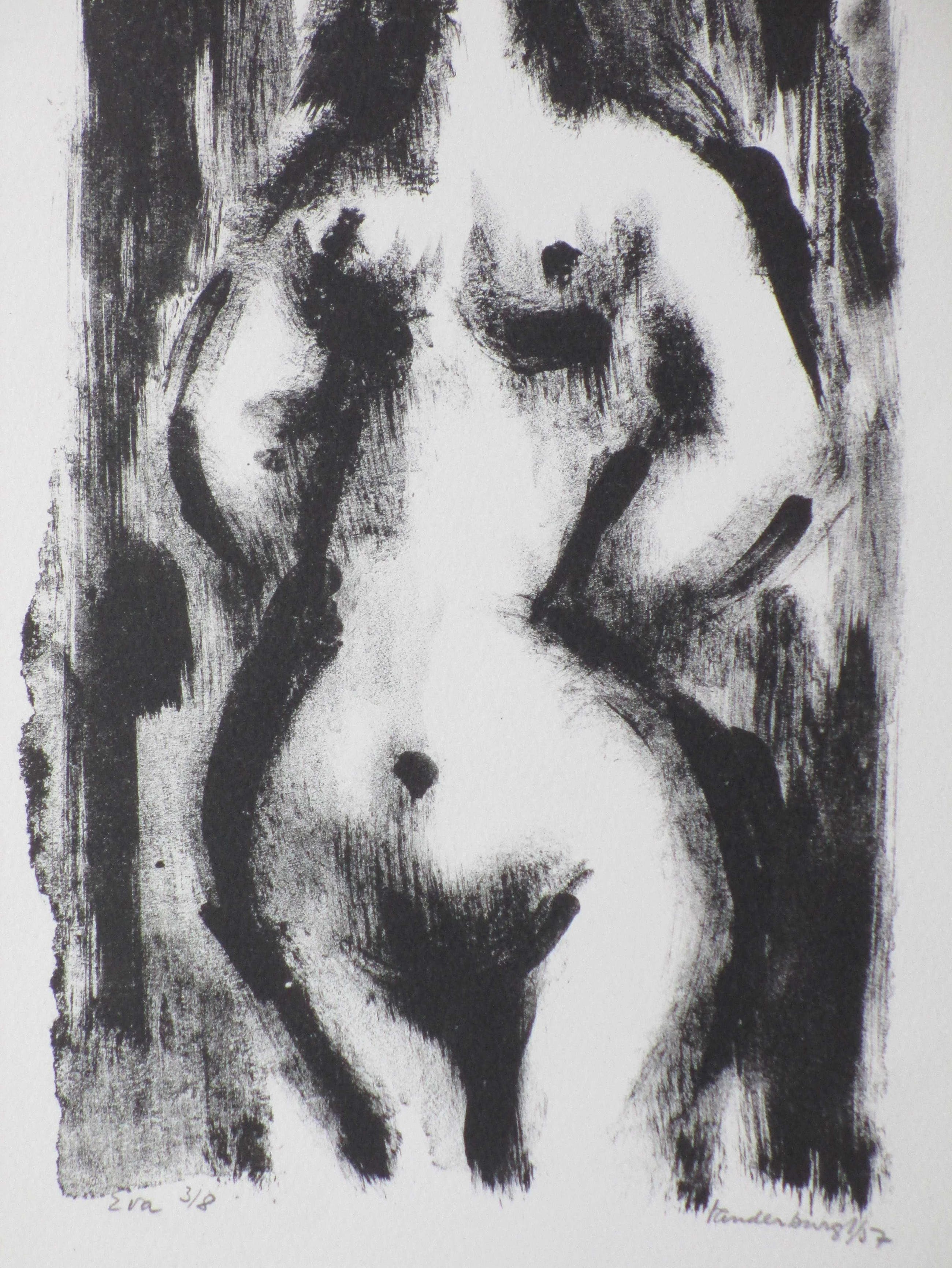 Houtsnede door Flip van der Burgt Voorstelling van een staande naakte vrouw, getiteld: 'Eva' Losbladig, beeldmaat 30x15, bladmaat 39x21 Gesigneerd in potlood r.o.: 'FvanderBurgt' Bijzonder kleine oplage Getiteld en genummerd in potlood l.o.: 'Eva 3/8' Authenticiteit volledig gegarandeerd
