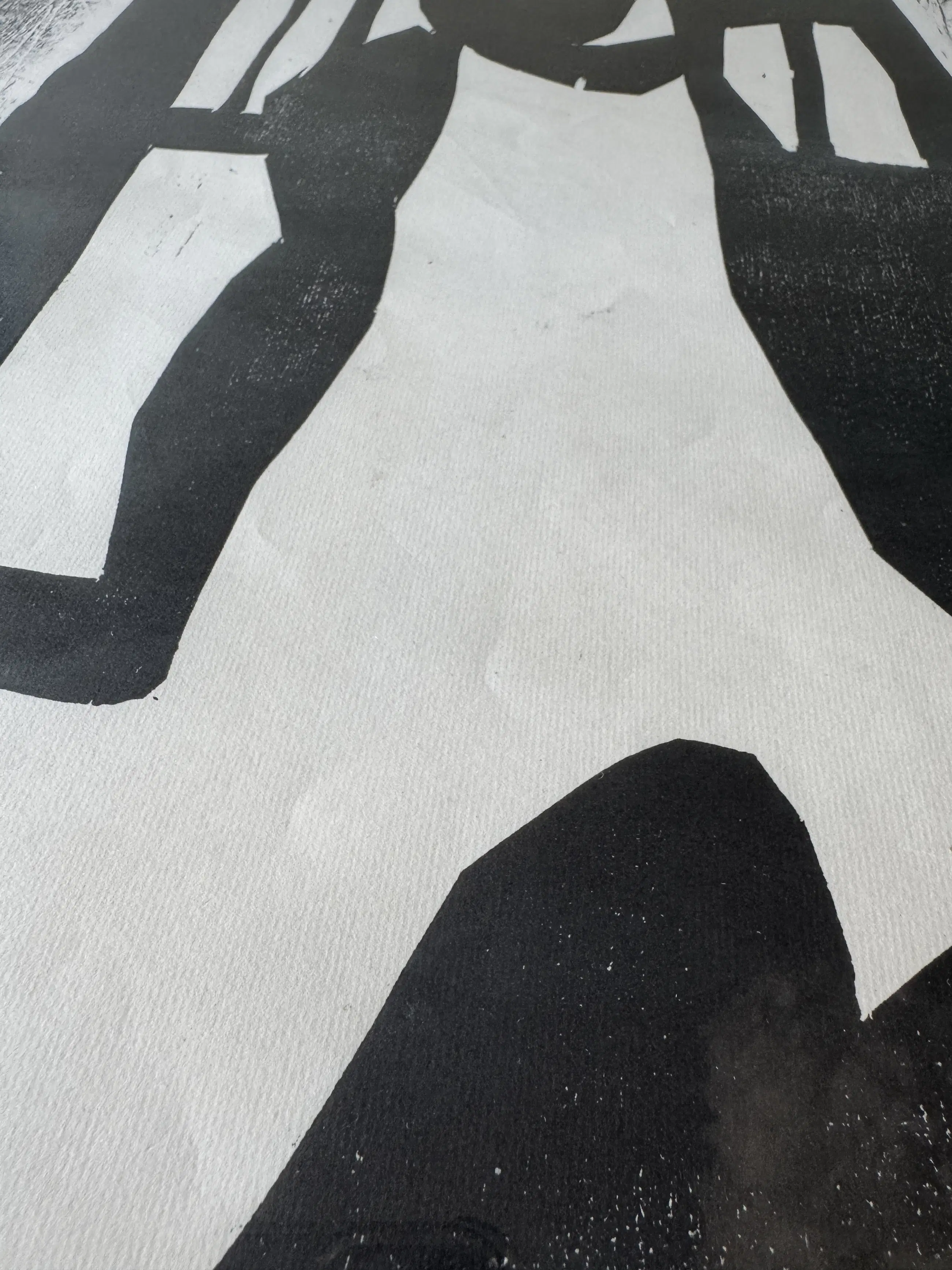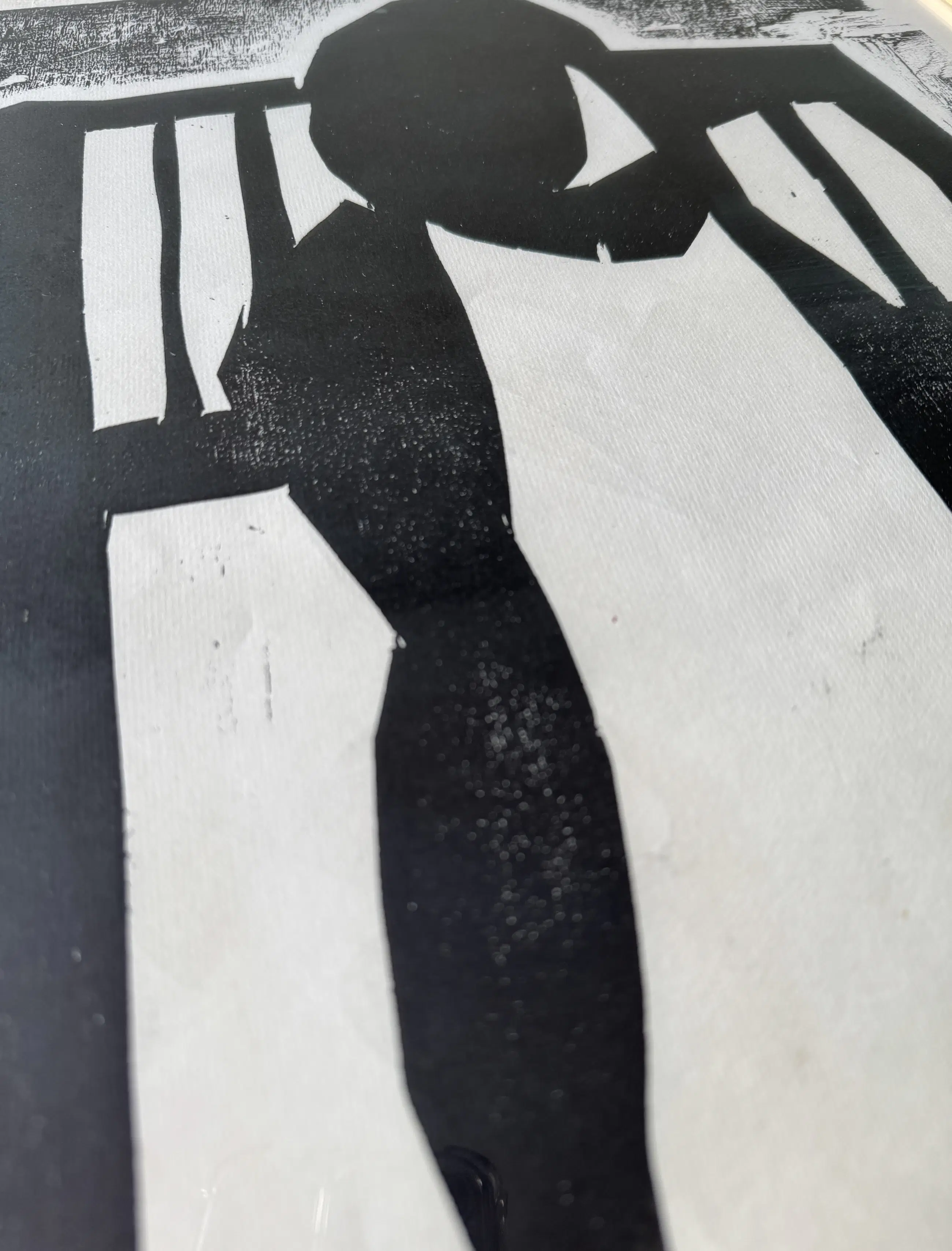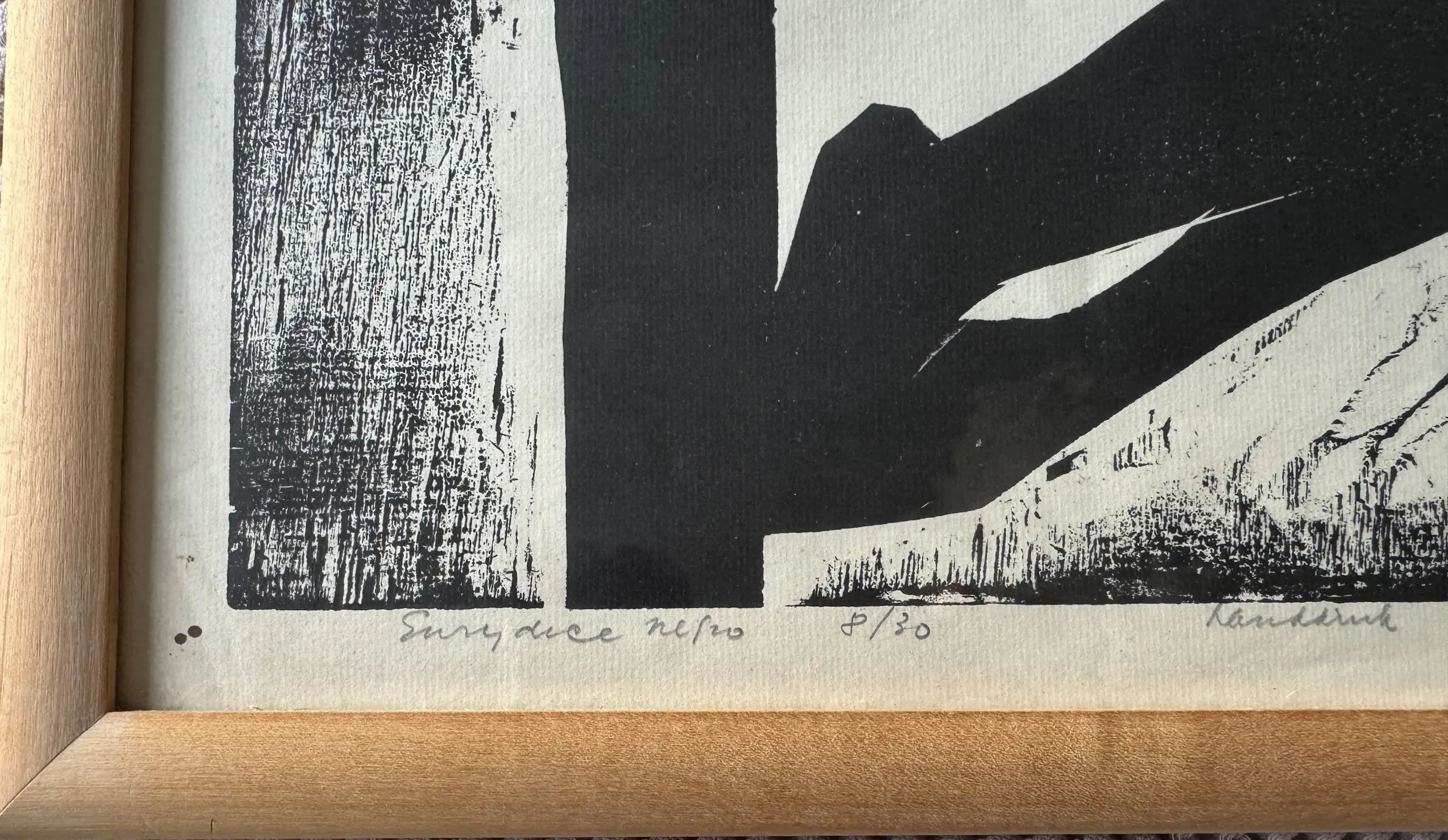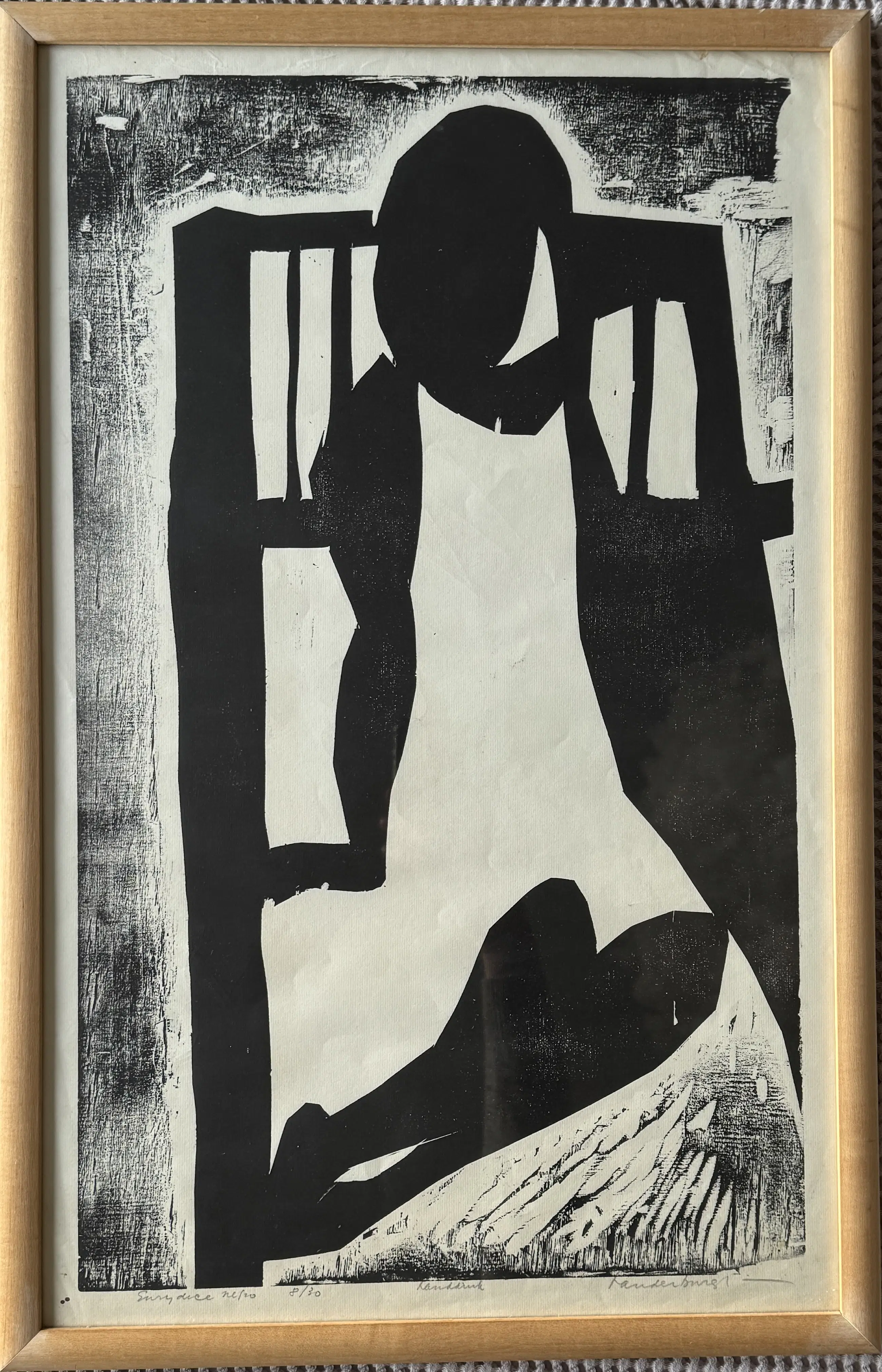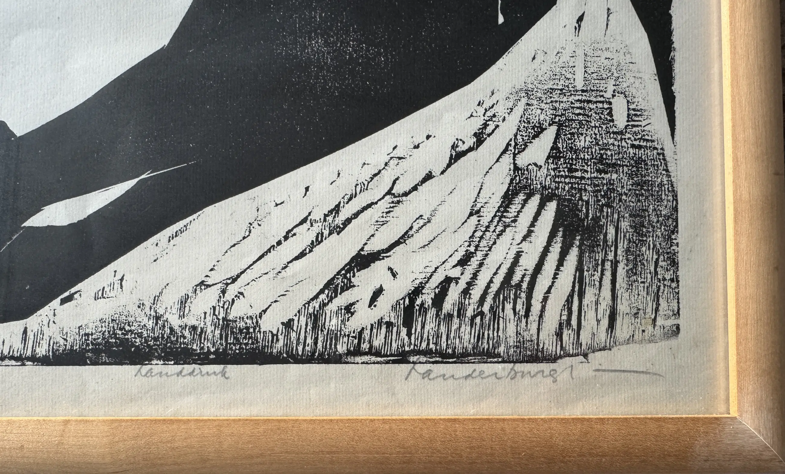 Fraaie houtsnede van Flip van der Burgt, waarschijnlijk gedrukt op kraftpapier. Professioneel ingelijst en afgewerkt, klaar om direct aan de muur te hangen.