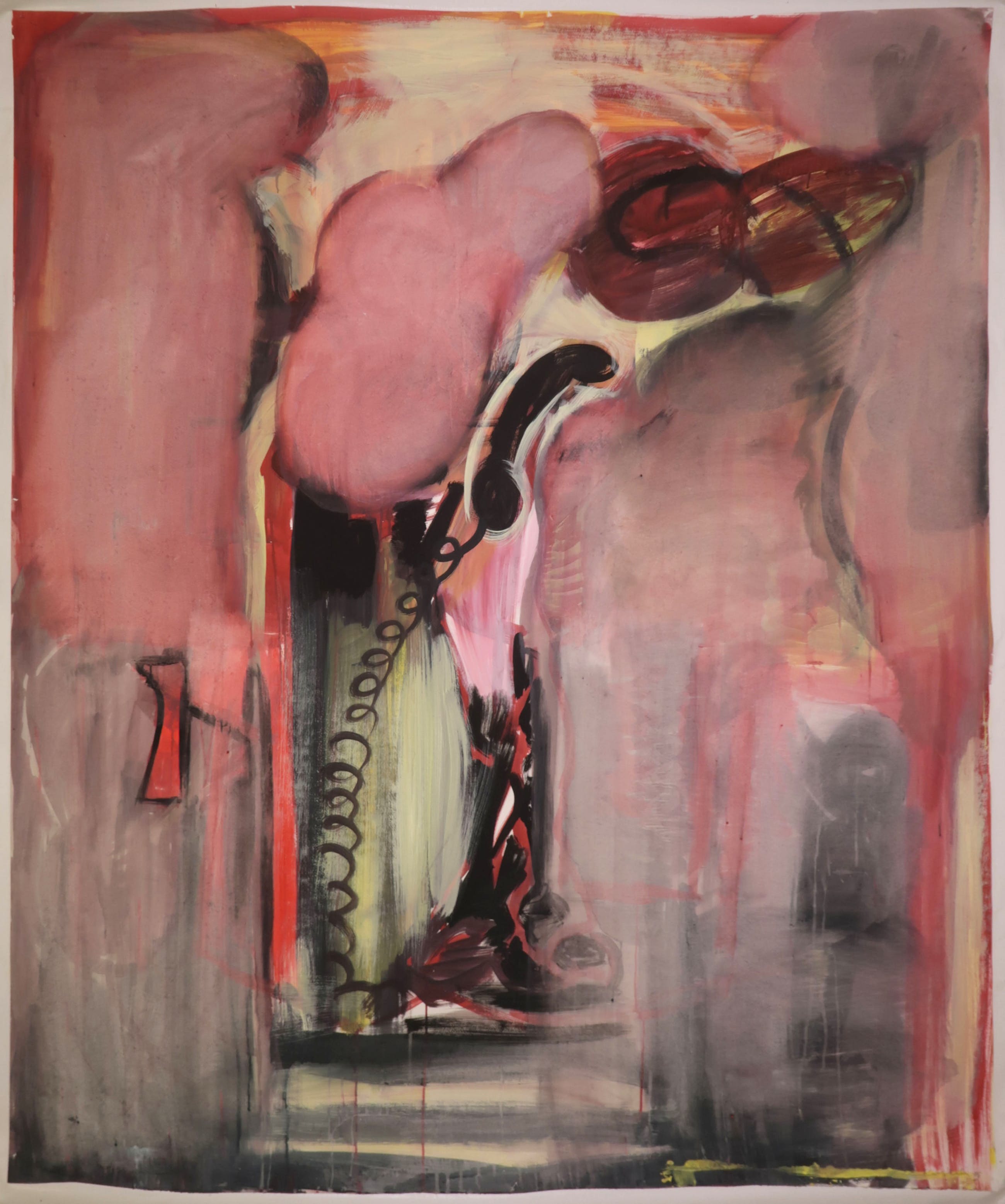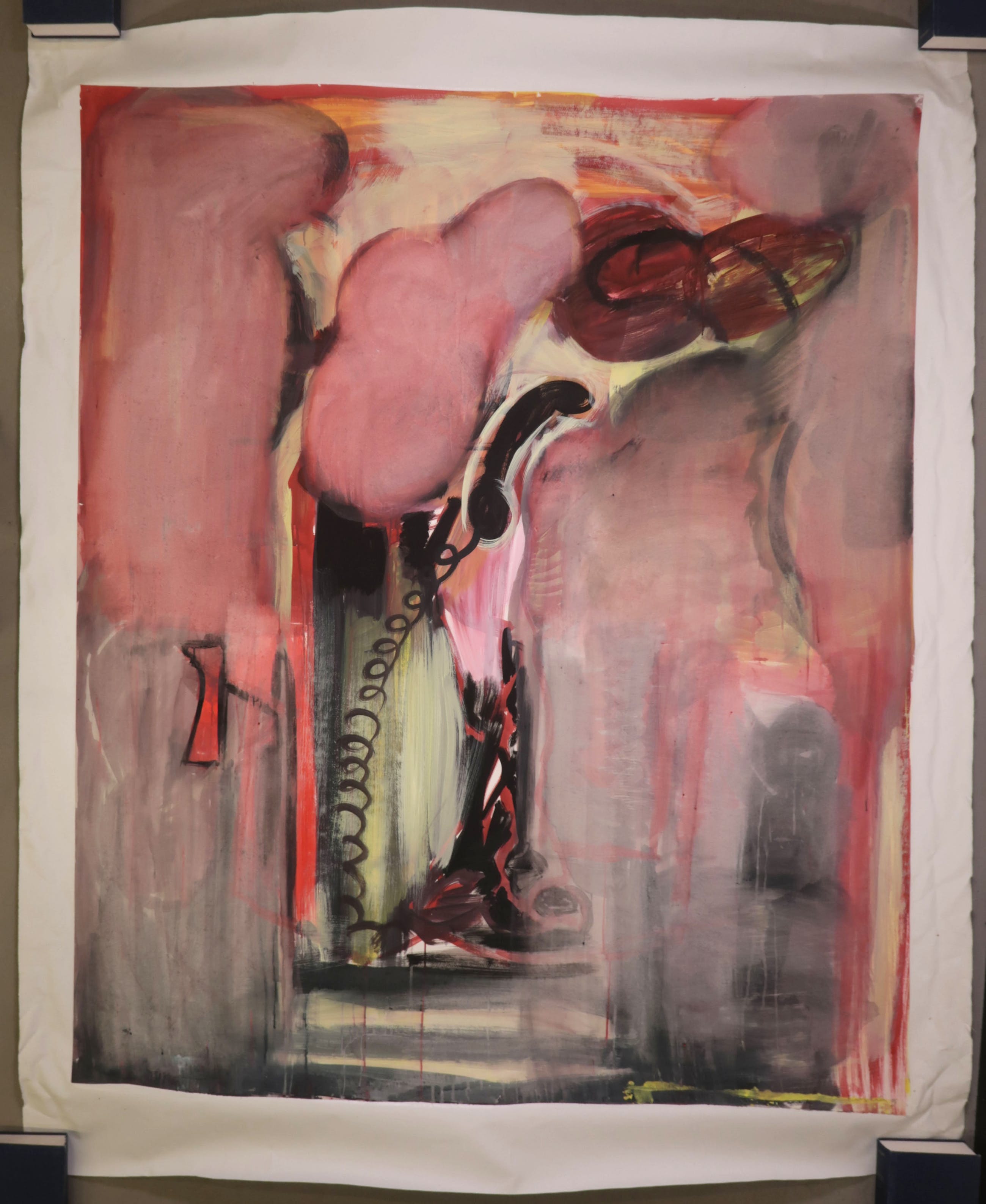 | Doordat het doek niet op een spieraam zit maar is opgerold, is het doek 'gerold'. De randen en hoeken zijn hier en daar gevouwen. Als het werk wordt opgespannen op een spieraam, is hier niets meer van te zien. | |