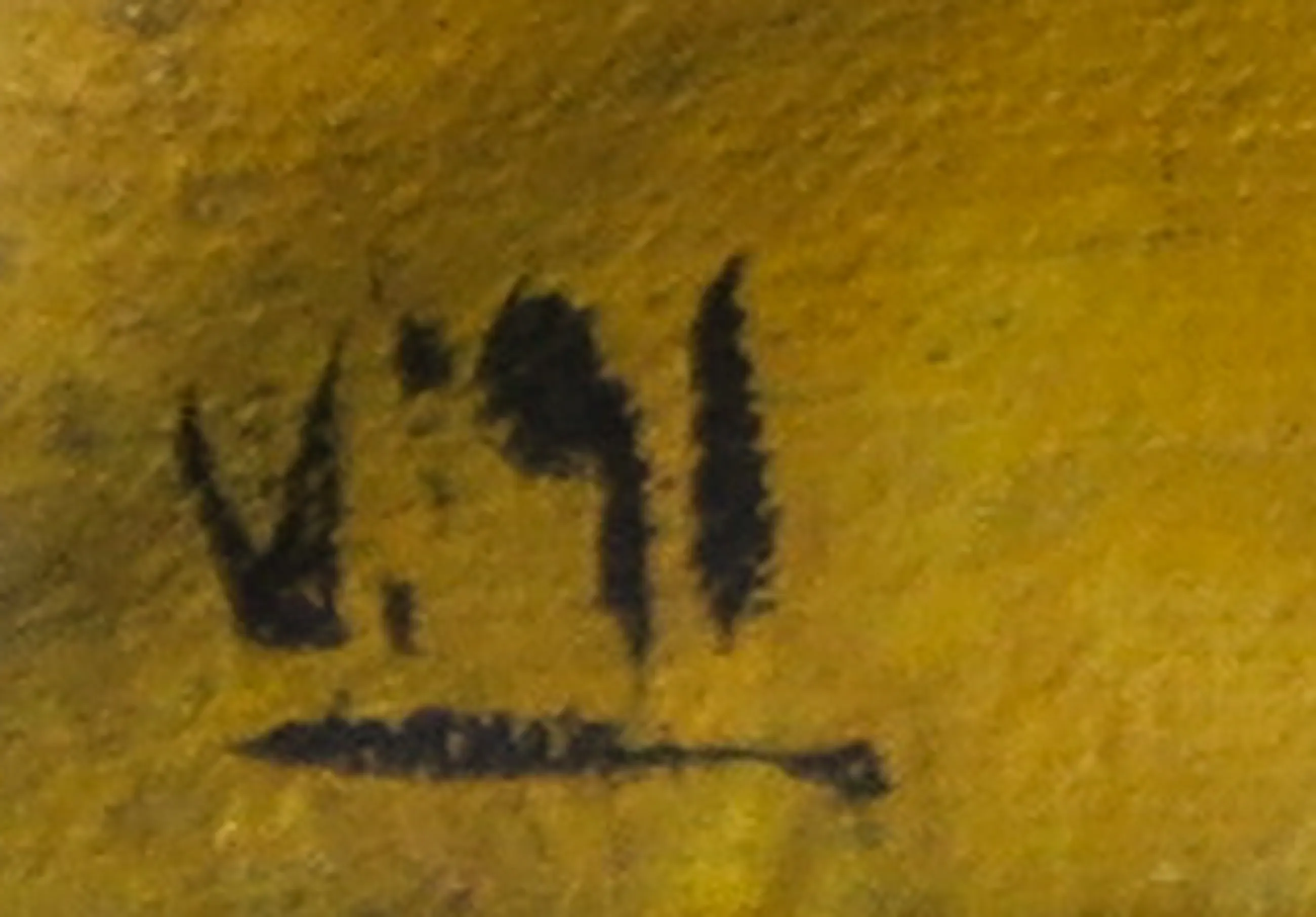 Lichte slijtage en bobbeling langs de randen van het doek. Paar plekjes met wat craquelé. | |