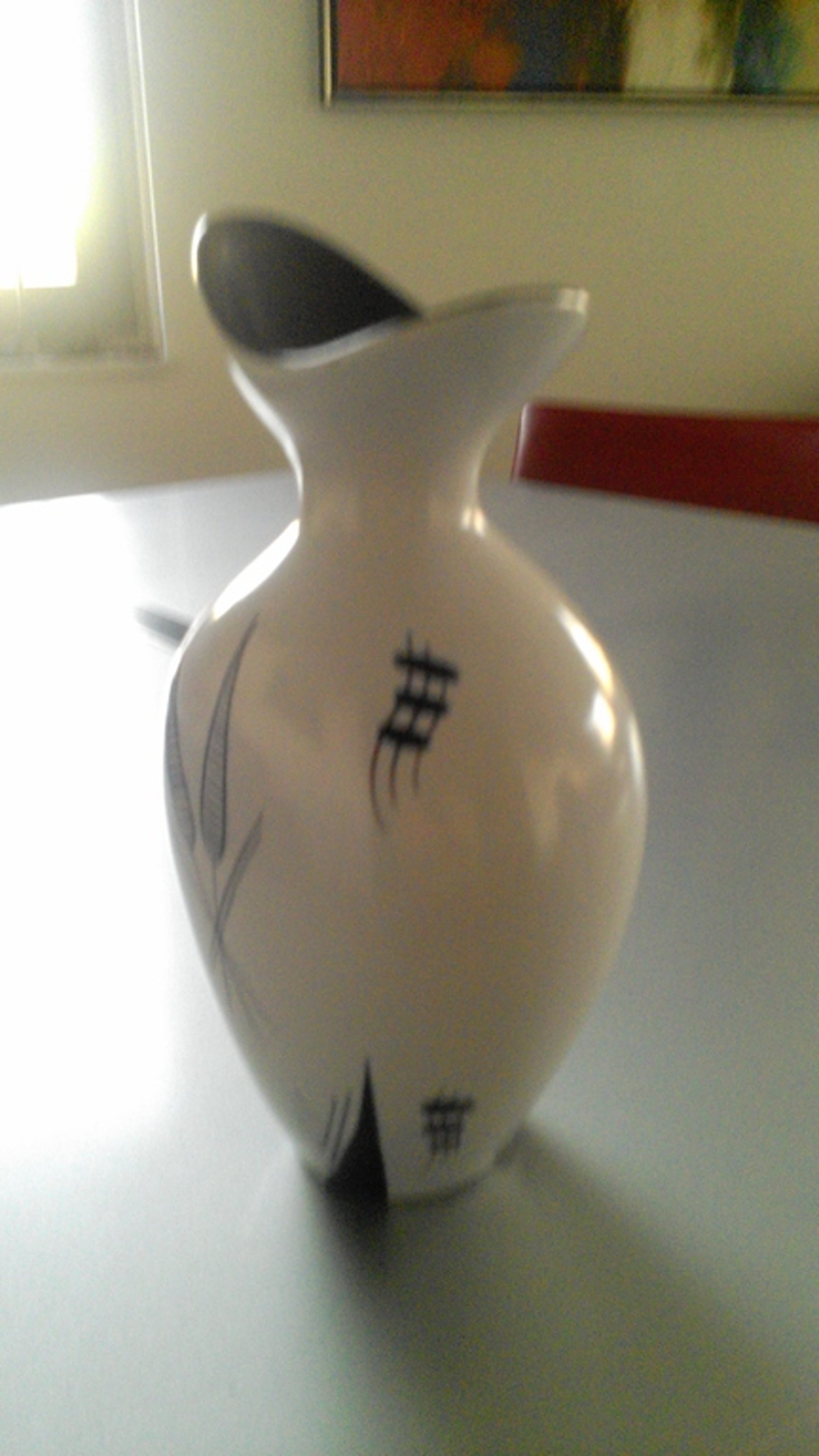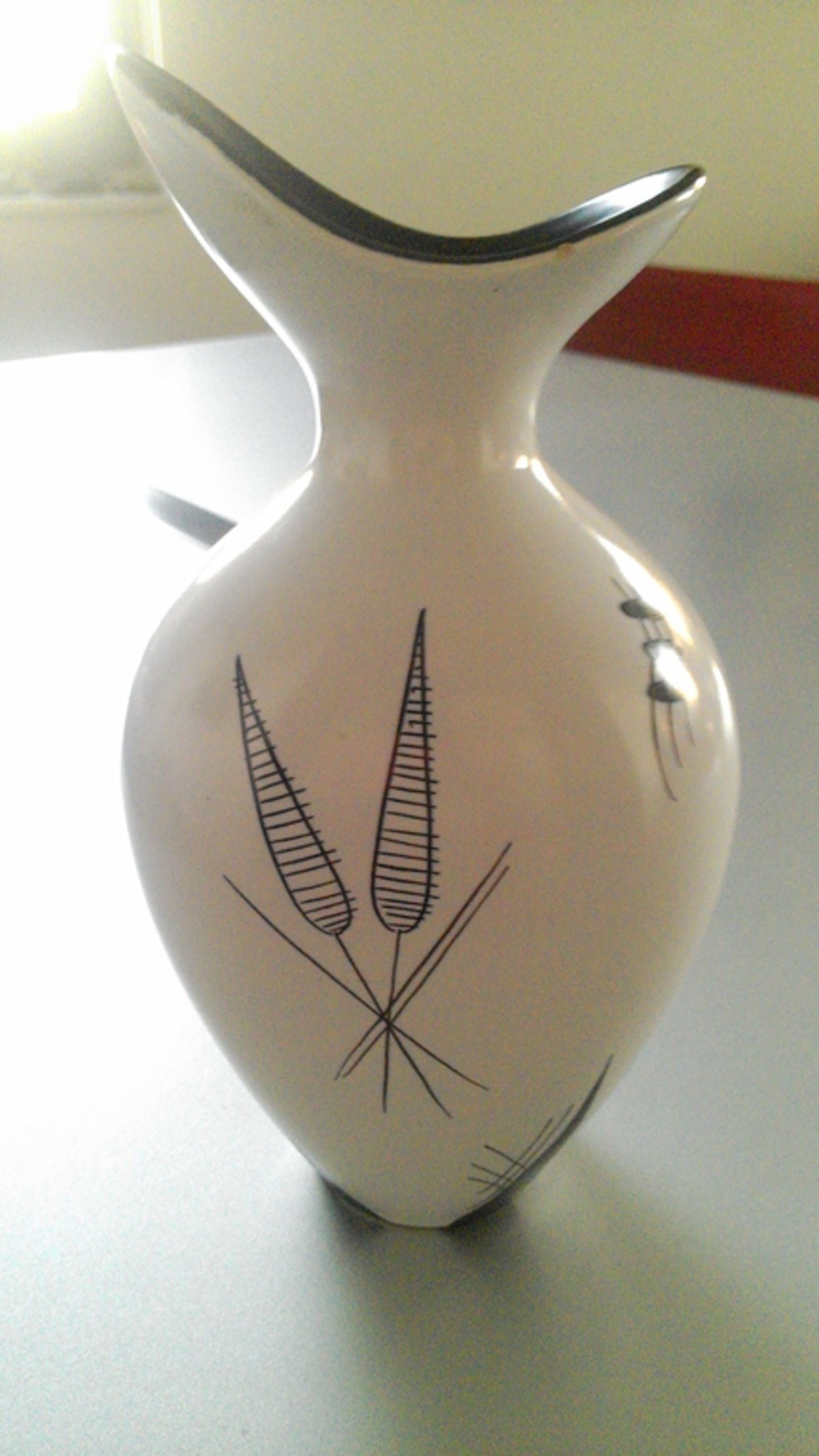 Witte vaas met zwarte decoraties en zwarte binnenkant ca 1955 Floa Gouda Capri