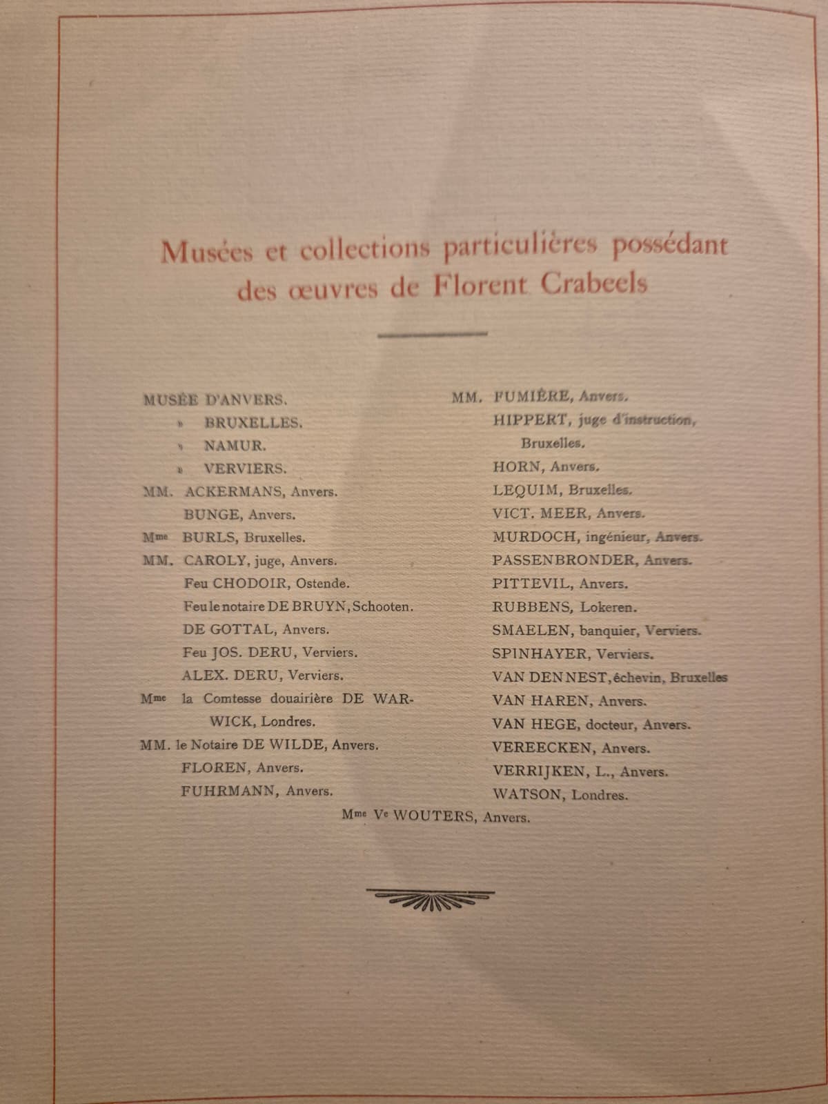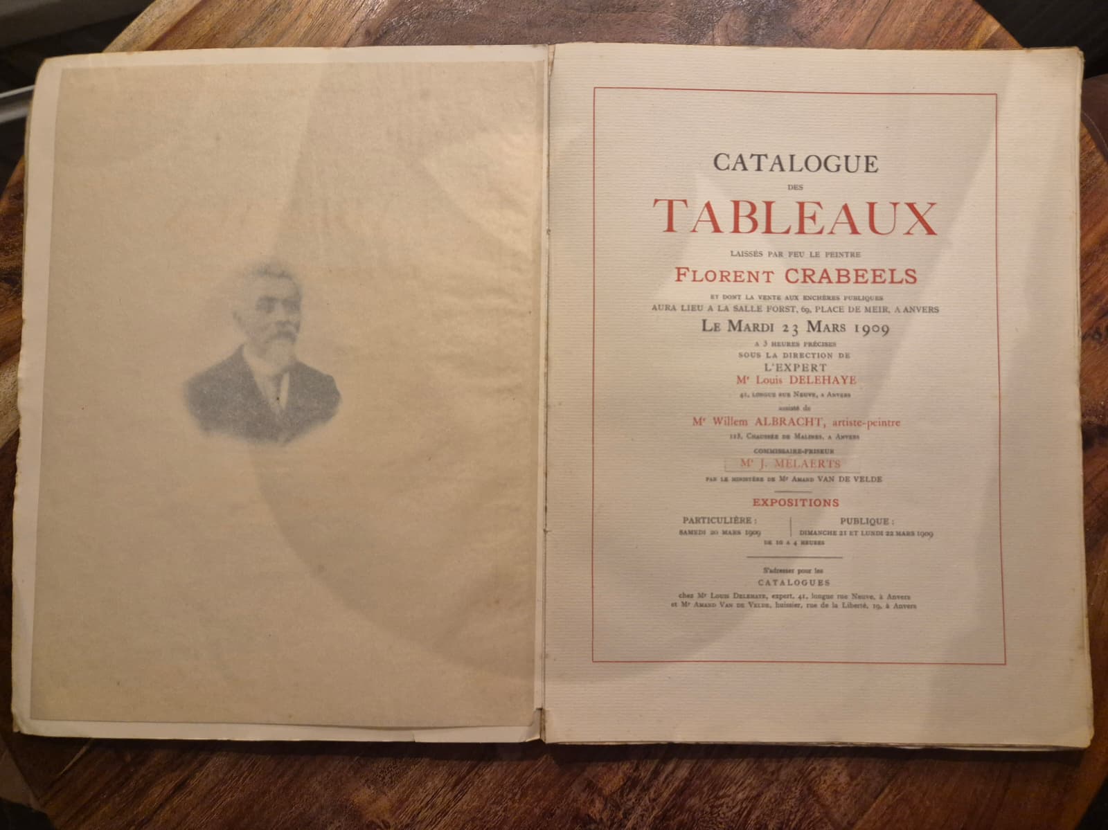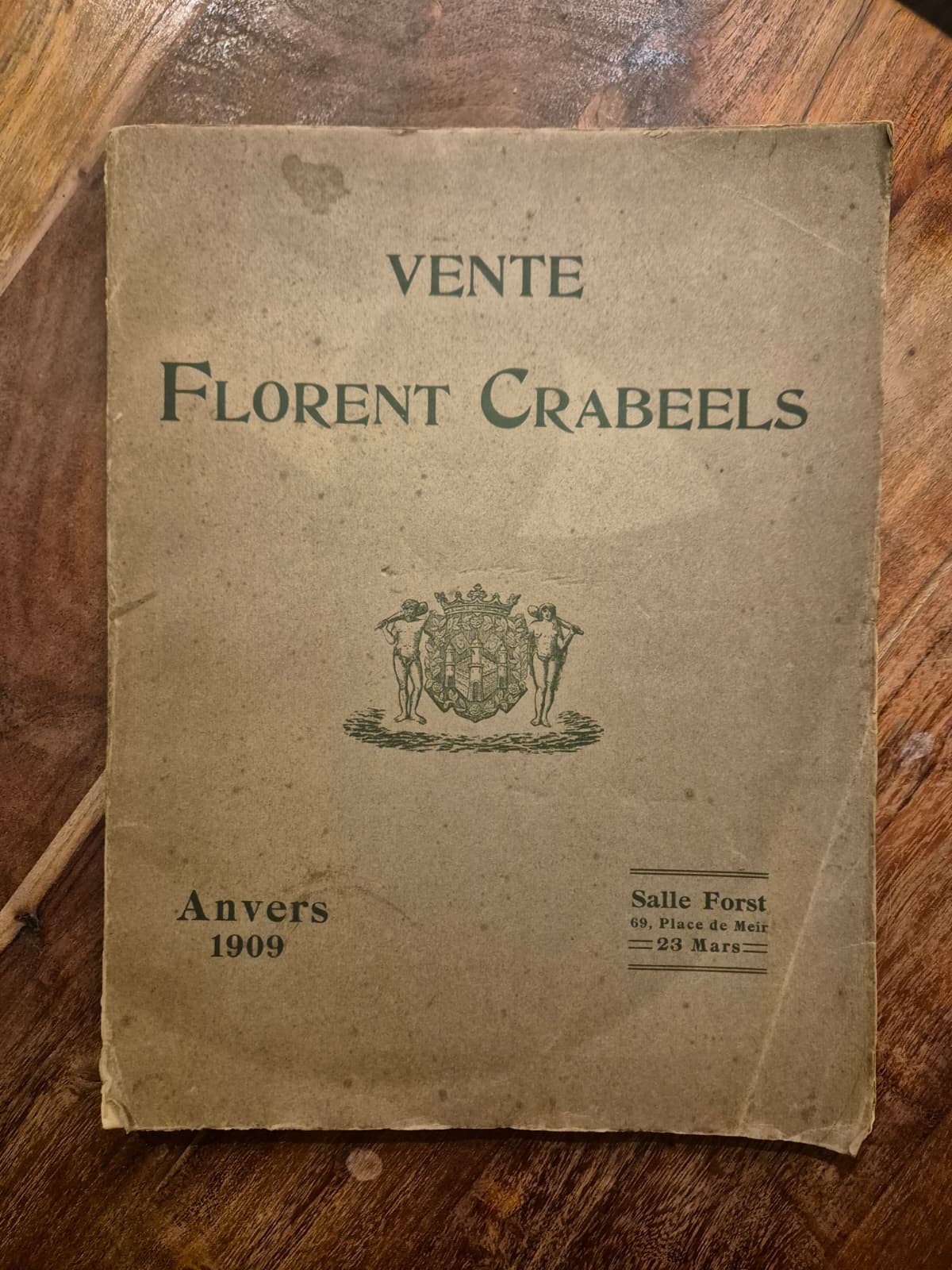 Daarbij een catalogus "Vente Florent Crabeels" van 107 werken die na zijn dood zijn geveild op 23 maart 1909 als deel van zijn nalatenschap. Aan de binnenkant uitvoerige beschrijvingen van alle honderdzeven werken en meer dan tien drukken van enkele werken die geveild werden. In het Frans en de kaft is wat beschadigd, maar voor de rest in een uitzonderlijk goede staat gezien de leeftijd en het feit dat het catalogus is.