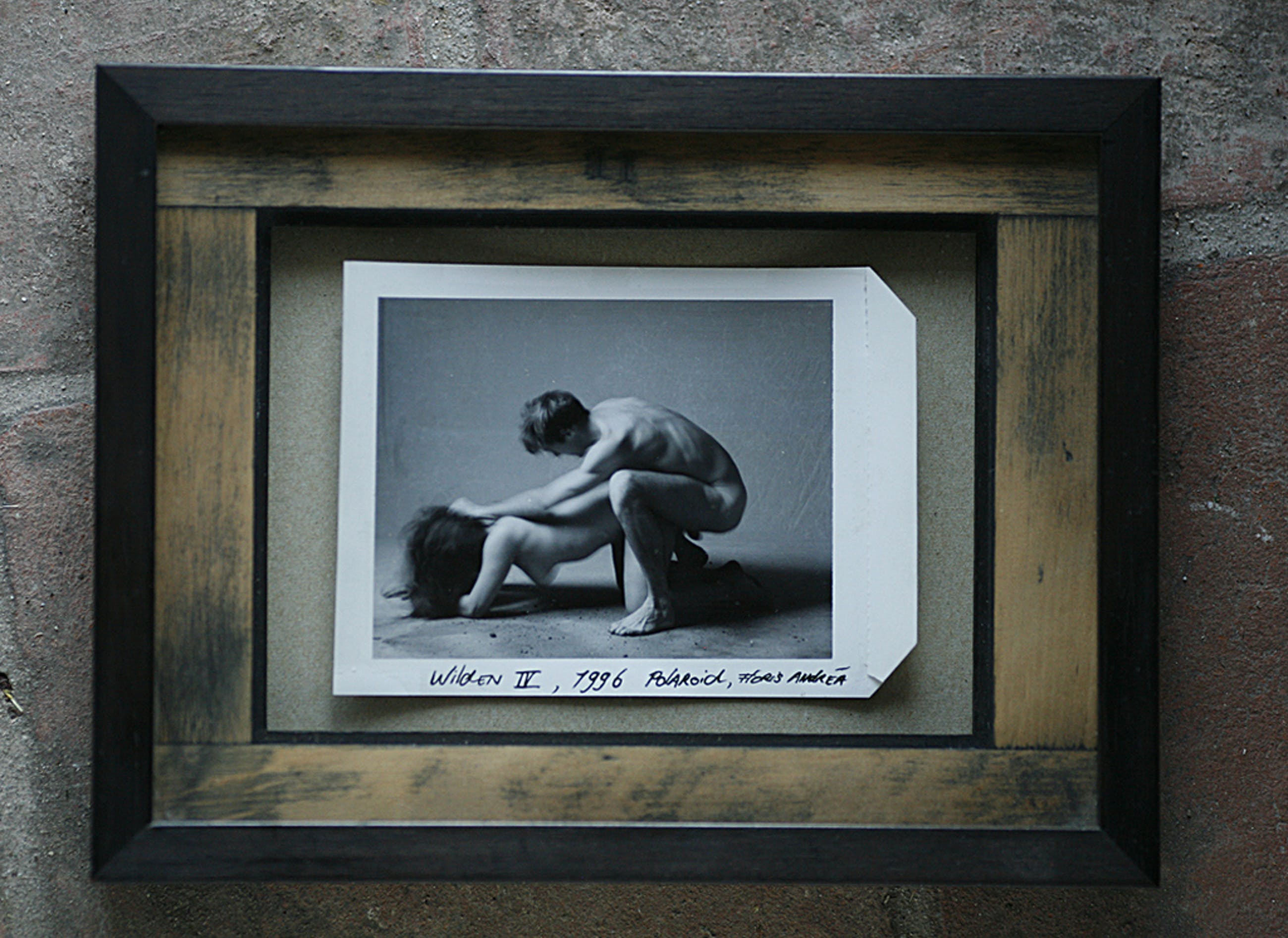 Titel: ' Wilden IV' - Materiaal: 4x5 inch polaroid (type 55), ingelijst 20 x 26cm. Jaar: 1996 (ingelijst in 2003) Dit type polaroid positieven werd afgelakt ivm conservering. Het exemplaar hing aan de ateliermuur van de kunstenaar voordat het werd ingelijst. Uit die periode stamt het scheurtje in het witte kader. Oplage: uniek