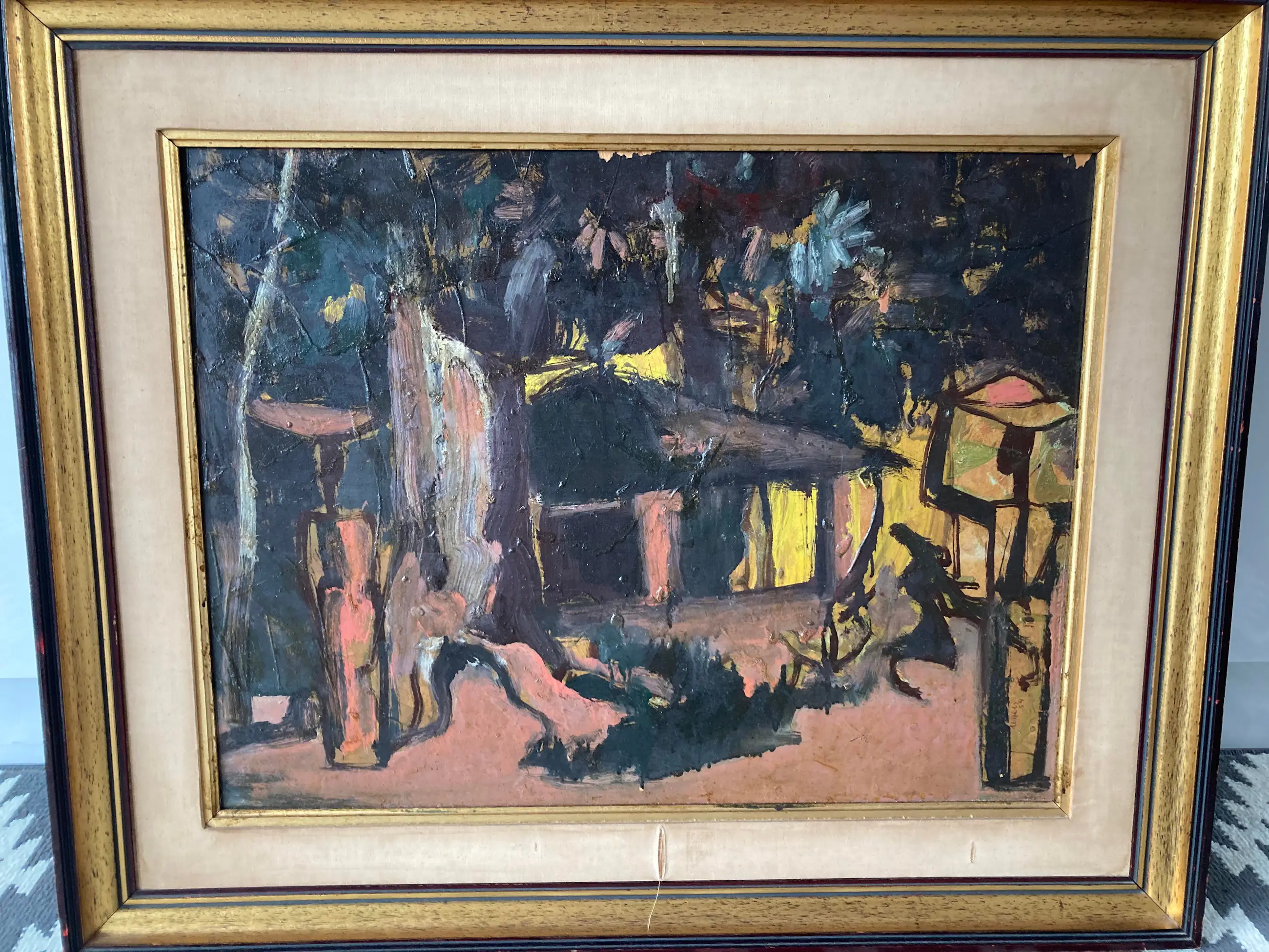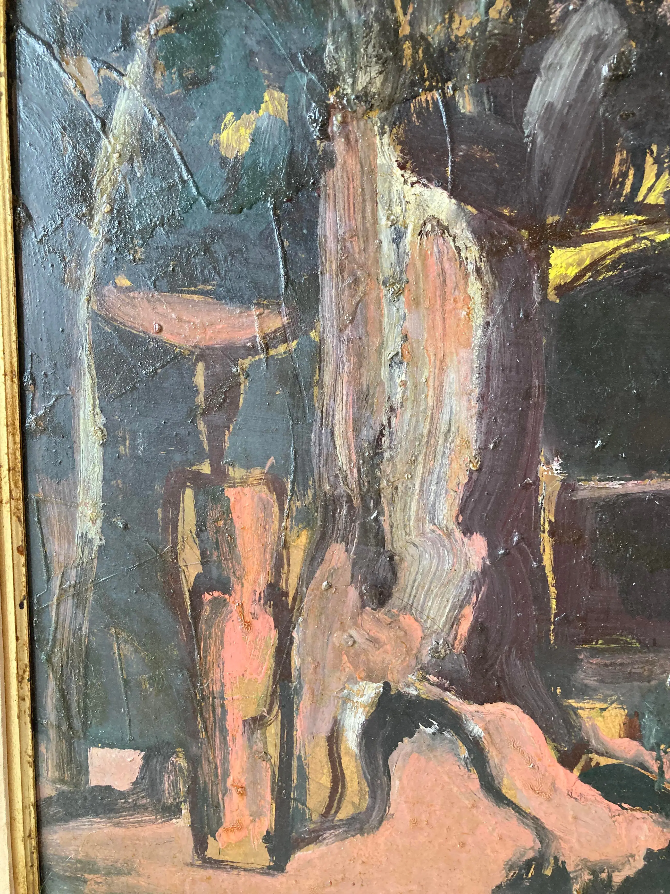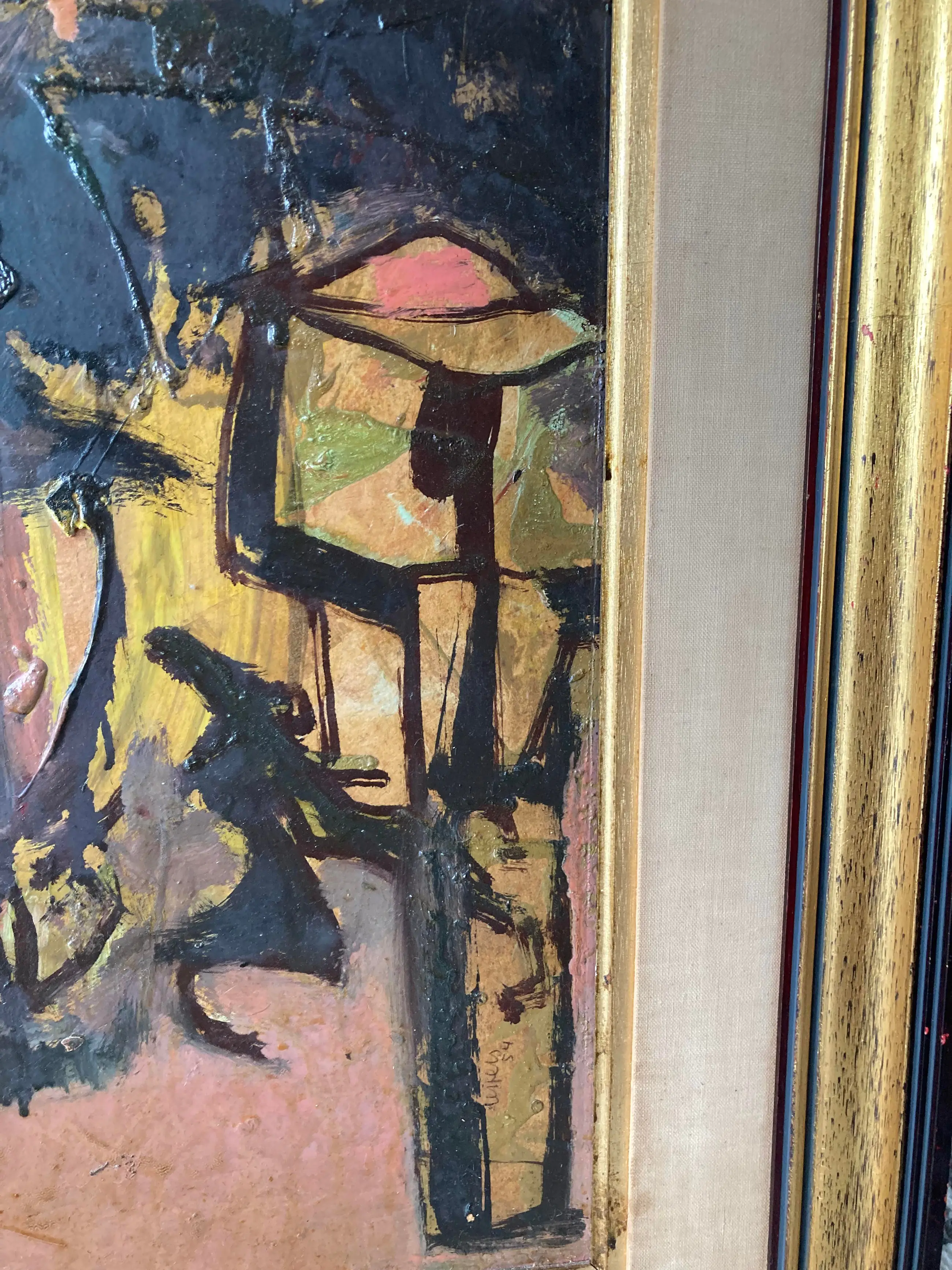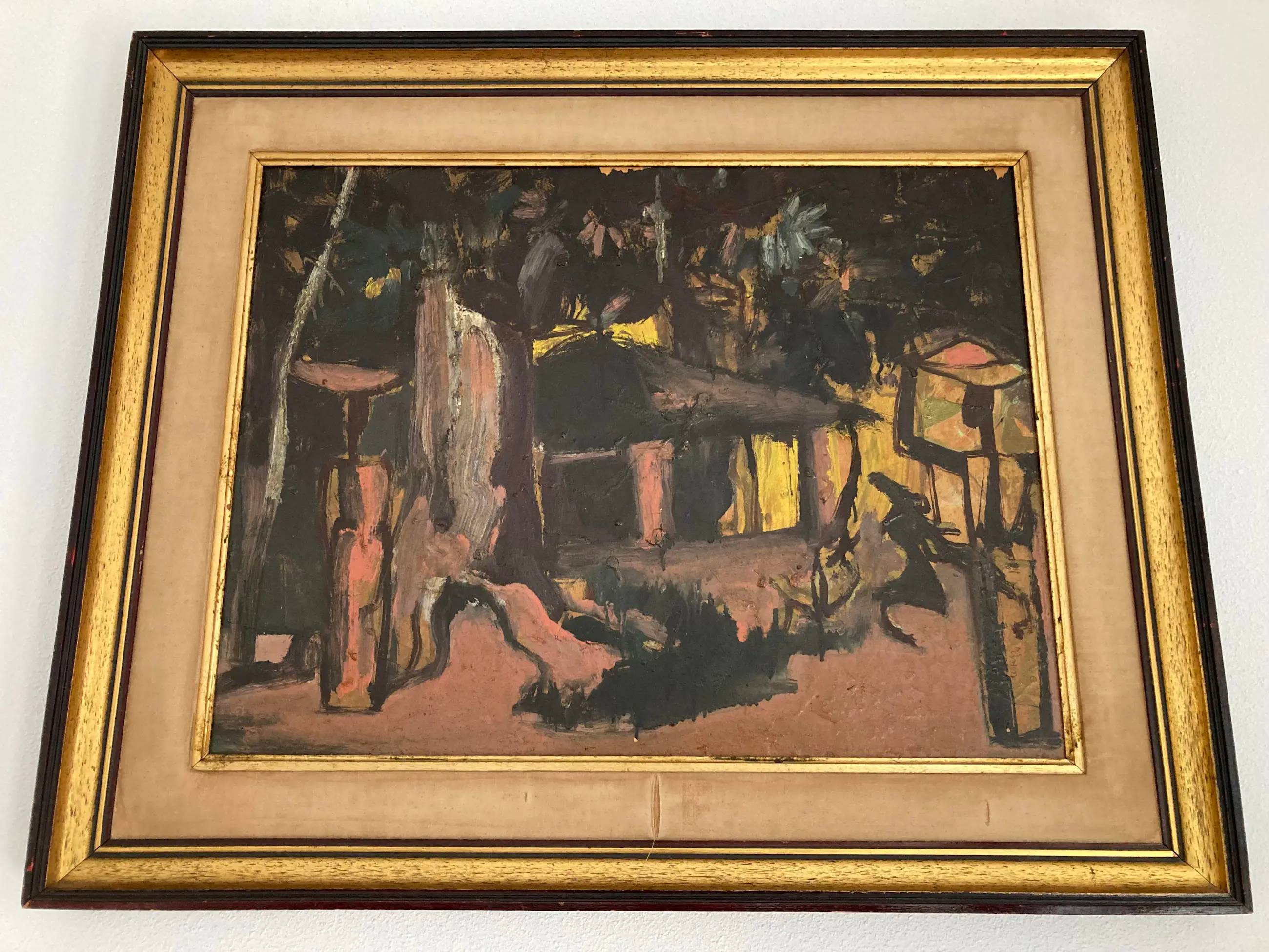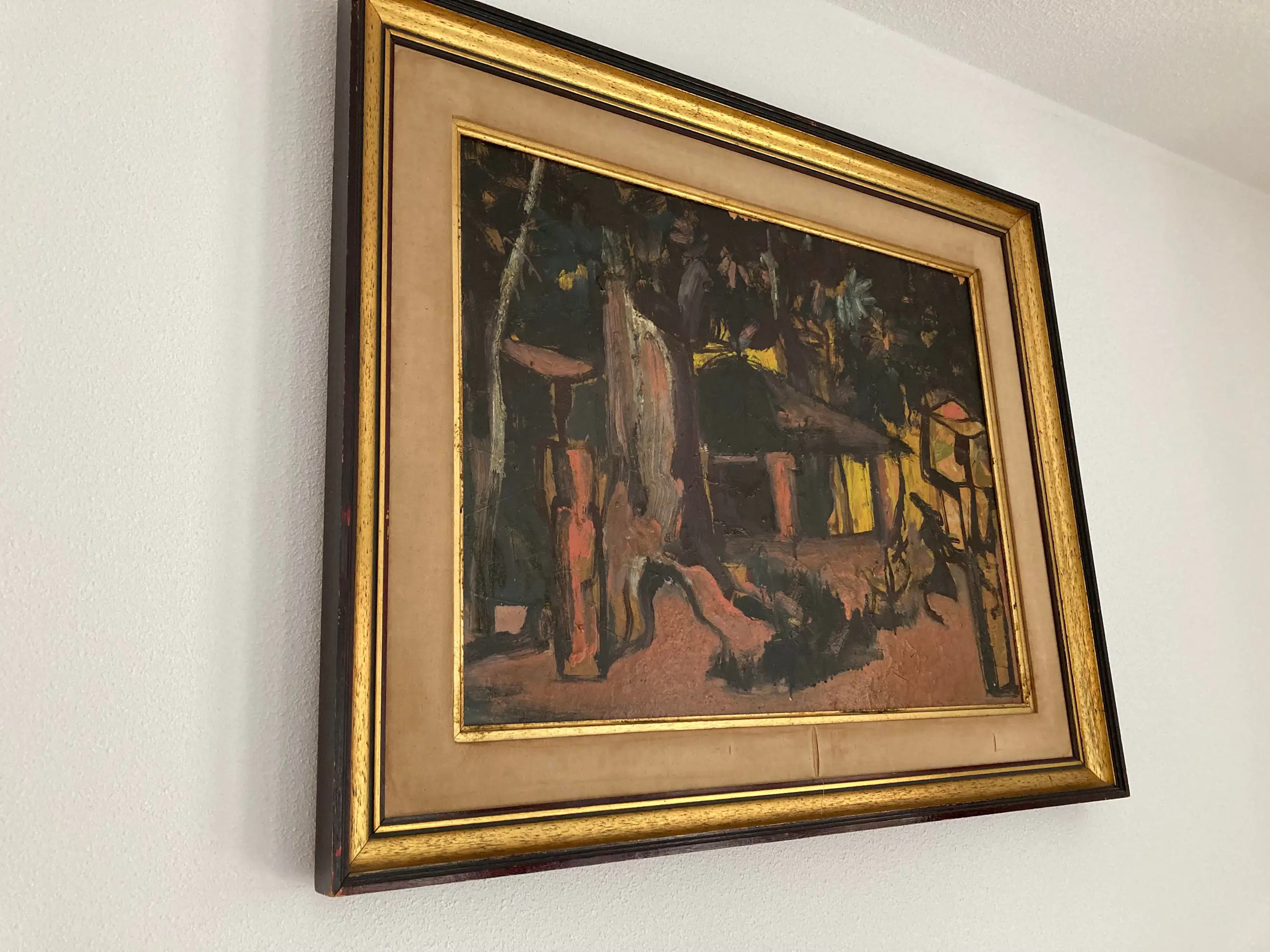 Modern groot werk van deze gewaardeerde Belgische schilder, vooral gewild voor zijn Afrikaanse dorpen en figuren. Gesigneerd. Olie op paneel. Congolees dorp. Ingelijst in volgens mij de origine lijst. (vintage met gebruikssporen aan de stof) Wat donker maar door een schoonmaakbeurt denk ik dat de kleuren zeker weer typisch en levendig worden. Kubisme. Expressionisme. Africanisme. Gedateerd 1954. Verfschade aan de bovenkant aan de rand van de lijst. Afkomst Vlaamse antiekhandel. Tafereel uit Belgisch Congo. Authenticiteit gegarandeerd. Goedkoop met het oog op een liefhebber of verzamelaar die het zal schoonmaken en eventueel opwaarderen met een moderne lijst.