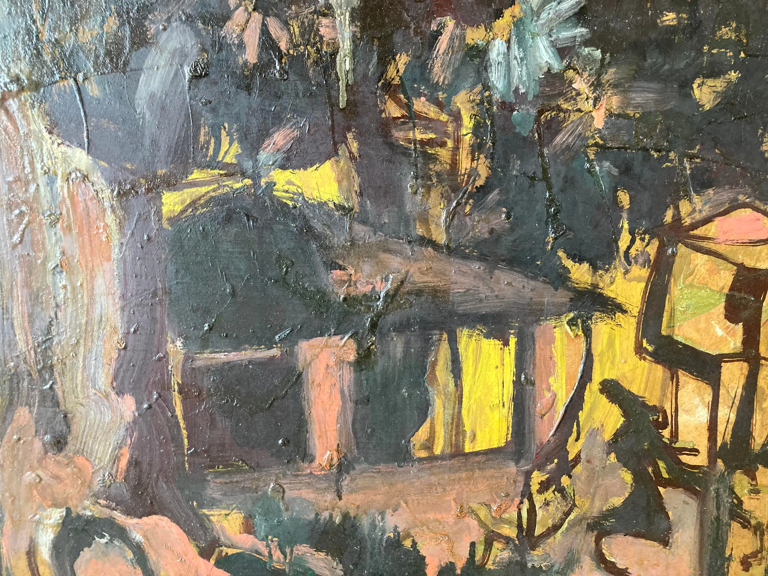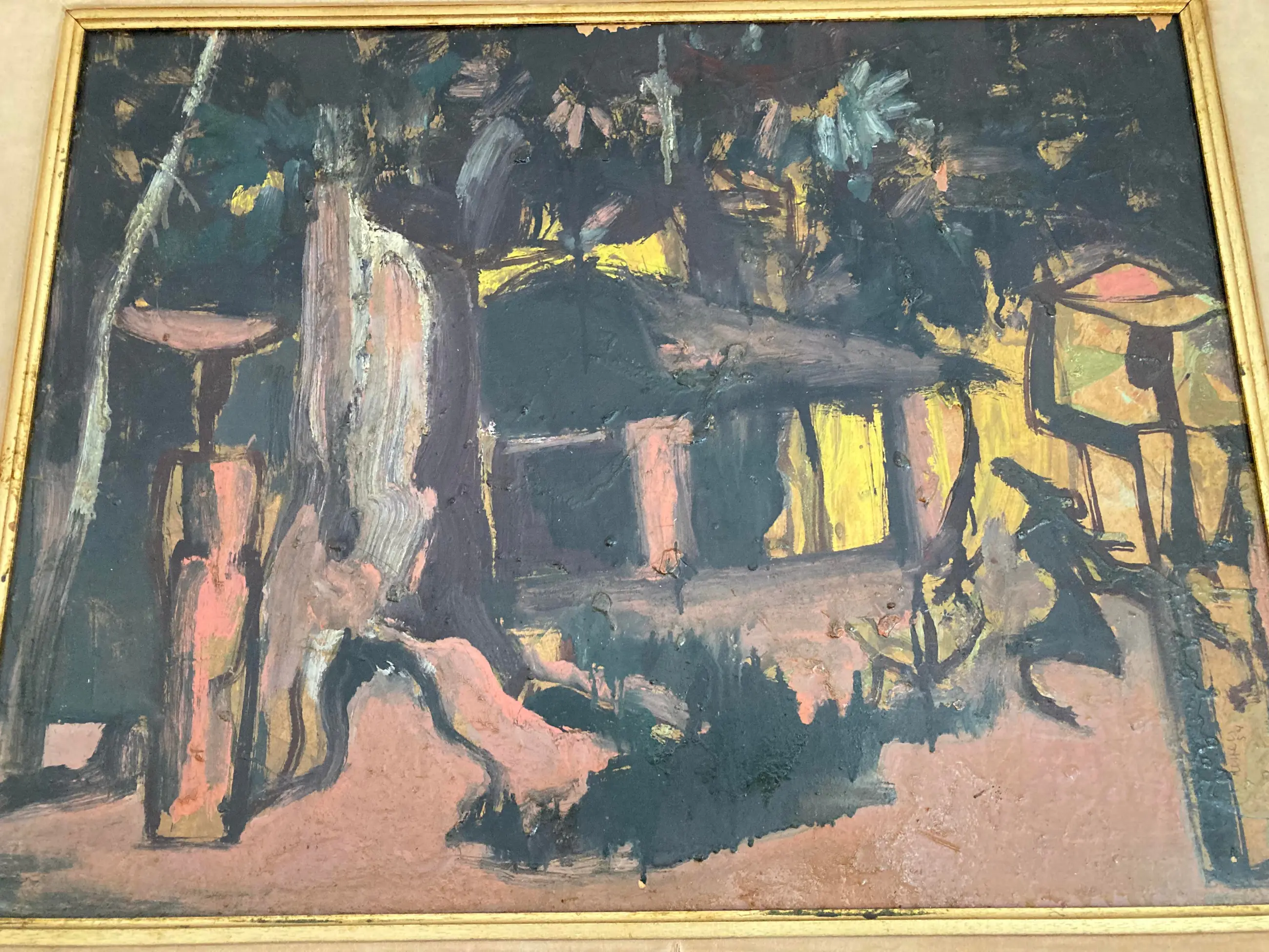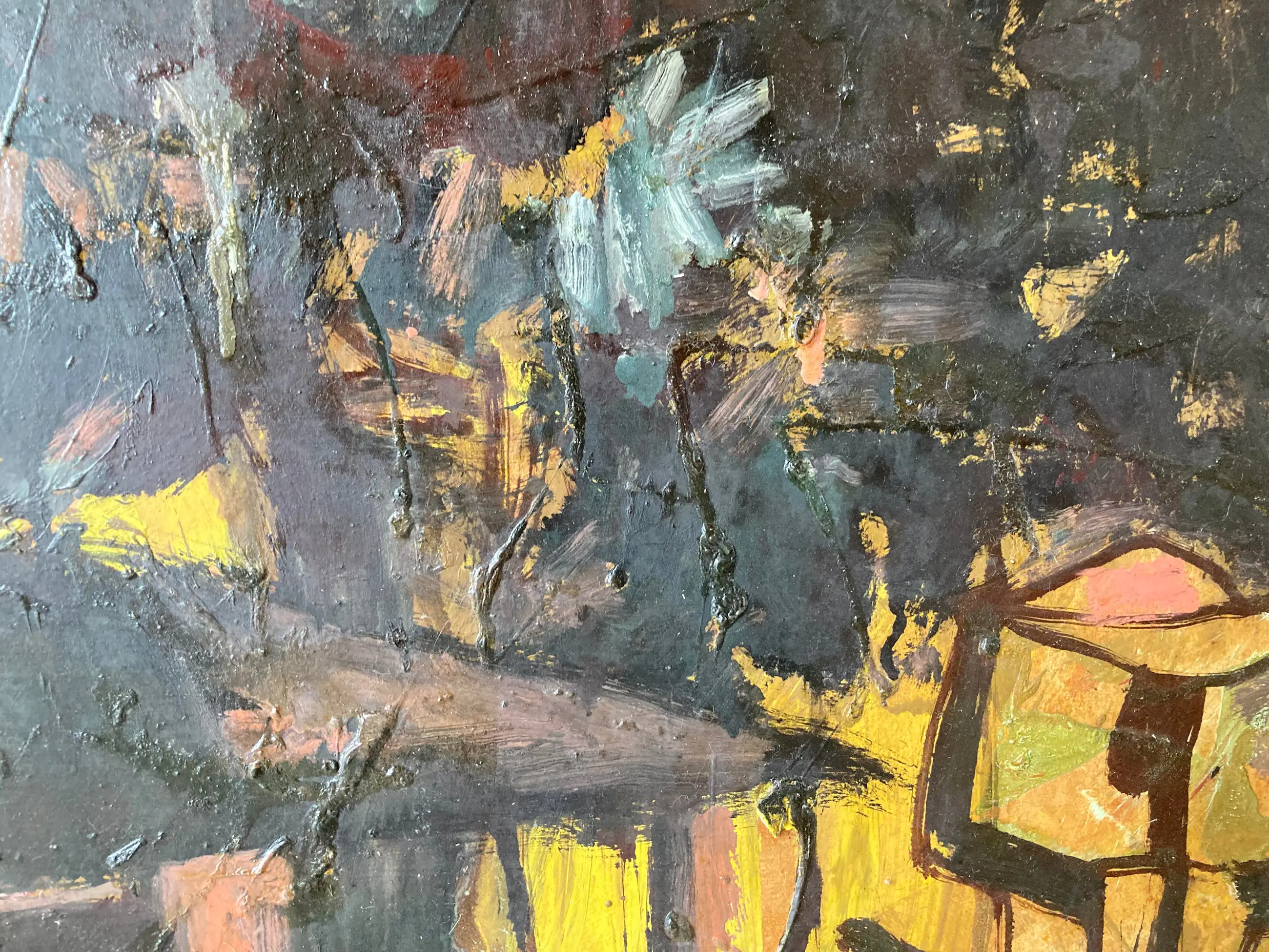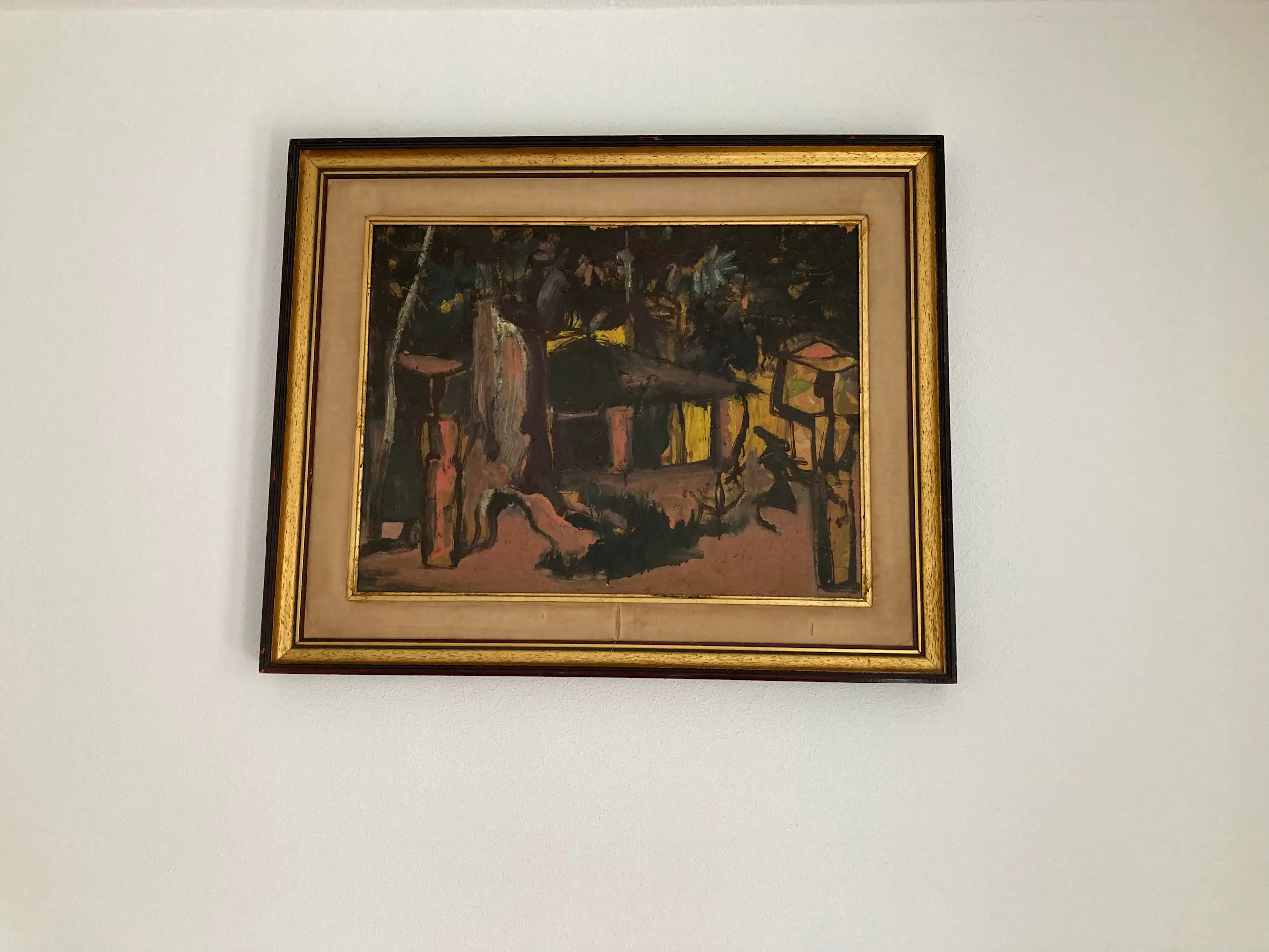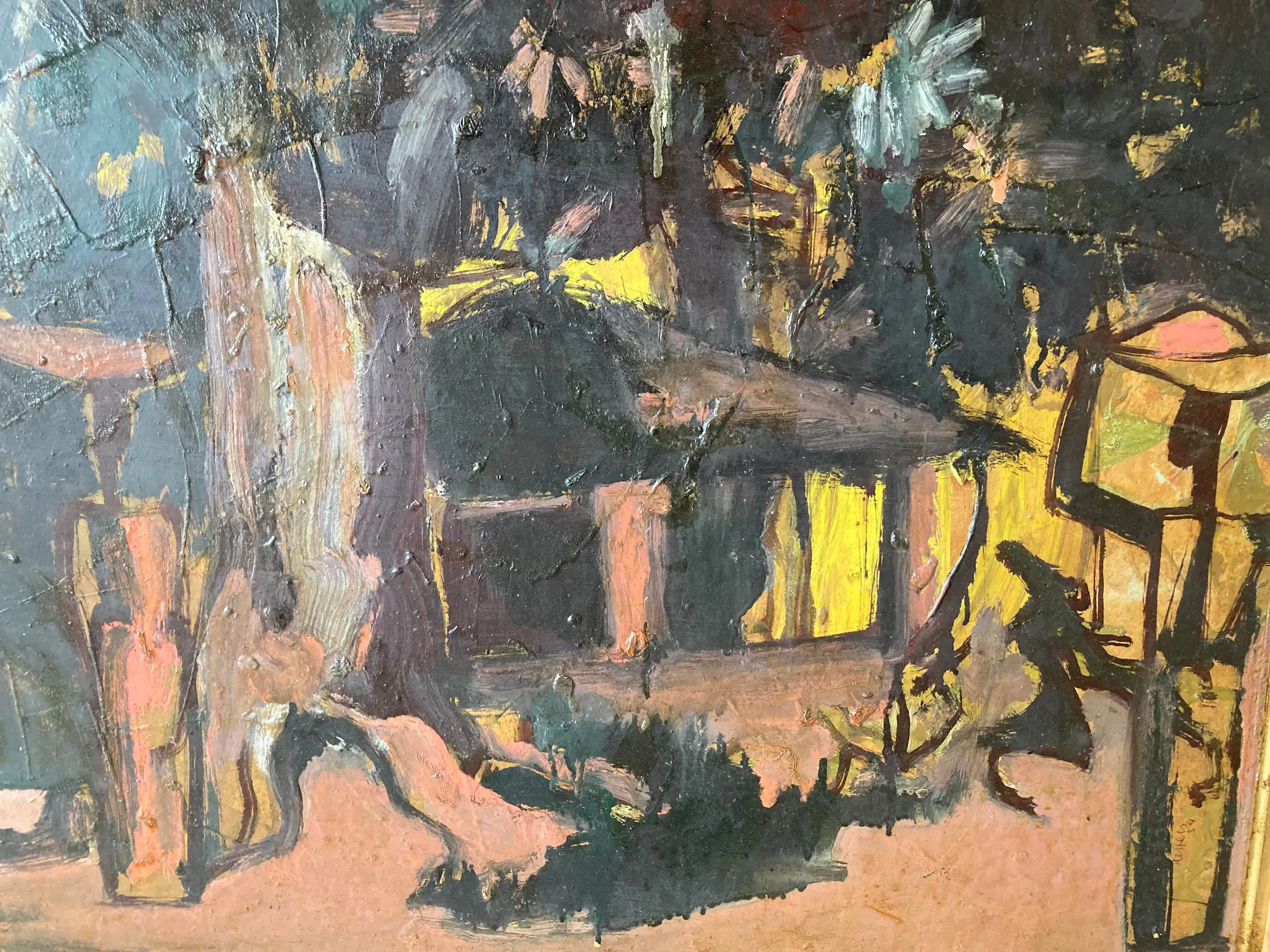 Modern groot werk van deze gewaardeerde Belgische schilder, vooral gewild voor zijn Afrikaanse dorpen en figuren. Gesigneerd. Olie op paneel. Congolees dorp. Ingelijst in volgens mij de origine lijst. (vintage met gebruikssporen aan de stof) Wat donker maar door een schoonmaakbeurt denk ik dat de kleuren zeker weer typisch en levendig worden. Kubisme. Expressionisme. Africanisme. Gedateerd 1954. Verfschade aan de bovenkant aan de rand van de lijst. Afkomst Vlaamse antiekhandel. Tafereel uit Belgisch Congo. Authenticiteit gegarandeerd. Goedkoop met het oog op een liefhebber of verzamelaar die het zal schoonmaken en eventueel opwaarderen met een moderne lijst.