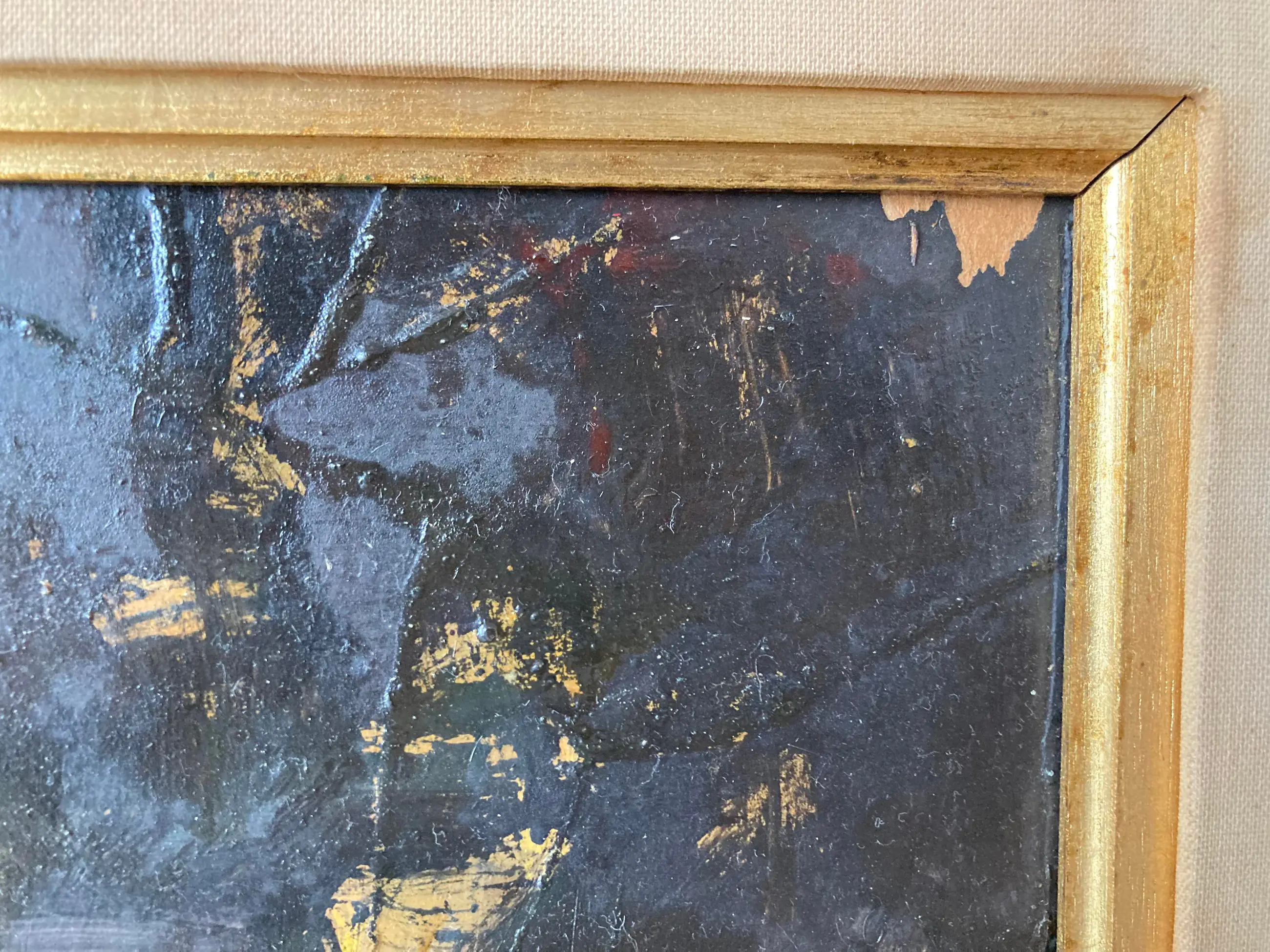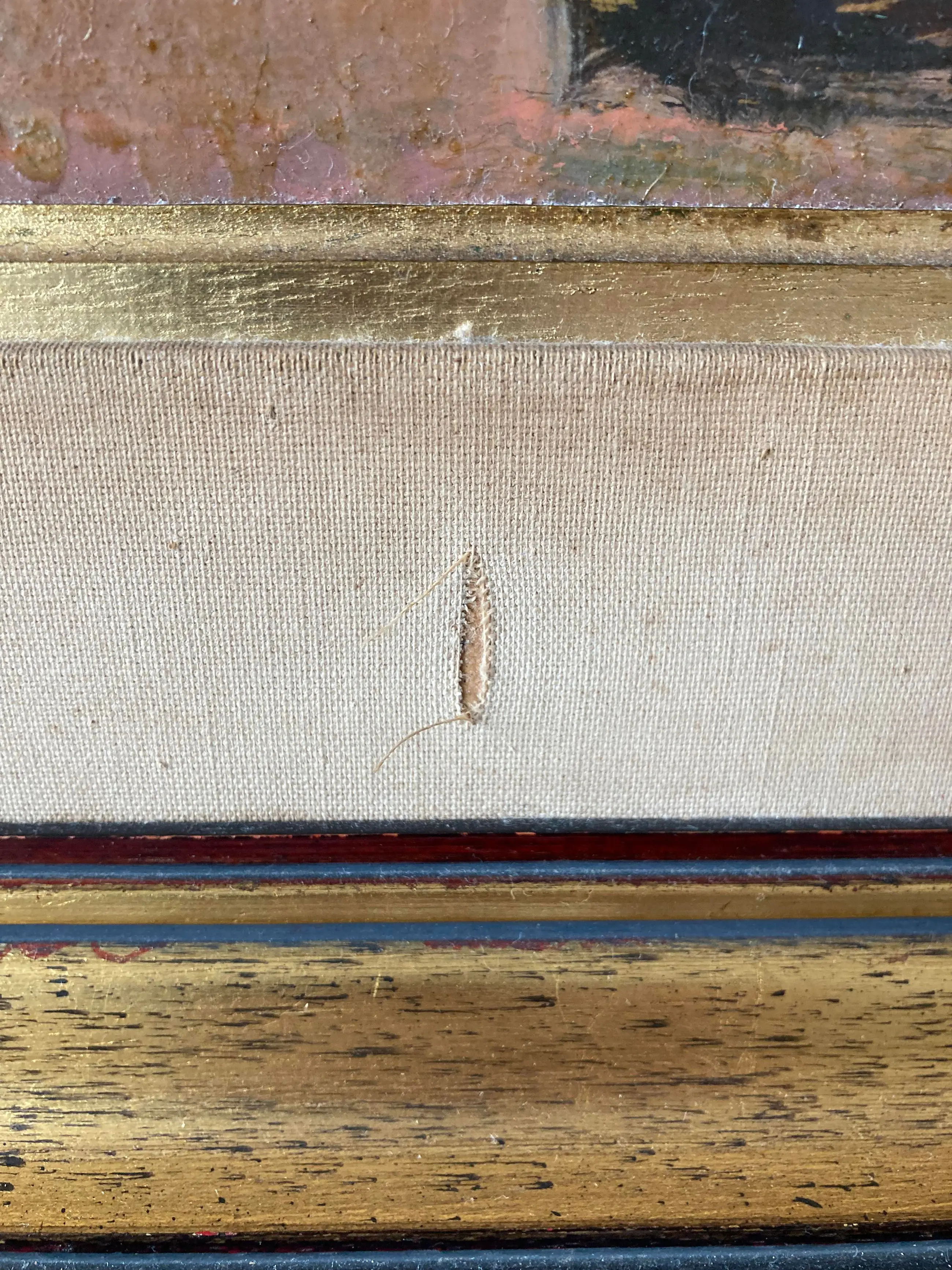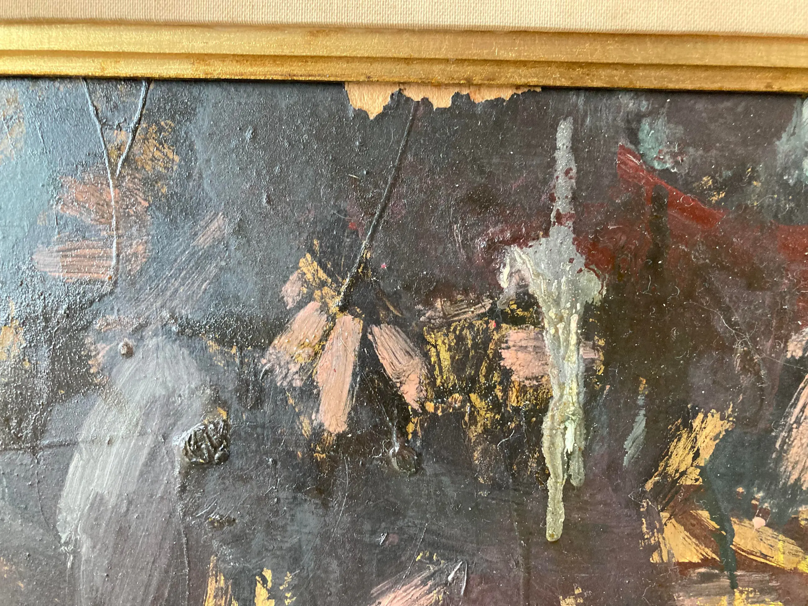 Verfschade bovenaan aan de rand en de lijst is ook met twee scheuren in de stof beschadigd. Werk kan een goede schoonmaakbeurt gebruiken om het op te laten lichten.