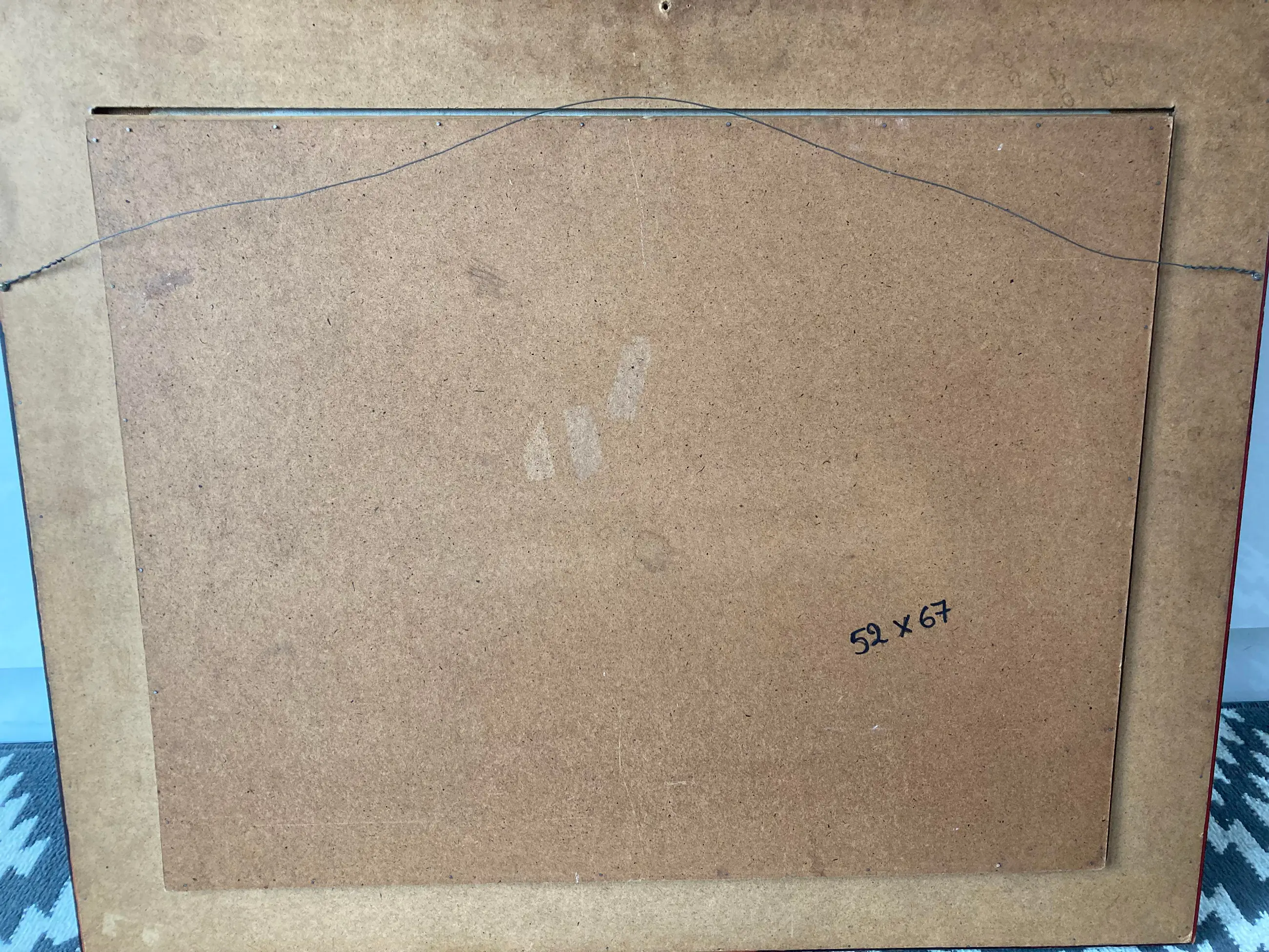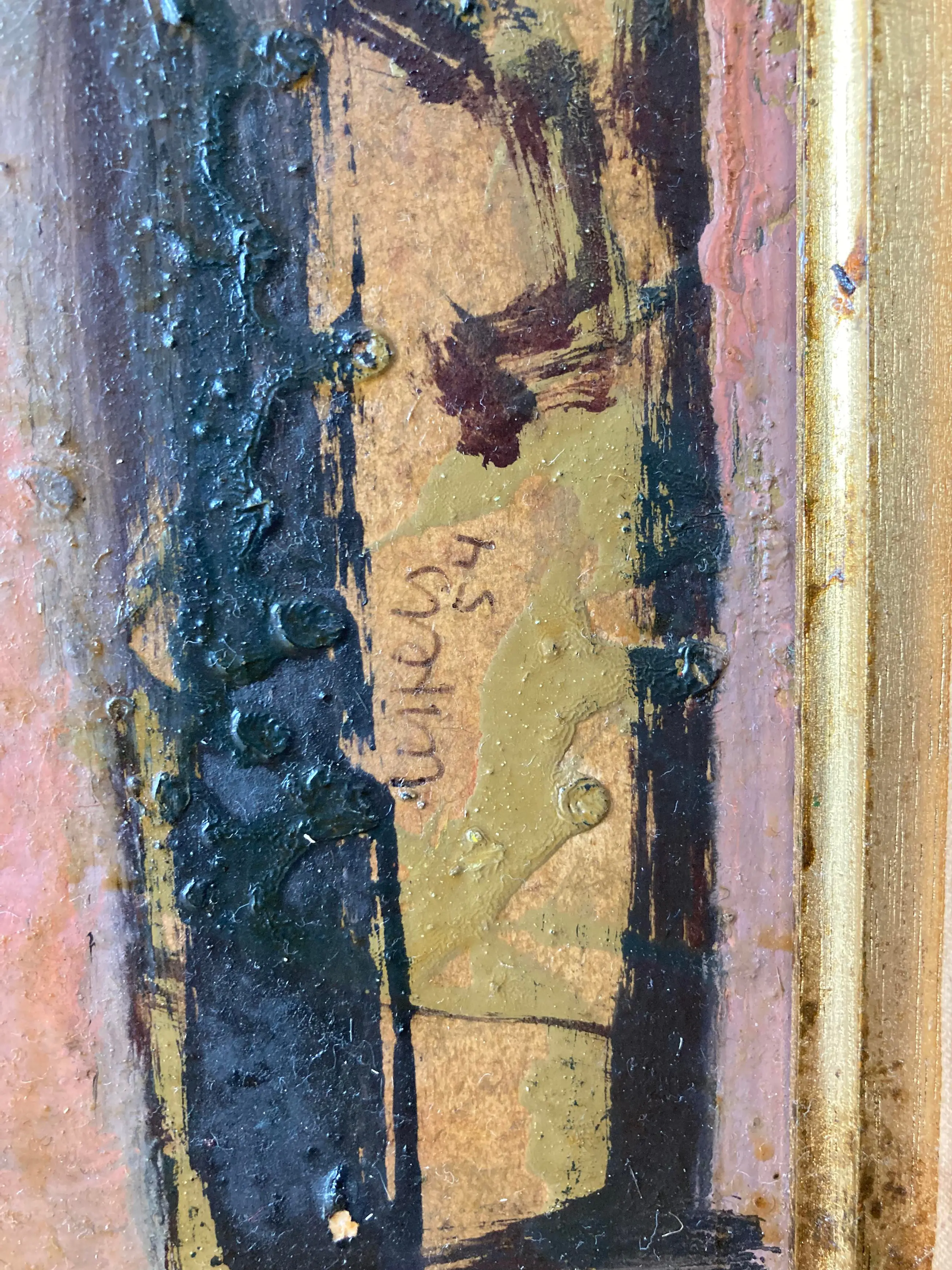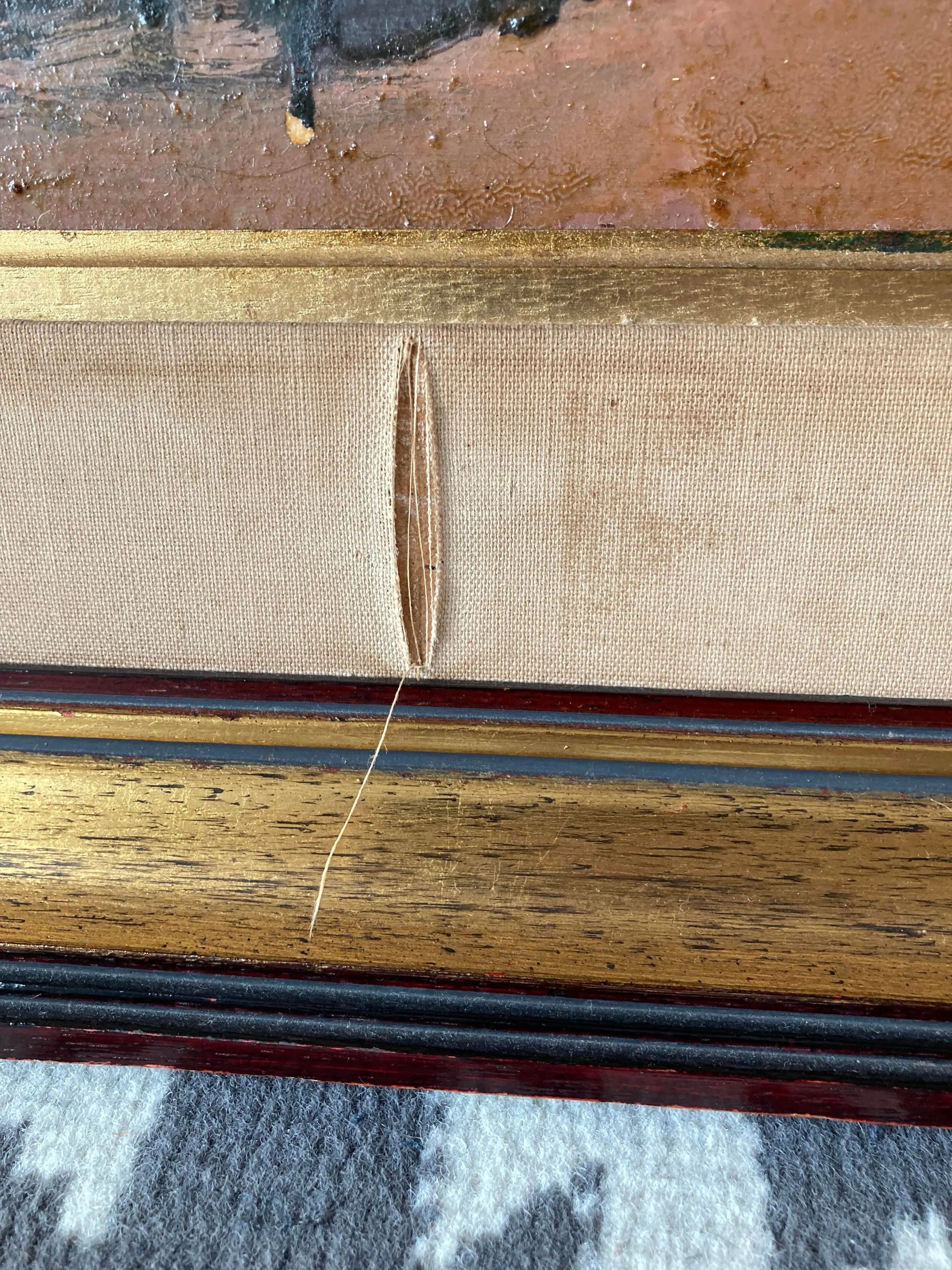 Verfschade bovenaan aan de rand en de lijst is ook met twee scheuren in de stof beschadigd. Werk kan een goede schoonmaakbeurt gebruiken om het op te laten lichten.