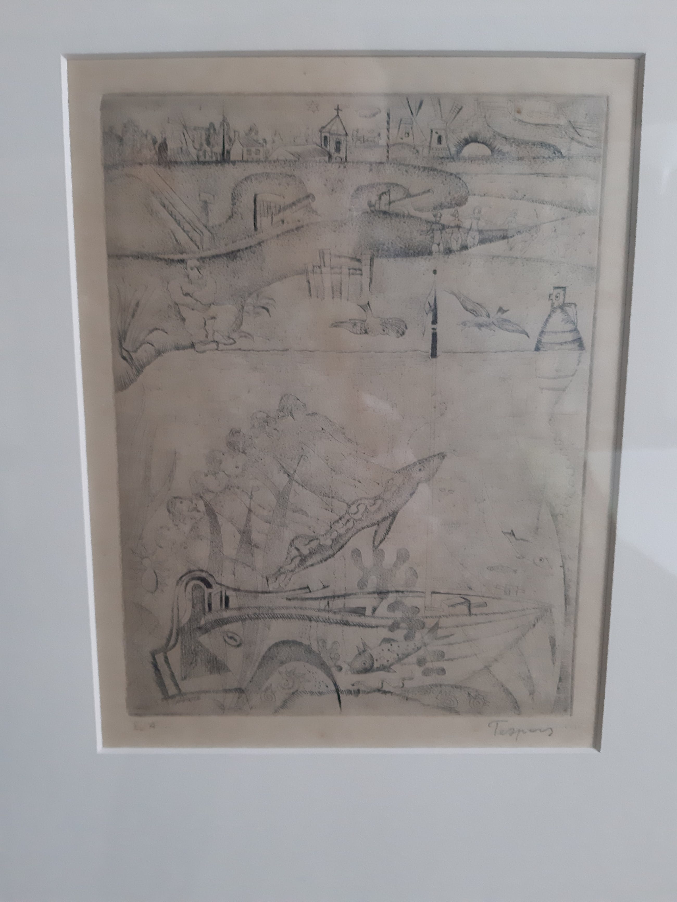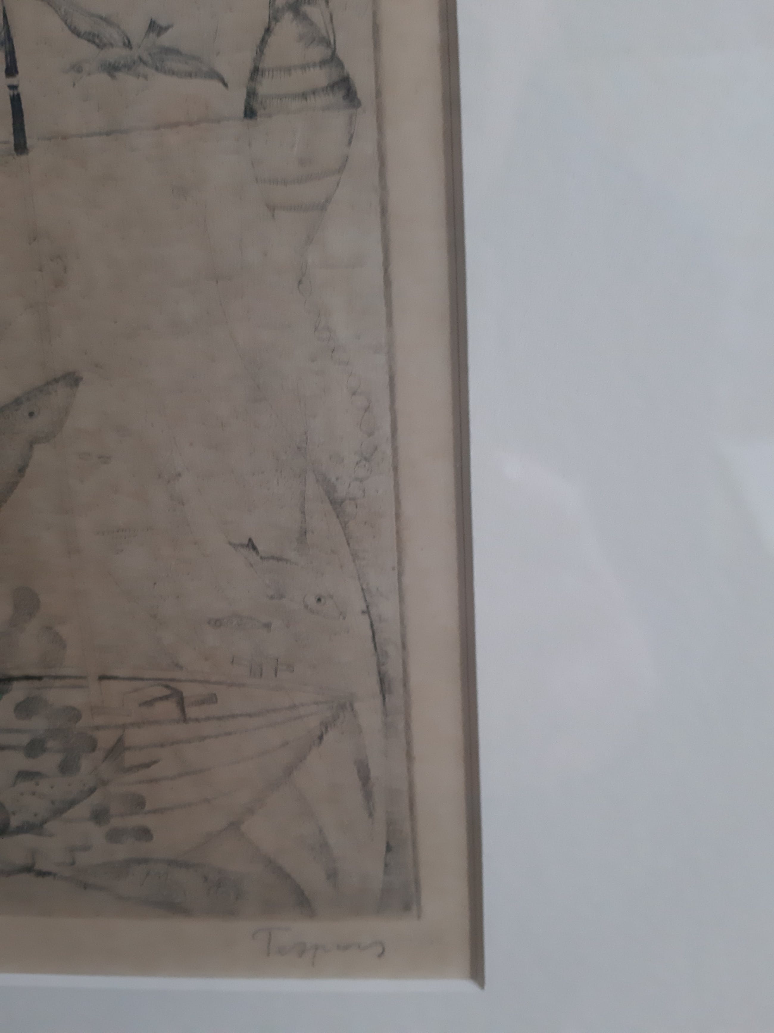 De aangeboden ets van Floris JESPERS uit 1935 heeft als titel "de 14 klompen" (les quatorze sabots) en is een epreuve artist (EA). Het is een tafereel met zeven meisjes en een serie interessante details om en rond de rivier. Het werk is in de plaat getekend én met de hand getekend op het papier (uitzonderlijk). In het echt is het werk mooier dan op deze foto's, o.a. door de weerspiegeling en de fijne details die de foto niet kan weergeven. Een waardevol en moeilijk te vinden ets van deze meester van het Vlaams expressionisme!