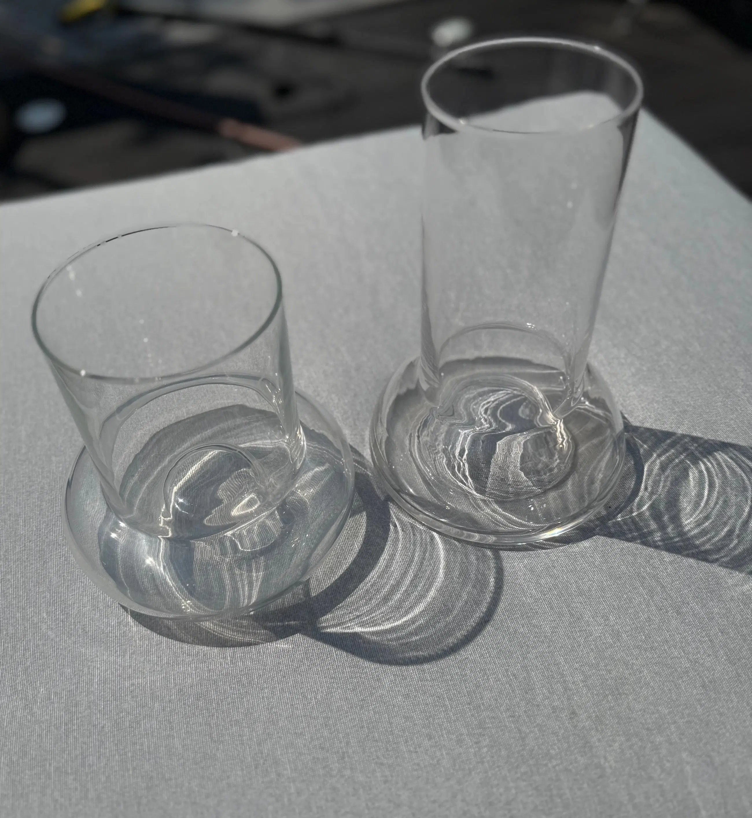 2 Apollo vazen, in twee verschillende formaten. Uitgevoegd bij Royal Leerdam. Ontwerp uit 1972. Formaat is van de grootste vaas. De kleinere is H 15 x 14 x 14 Doorsnede is de onderkant gemeten.