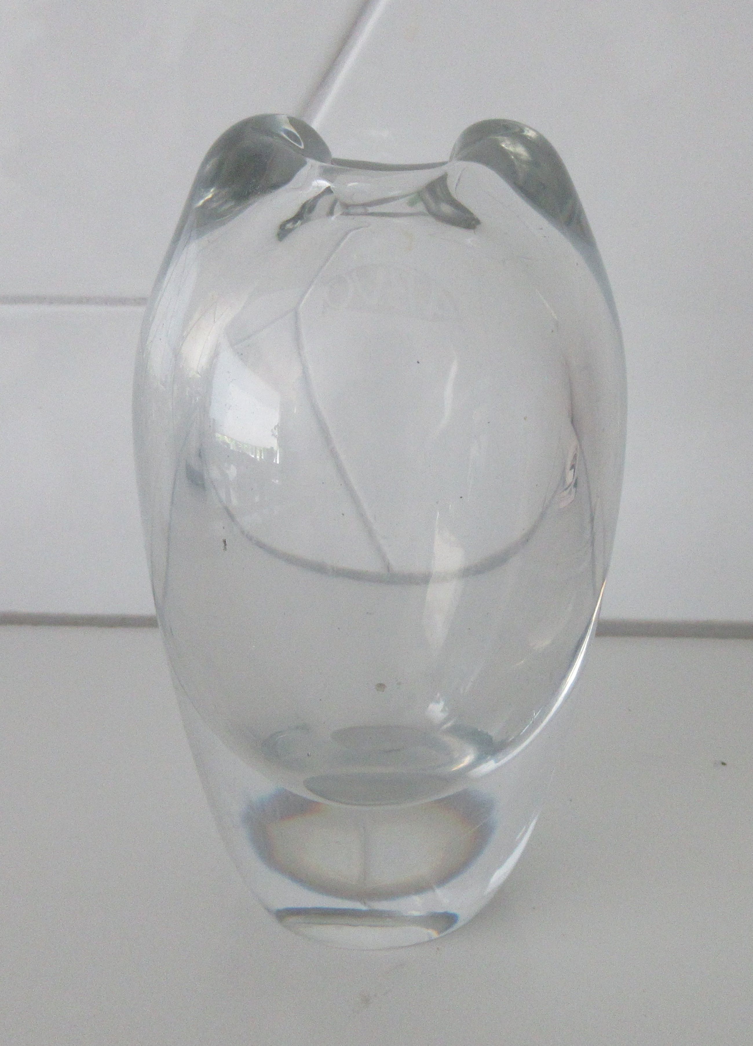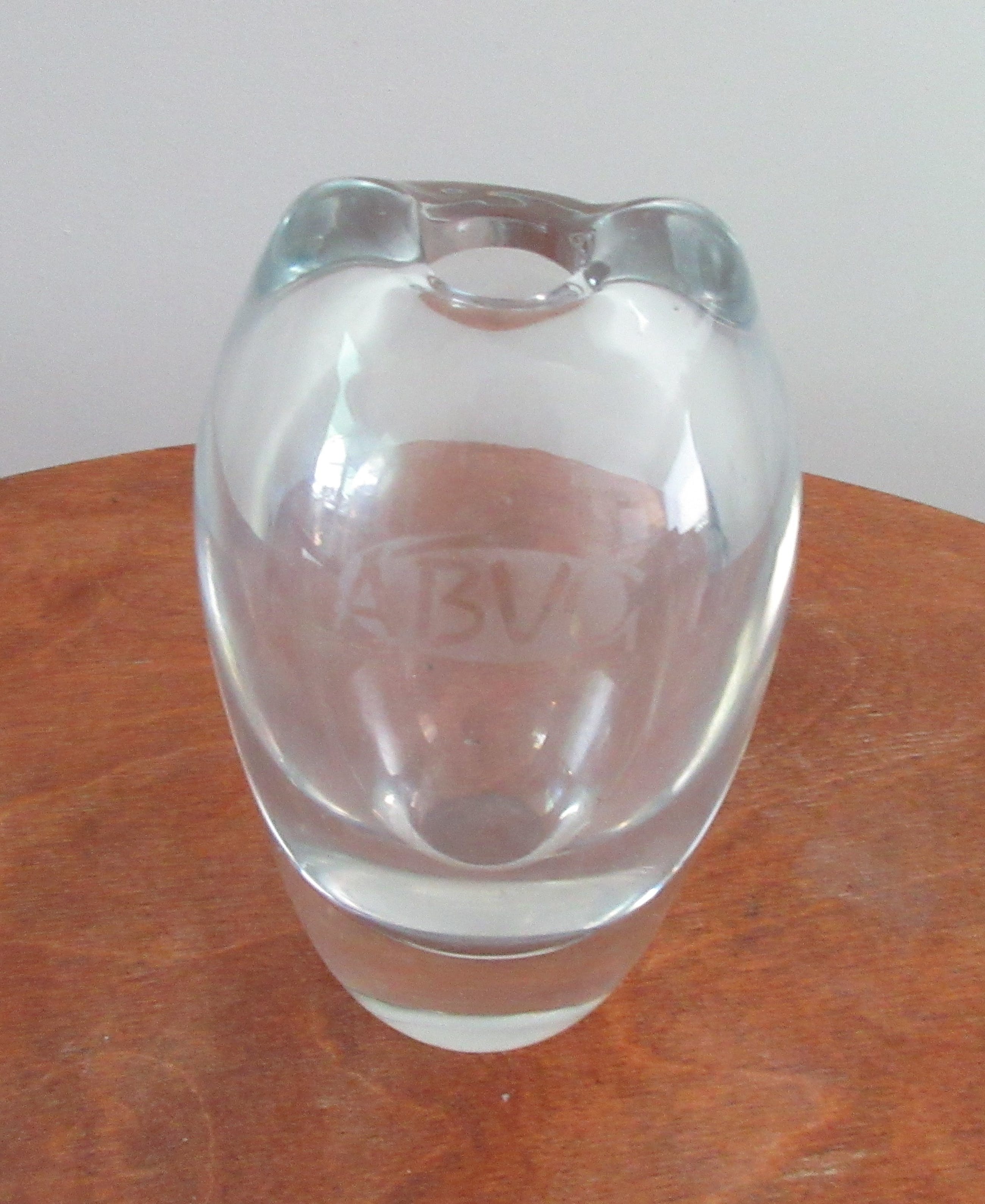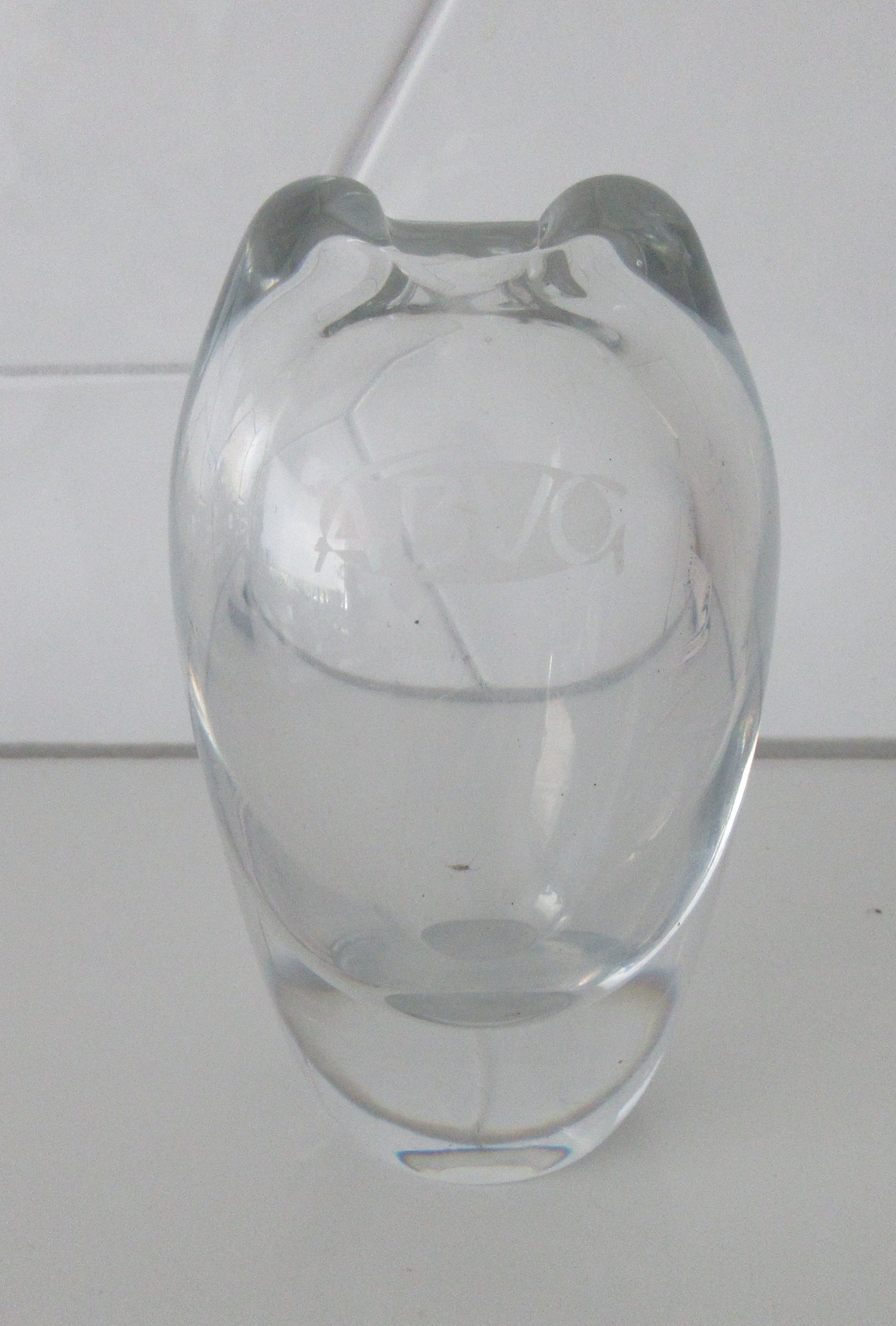 Blank glazen dikwandig vaasje ontwerp Floris Meydam, uitvoering Royal Leerdam. Deze is in opdracht gemaakt voor het bedrijf ABVO. in goede gebruikte conditie, de vaas heeft wel een zweem van aanslag. Niet gemerkt.