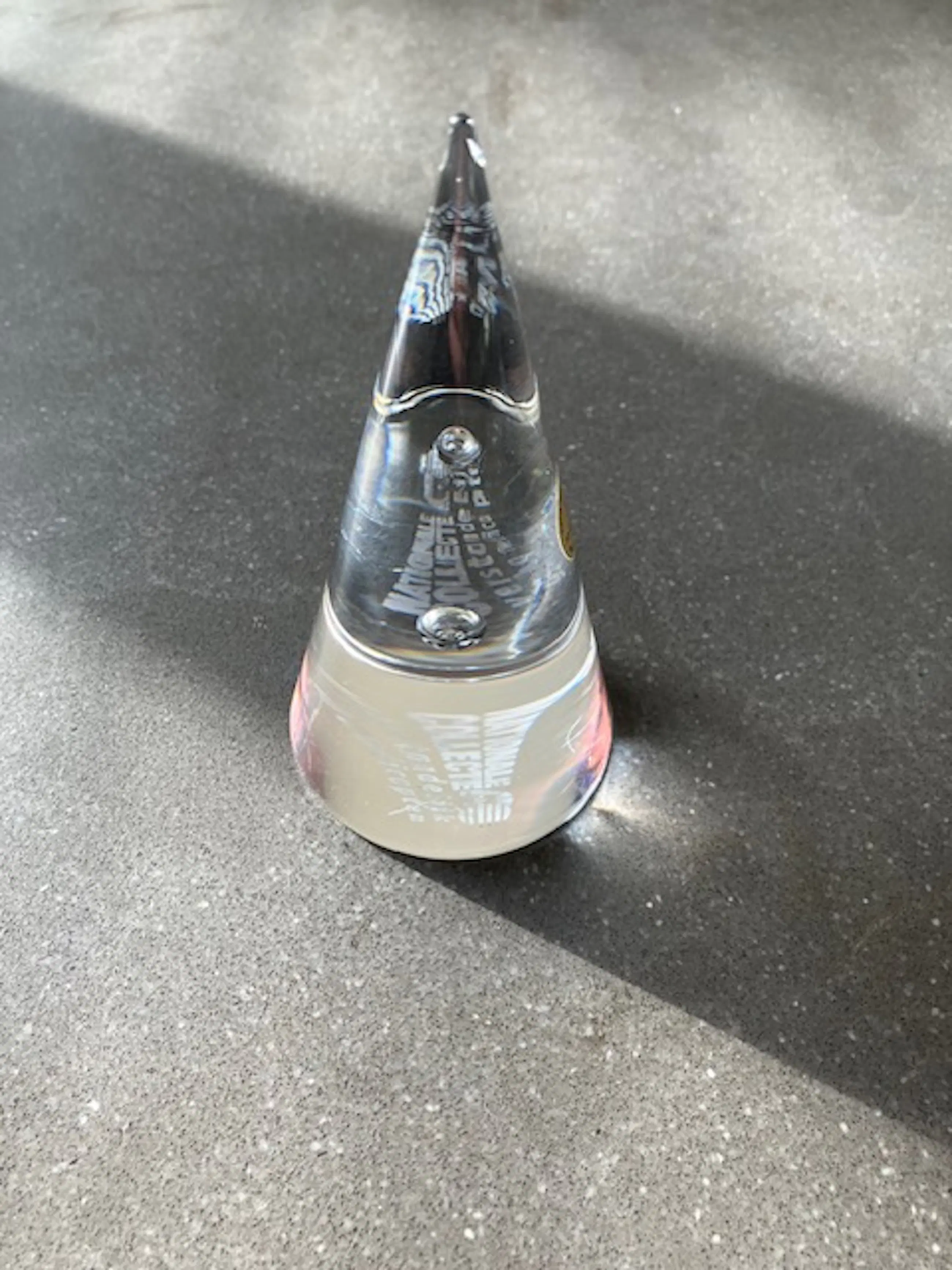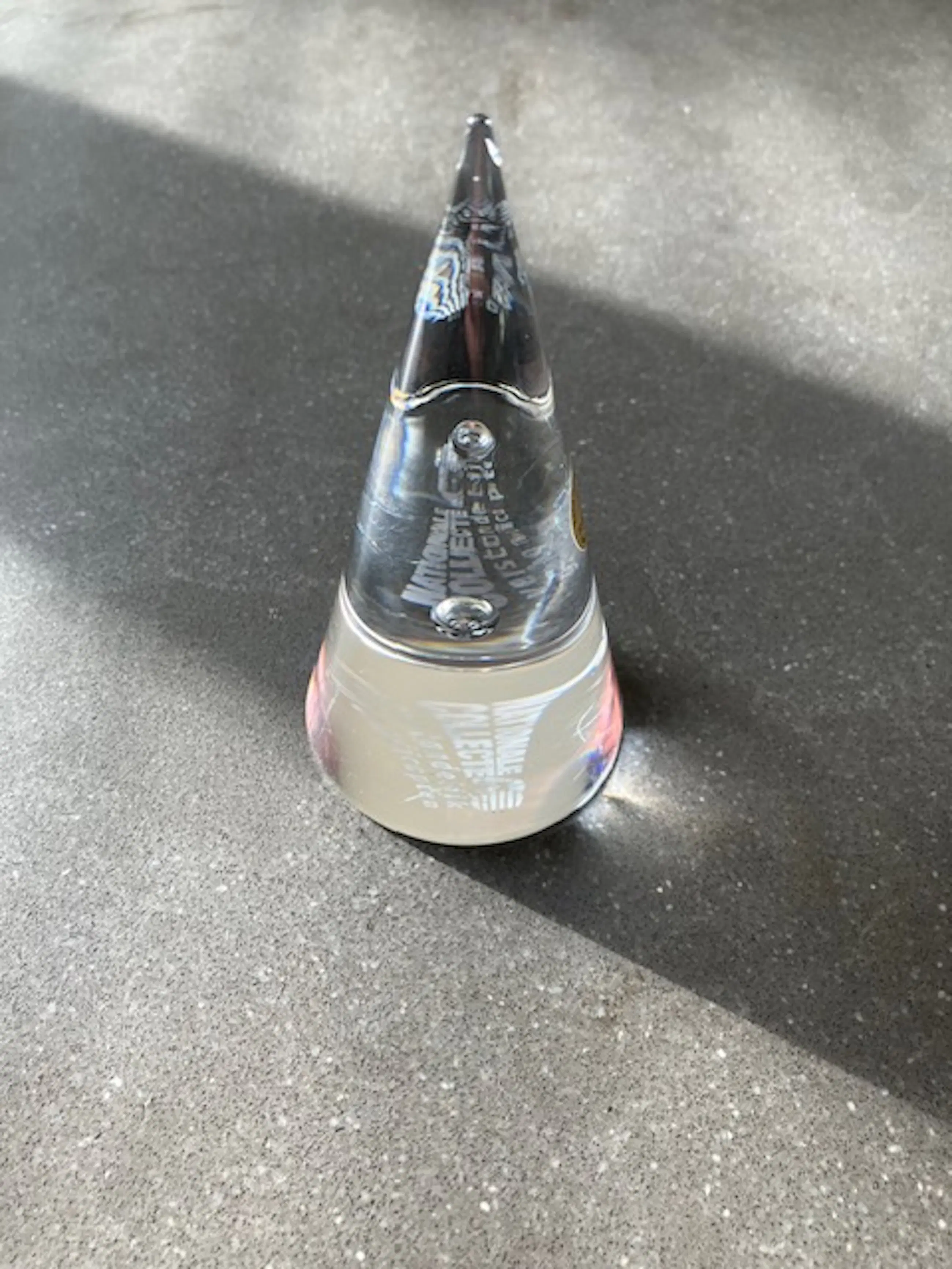 Het is een strakke-kegelvorminge presse-papier van zuiver kristal. De kegel is een van Meydams meest iconische geometrische vormen en symboliseert focus en helderheid. In het hart van de kegel bevind zich 1 enkele perfecte luchtbel: een technisch hoogstandje van glasblazers en dit vereist -zeker in een kegel- uiterste precisie van vakmanschap. Het is daarmee een hoogstandje van glasblaaskunst en exemplarisch voor de glaskunstenaar Meydam.