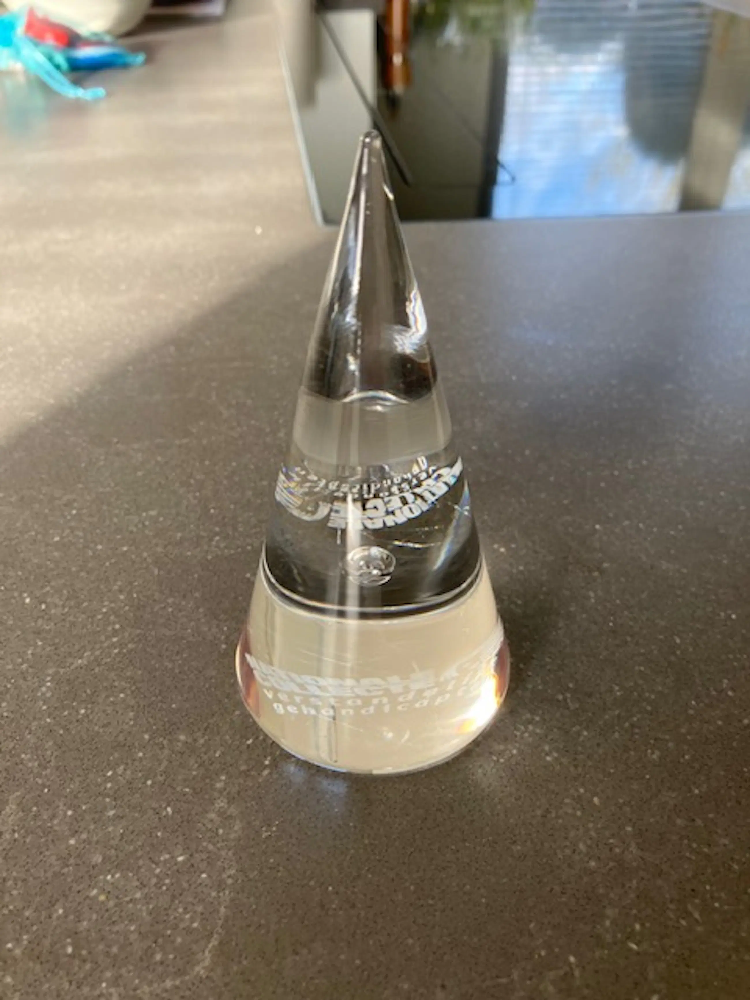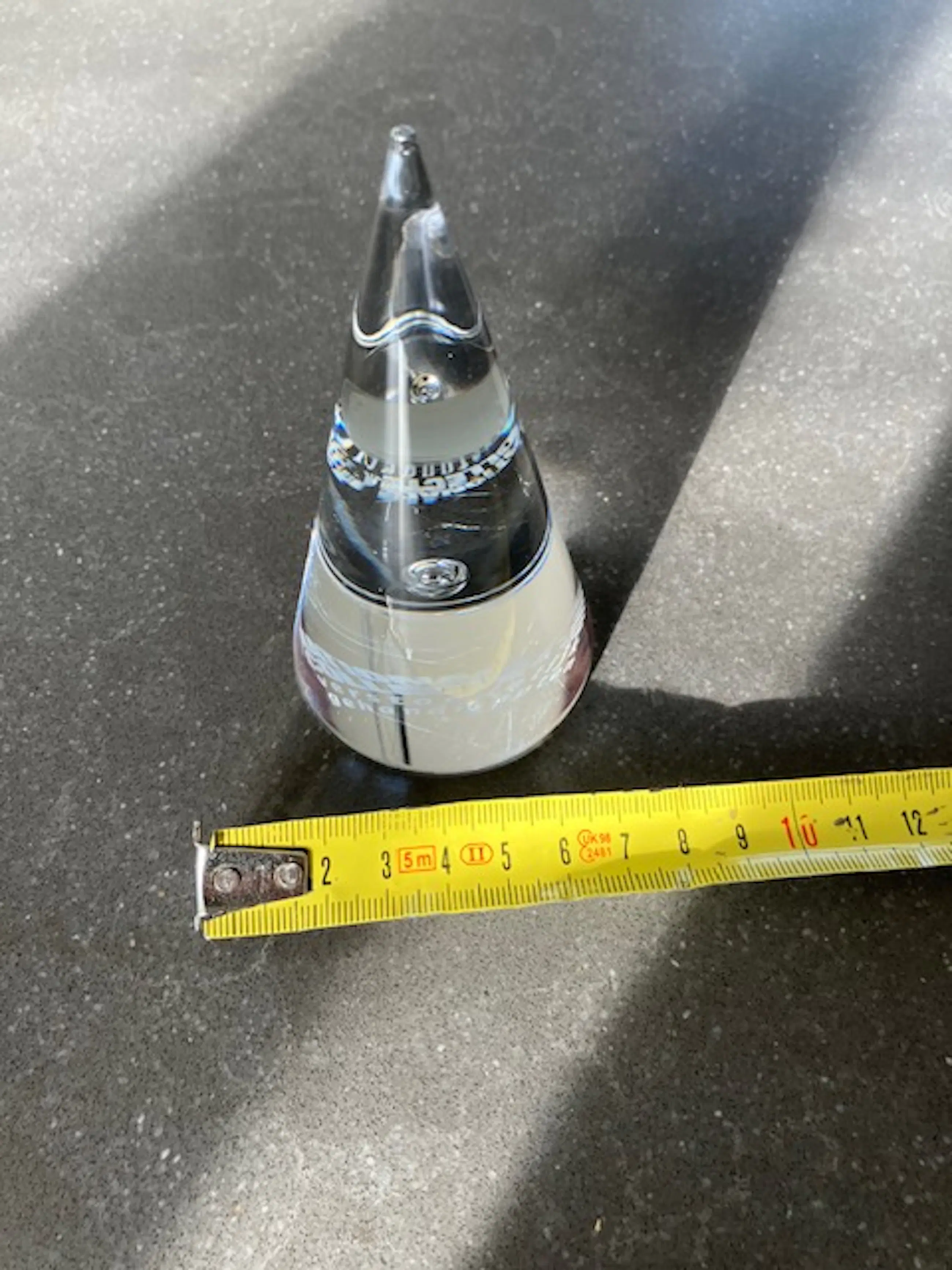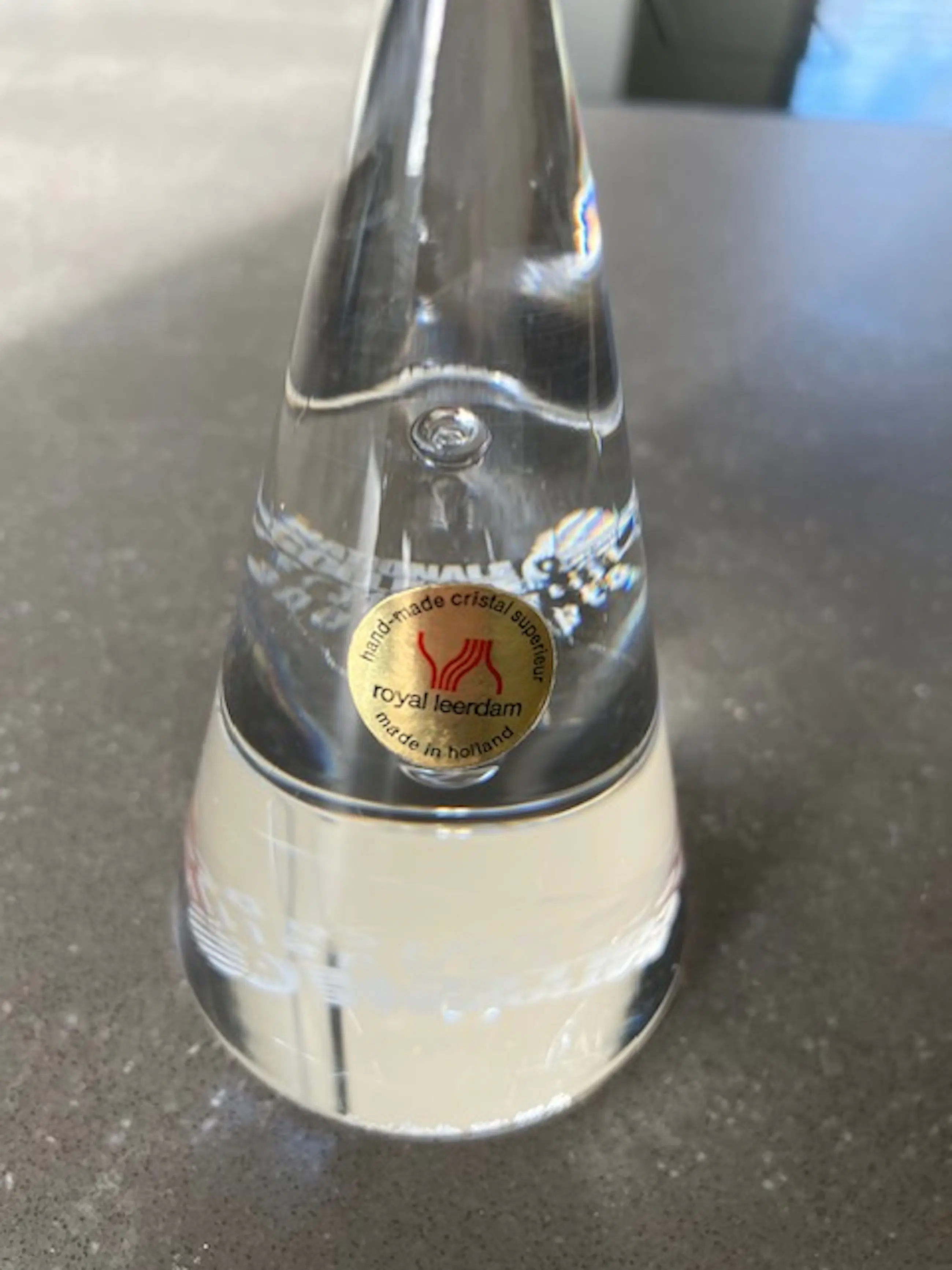 Het glas heeft een hoge brekingsindex waardoor het licht in de punt prachtig gevangen wordt.