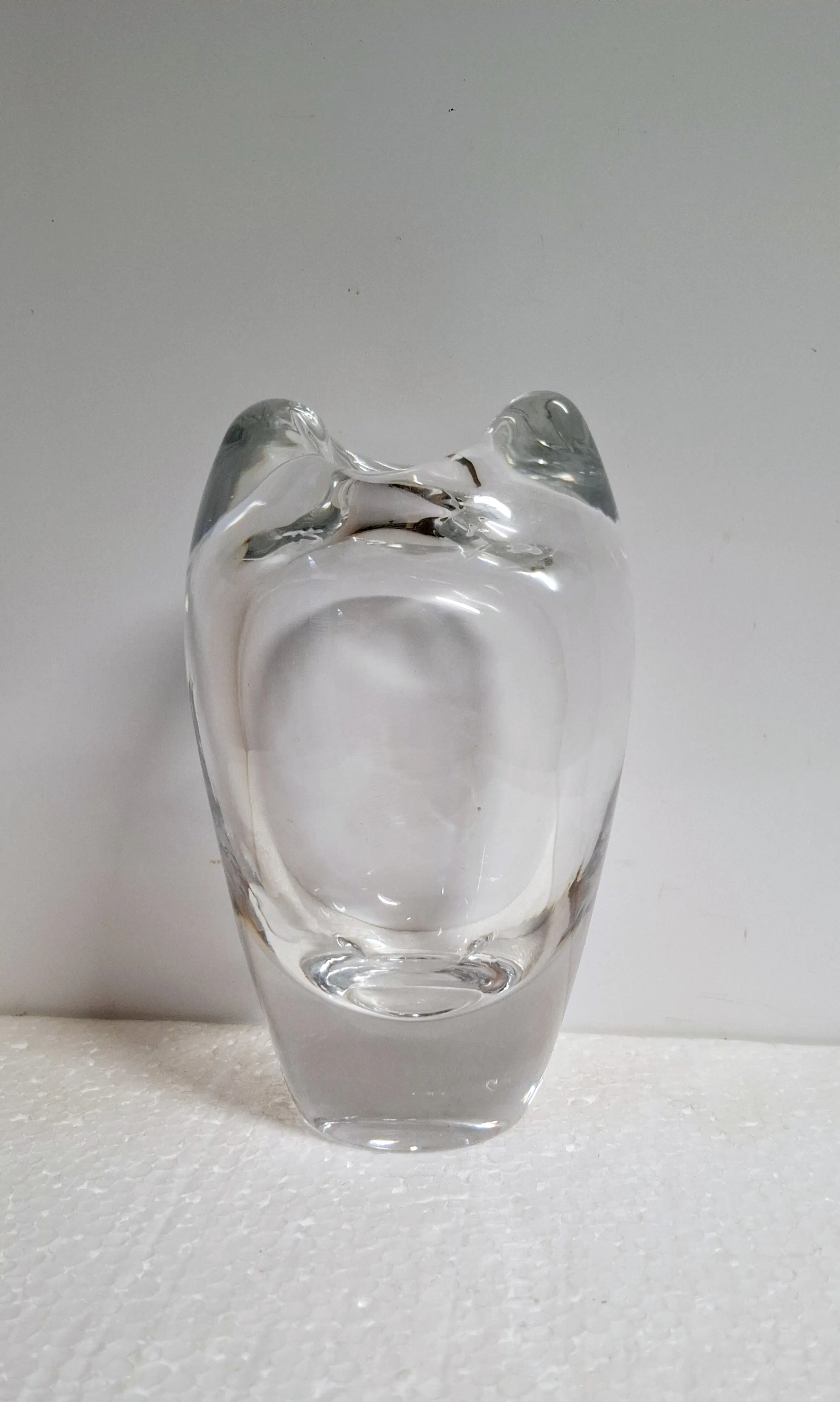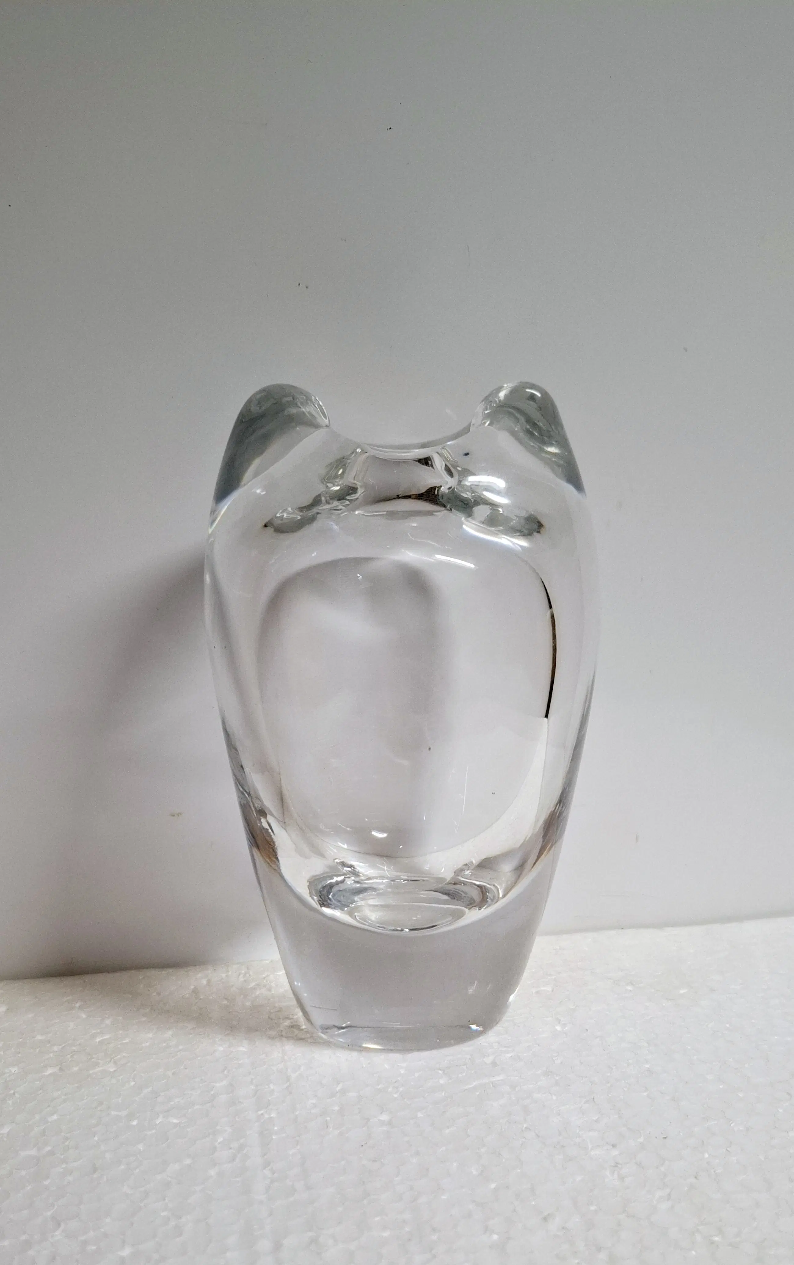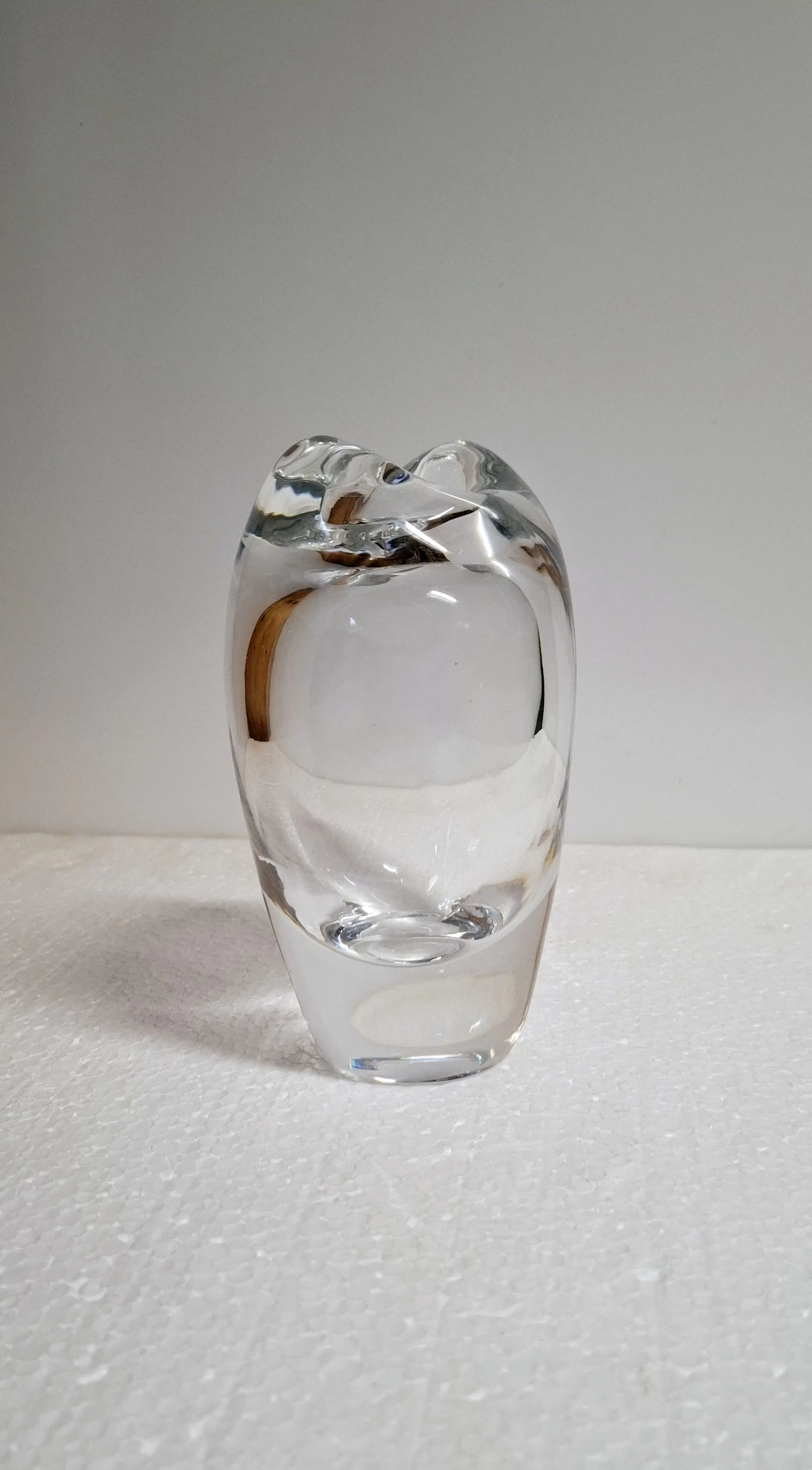 Design vaasje van Floris Meydam voor Leerdam Glasfabriek, i.o.v. toenmalige vakbond Algemene Bond Mercurius, ca. 1970. Hoogte 16 cm, max. doorsnede 8,5 cm, gewicht 900 gram . Verkeerd in een uitstekende staat .