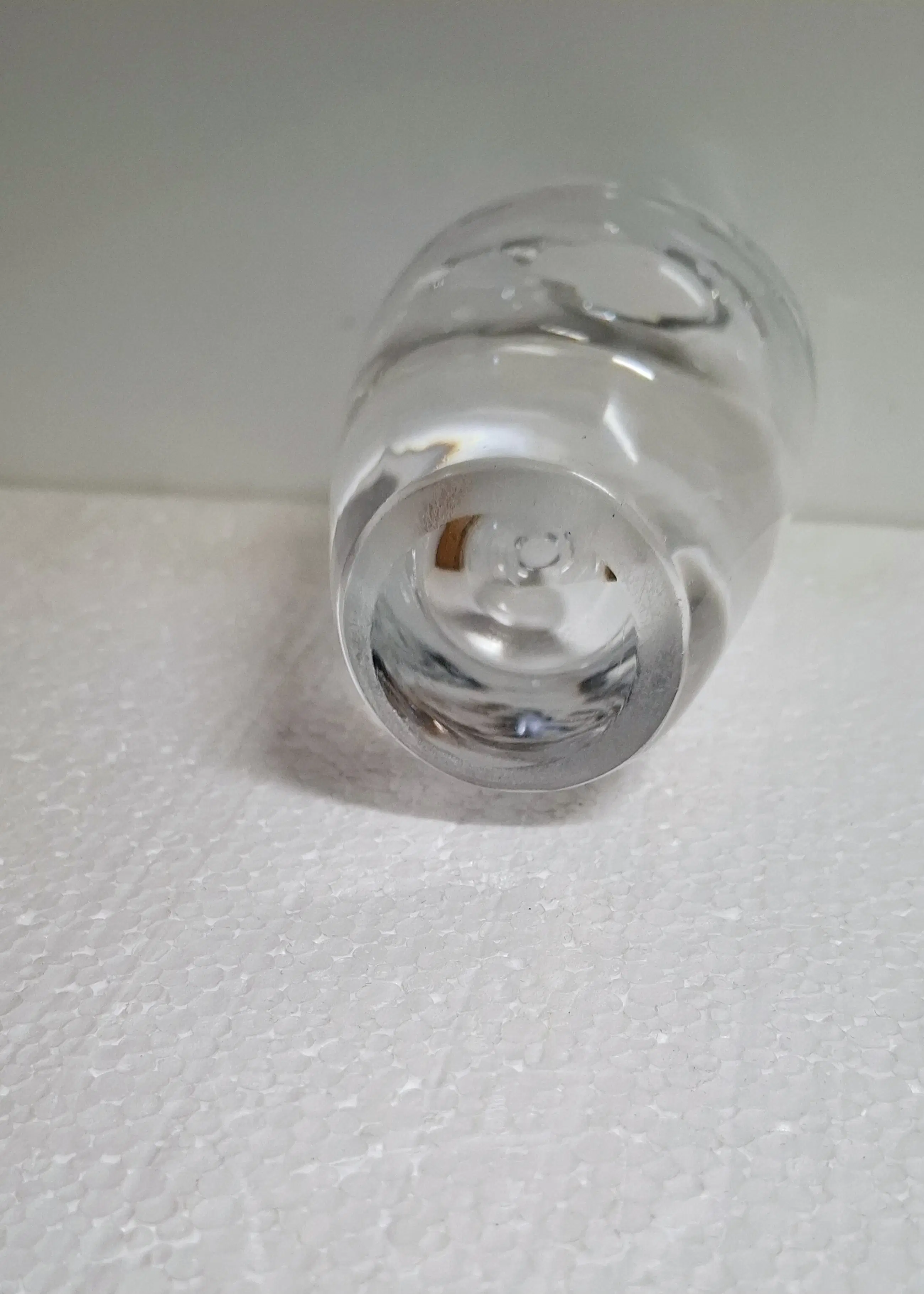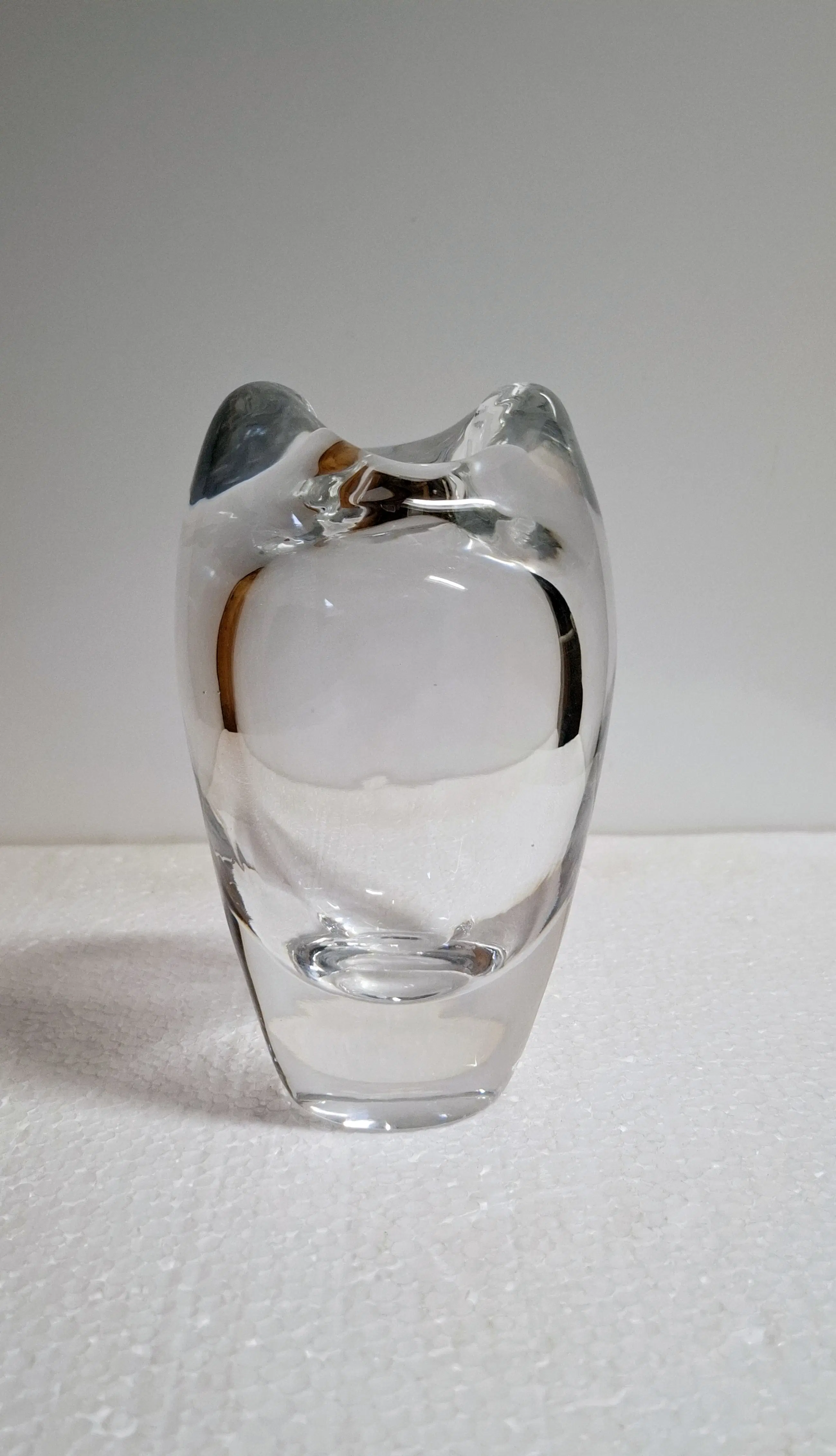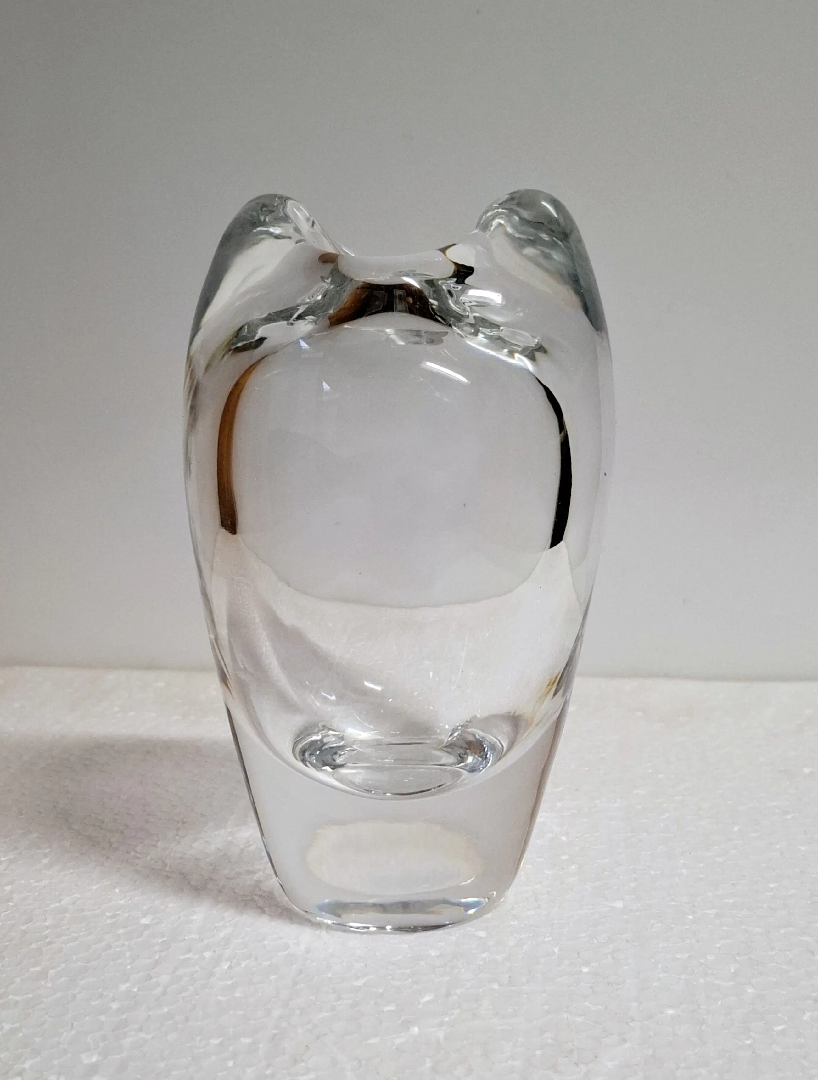 Design vaasje van Floris Meydam voor Leerdam Glasfabriek, i.o.v. toenmalige vakbond Algemene Bond Mercurius, ca. 1970. Hoogte 16 cm, max. doorsnede 8,5 cm, gewicht 900 gram . Verkeerd in een uitstekende staat .