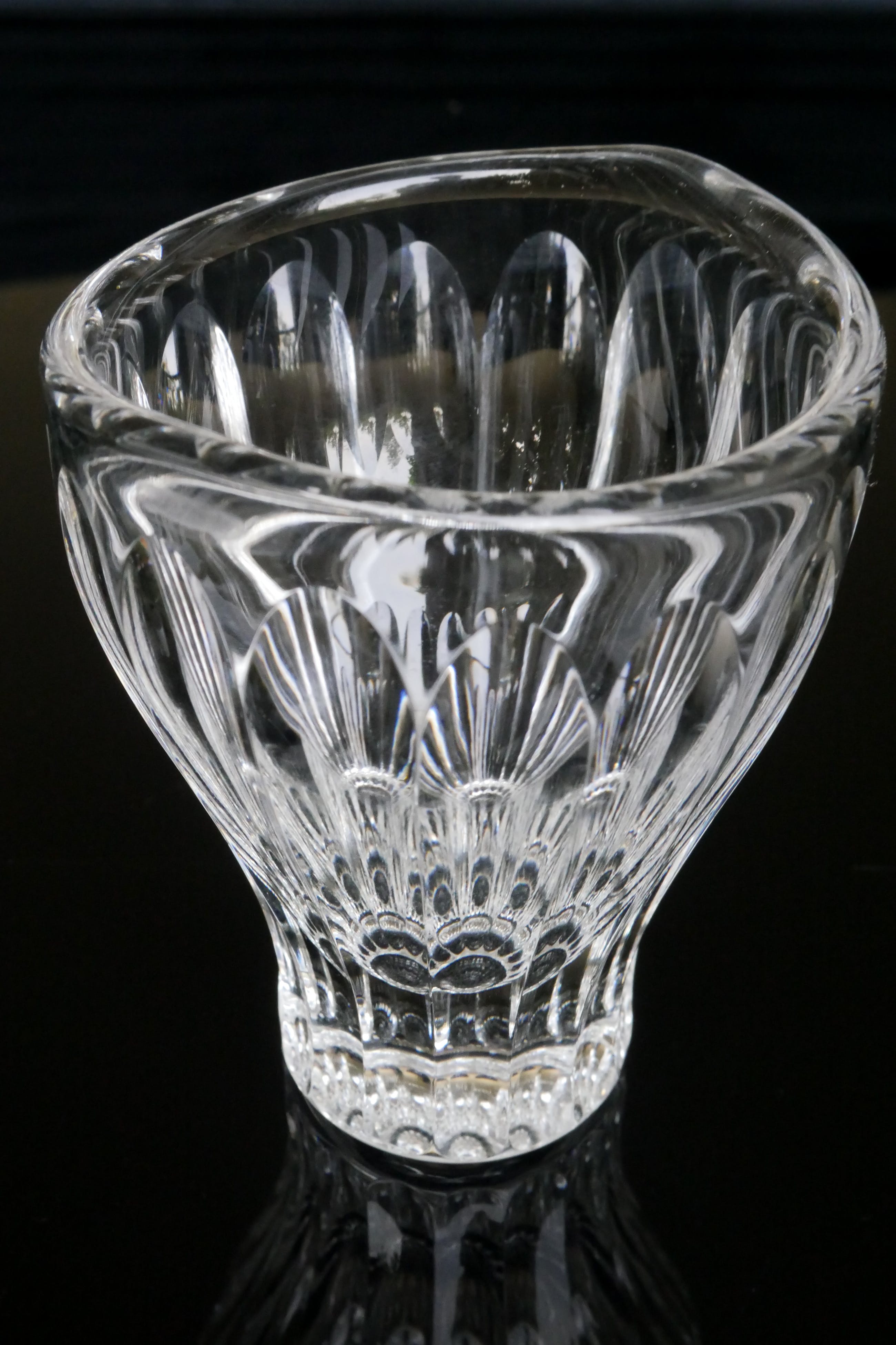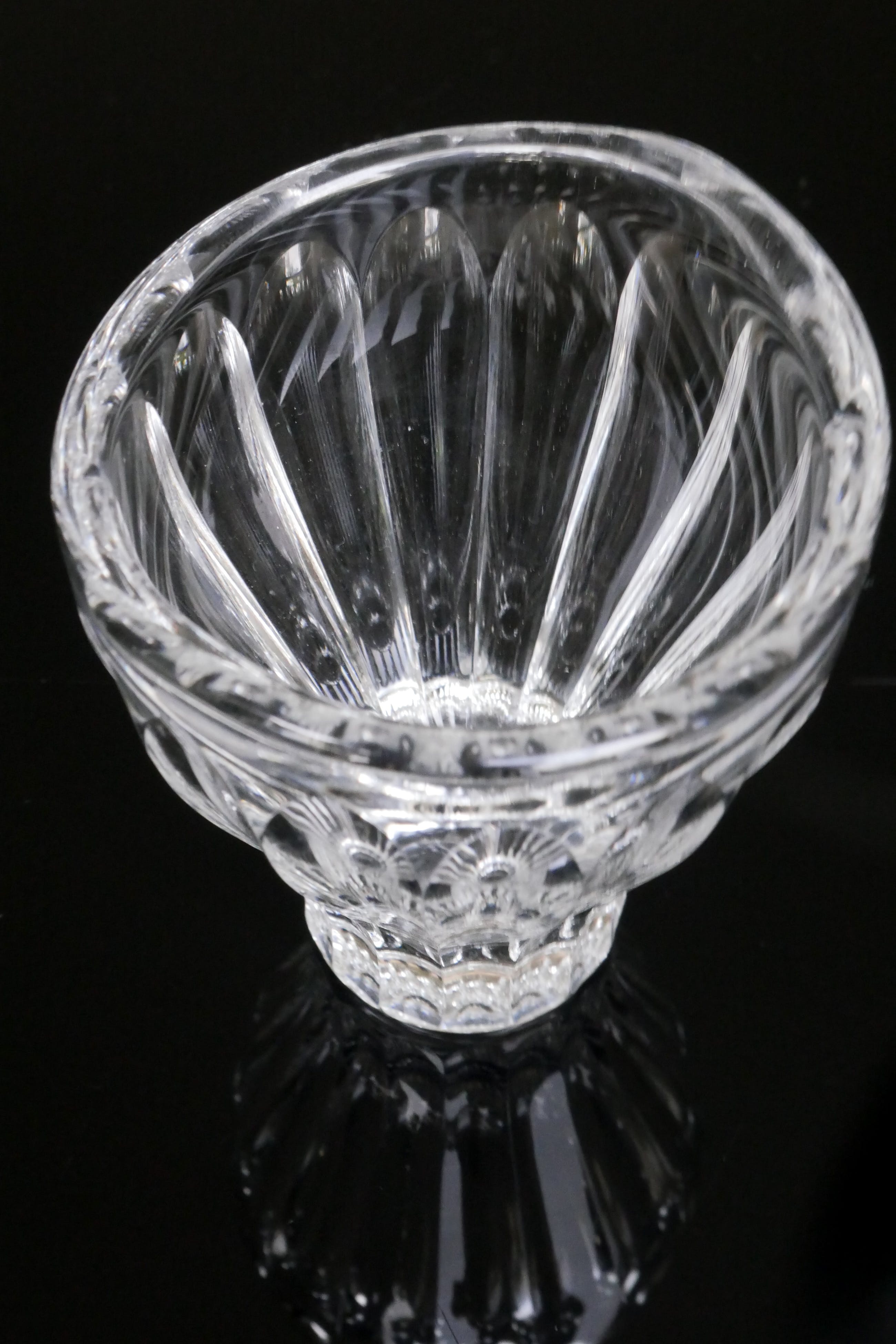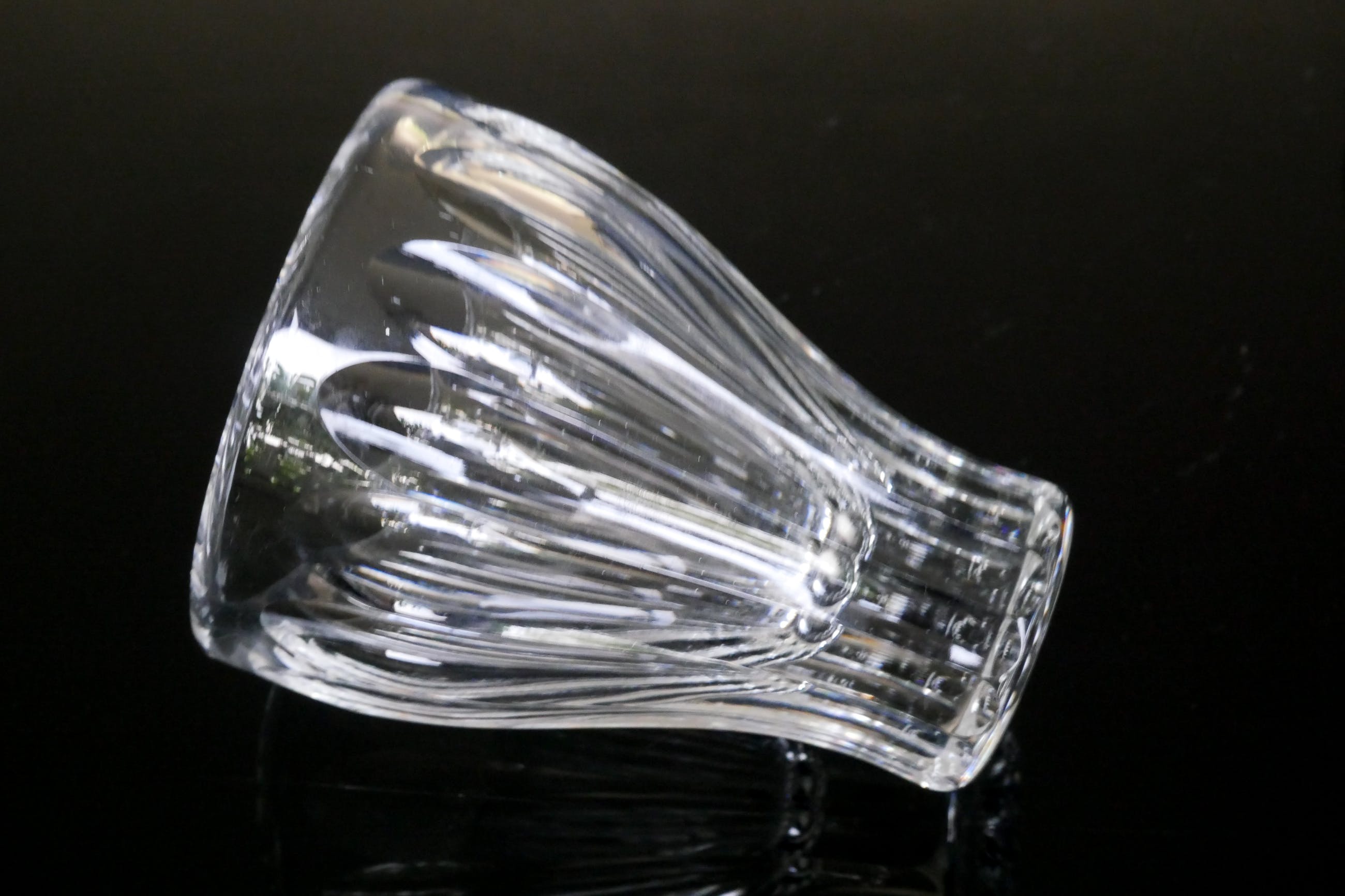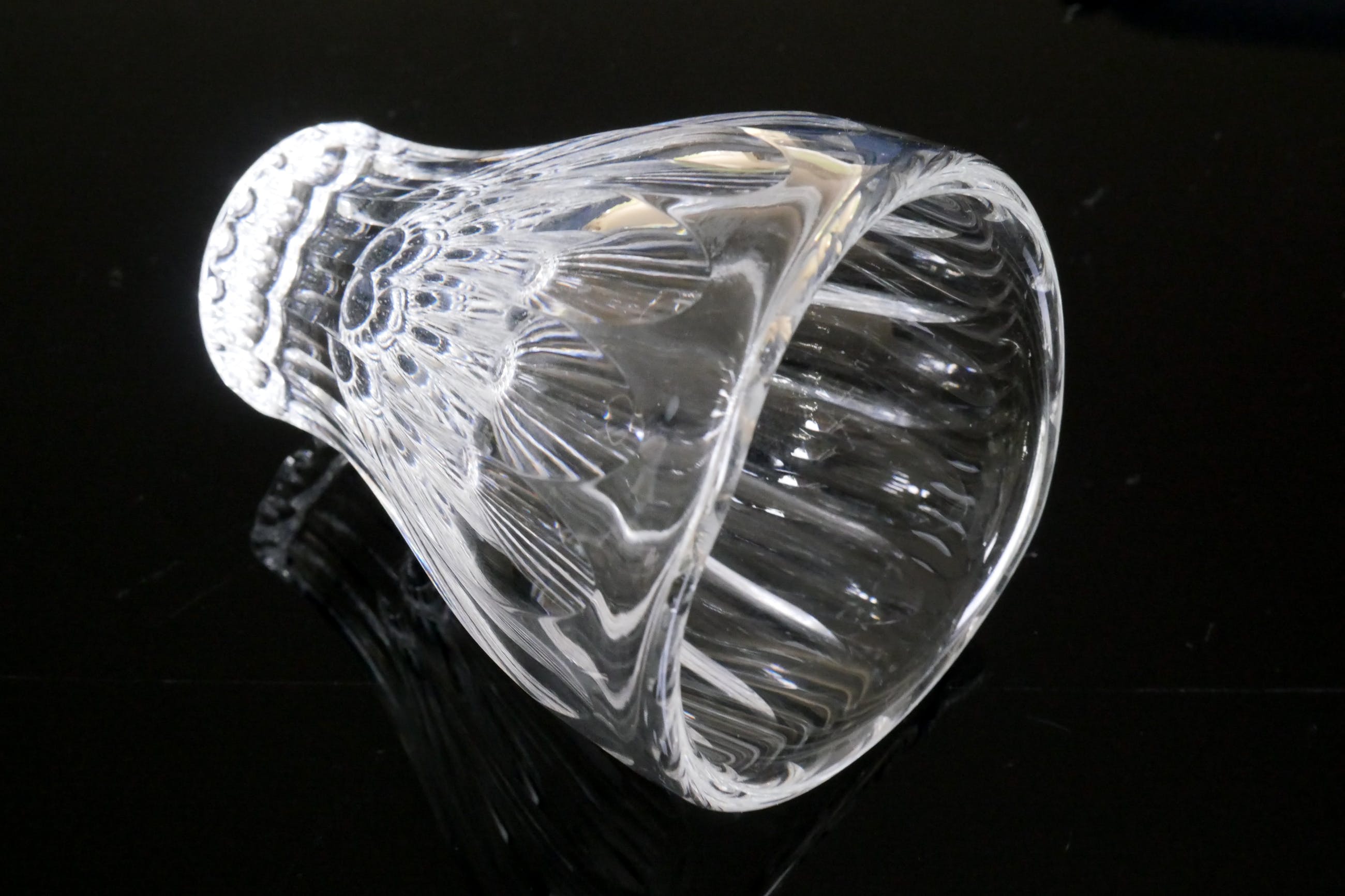 Ontwerper: Floris Meydam Jaar: 1953 Hoogte: 90 mm Diameter: boven: 70 mm Diameter: onder: 40 mm Uitvoering: Leerdam Glasfabriek Conditie: Uitstekend