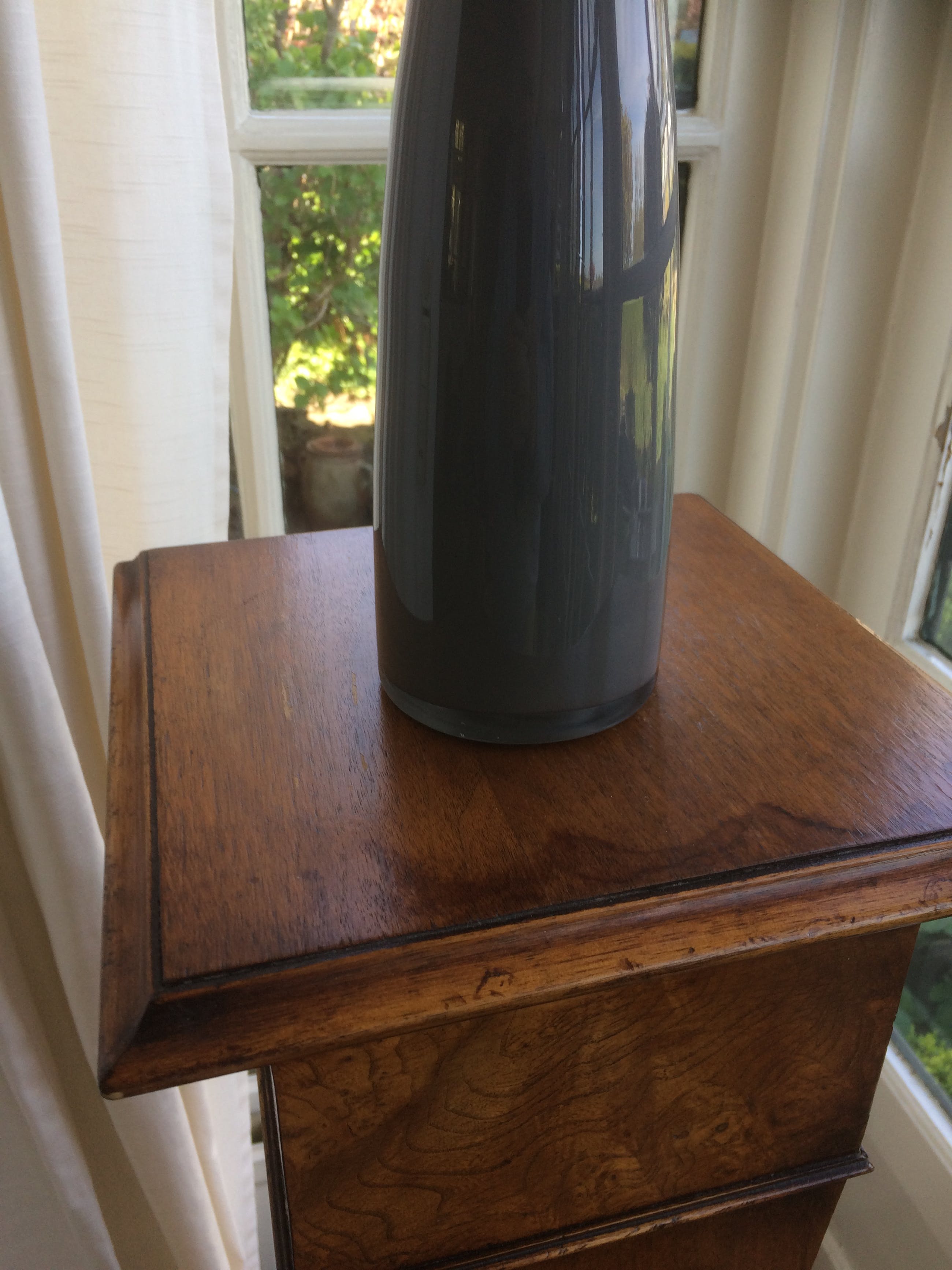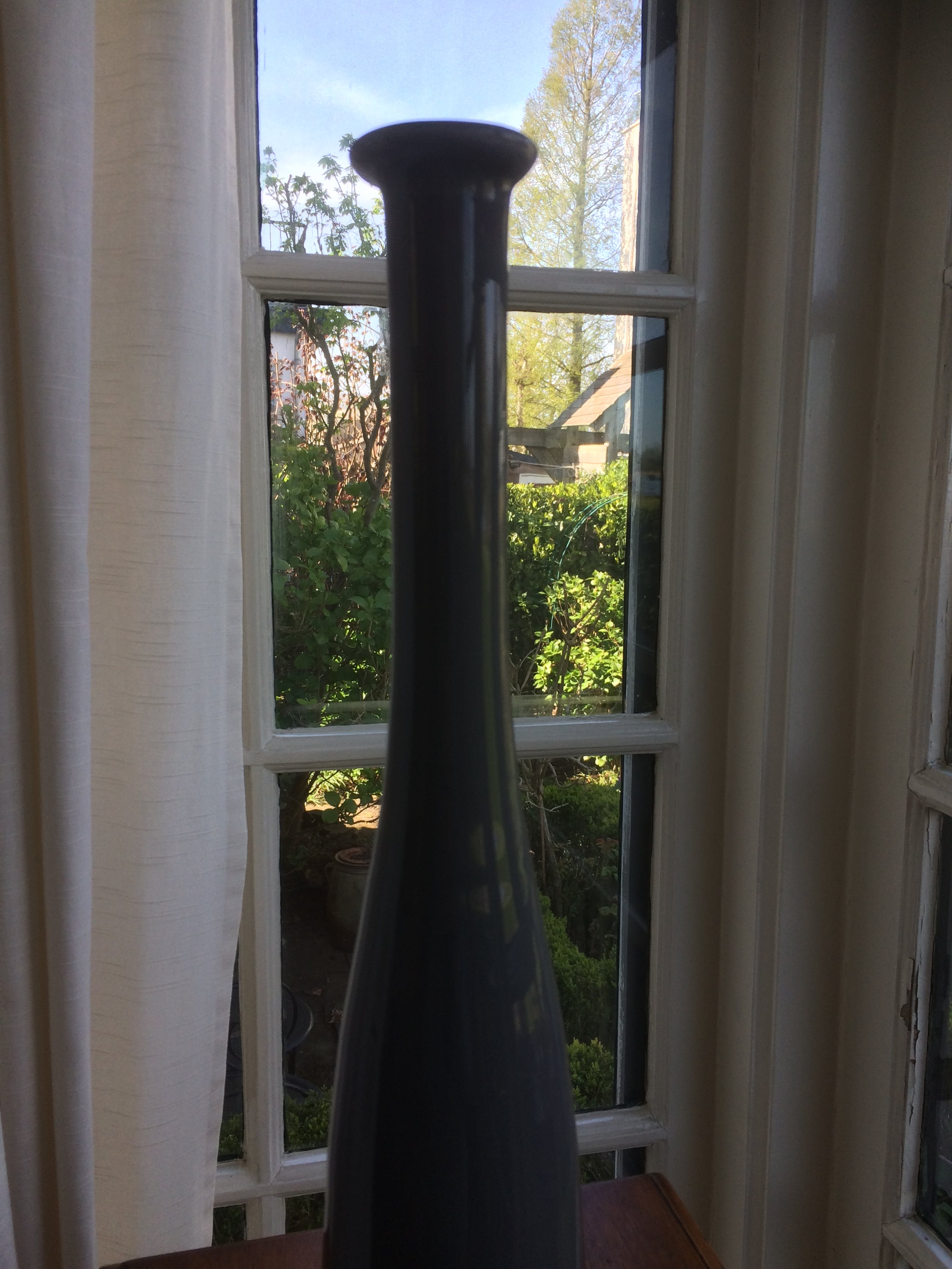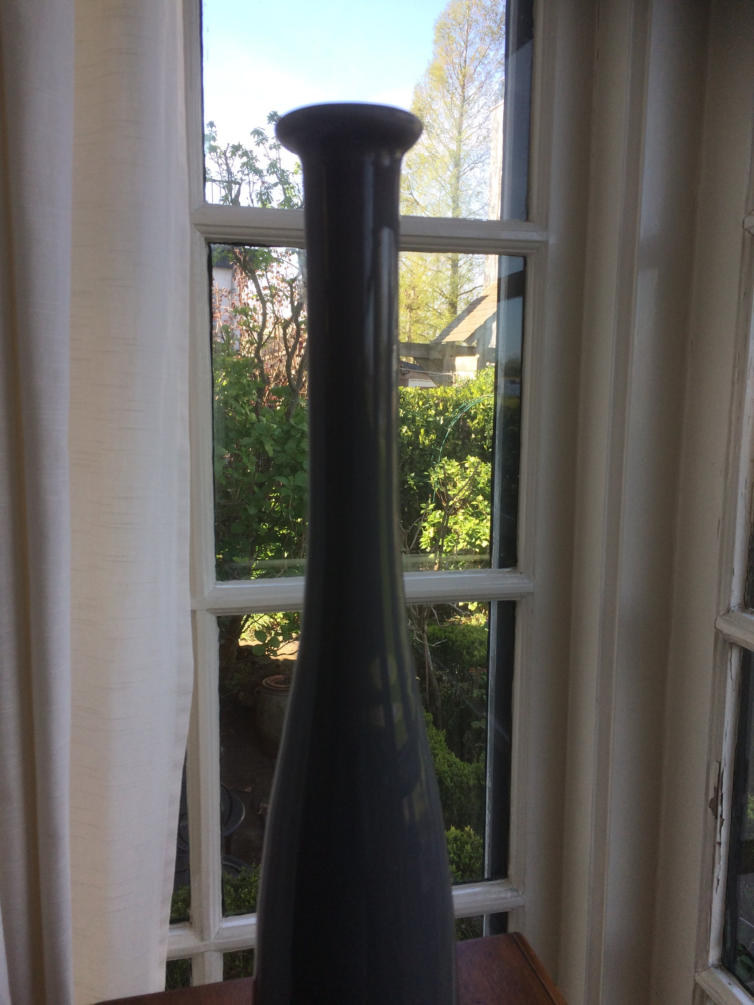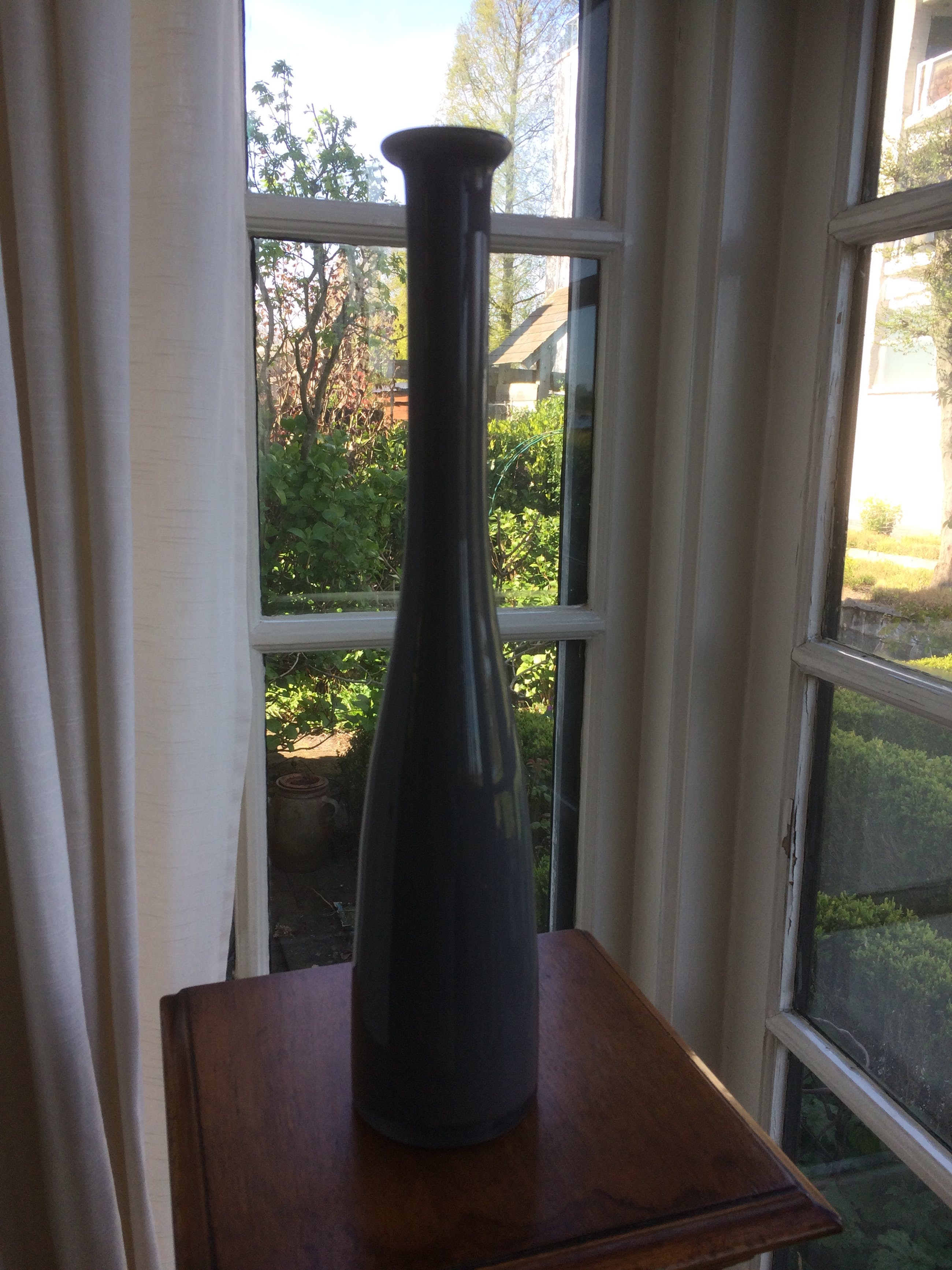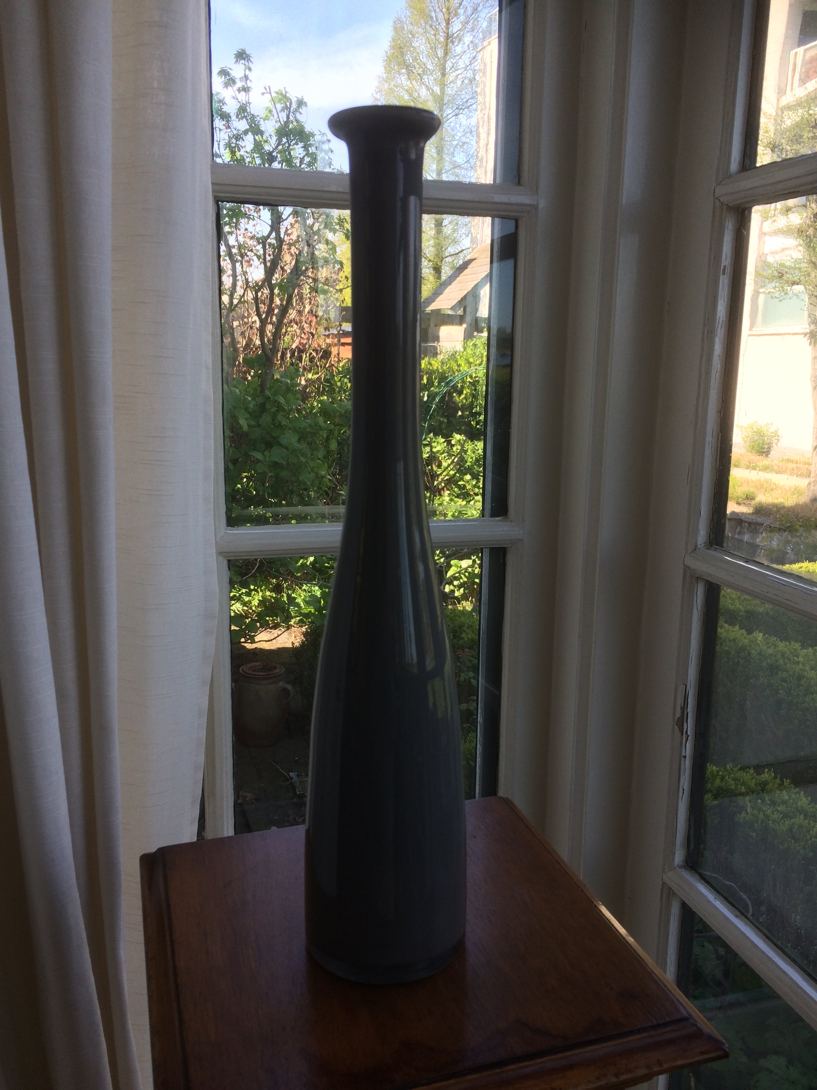 Hoge grijze flesvaas. Ontworpen door Floris Meydam ( 1919-2011 ) voor Glasfabrieken Leerdam rond jaren 60/70” Meydam was vele jaren als hoofdontwerper verbonden aan de fabricage van sierglas in Leerdam. Meydam ontwierp vele verschillende modellen voor de flesvaas, waarvan deze er een van is. De door hem ontworpen vazen zijn gewild. Verzamelaars zoeken zijn gesigneerde vazen, zoals deze met de zelden gebruikte kleur grijs. Met de glaspen is deze vaas hand gesigneerd De vaas is zeer groot; zelfs 45 cm hoog !! Verzending per PostNL. Kosten koper in Nederland € 10,00. Buitenland zie de internationale pakketpos -tarieven. Afhalen op afspraak.