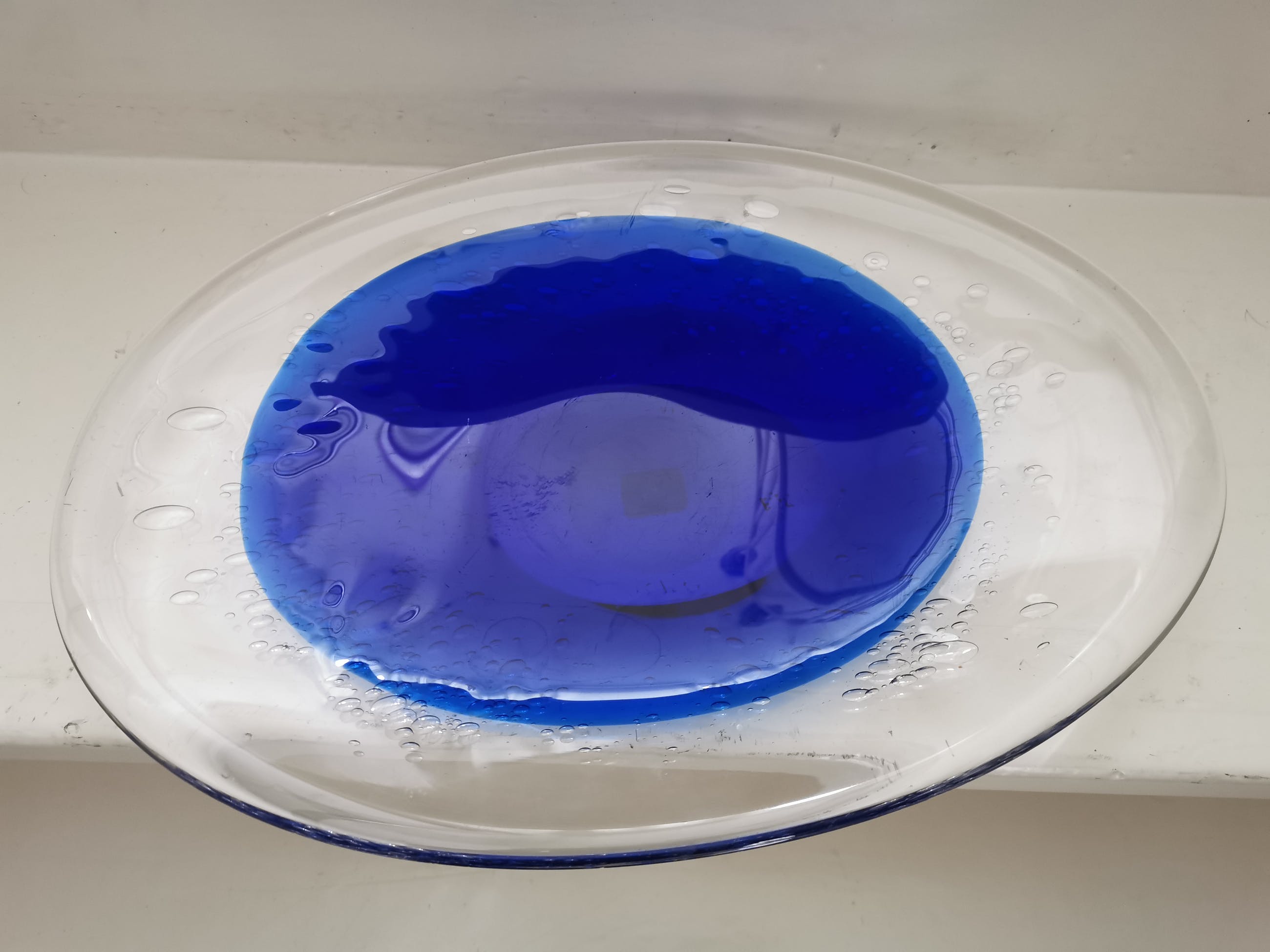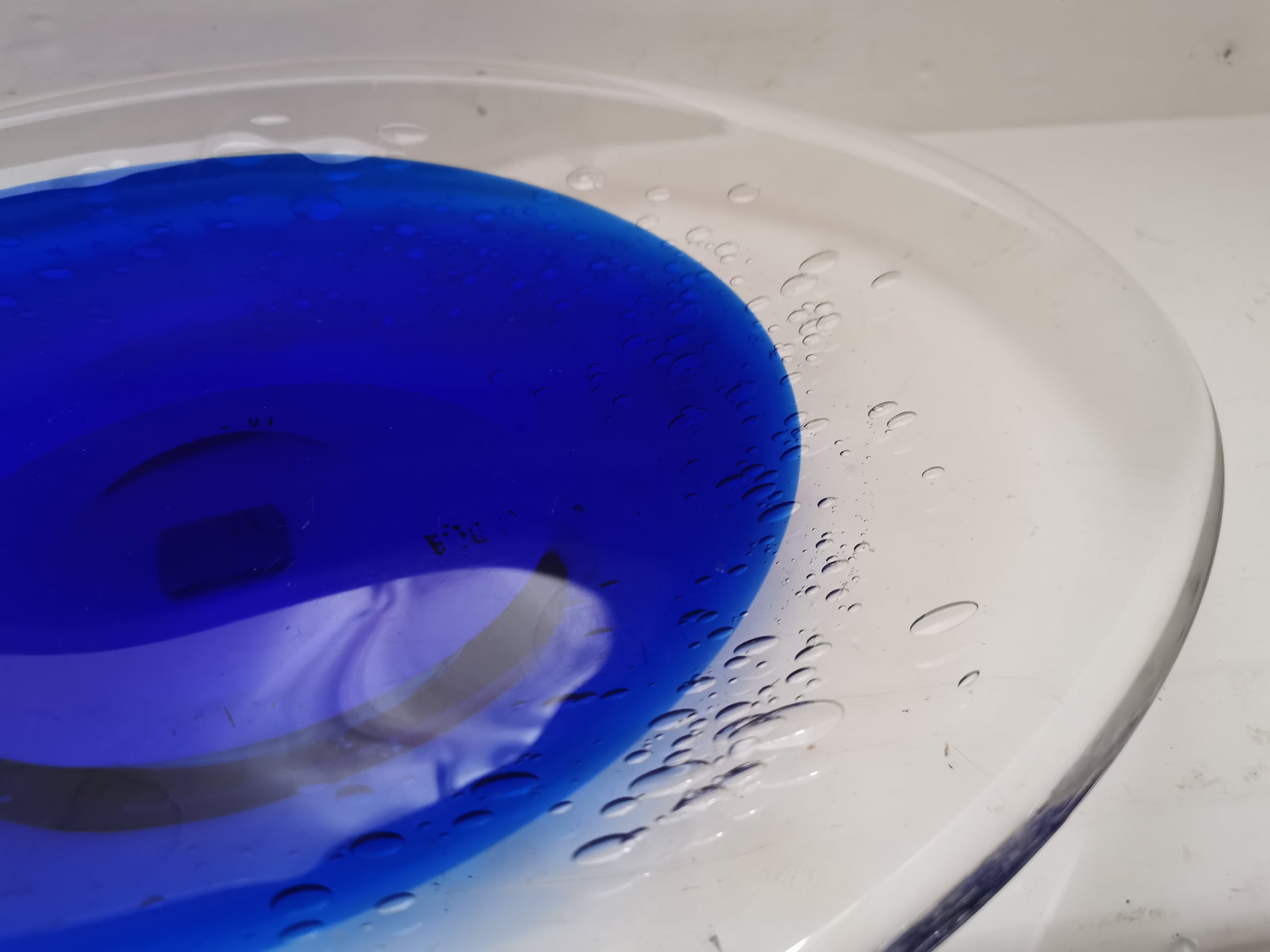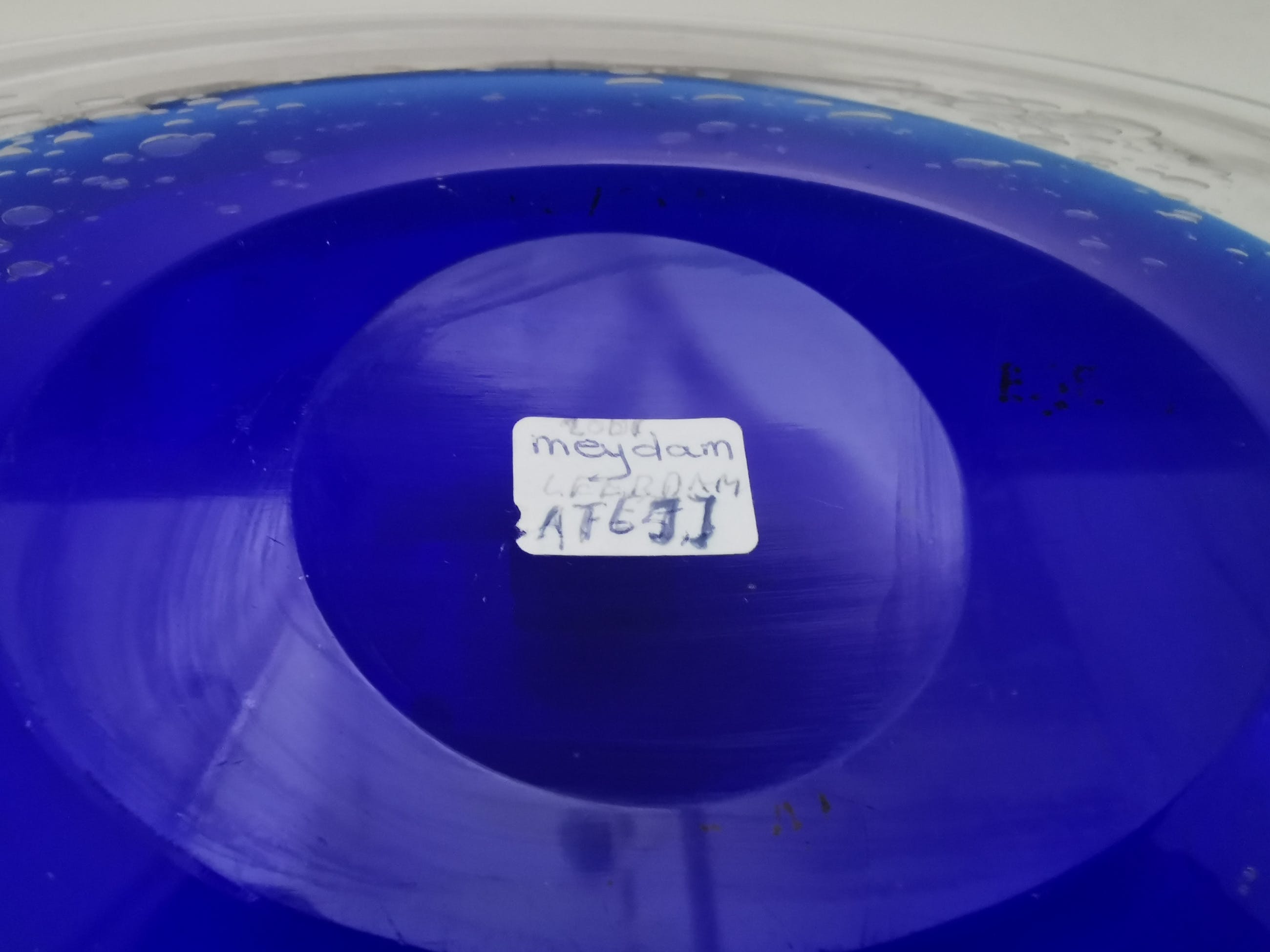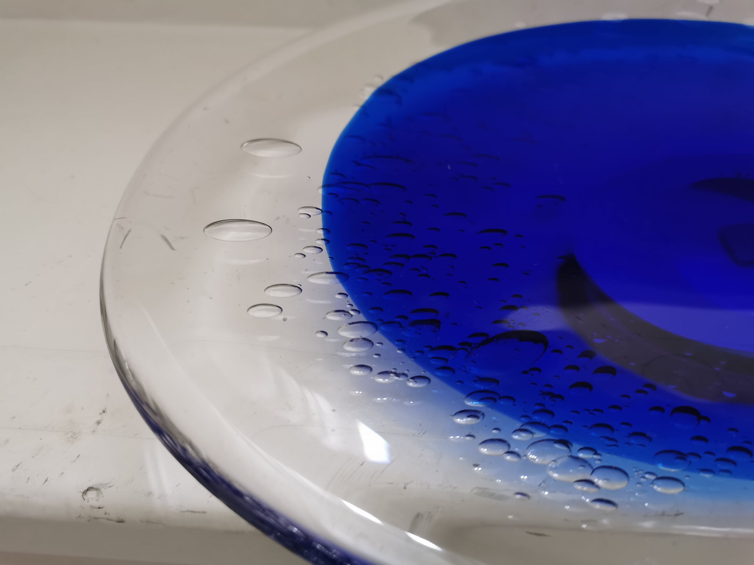 Prachtige schaal met druppels erin met een groot blauw vak met heldere rand, dikwandig.