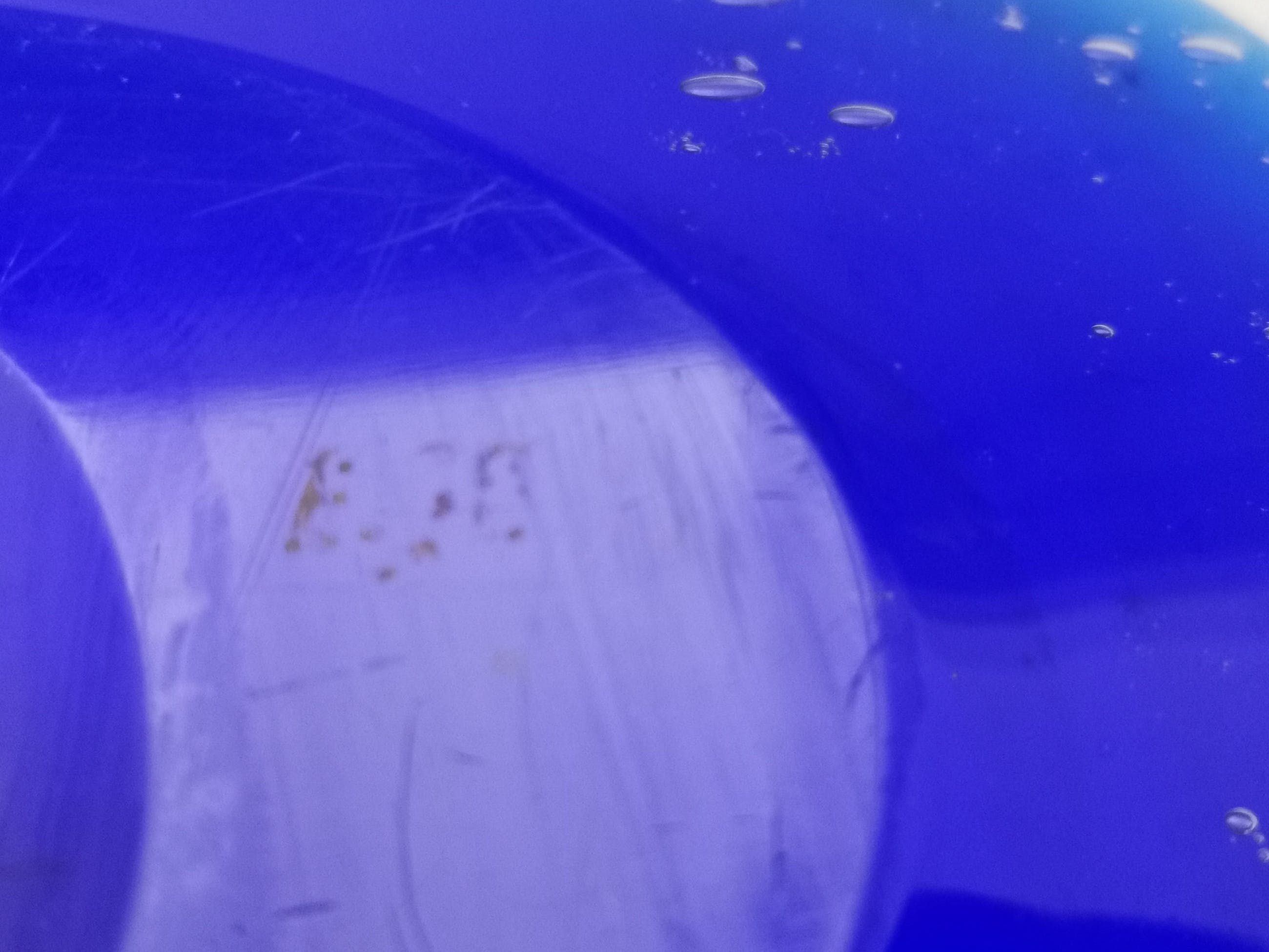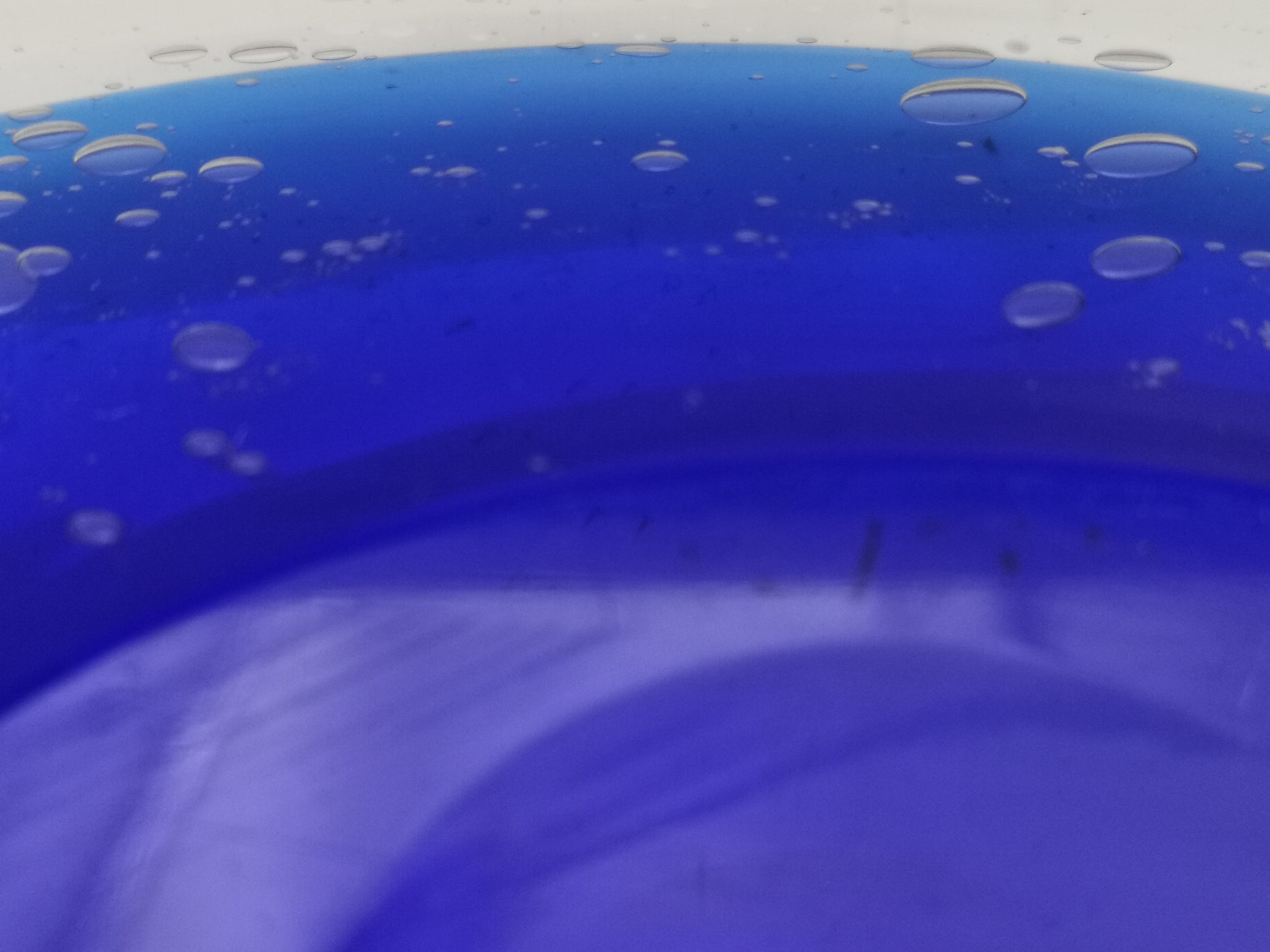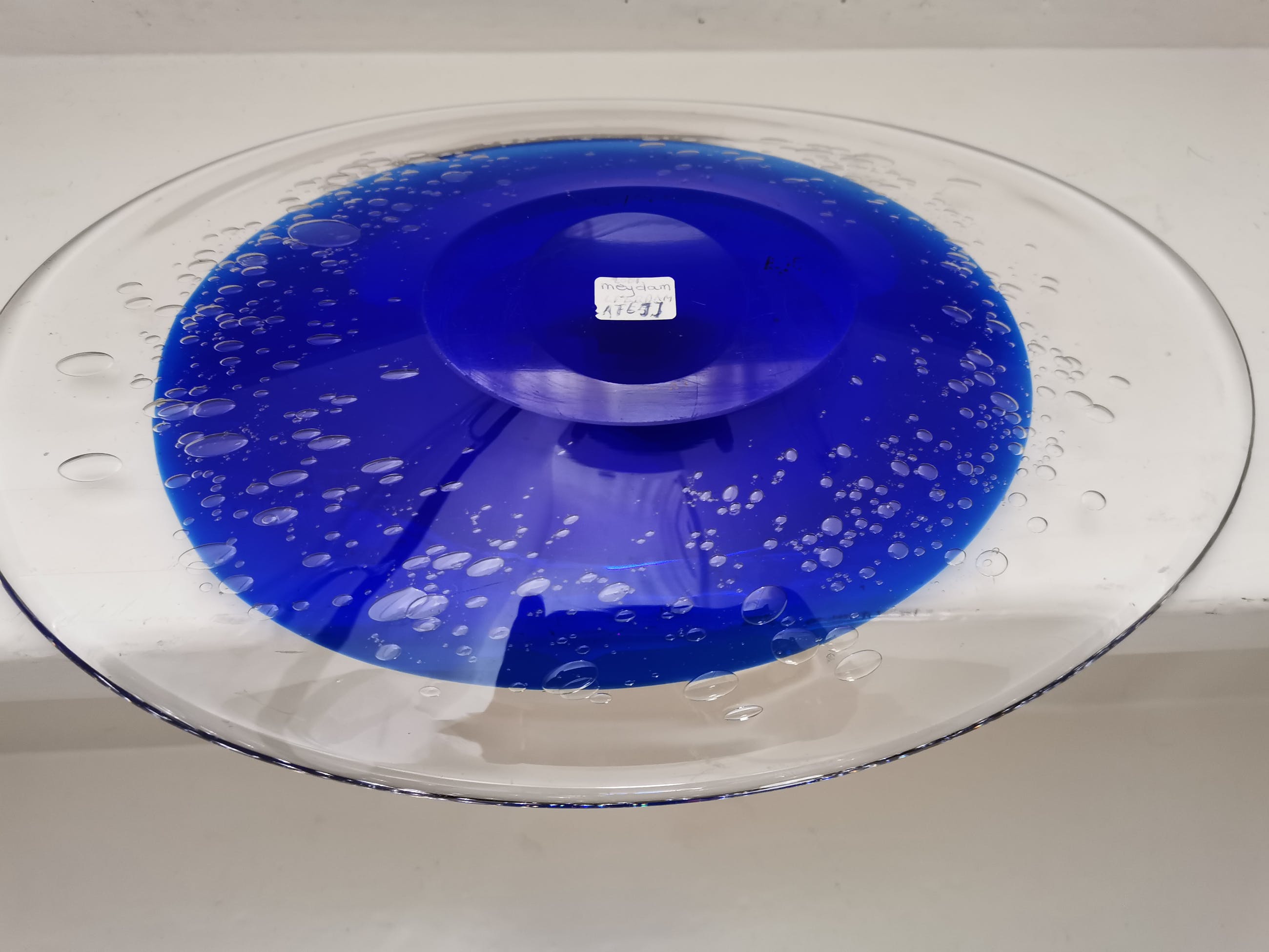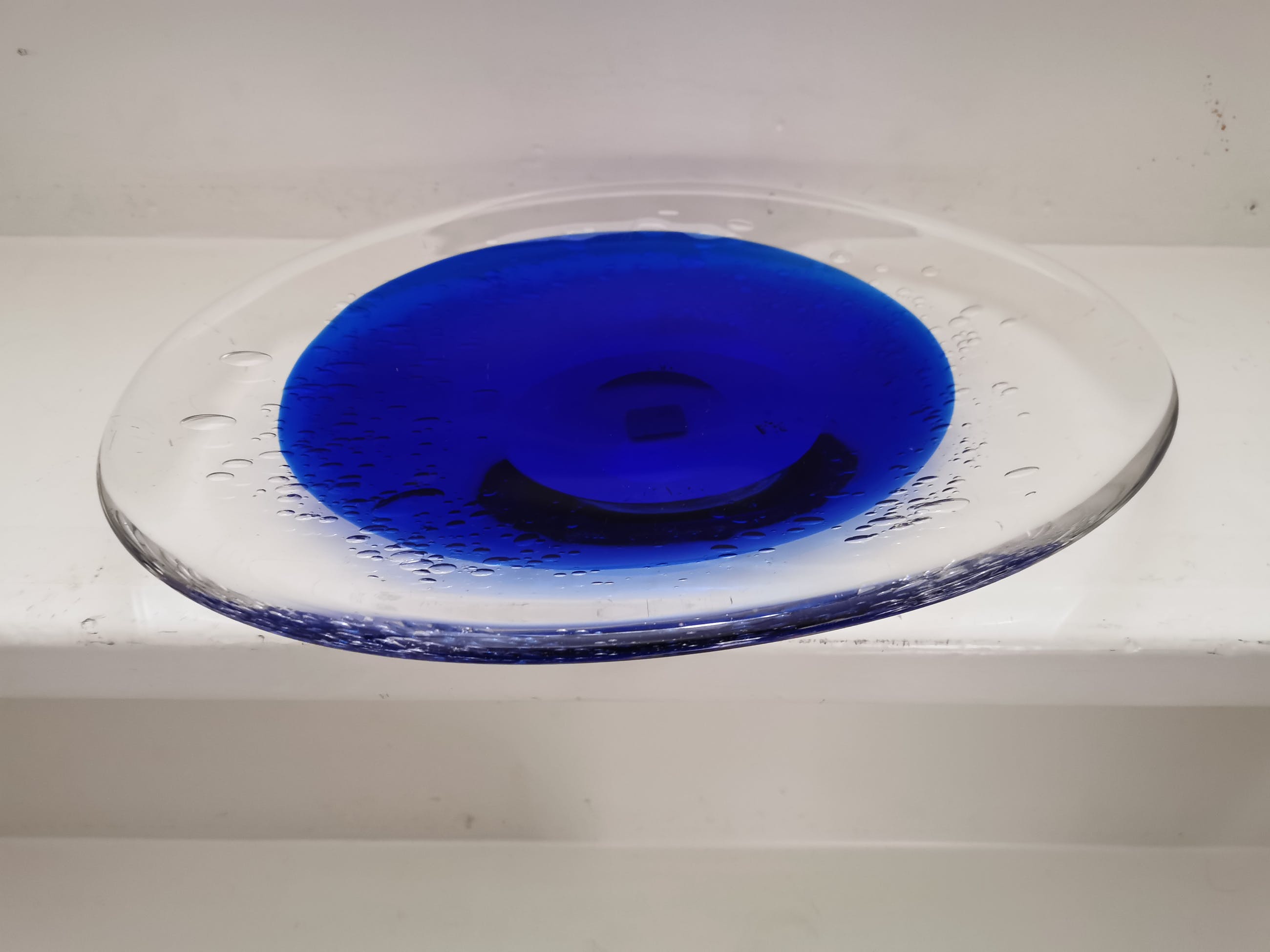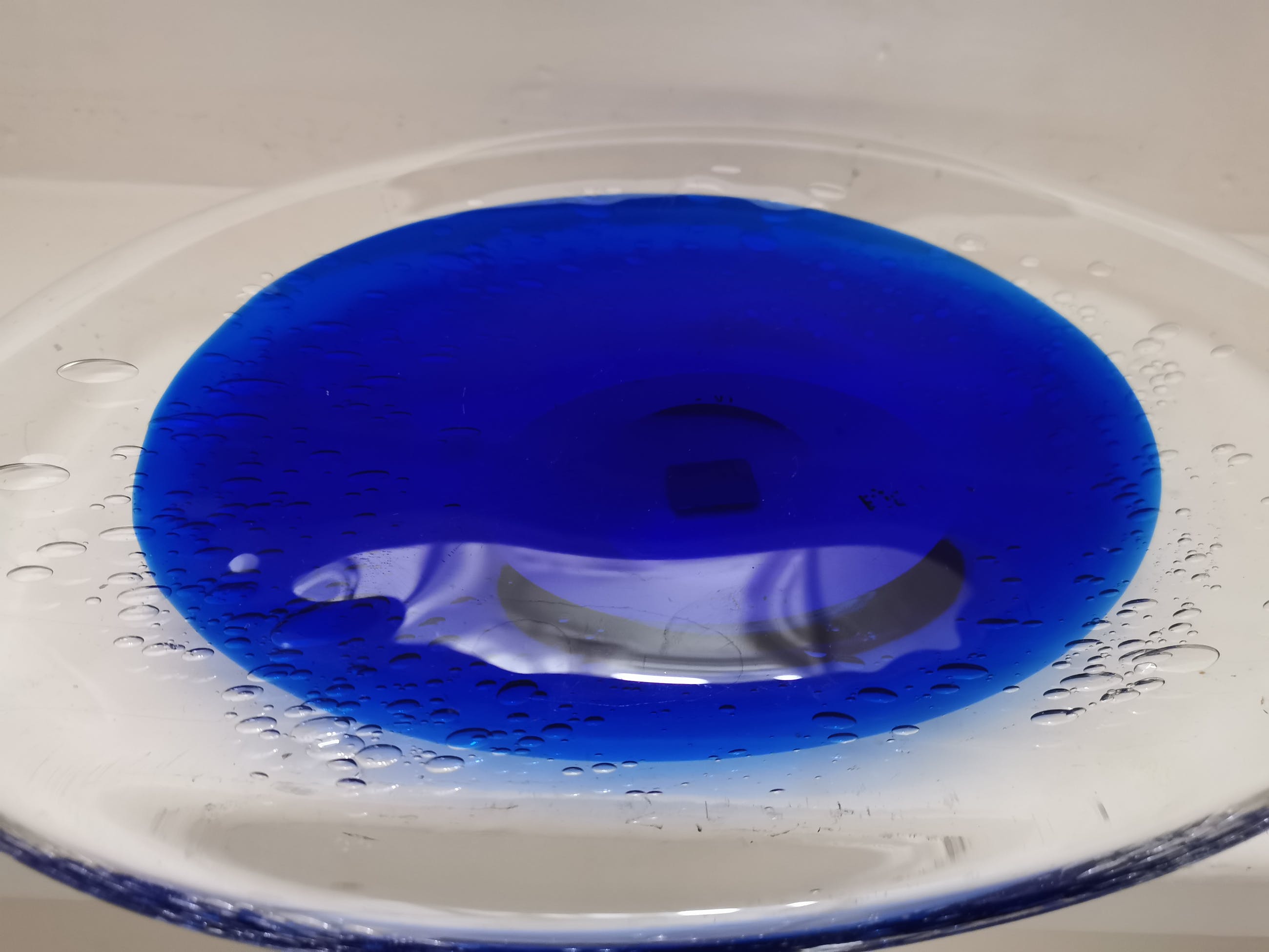 Prachtige schaal met druppels erin met een groot blauw vak met heldere rand, dikwandig.