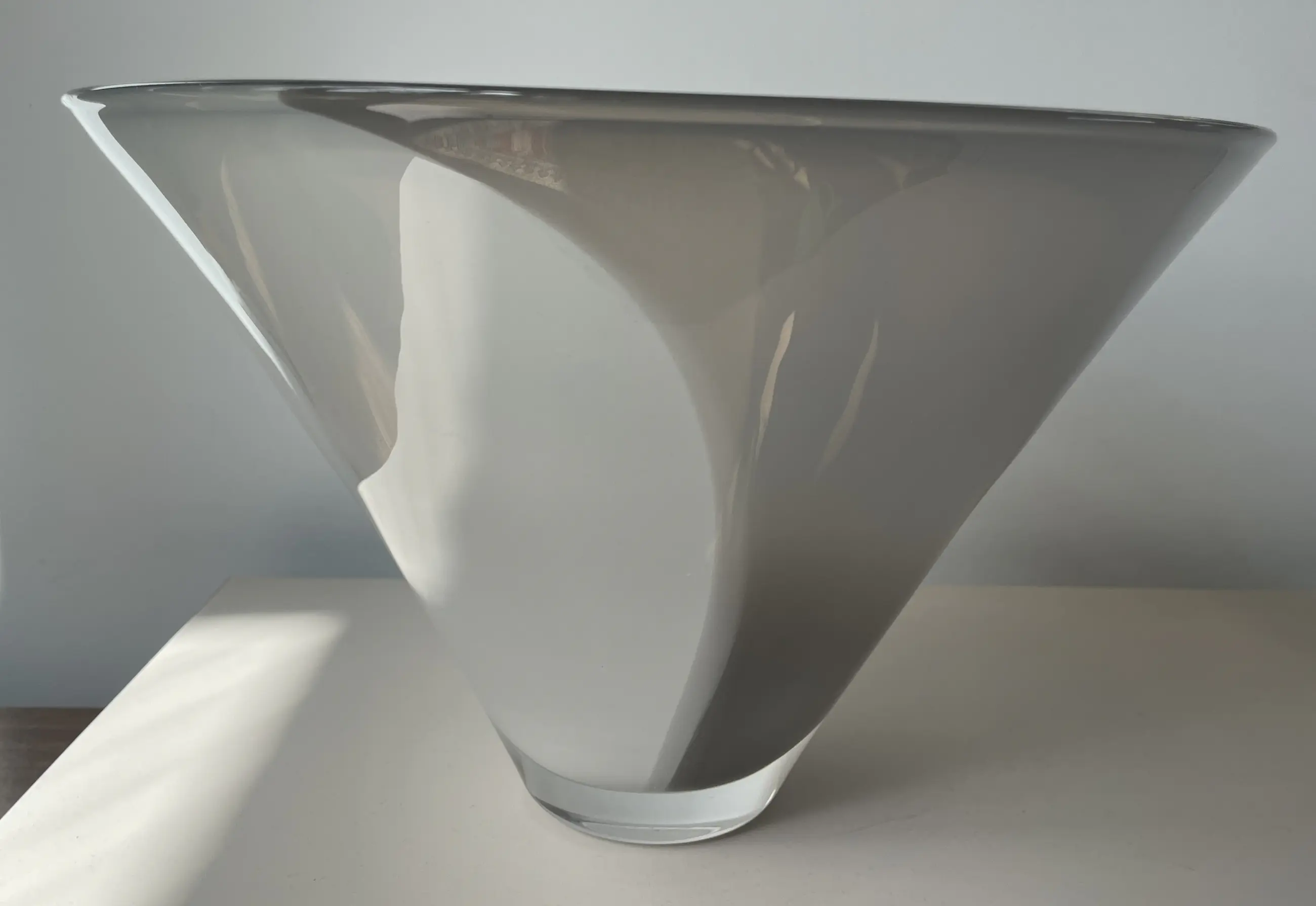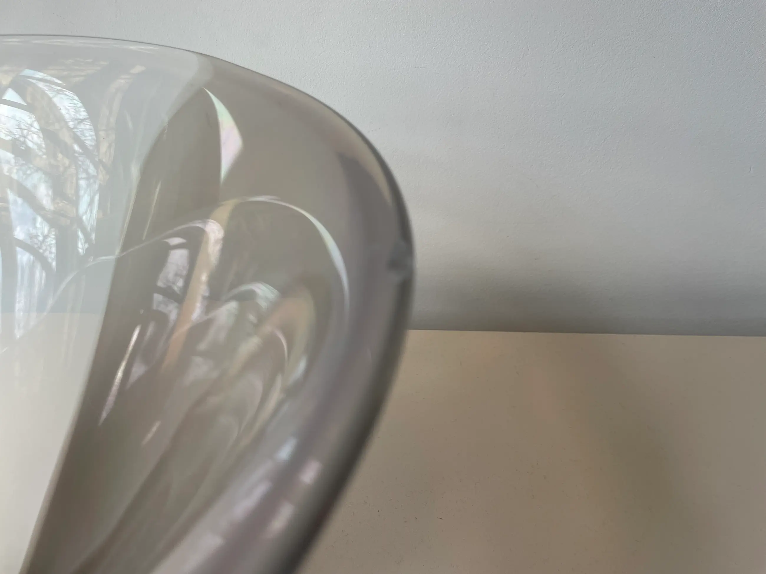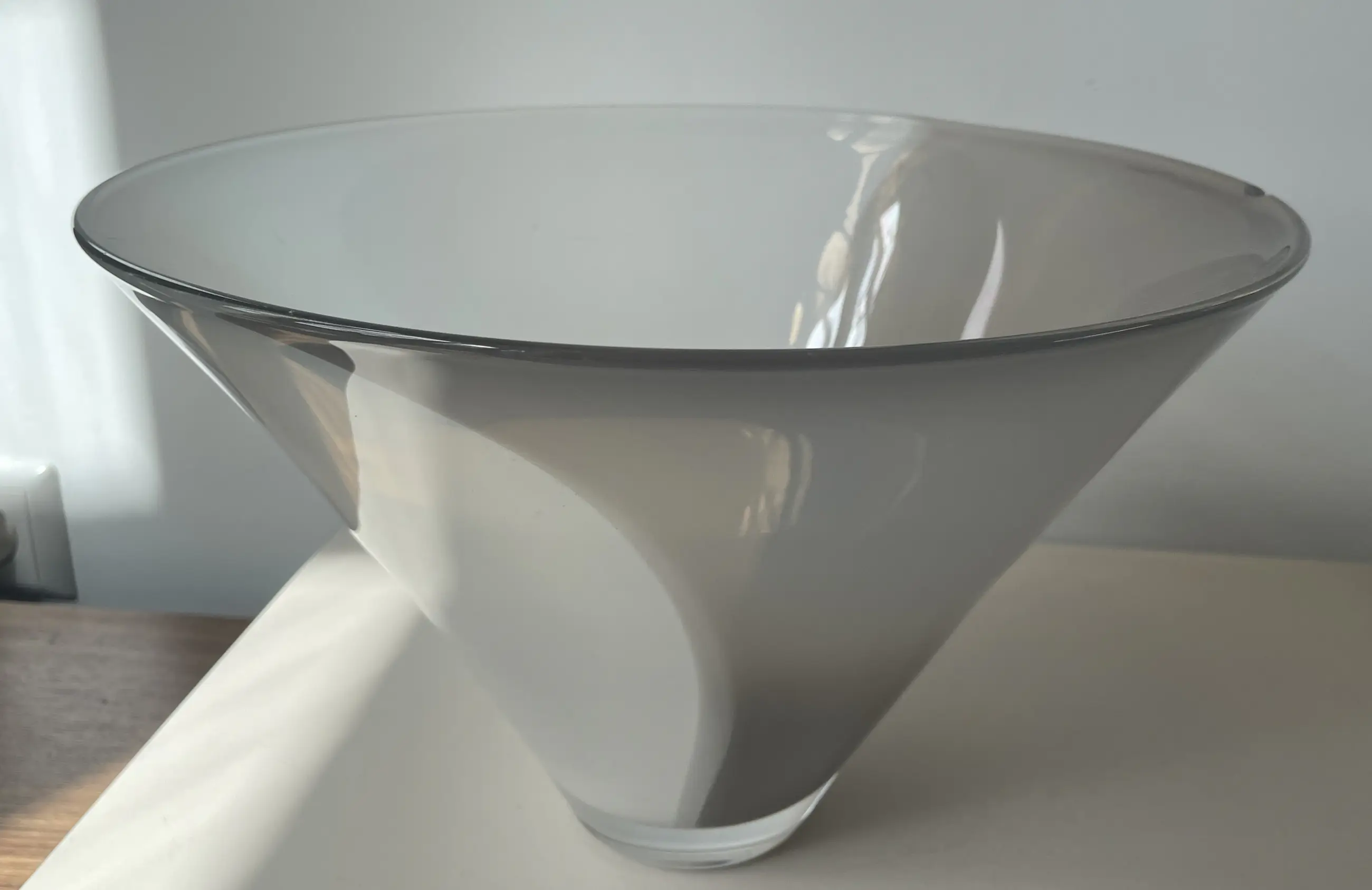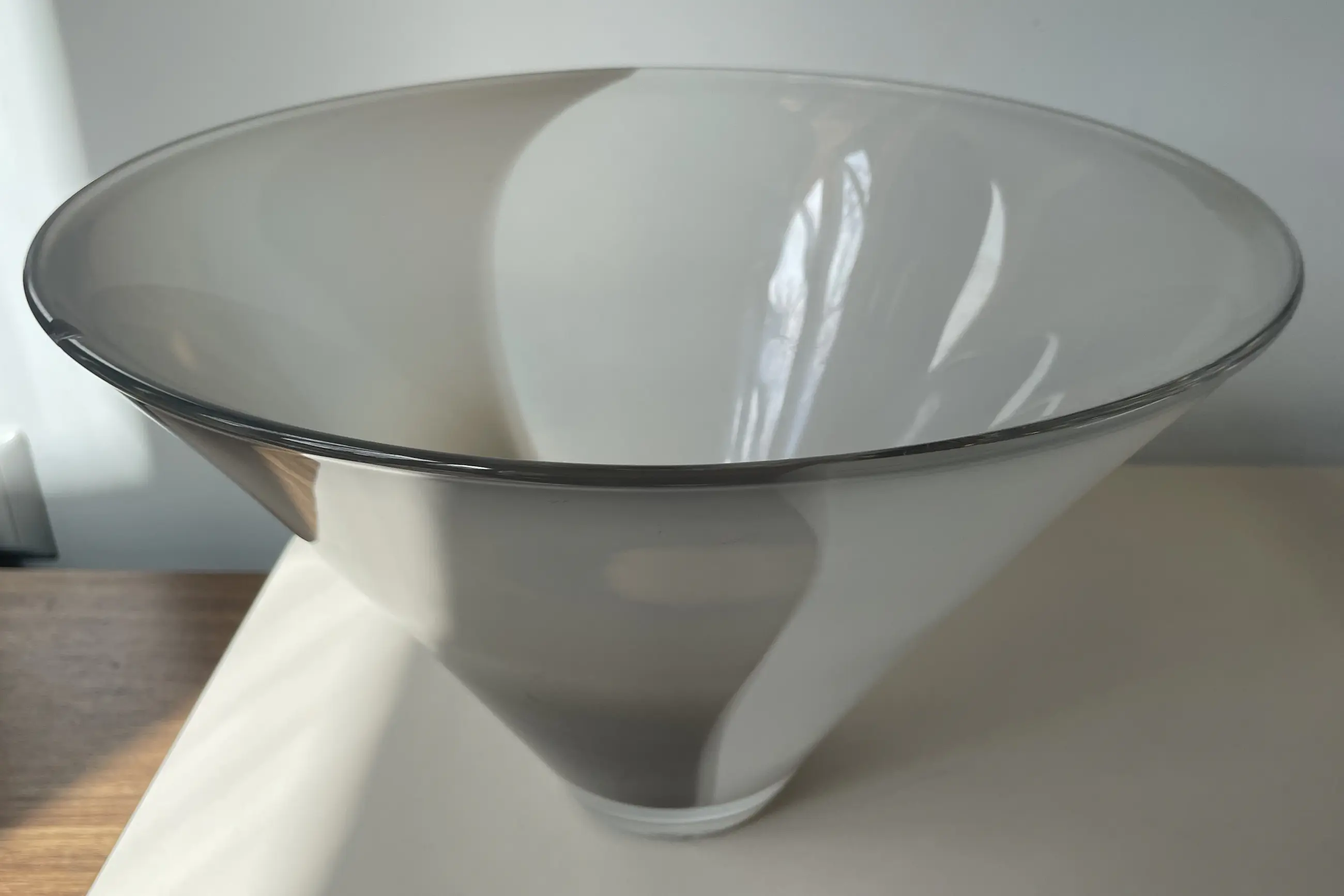 Grote two tone (grijs-wit ofwel Salmiak kleur) kunstglazen Unica kom FM85041L van Floris Meydam uit 1985. Helaas heeft de kom schade; een chip op de bovenrand en een chip onderaan de voet. De laatste is wat minder in het oog springend, maar de 1e helaas wel. En krassen op de standring - zie foto's.