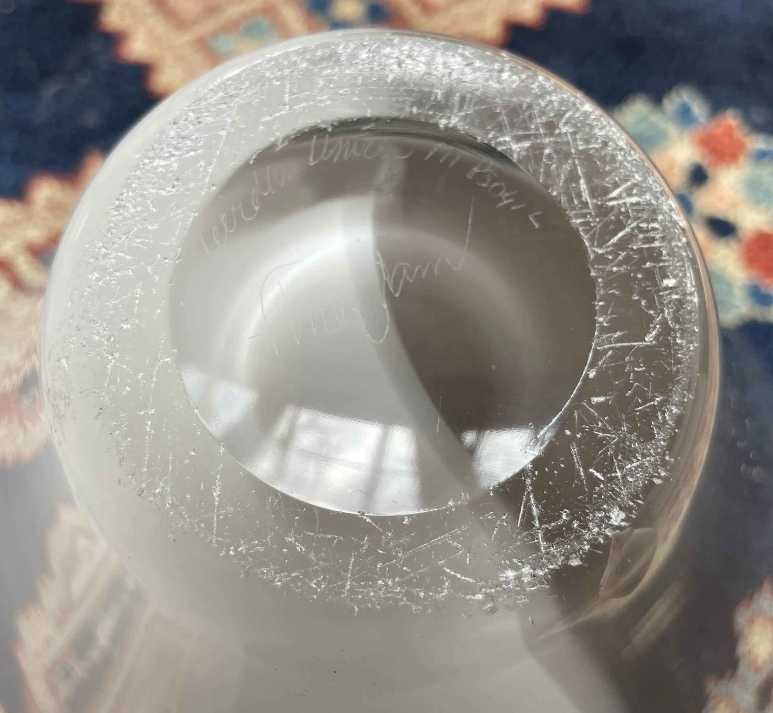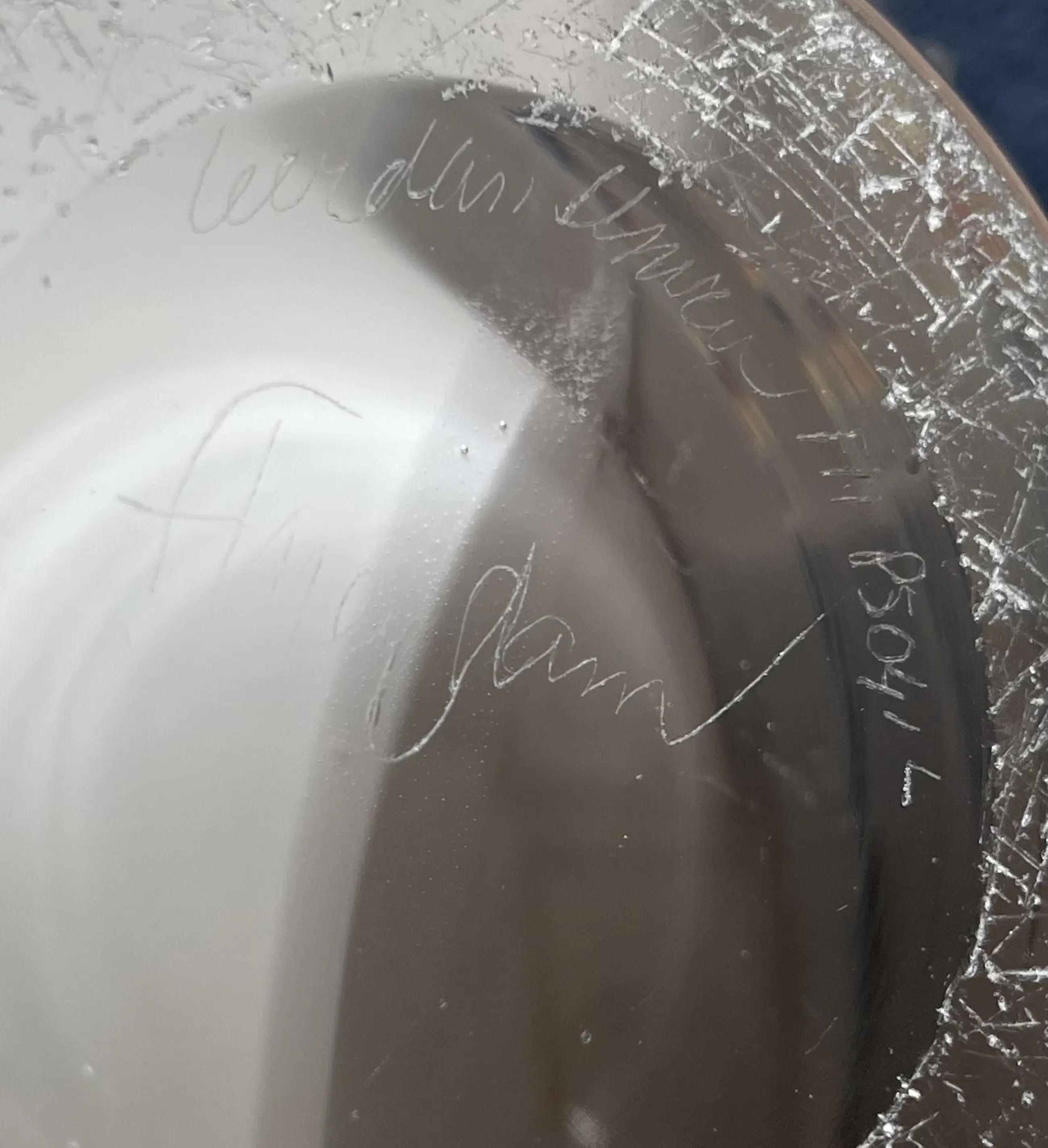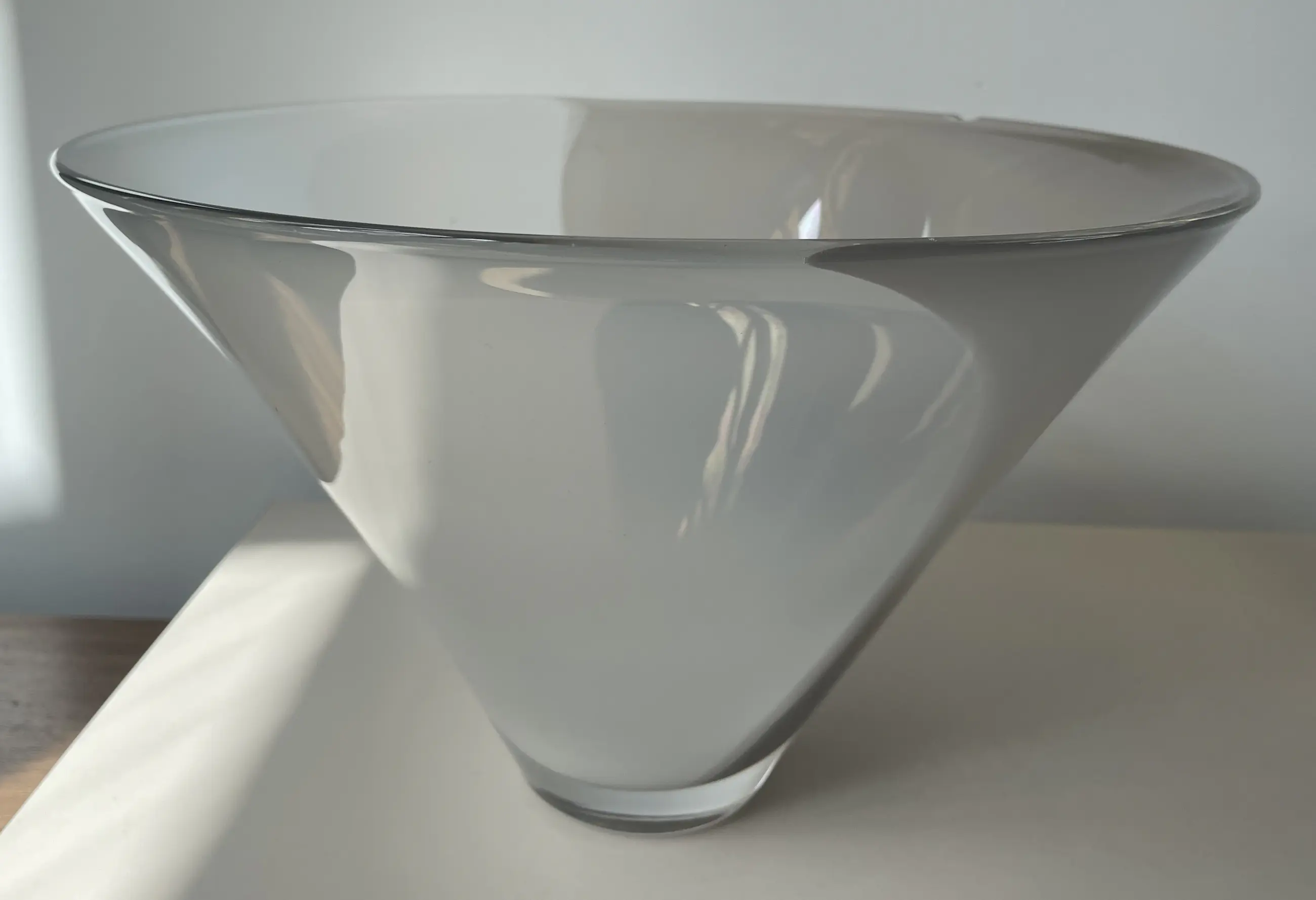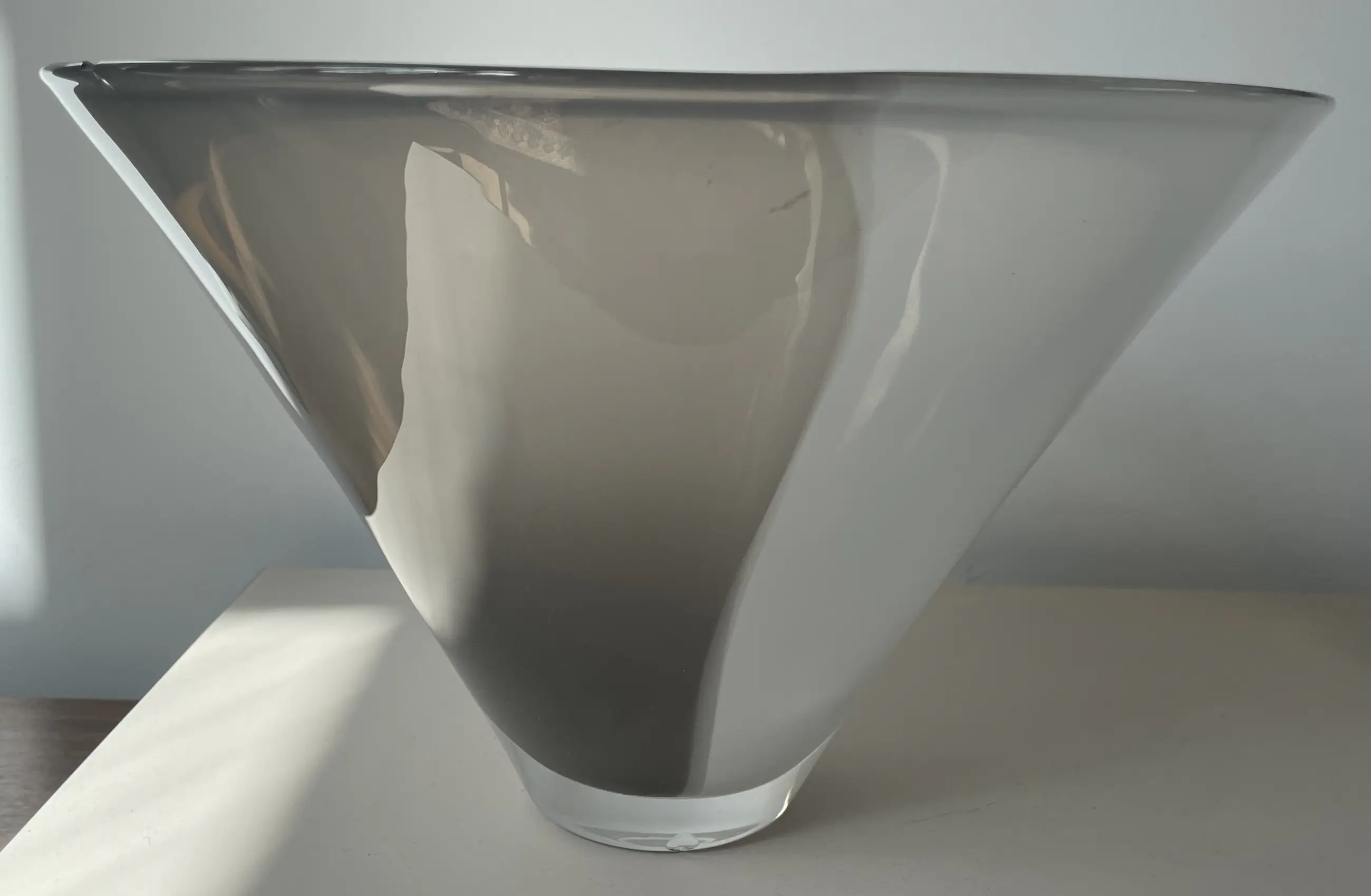 Grote two tone (grijs-wit ofwel Salmiak kleur) kunstglazen Unica kom FM85041L van Floris Meydam uit 1985. Helaas heeft de kom schade; een chip op de bovenrand en een chip onderaan de voet. De laatste is wat minder in het oog springend, maar de 1e helaas wel. En krassen op de standring - zie foto's.