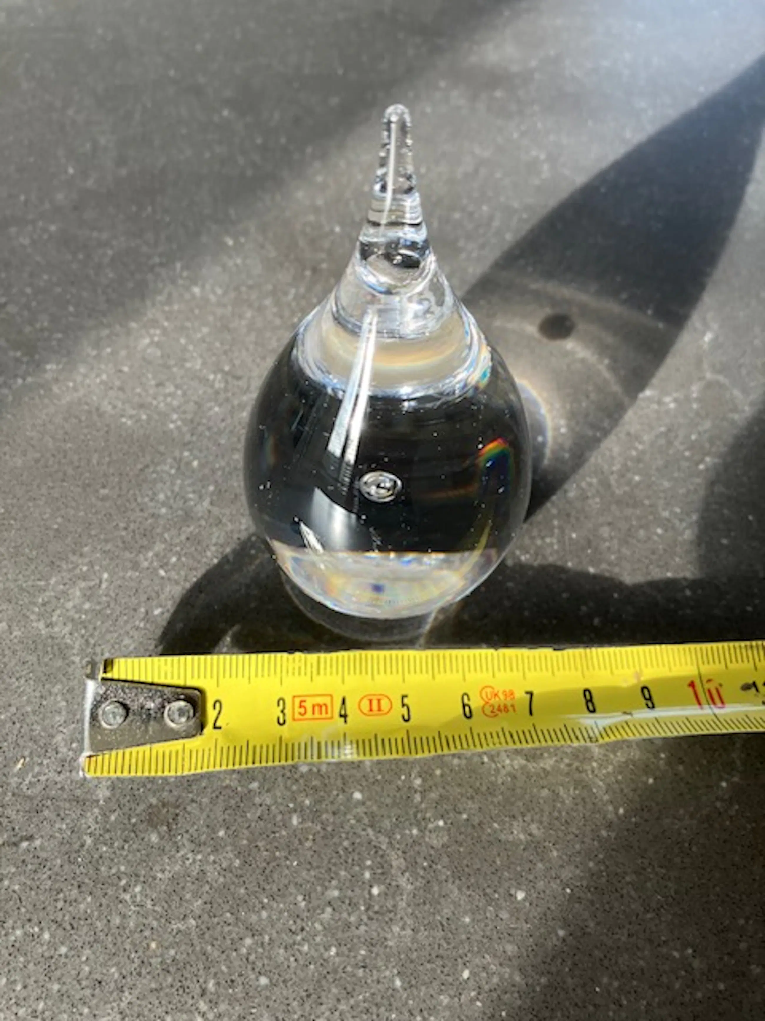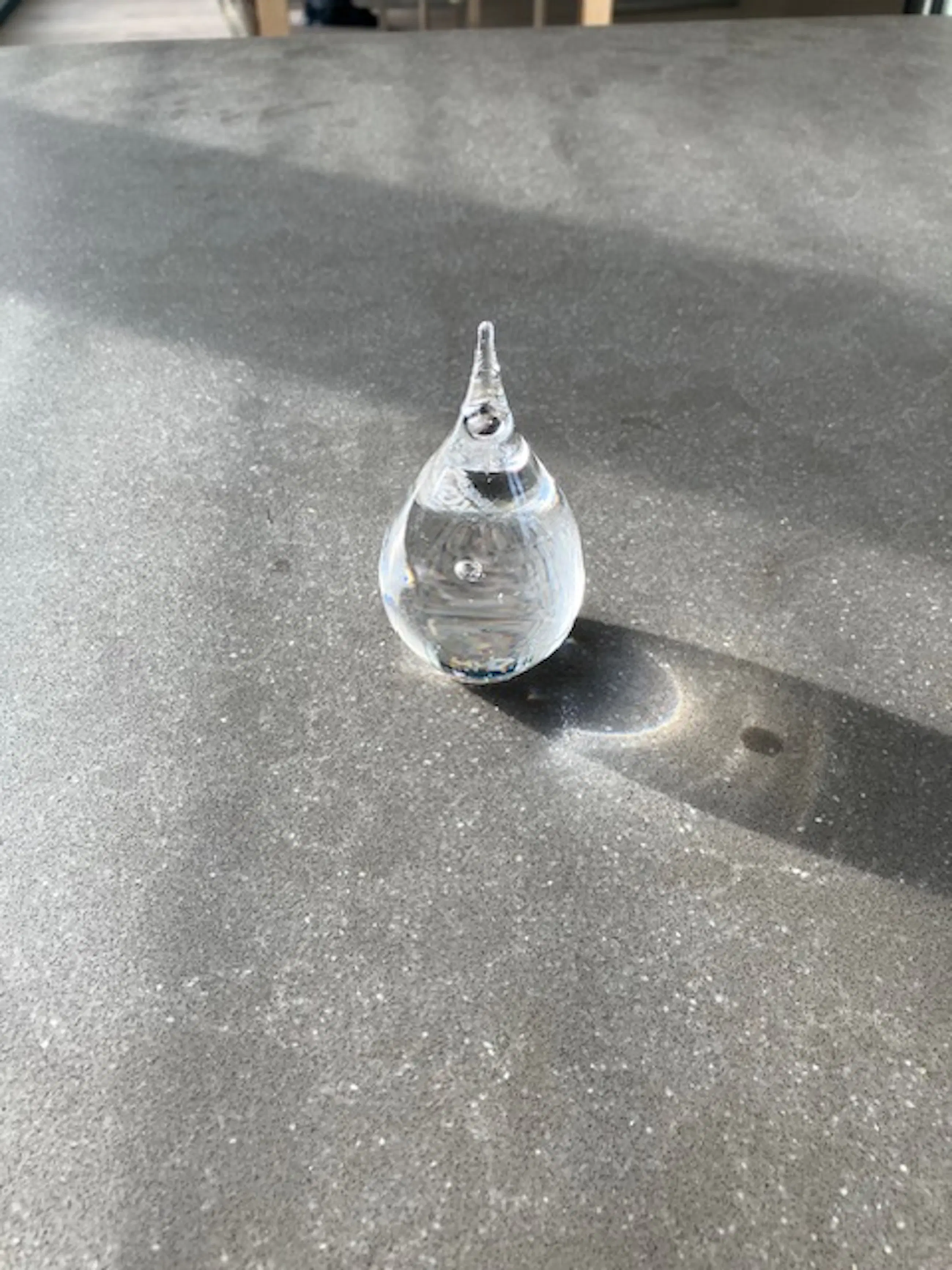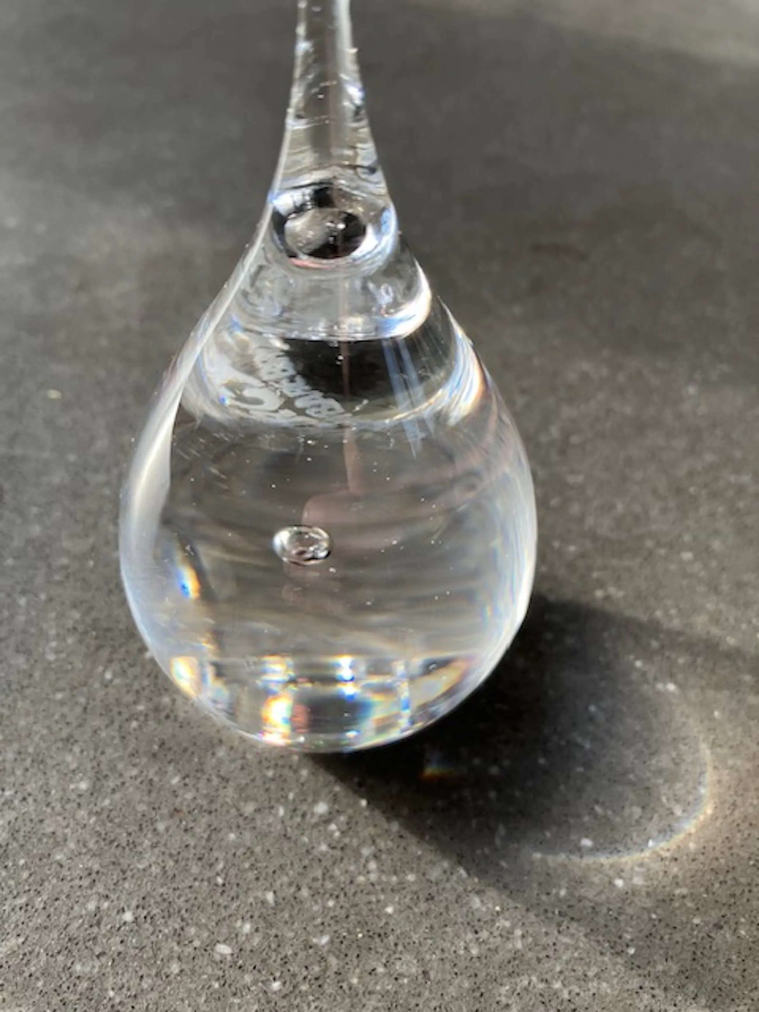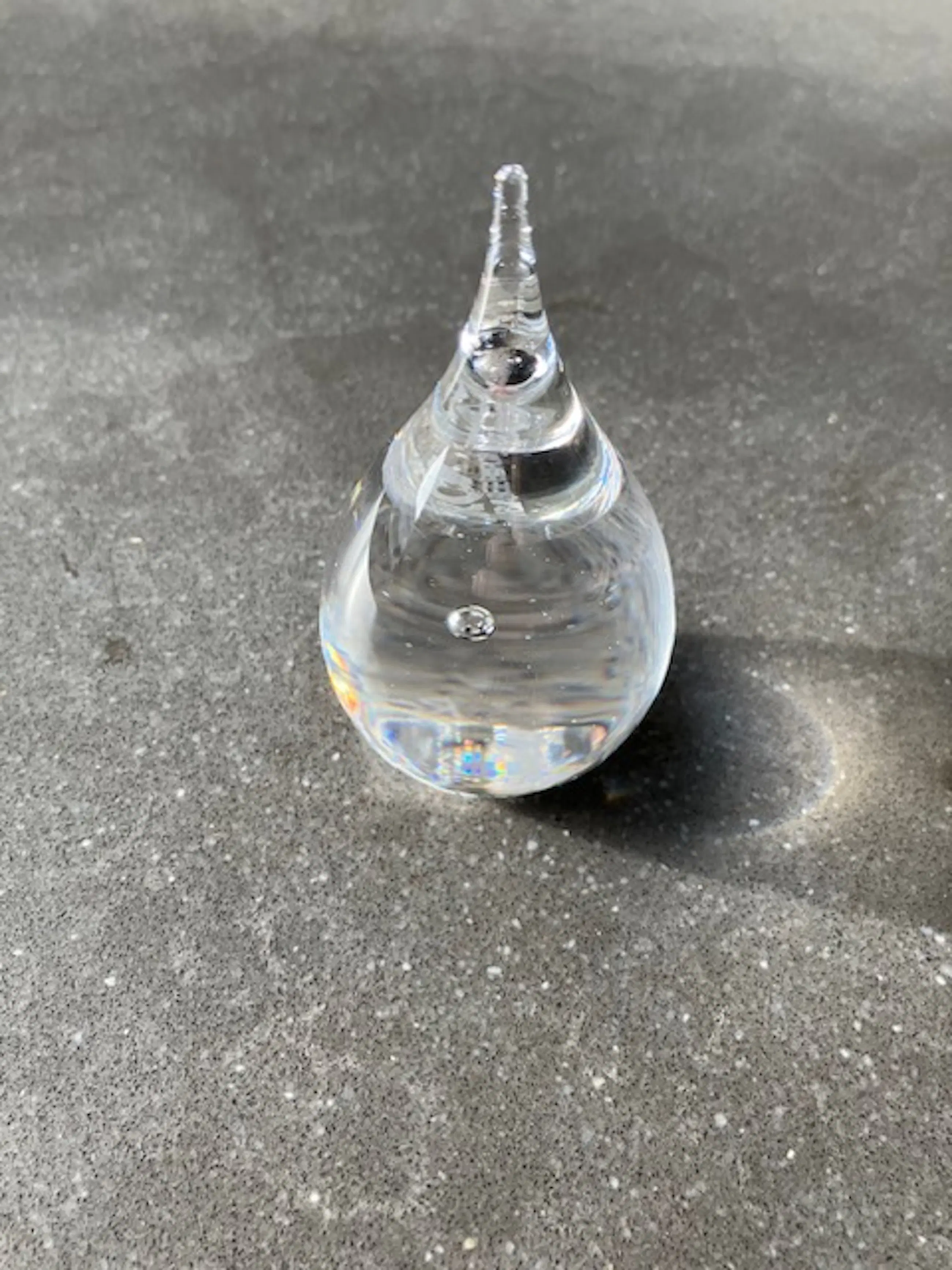 over het item De glasdruppel werd door Sourcy gebruikt als exclusief relatiegeschenk of promotioneel item, meestal rond de introductie van de nieuwe huisstijl en de blauwe designfles die Meydam voor Sourcy ontwierp. Het het ontwerp is heel bewust door Meydam gekozen: het staat symbool voor de puurheid van mineraalwater en Meydam was een meester in het vangen van suggestie van vloeibaarheid in gestold glas. De gravure 'Sourcy uit betrouwbare bron' was jarenlang de slogan van het merk. Dit item is een fraai voorbeeld van een balans tussen enerzijds kunst en anderzijds commercieel gebruik. Aan de zijkant vinden we het merkteken 'Royal Leerdam' en nr. 2481. Destijds een kostbaar relatiegeschenk.
