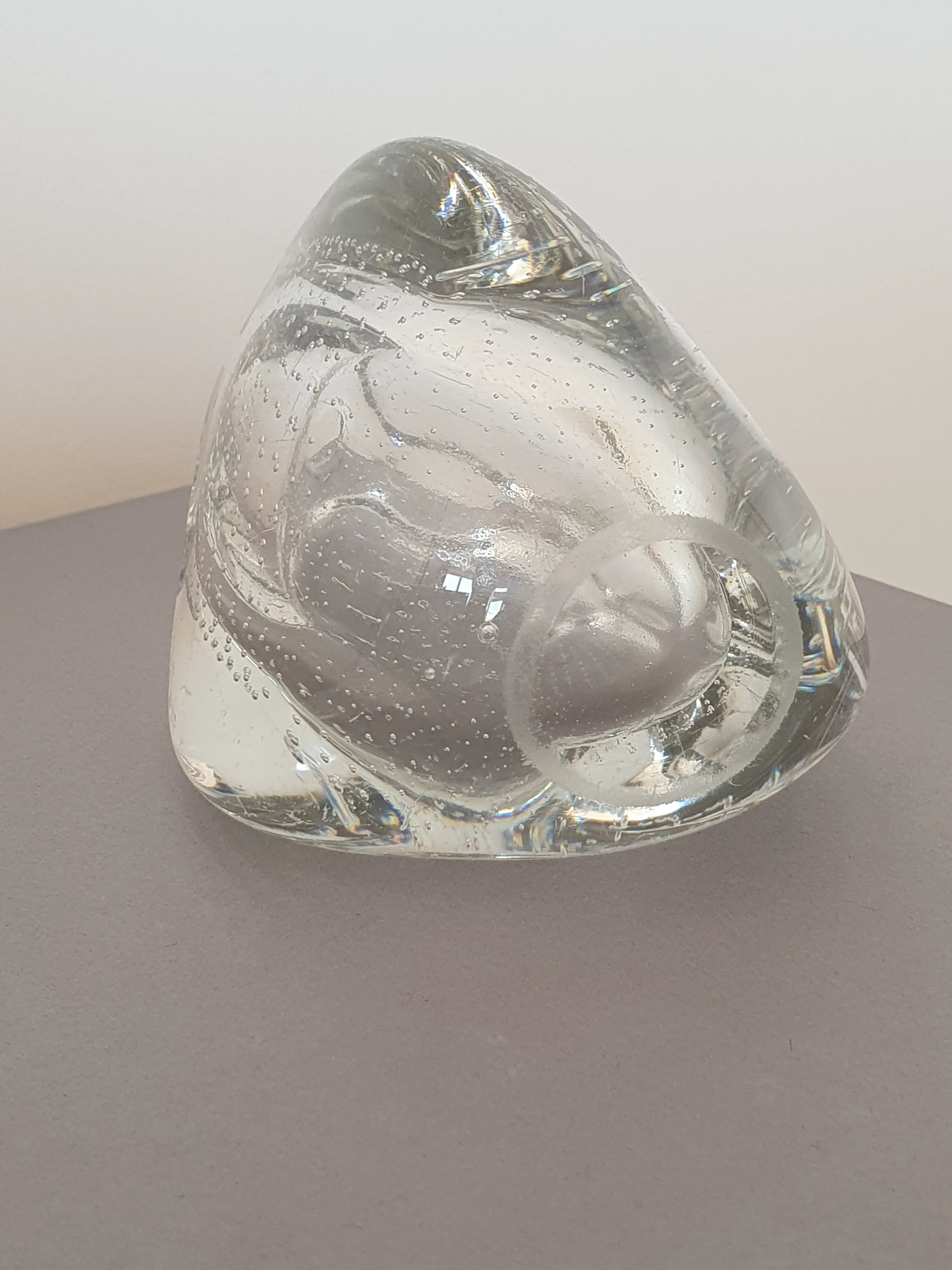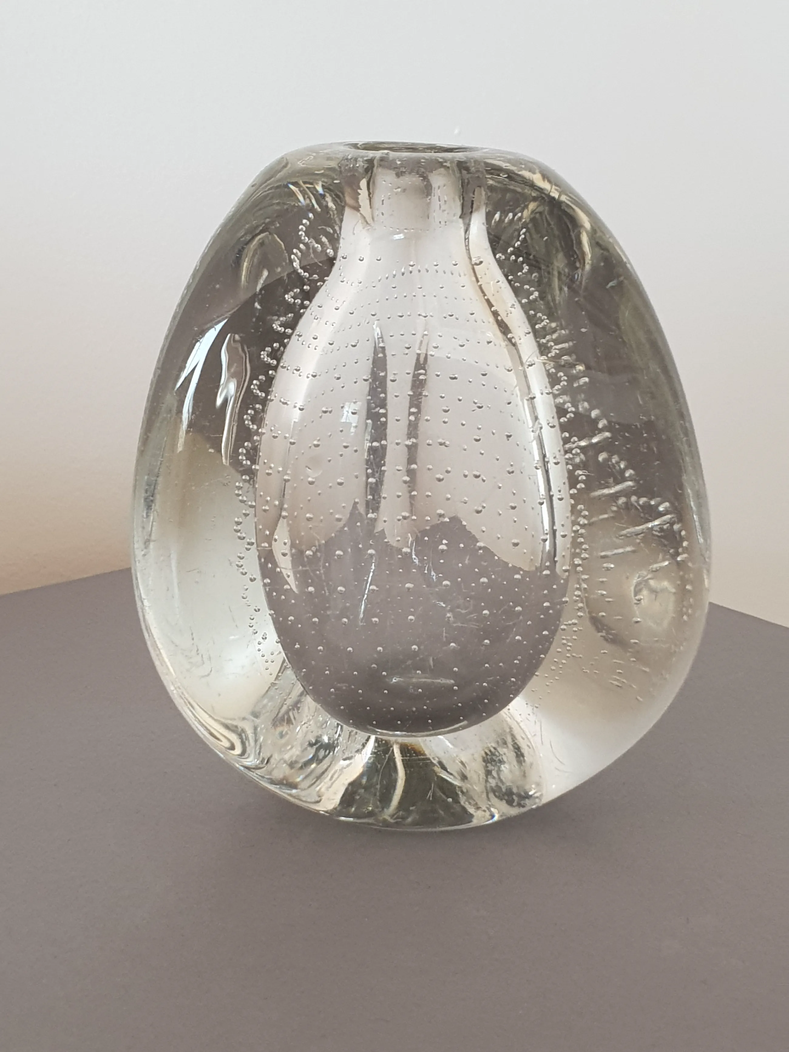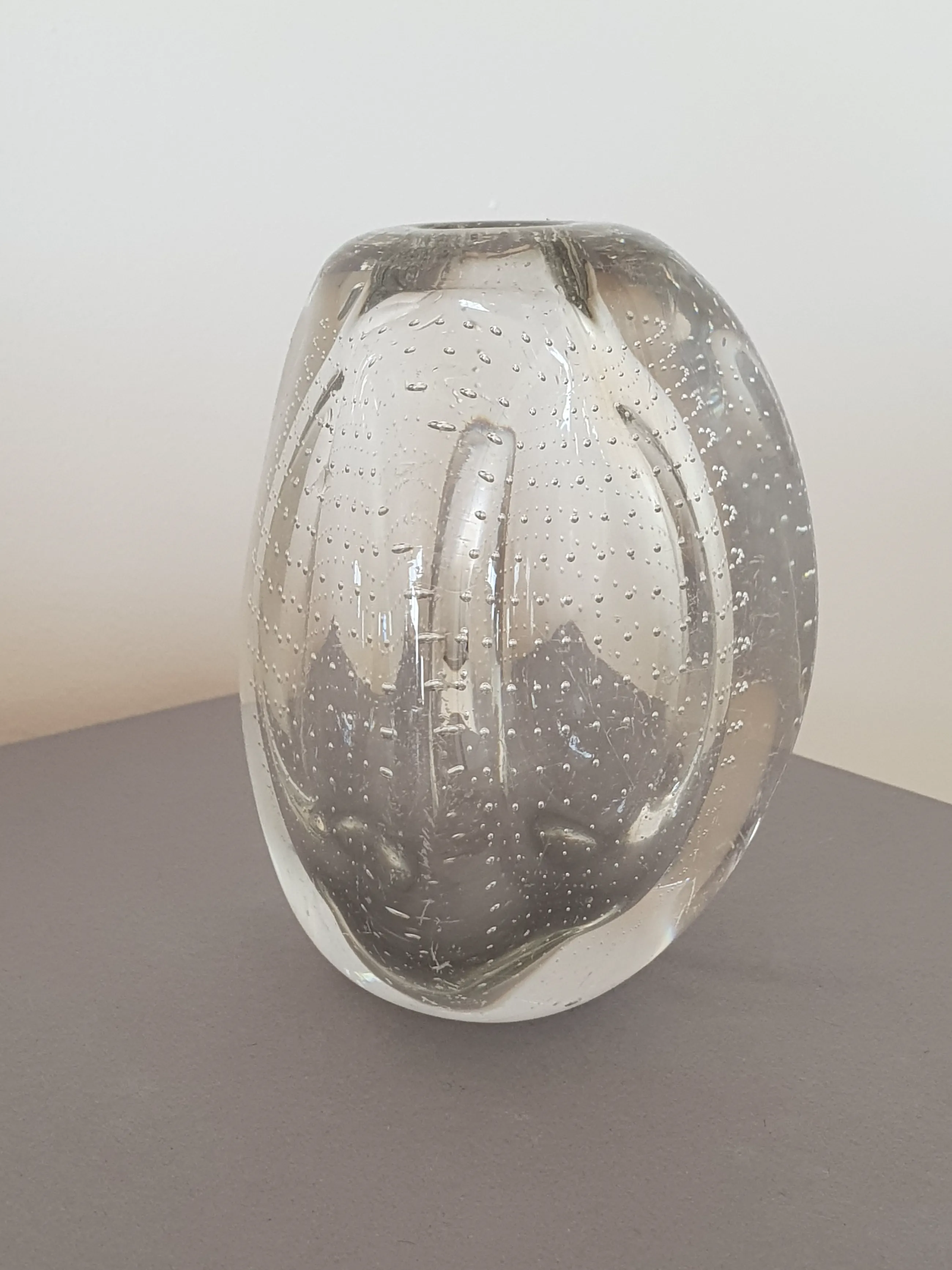 Spijkervaasje van de bekende glas ontwerper Floris Meydam uit Leerdam. Het komt uit de serie spijkervaasjes: glazen vaasjes met een regelmatig patroon van luchtbelletjes. Zeer kenmerkend voor vintage glaswerk uit de jaren 50.