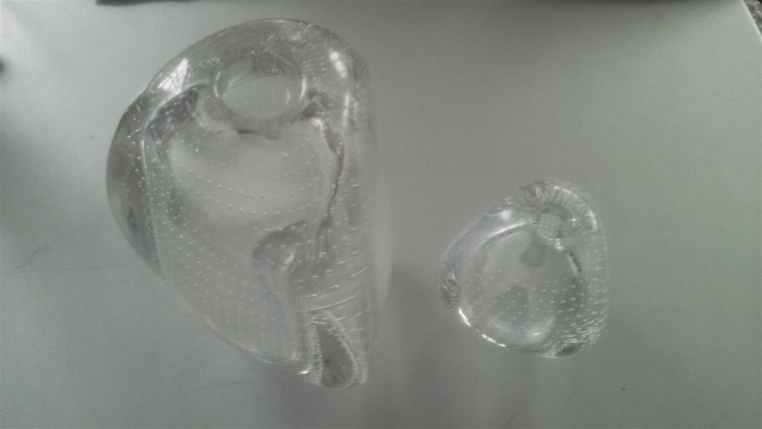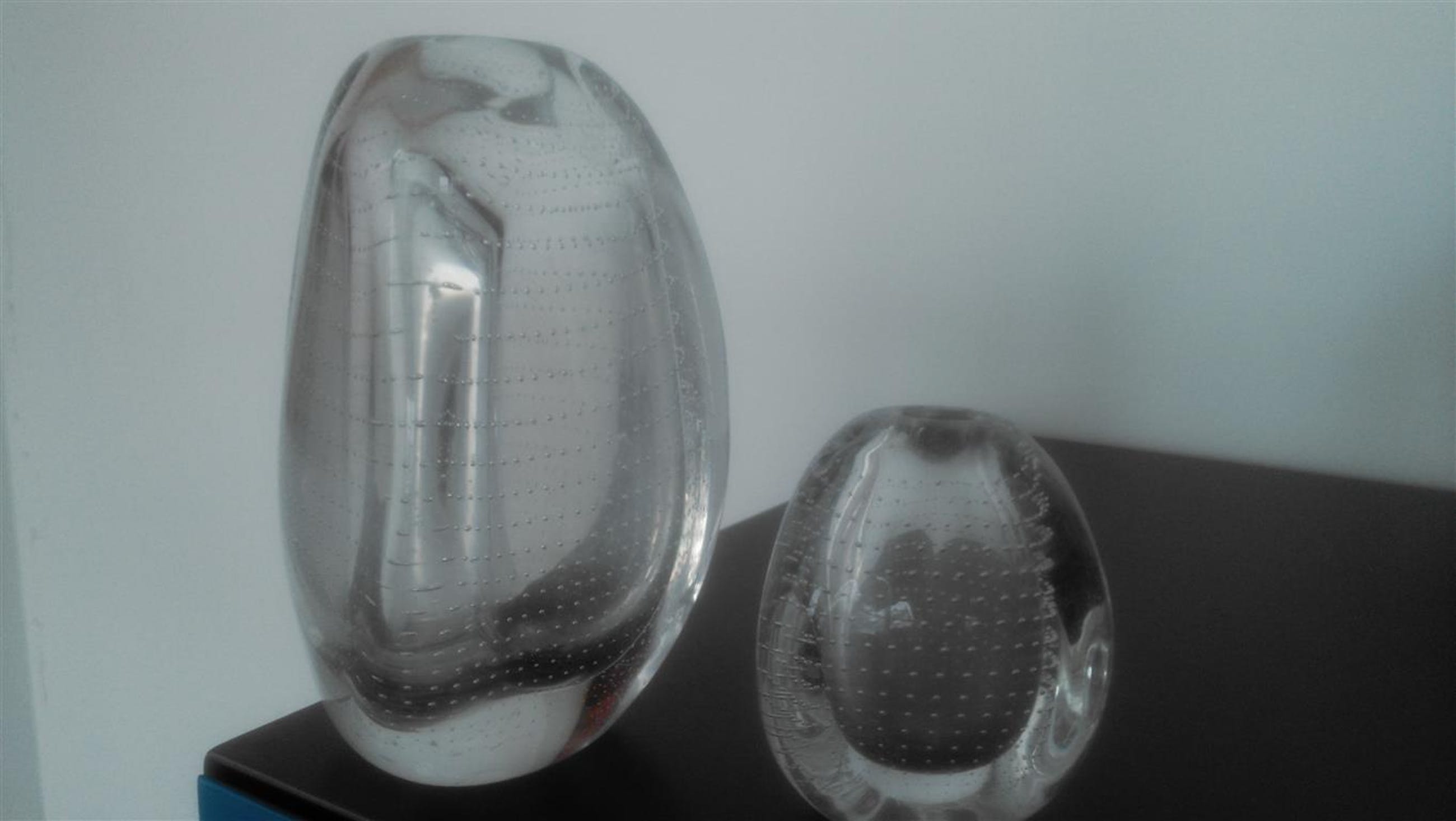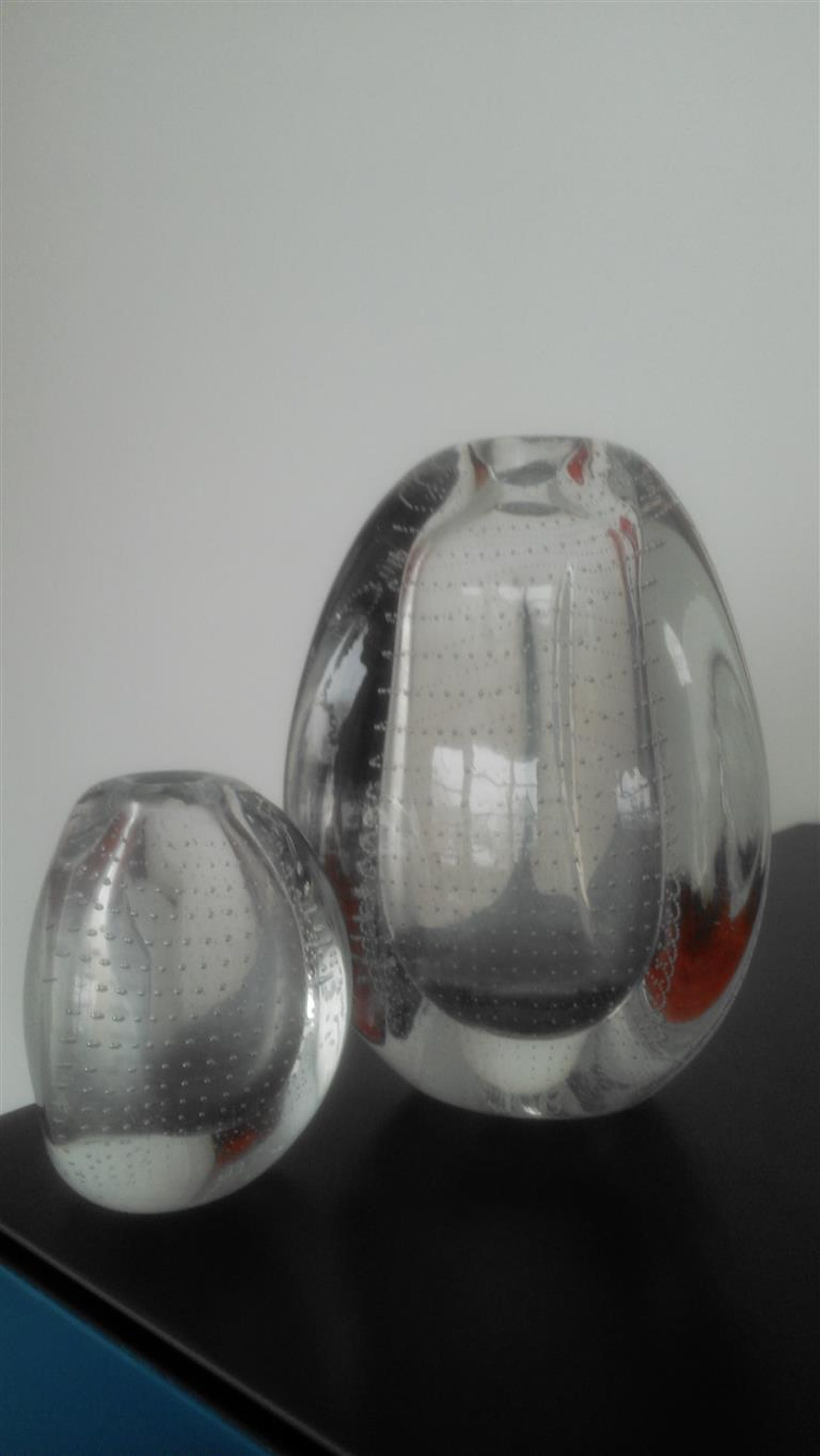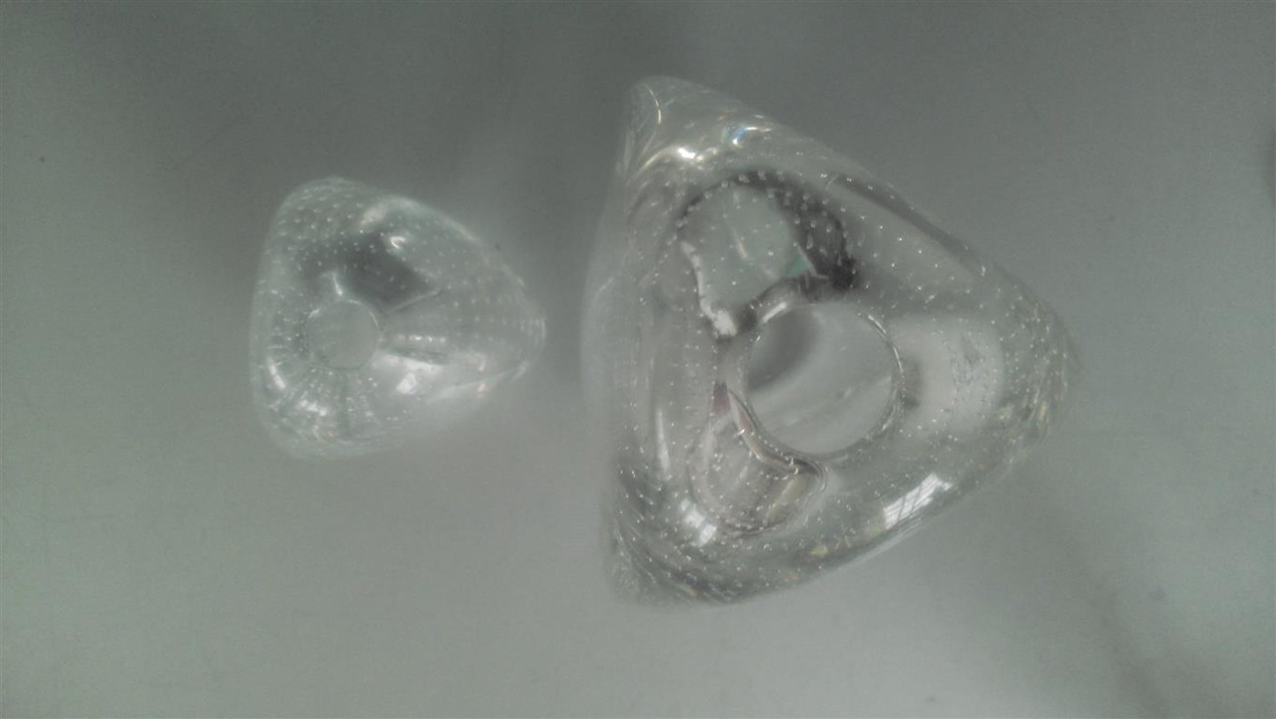 Driehoekig vaasje van spijkerglas, ook wel bekend als 'beukenootjes' van Floris Meydam voor Leerdam. Afmetingen Grote 15,5 cm hoog 1585 gram Kleine 8 cm hoog 440 gram