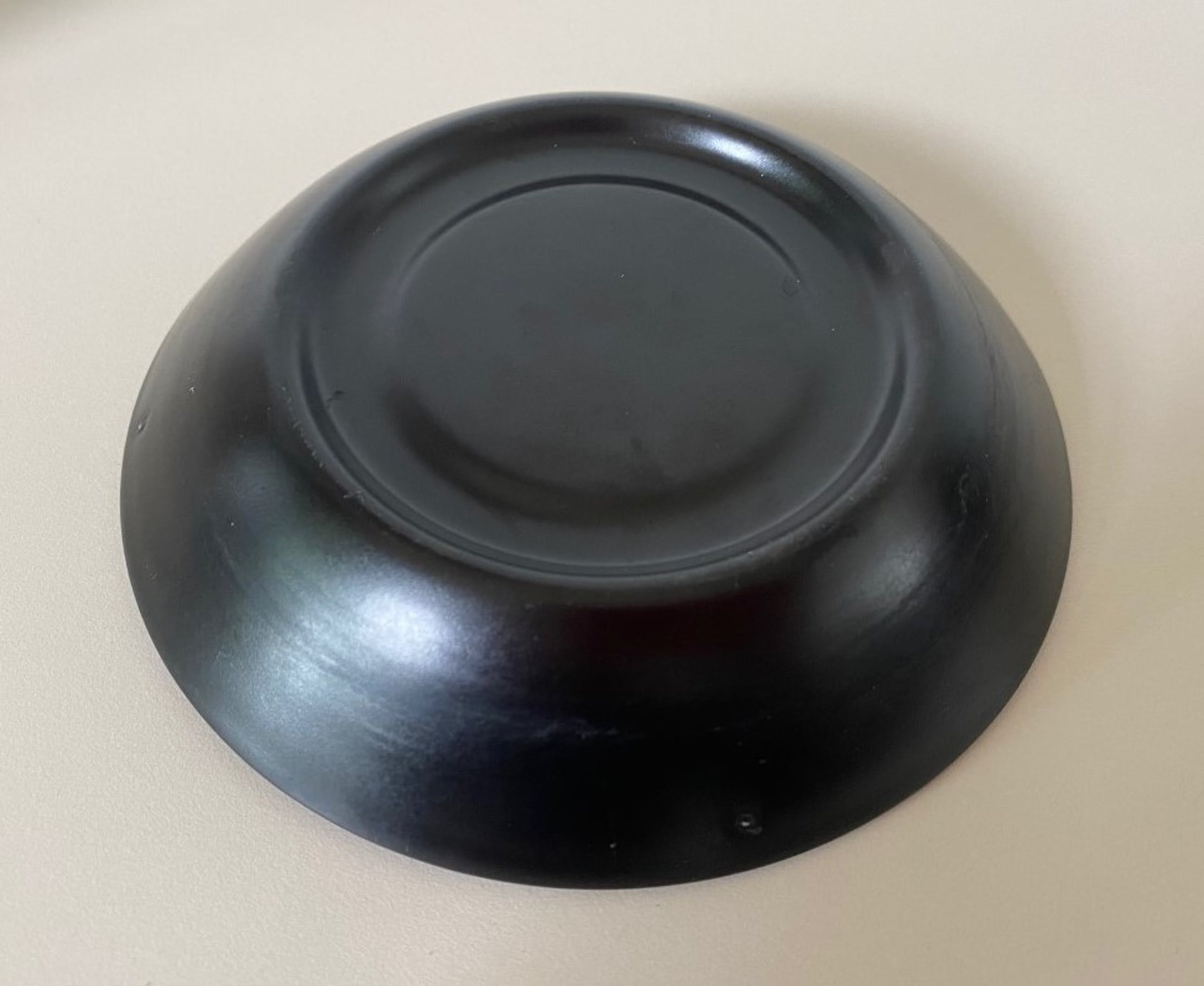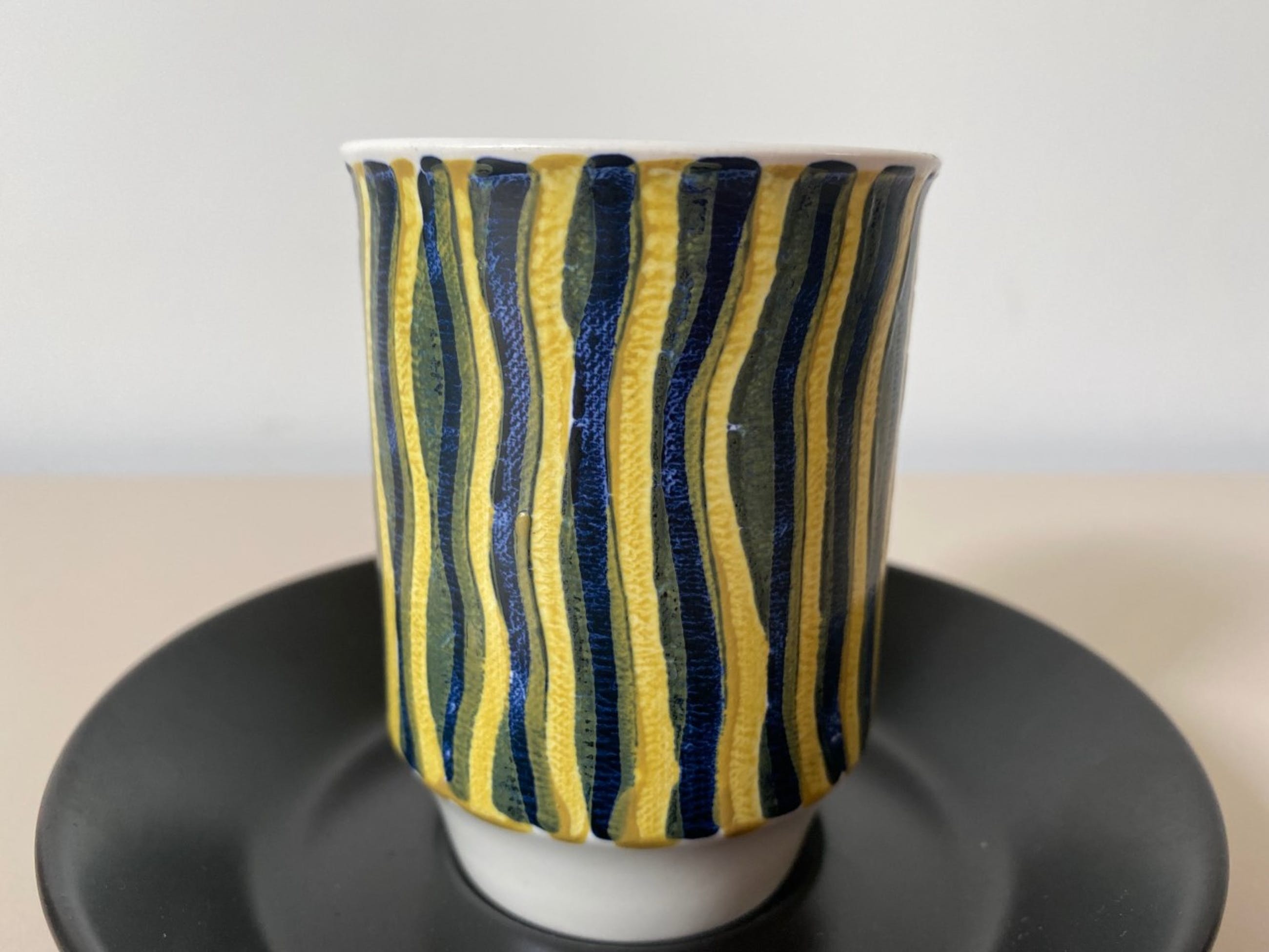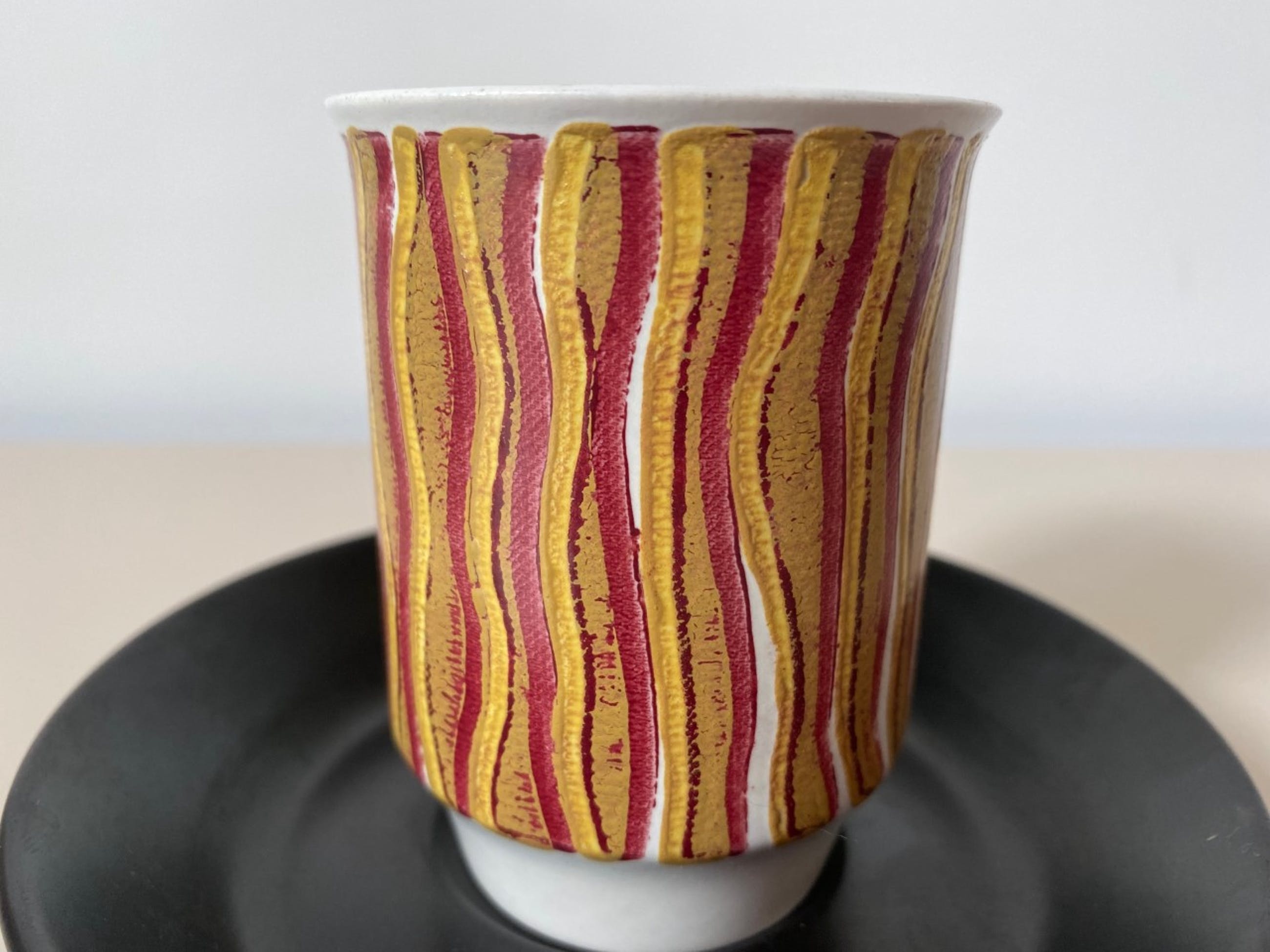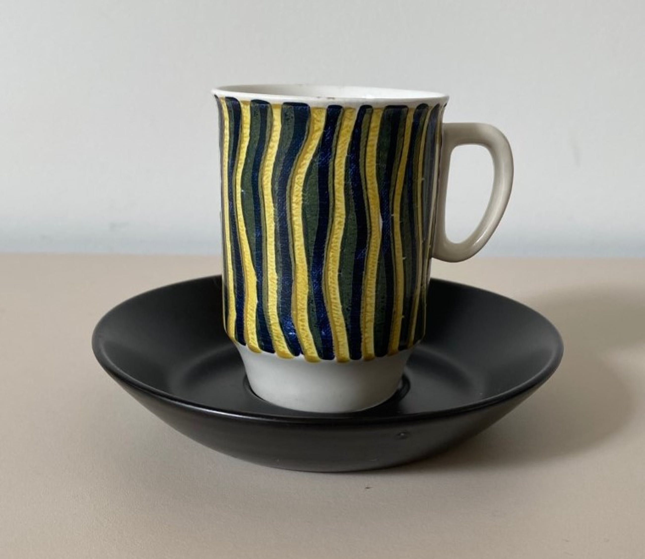 Twee hand beschilderde platelen kop - en schotels uitvoering Kunstaardewerkfabriek Regina uit Gouda, het ontwerp is van Floris Meydam. De kopjes hebben een handbeschilderde lineaire decoratie in rood- geel en blauw- geel. De schotels zijn mat zwart. Alles in onbeschadigde conditie , de kopjes zijn gemerkt aan de onderzijde.