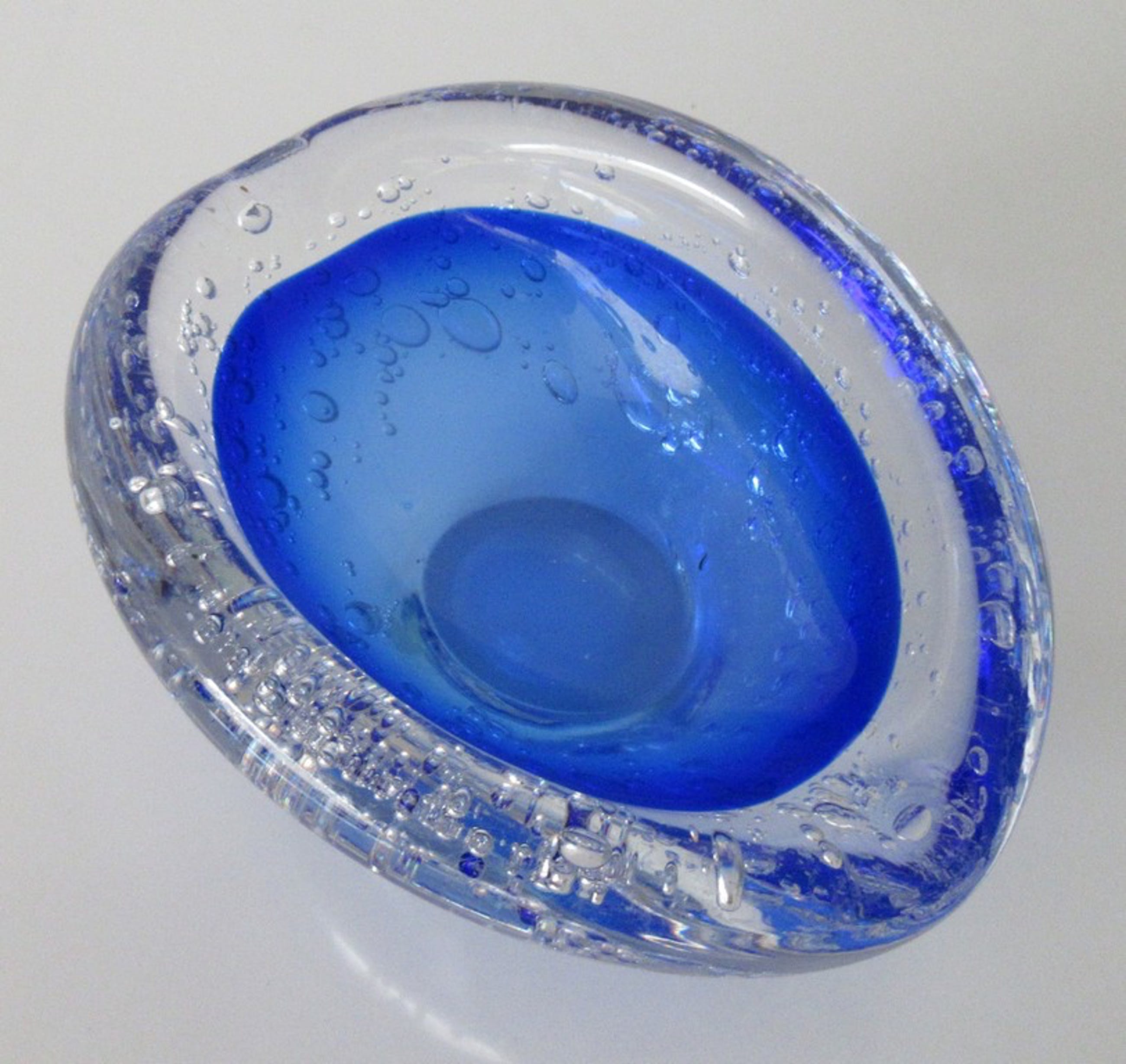 Mooie blanke en blauwe glazen serica asbak voorzien van luchtbellen van Floris Meydam uit 1958. Het stuk is in goede gebruikte conditie, klein flintertje op de bovenzijde en onderzijde en gebruikskrasjes op de zijkant en onderzijde. Voorzien van pontilmerk, verder niet gemerkt.