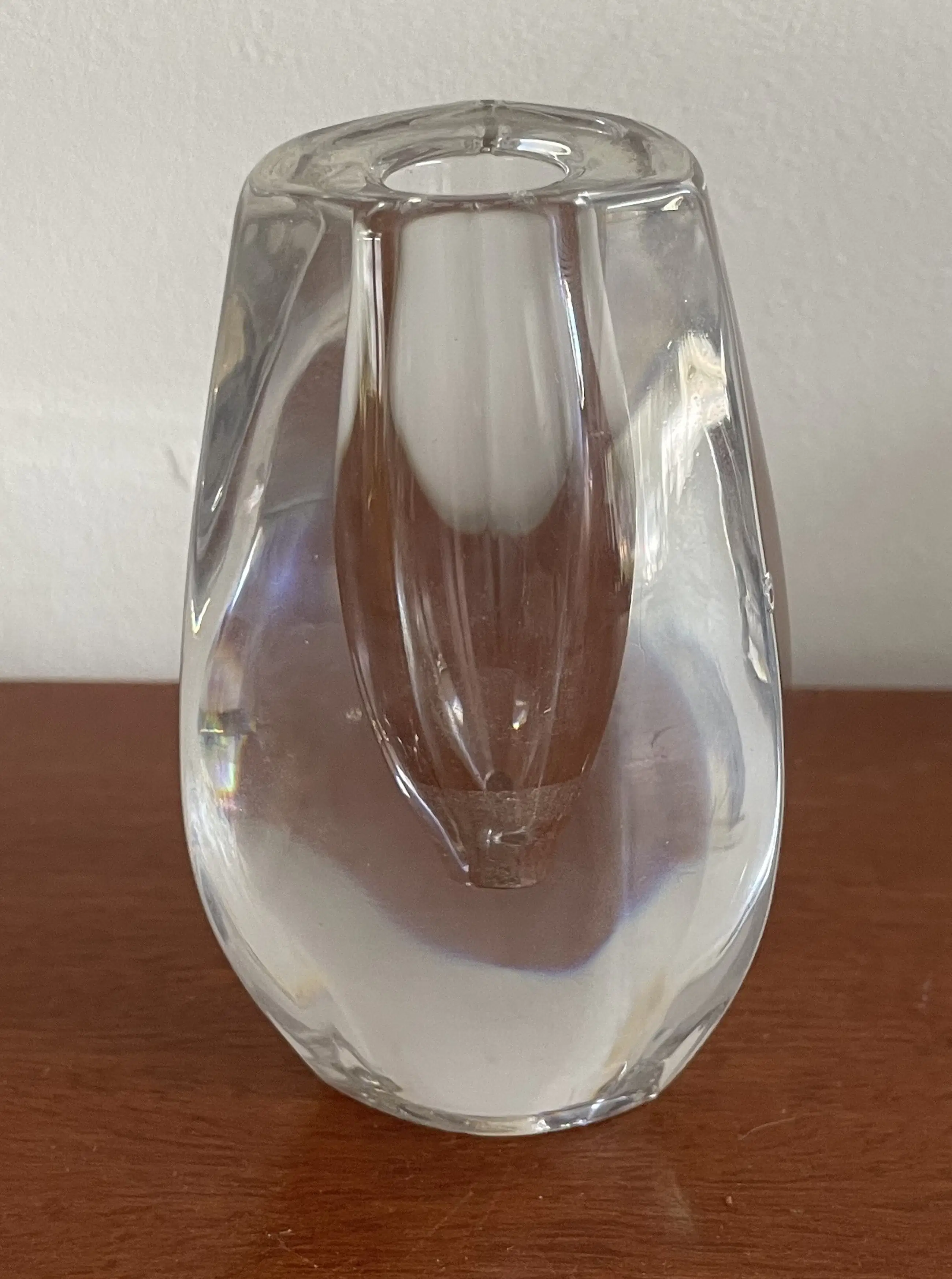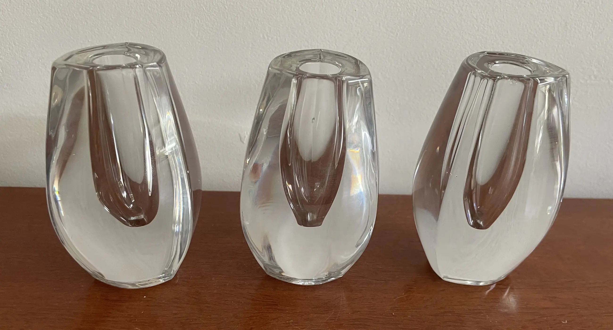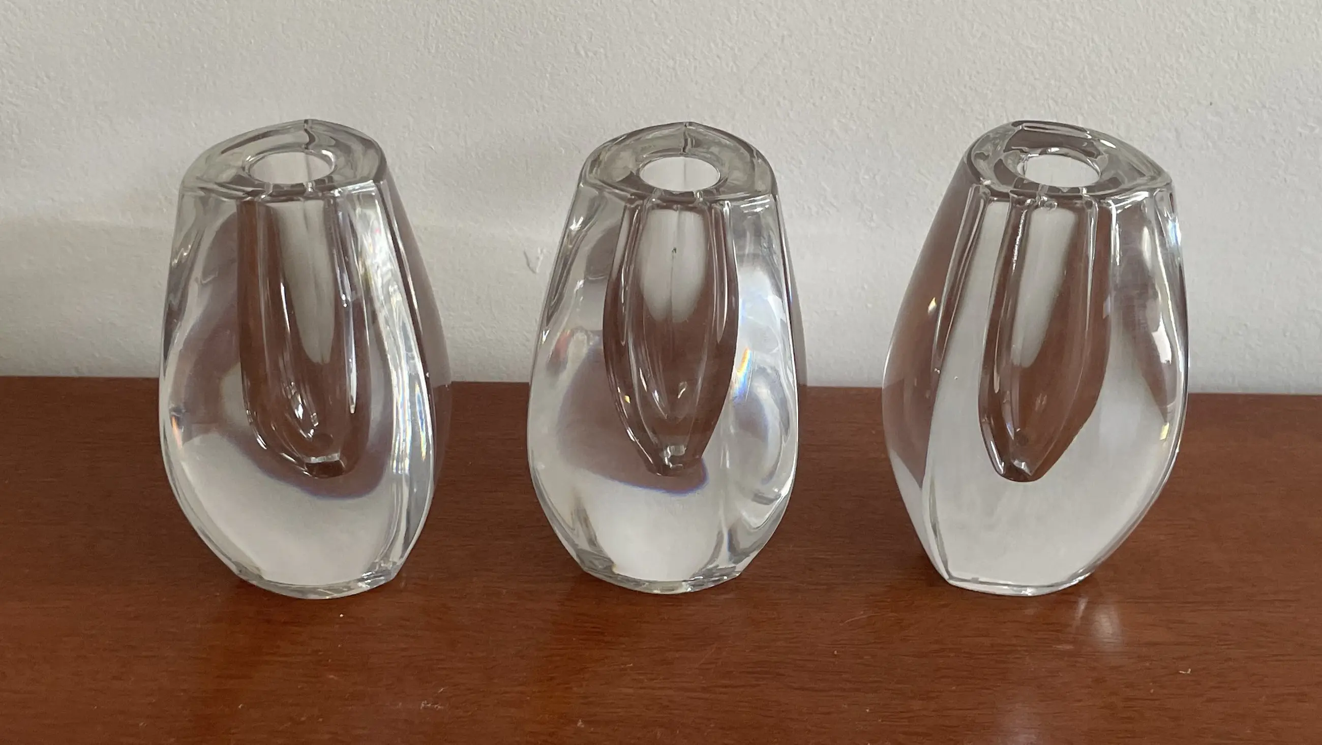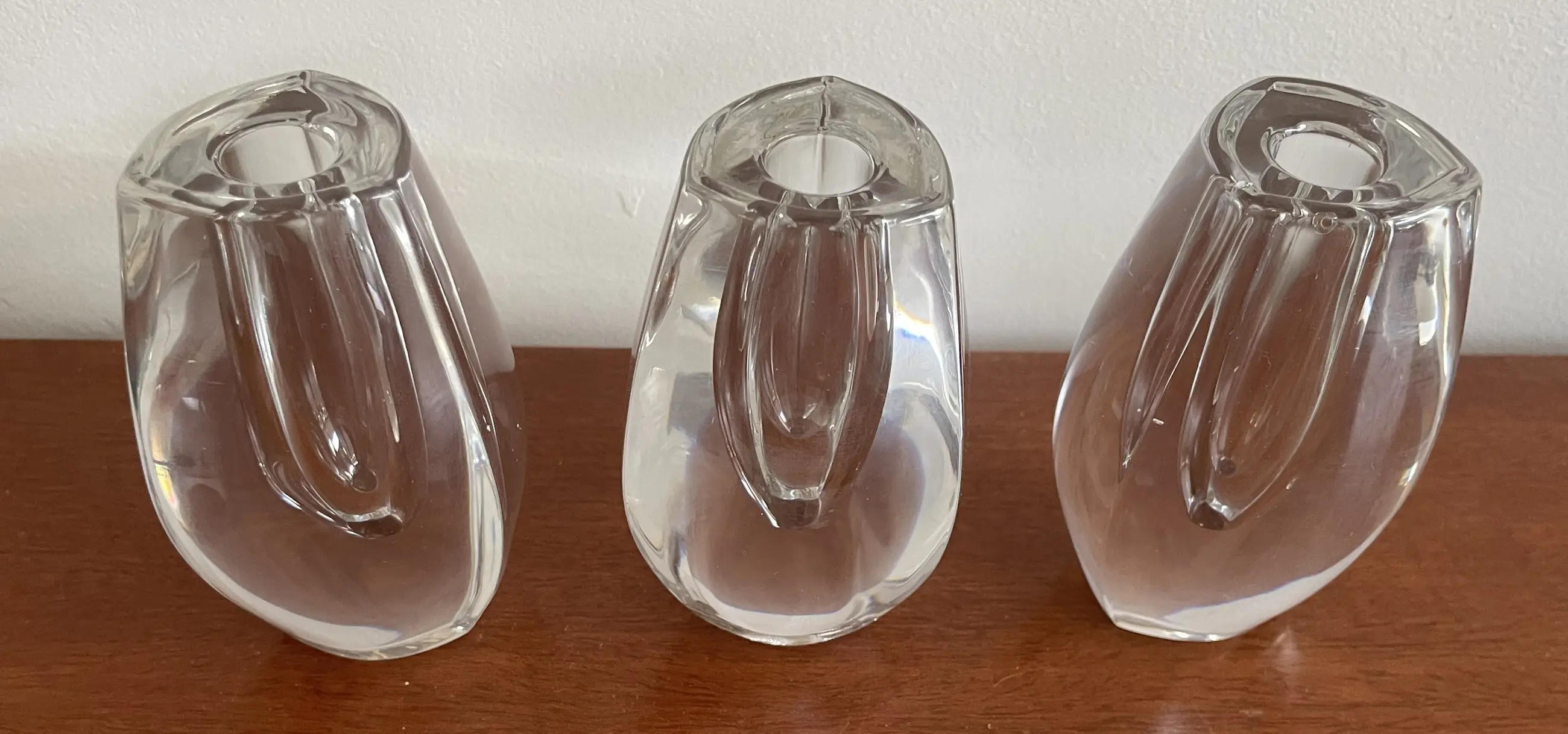 Drie design kristallen kandelaren van FM Marcolin, Oostenrijk deze glasfabriek was voorheen Zweeds. Twee kandelaren hebben een stootpuntje. Voorzien van een etsmerk FM - 89 en een sticker 'Made in Austria' aan de onderzijde.