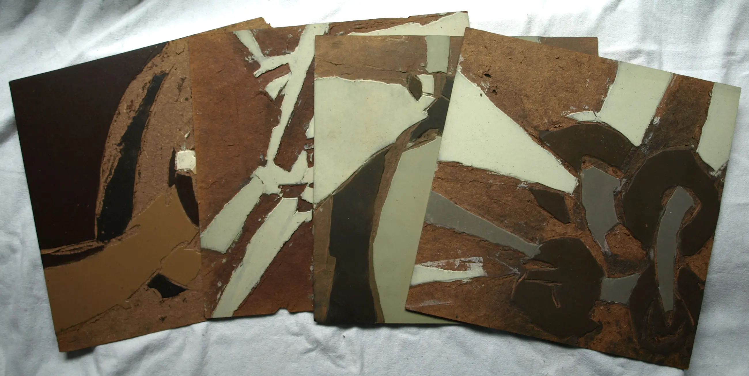 4 Hardboard platen (55 x 55 cm), gebruikt als drukplaten / blokken door de Nederlandse kunstenaar Fon Klement (1930-2000). *Werkwijze: Fon Klement maakte een ontwerptekening op een hardboardplaat en bewerkte de hardboardplaat met een houtsnijguts. De hogere delen van de plaat werden voorzien van verf, waarna de plaat door de drukpers ging en de verf werd afgedrukt op een vel papier. Meestal gebruikte de kunstenaar 3 verschillende drukplaten voor 3 drukgangen in verschillende kleuren. -Afmetingen van elke hardboard-plaat: 55 x 55 cm. -Herkomst: Uit de nalatenschap / inboedel van Fon Klement. -Conditie: In goede staat met gebruikssporen. Zie ook de foto’s voor een eigen indruk.