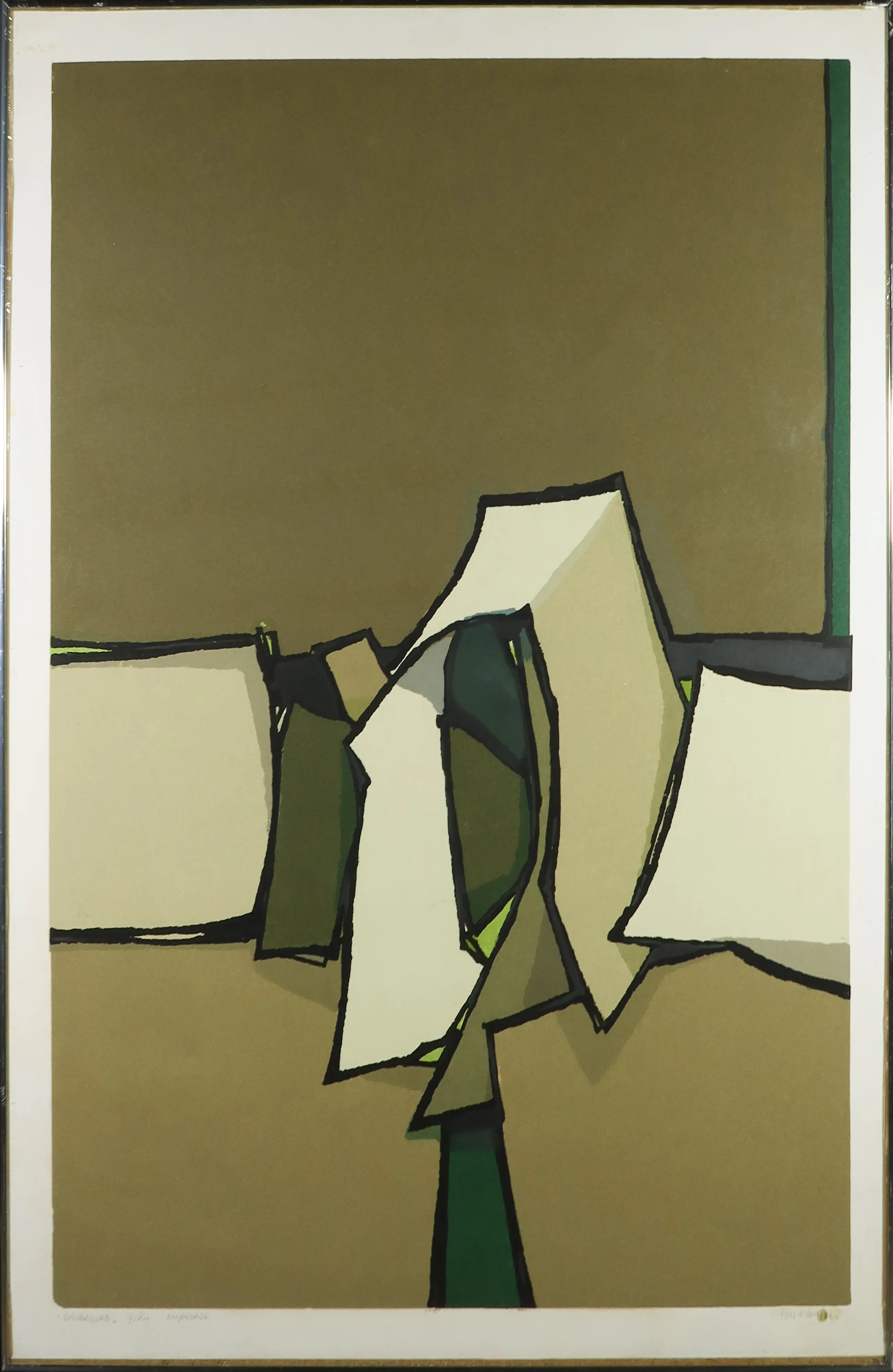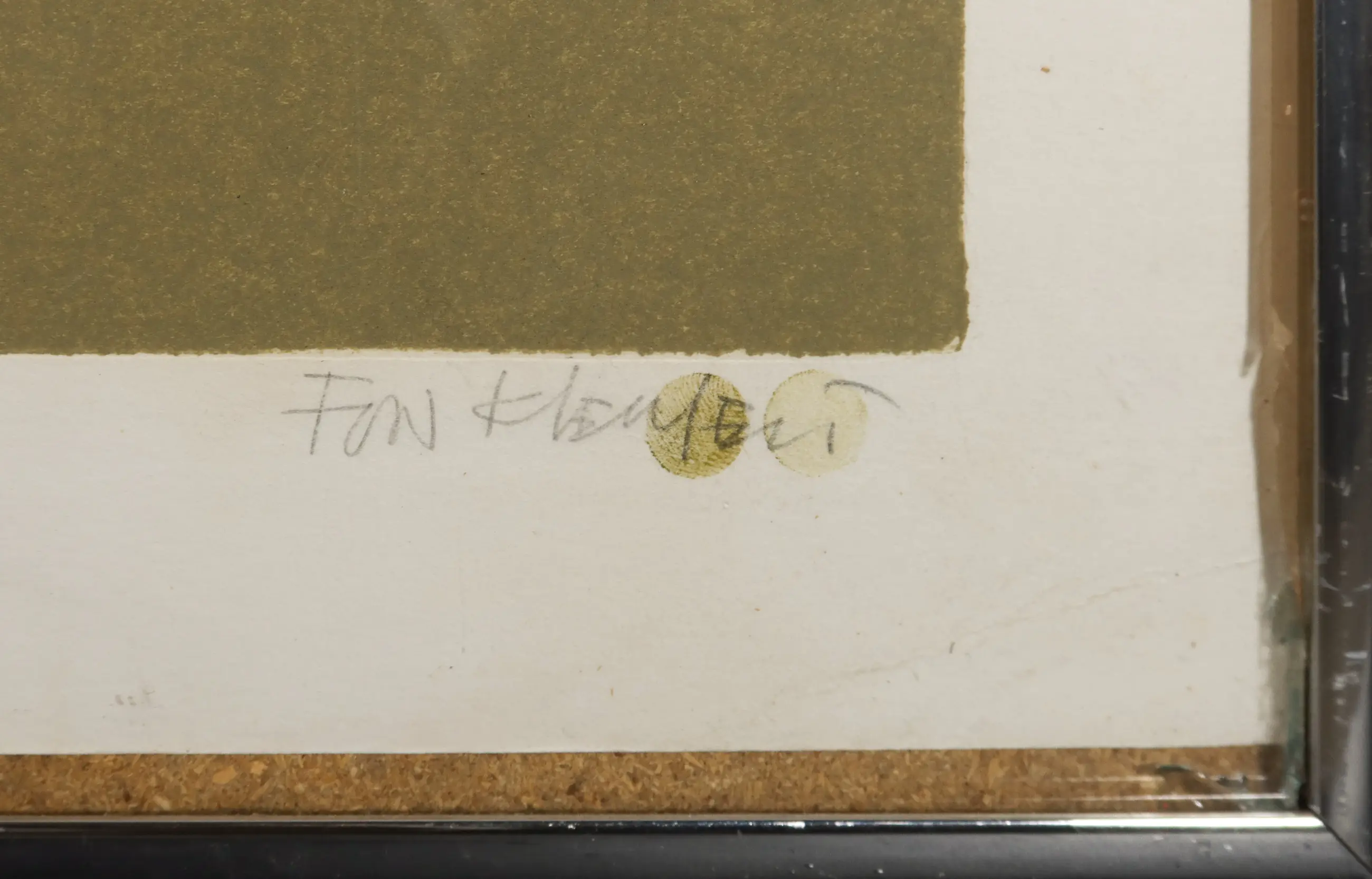 | Wat zeer minimale krasjes zichtbaar op de voorstelling. Daarnaast wat foxing vlekjes te zien op het witte raster en er bevind zich een zwart haartje achter de glasplaat. Het werk zit wat scheef in de lijst. | |