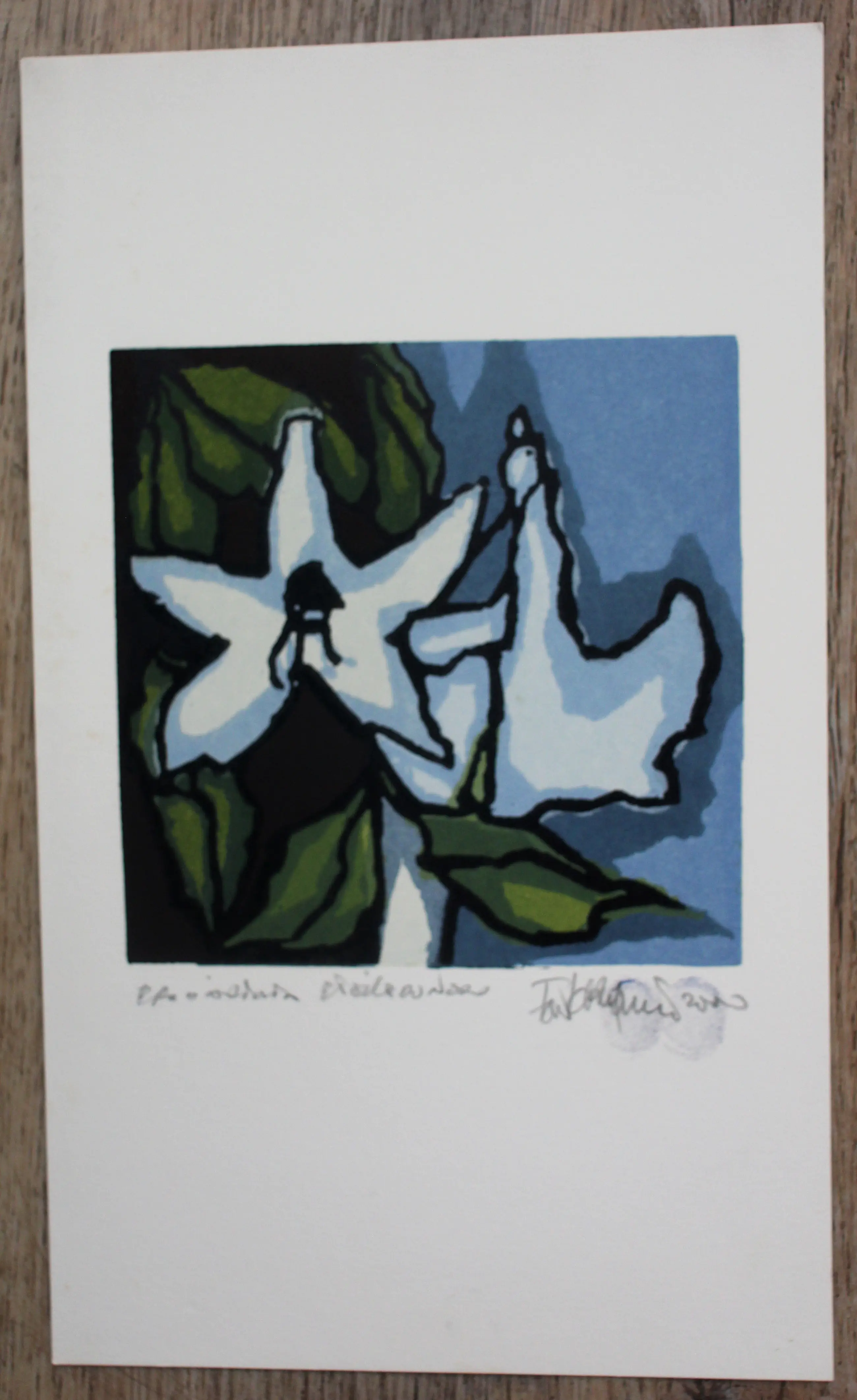 Boardsnede van Fon Klement op papier. Titel: Etoile du Nord. Jaar: 2000. Afmetingen blad: H32 x b19cm. Afmetingen voorstelling: H15 x b15cm. Het werk is onderaan met potlood gesigneerd en getiteld. De authenticiteit van het aangeboden werk wordt volledig gegarandeerd. Een certificaat van echtheid kan, op aanvraag, worden gemaild.