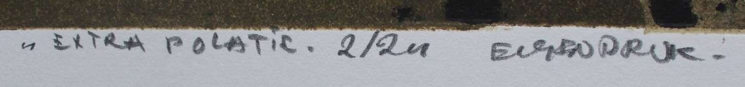 Karakteristiek werk van Fon Klement op zeer dik geschept papier. Titel: extra polatic. Jaar: 1971. Nummer: 2/24. Afmetingen blad incl passepartout: H79 x b61cm. Afmetingen voorstelling: H50 x b50cm. Met potlood gesigneerd en getiteld. De authenticiteit van het aangeboden werk wordt volledig gegarandeerd. Een certificaat van echtheid kan, op aanvraag, worden gemaild.