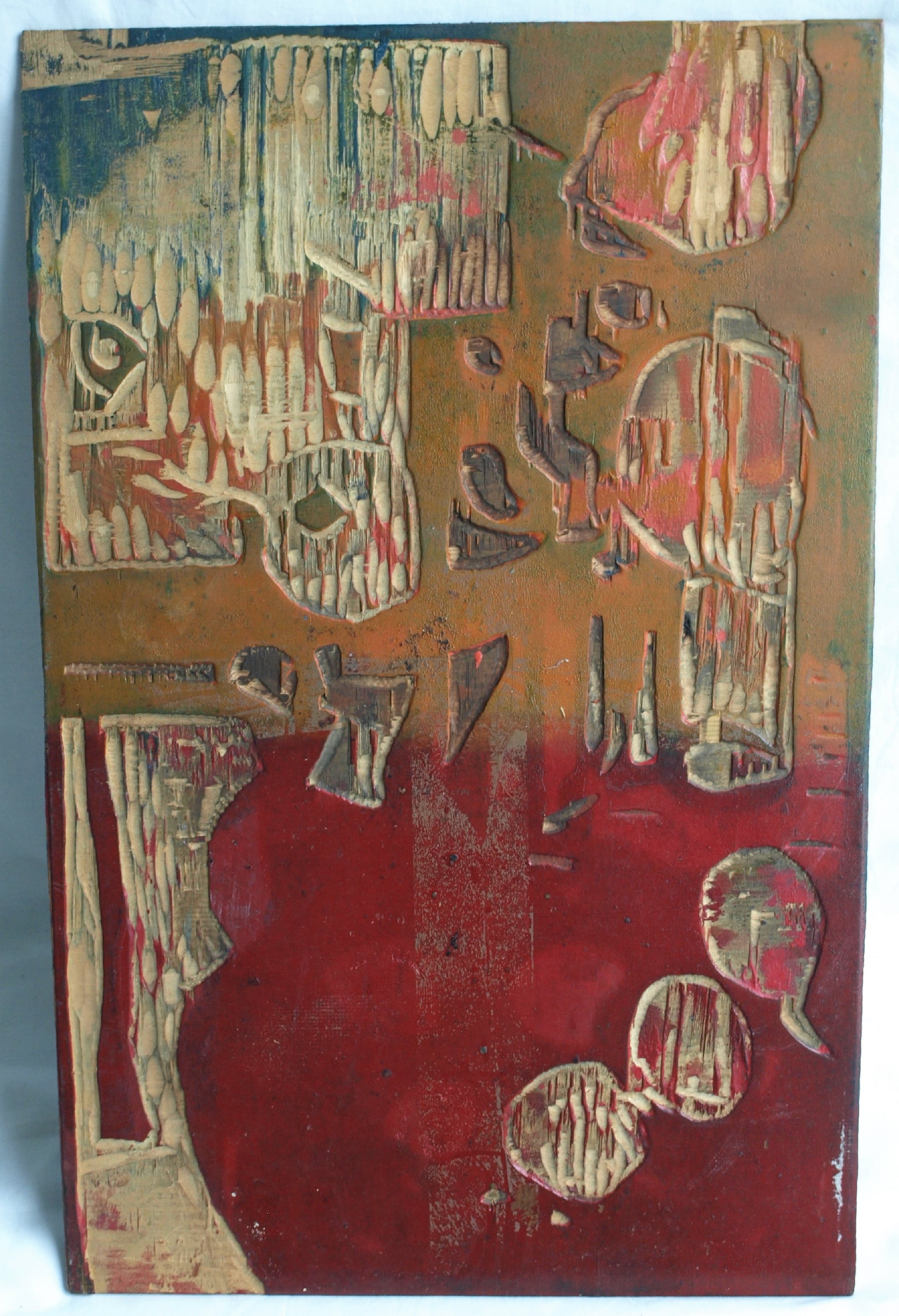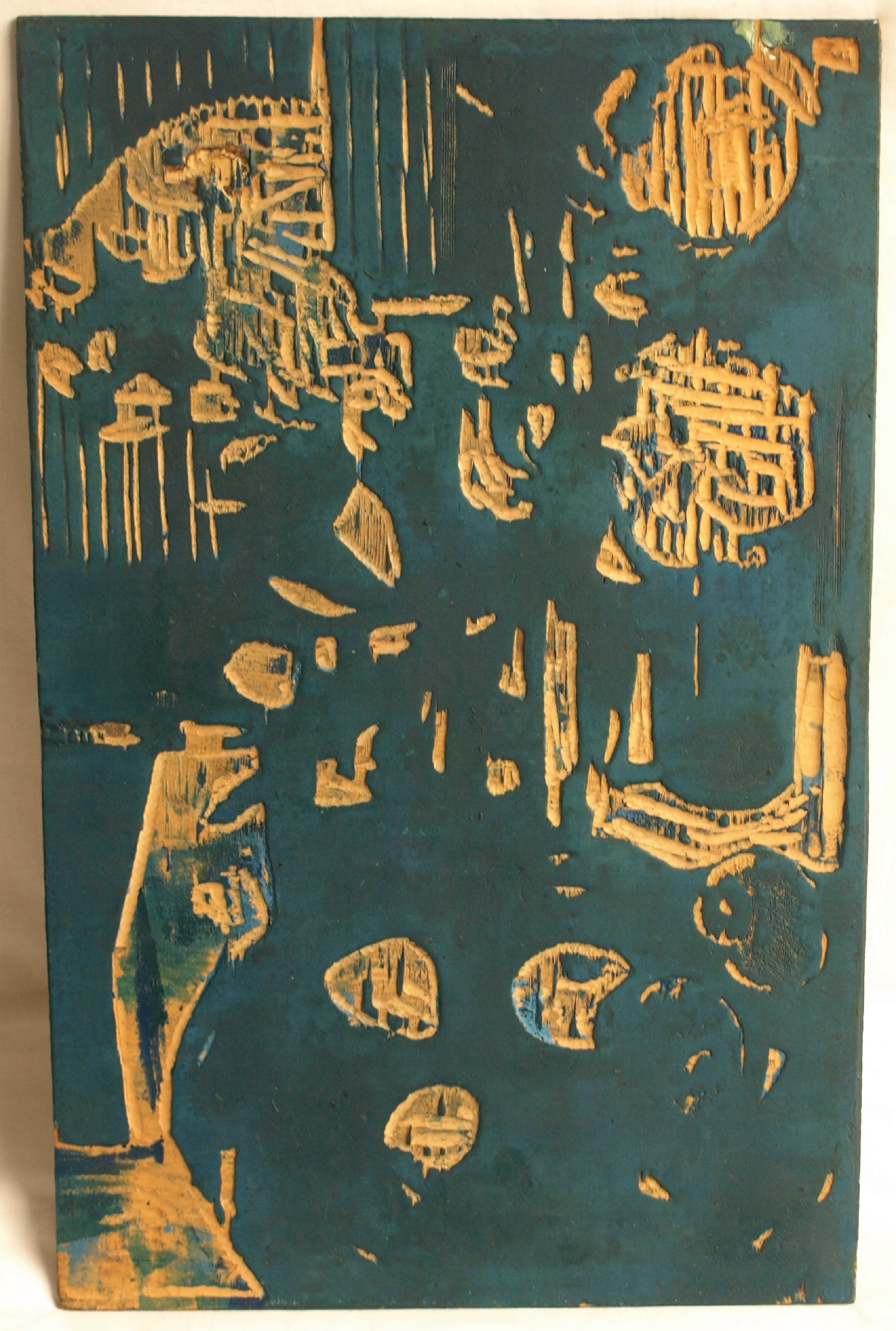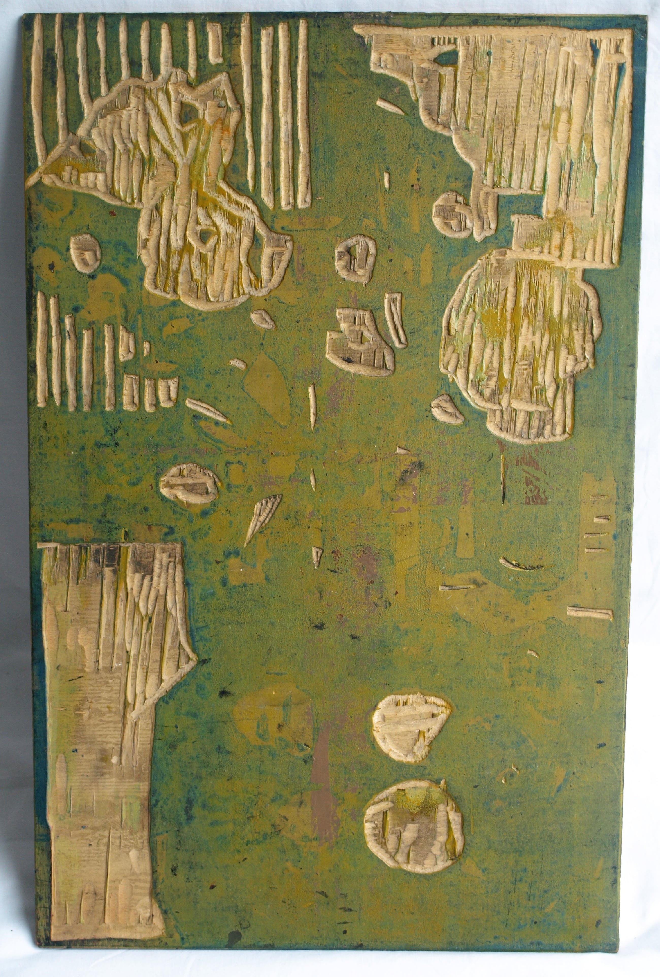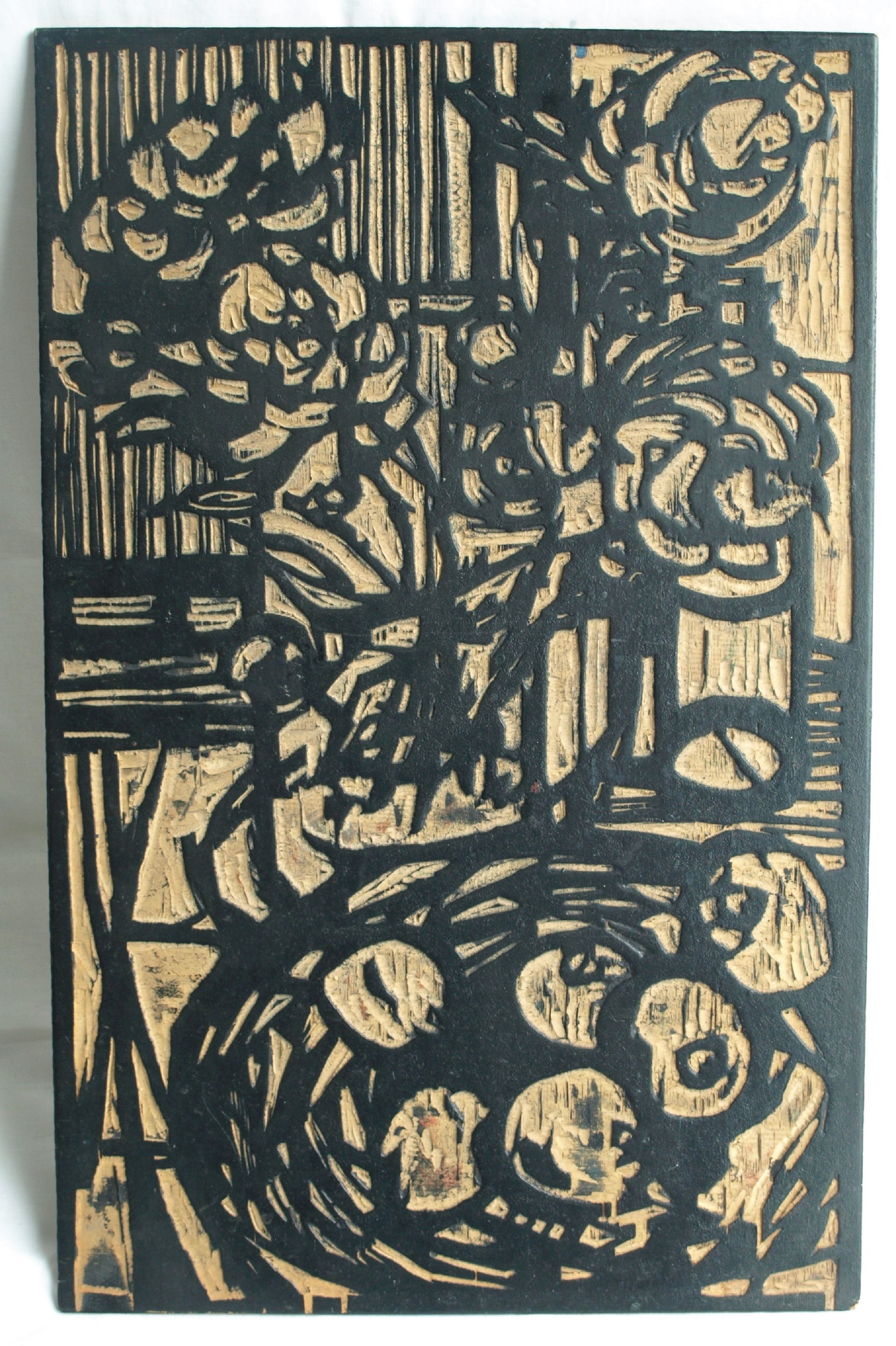 Dit kavel bestaat uit de 2 dubbelzijdige houten drukblokken van de houtsnede ‘Pioenrozen en appels’ van de Nederlandse kunstenaar Fon Klement (1930-2000). De 2 houten panelen zijn elk aan beide kanten door Fon Klement ‘gesneden’. Het ene paneel heeft dus een zwarte en een groene zijde en het andere paneel heeft een rode en een blauwe kant. Zo werd de houtsnede afgedrukt in 4 drukgangen. Op de houten panelen zit nog de oorspronkelijke drukinkt. Op de laatste foto ziet u de uiteindelijke afdruk van dit stilleven. De afbeelding op de blokken is het spiegelbeeld van de afdruk. De houtsnede is destijds afgedrukt in een oplage van 24 exemplaren. Het is mij onbekend uit welk jaar de houtsnede is, maar waarschijnlijk is dit uit de jaren ’60 van de vorige eeuw. -Afmetingen van beide houten panelen: 55½ x 35½ cm. -Herkomst: Uit de nalatenschap / inboedel van Fon Klement. -Conditie: In goede staat met ouderdoms- en gebruikssporen. Zie ook de foto’s voor een eigen indruk. N.B. : Dit kavel bestaat uit de 2 houten panelen. De afdruk van de houtsnede zit niet bij dit kavel!