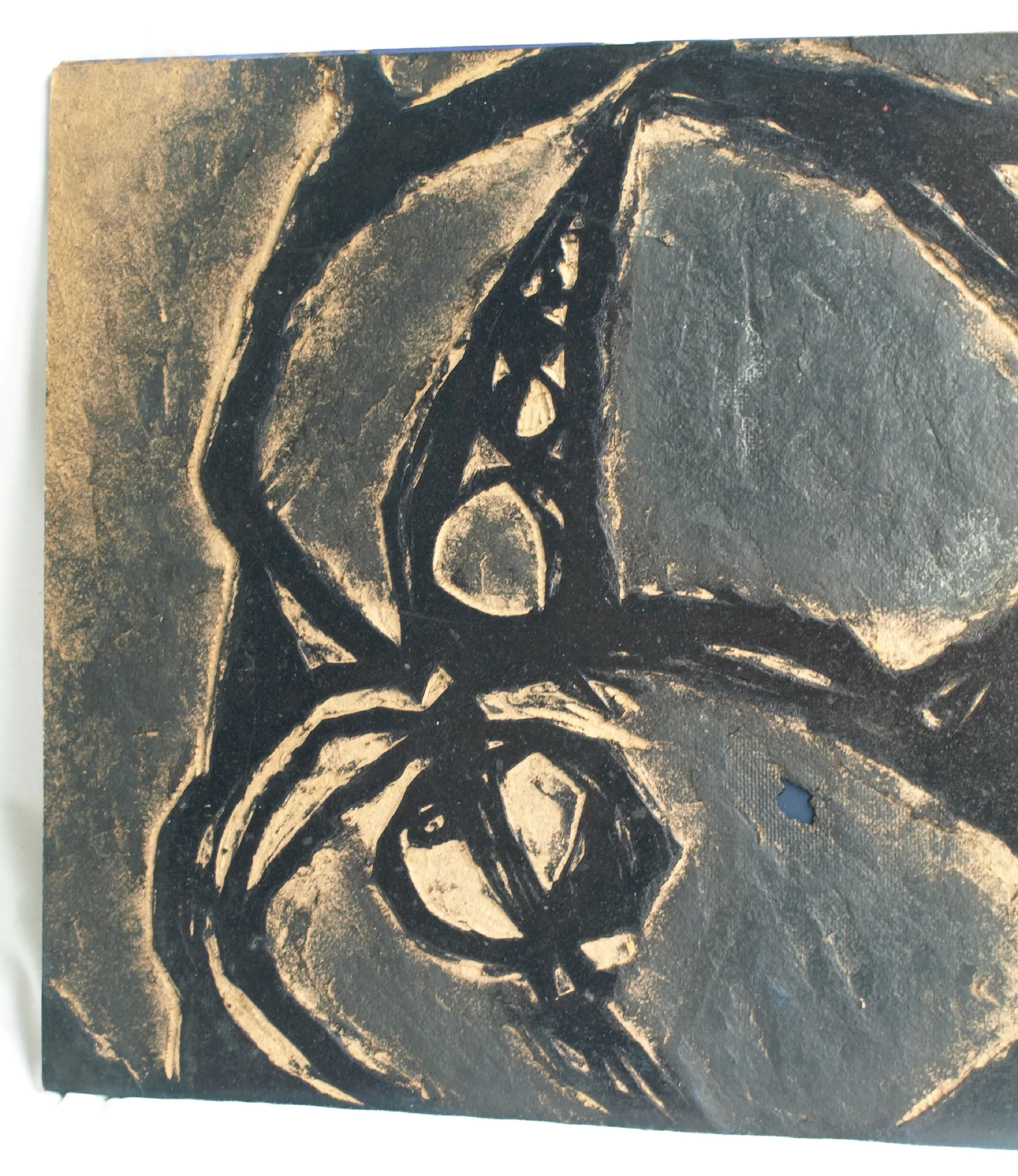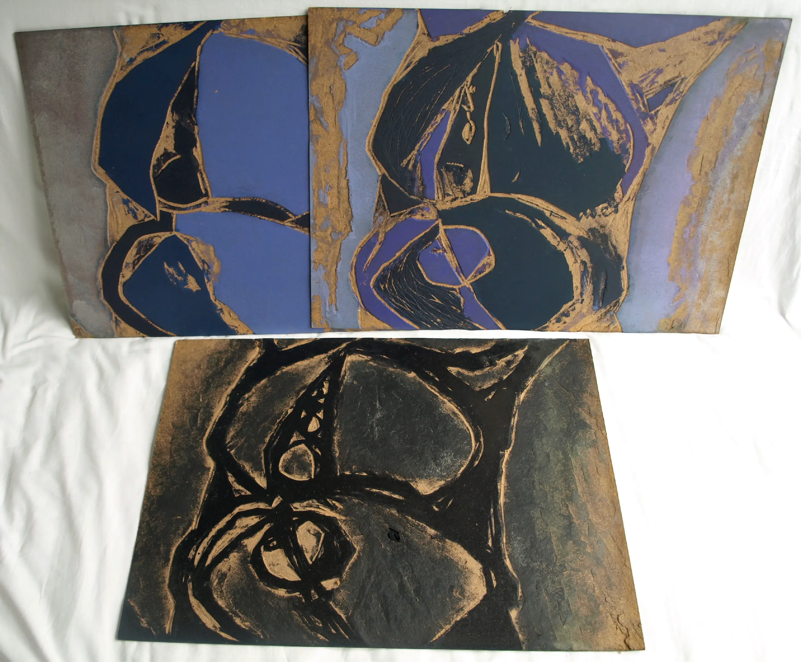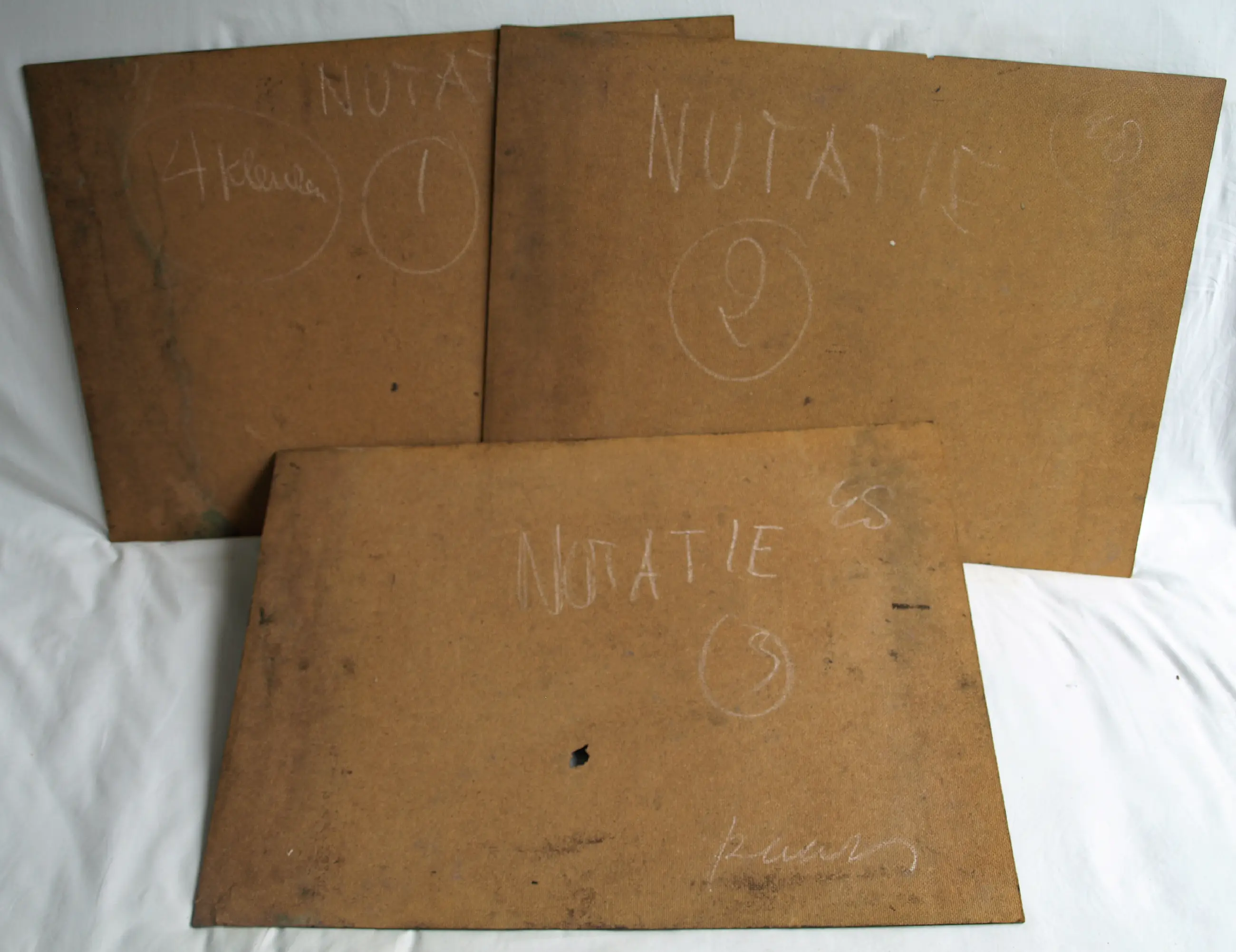 De 3 oorspronkelijke hardboard ‘blokken’ uit 1968 van de boardsnede ‘Notatie’ van de Nederlandse kunstenaar Fon Klement (1930-2000). Met deze 3 blokken drukte Fon Klement, in 3 drukgangen, de boardsnede “Notatie” in een oplage van 24 exemplaren (zie de 3 laatste foto’s).