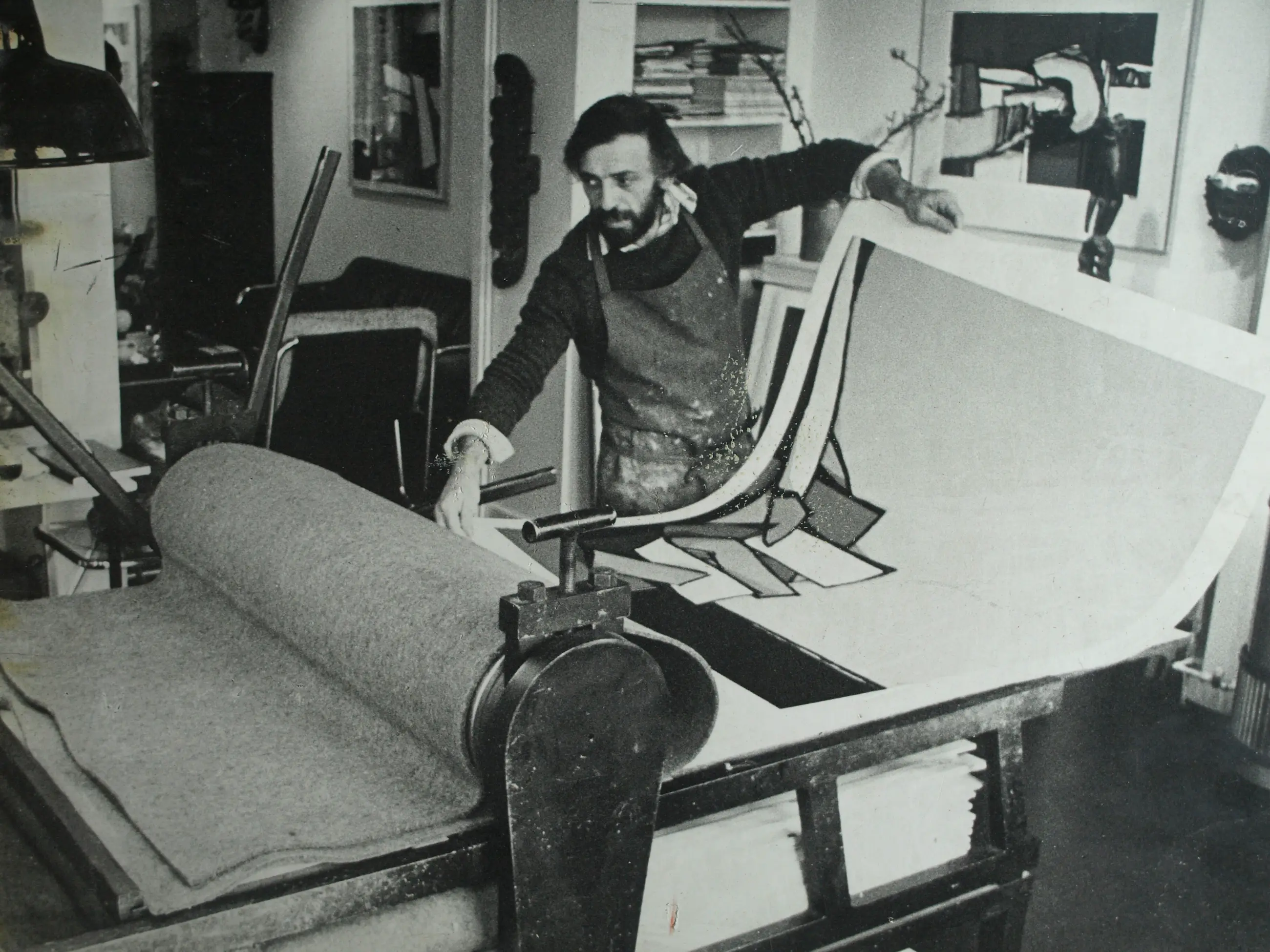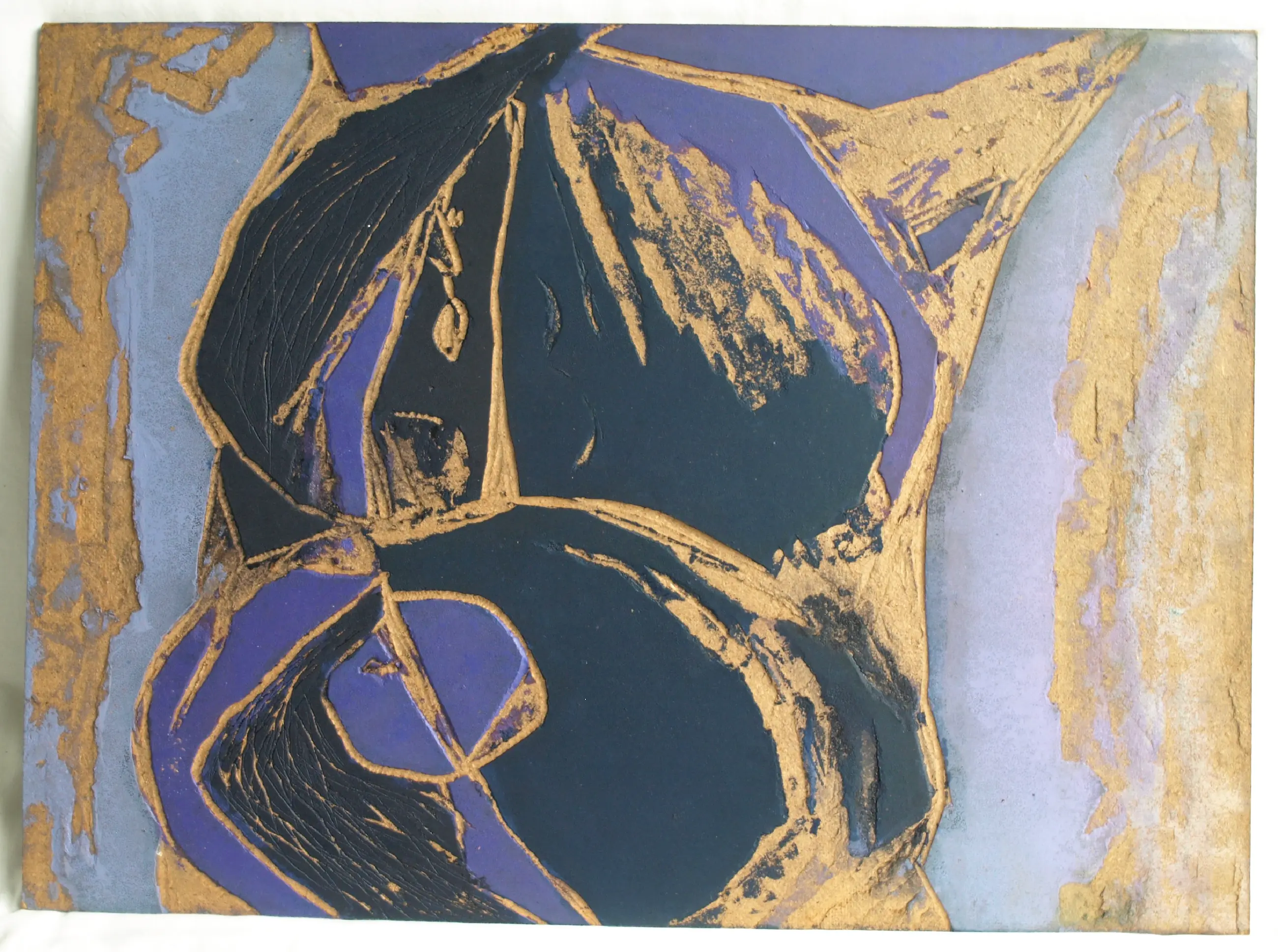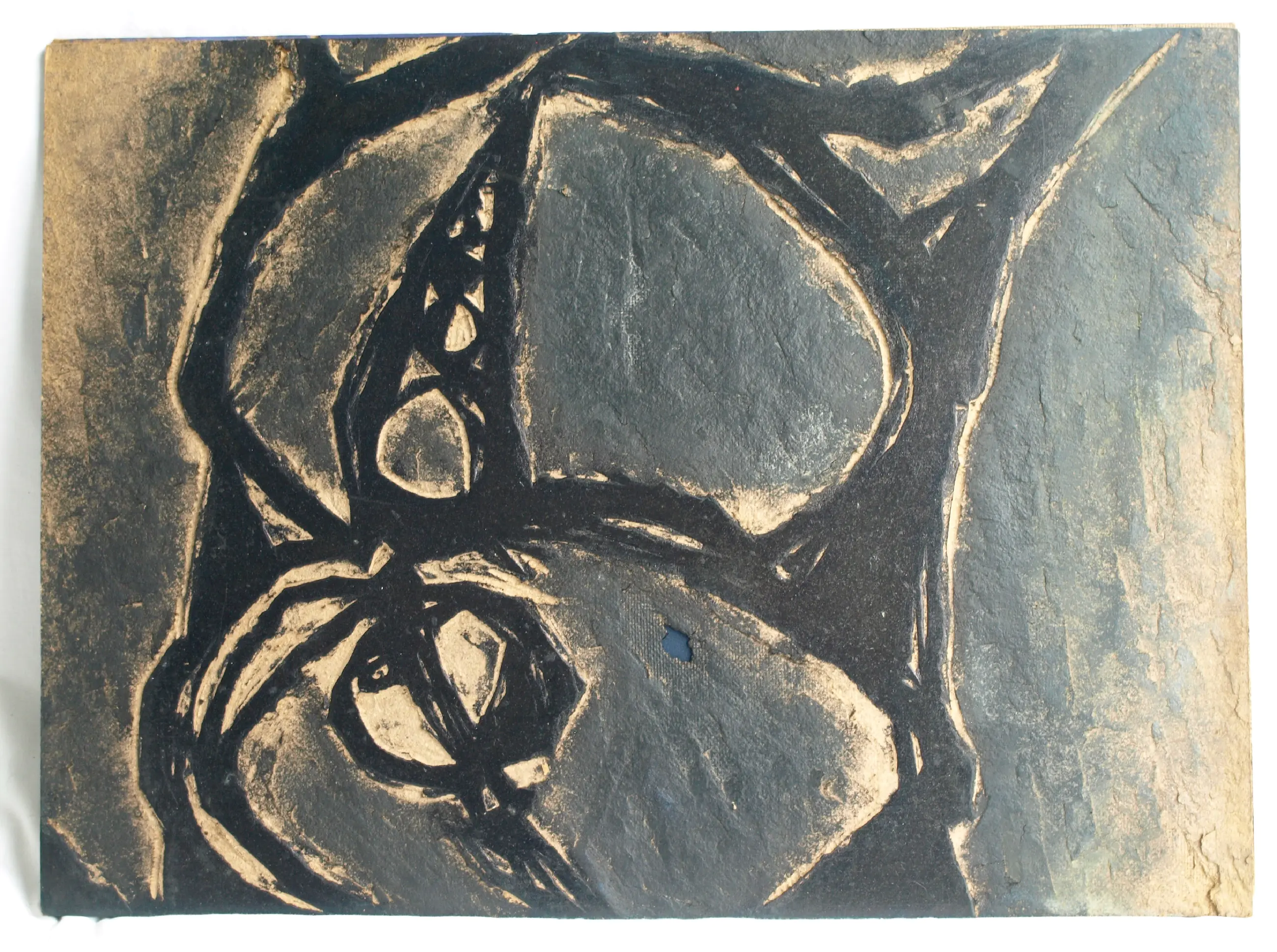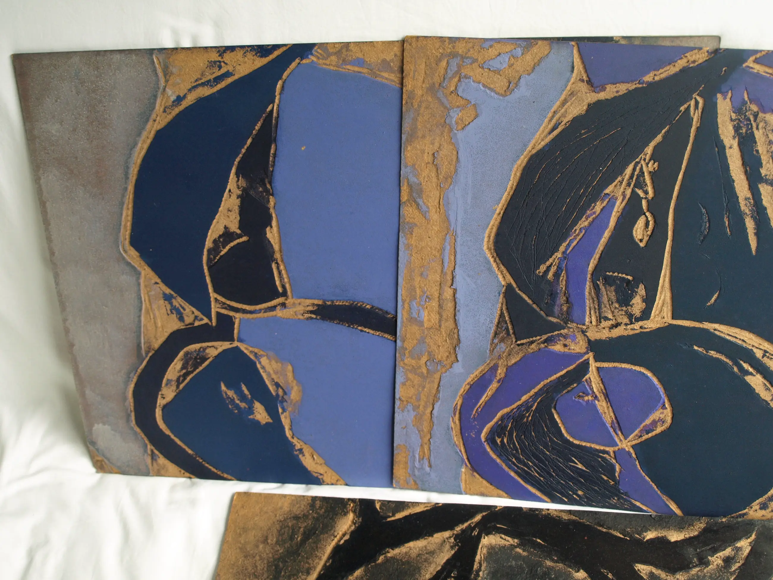 De 3 oorspronkelijke hardboard ‘blokken’ uit 1968 van de boardsnede ‘Notatie’ van de Nederlandse kunstenaar Fon Klement (1930-2000). Met deze 3 blokken drukte Fon Klement, in 3 drukgangen, de boardsnede “Notatie” in een oplage van 24 exemplaren (zie de 3 laatste foto’s).
