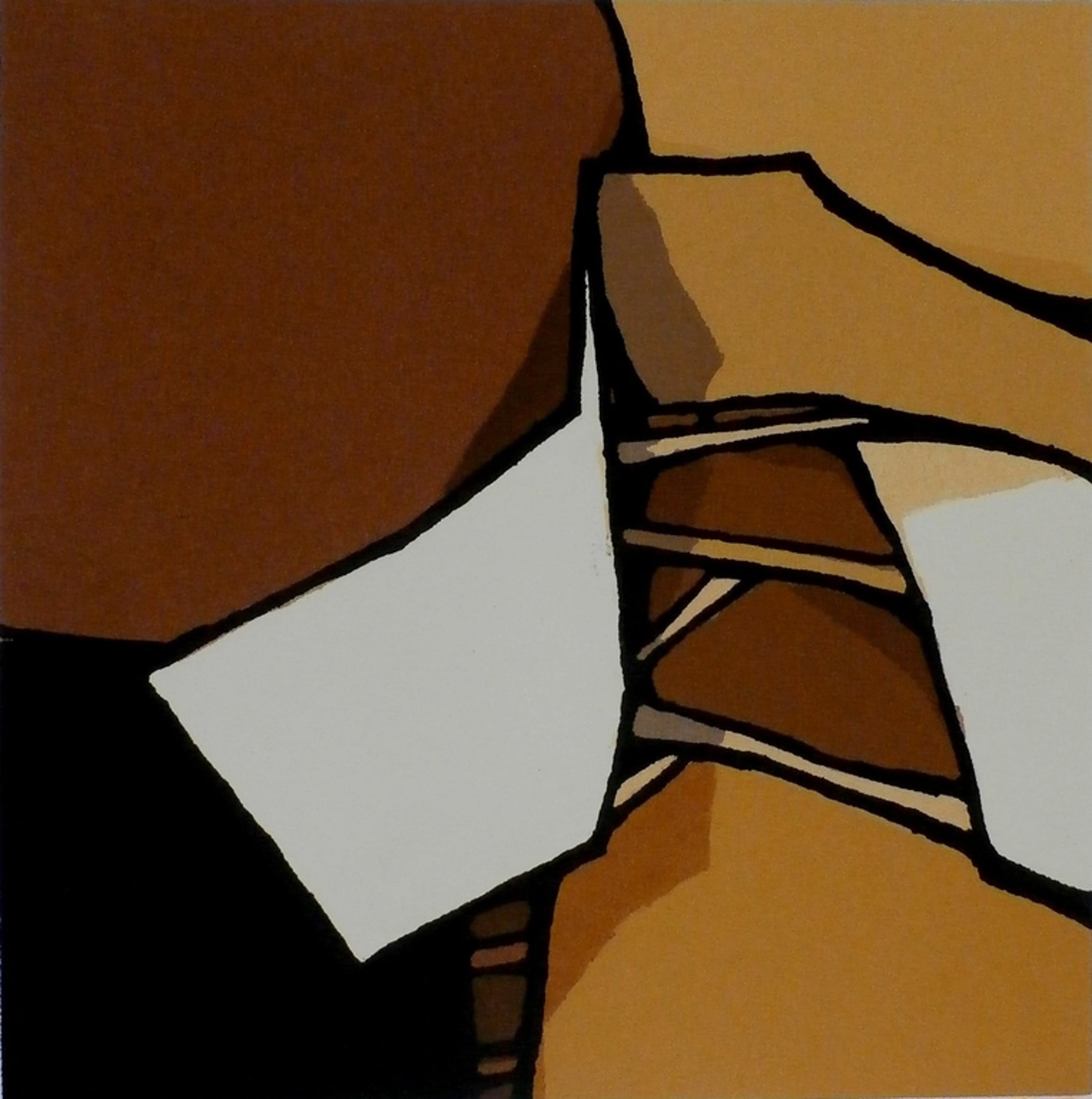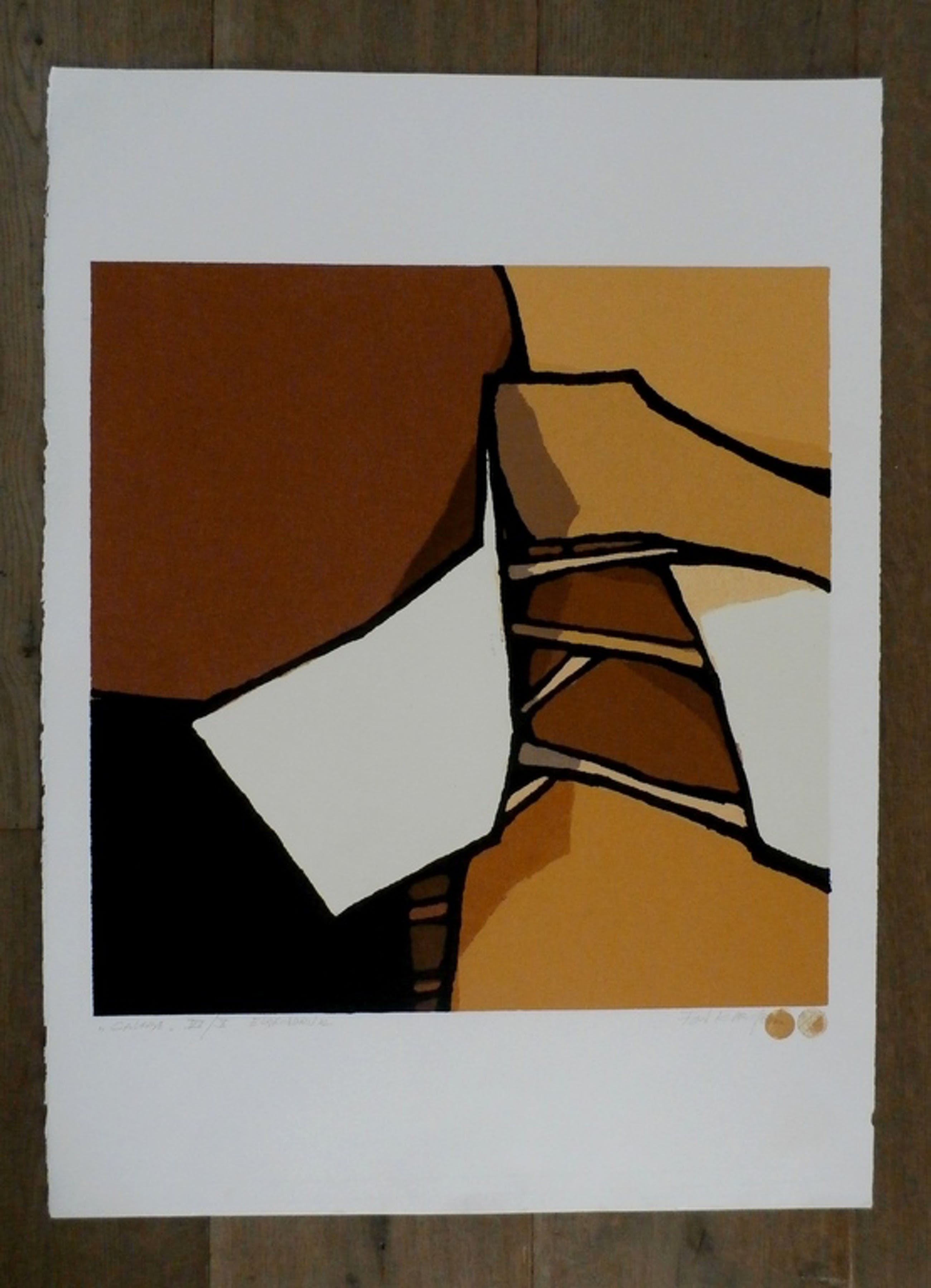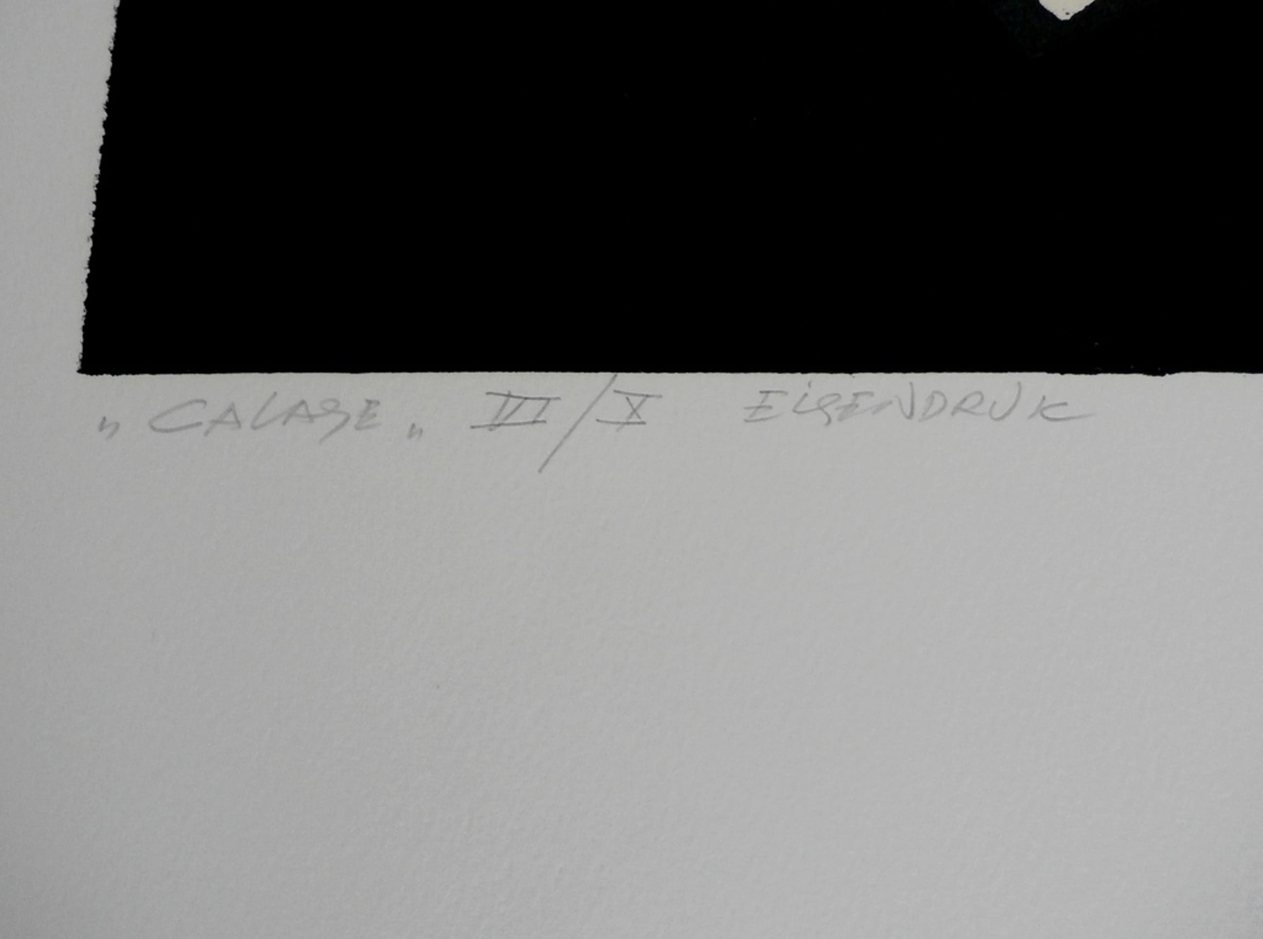 Boardsnede van Fon Klement uit 1977. De boardsnede is rechtsonder, met potlood en vingerafdruken, gesigneerd door de kunstenaar. Titel: Calage. Nummer: 6/10 (Romeinse cijfers). Eigen druk. Afmetingen boardsnede: h76 x b56 cm. Afmetingen voorstelling: 50 x 50 cm.