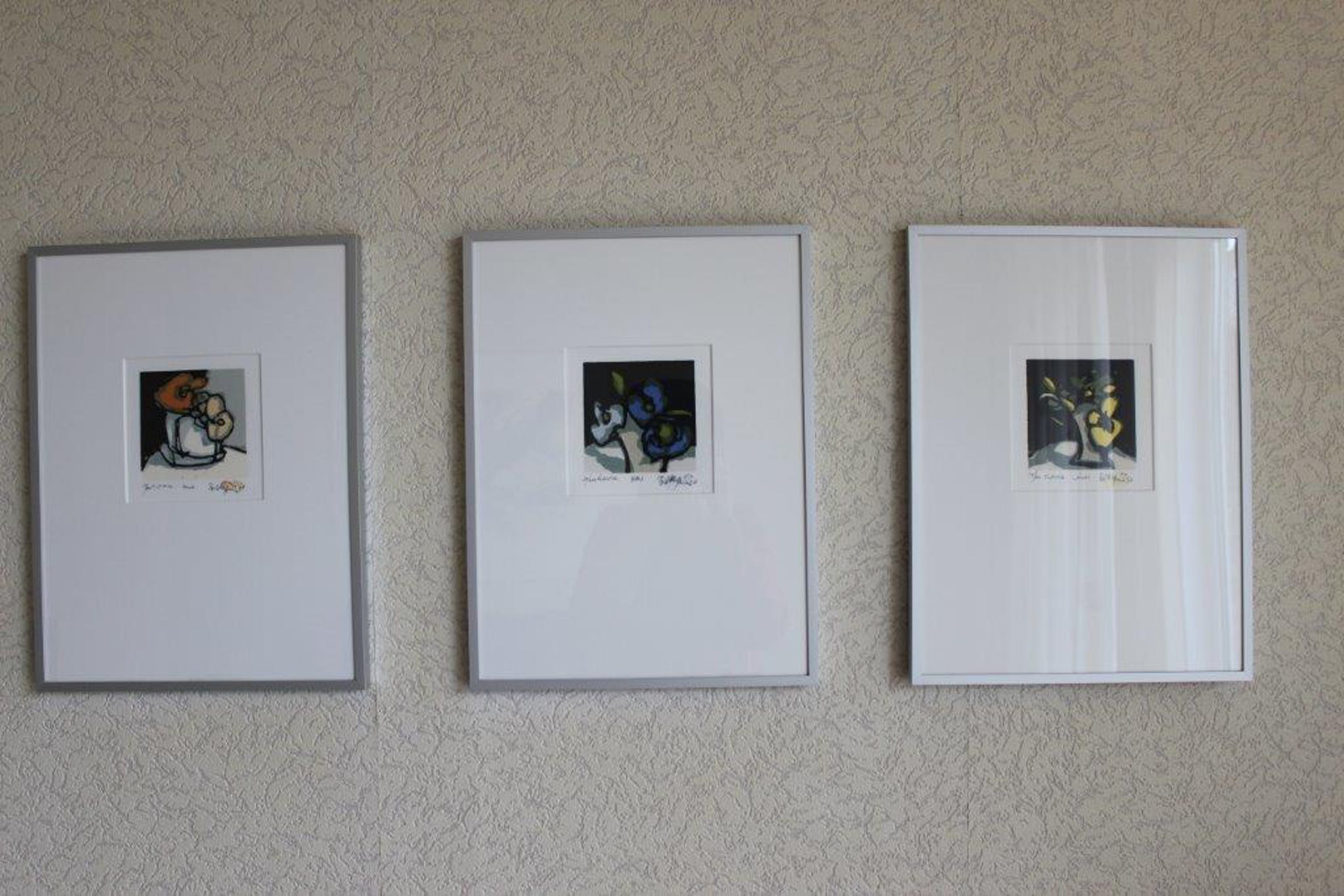 Fon Klement, serie van drie handgedrukte boardsnedes "Rose", "Jaune", "Bleu". Januari 1997.